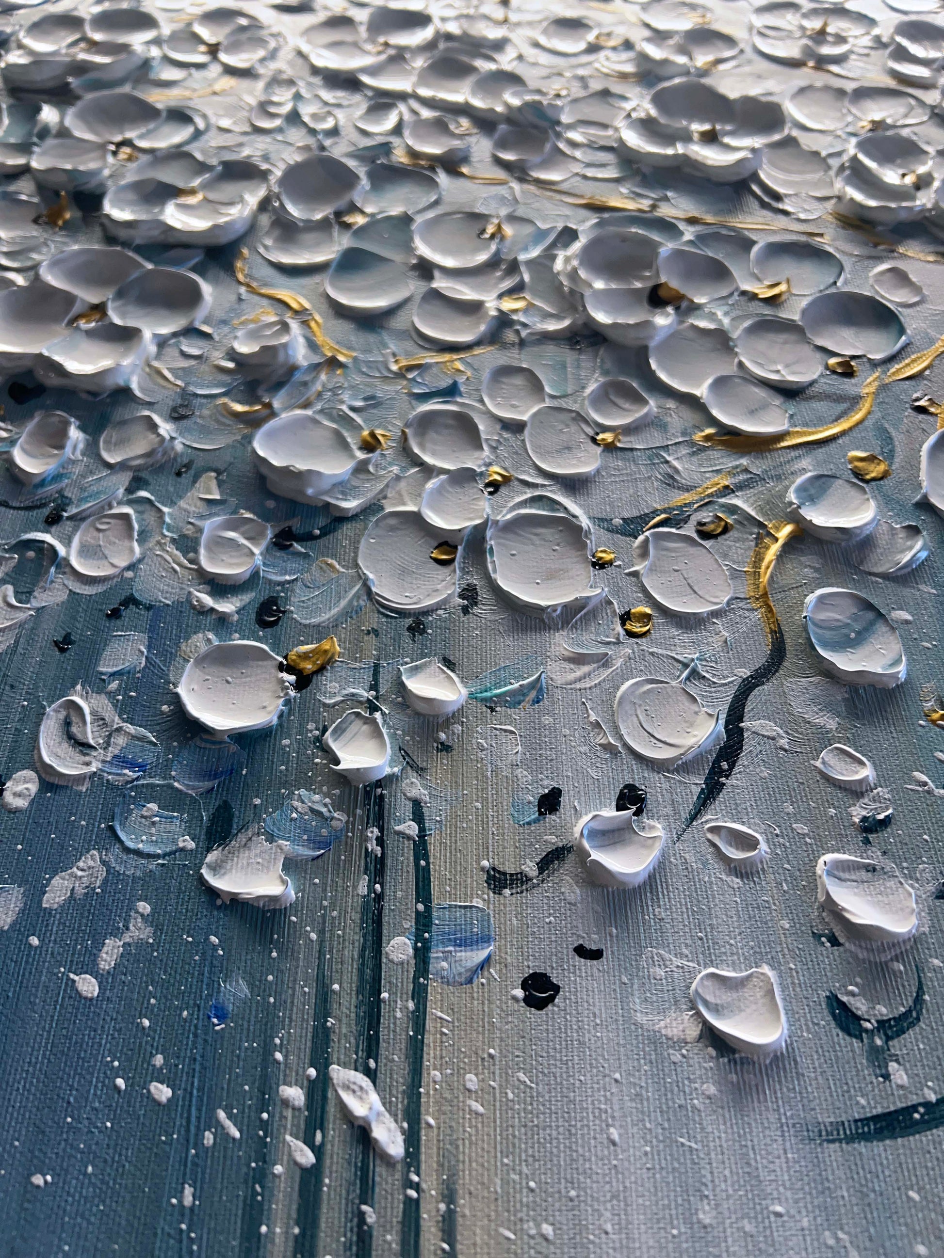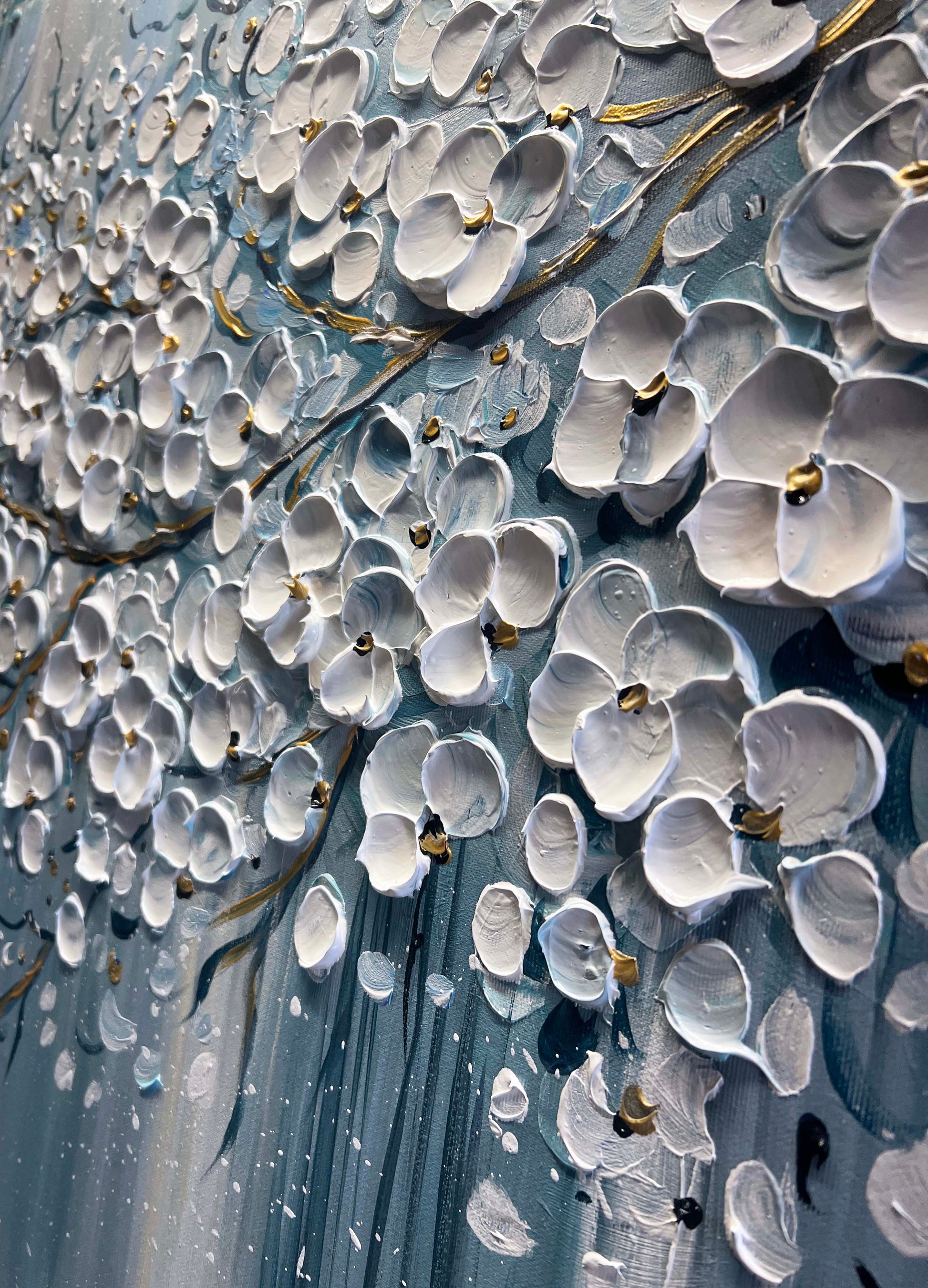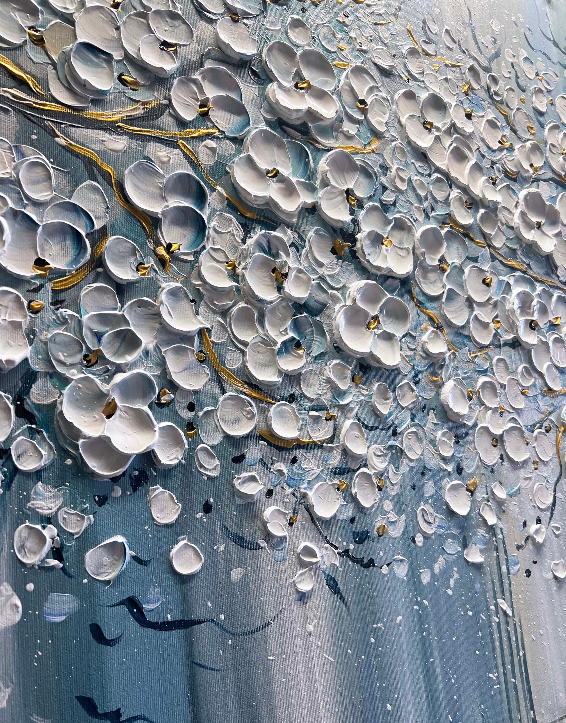 This painting, titled "Sakura in Bloom," captures the delicate beauty of blooming sakura flowers against soft and serene blue tones.