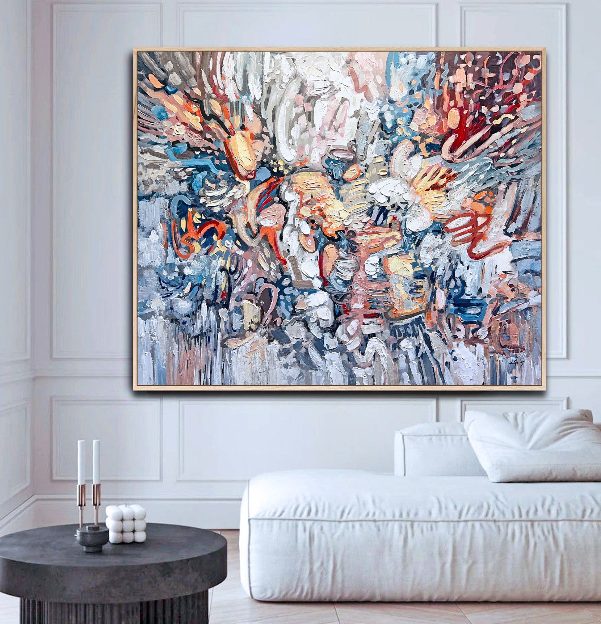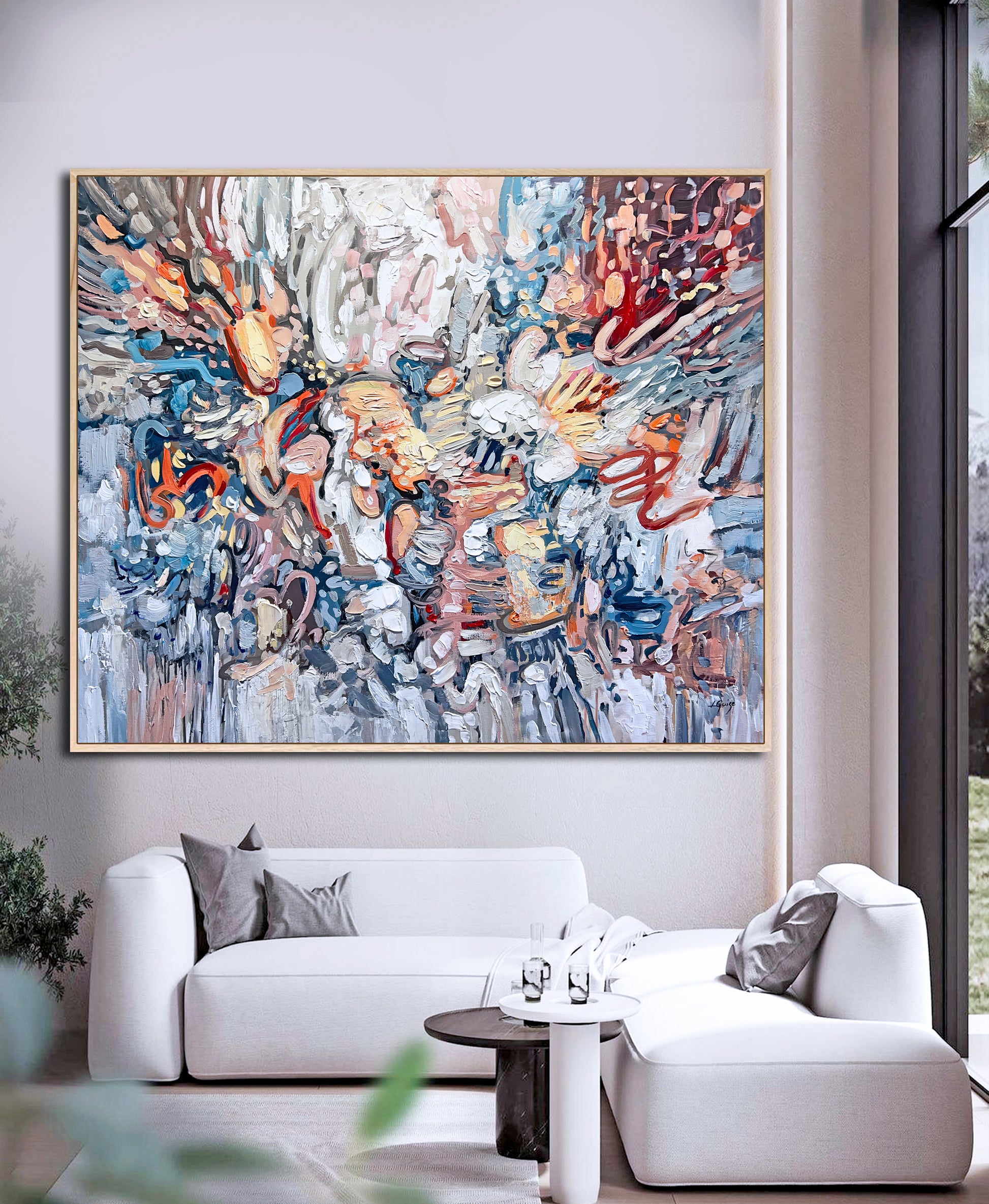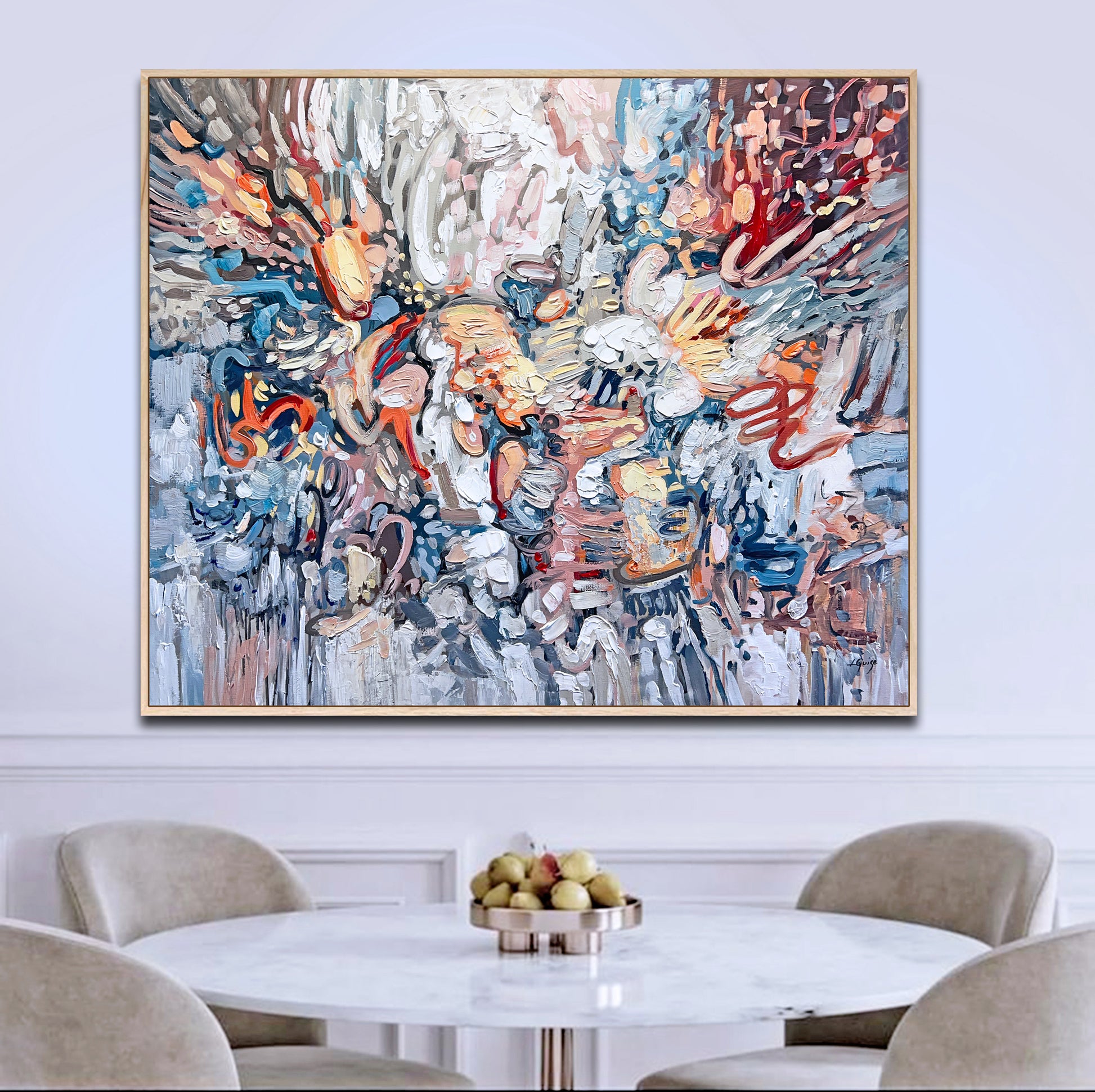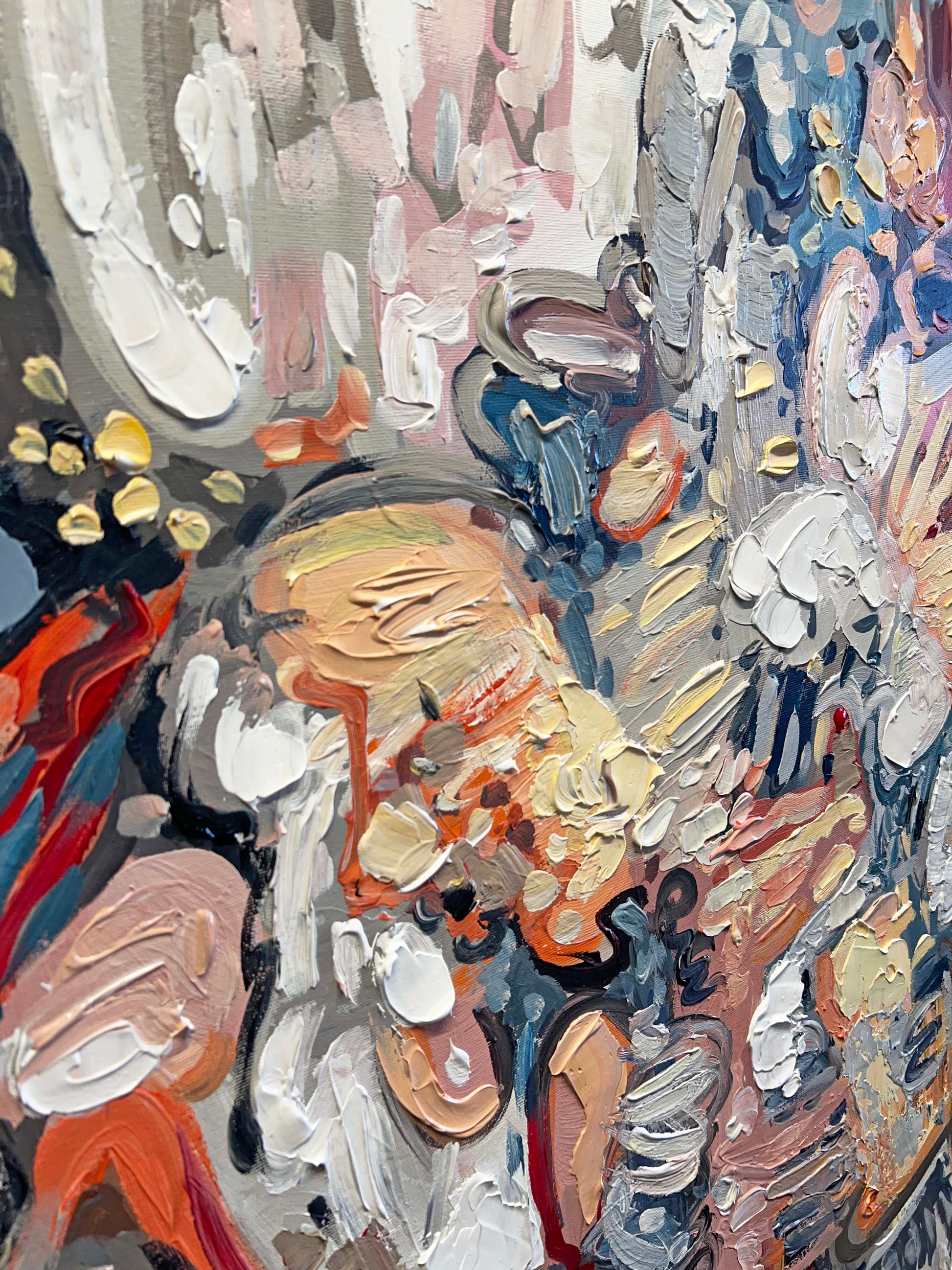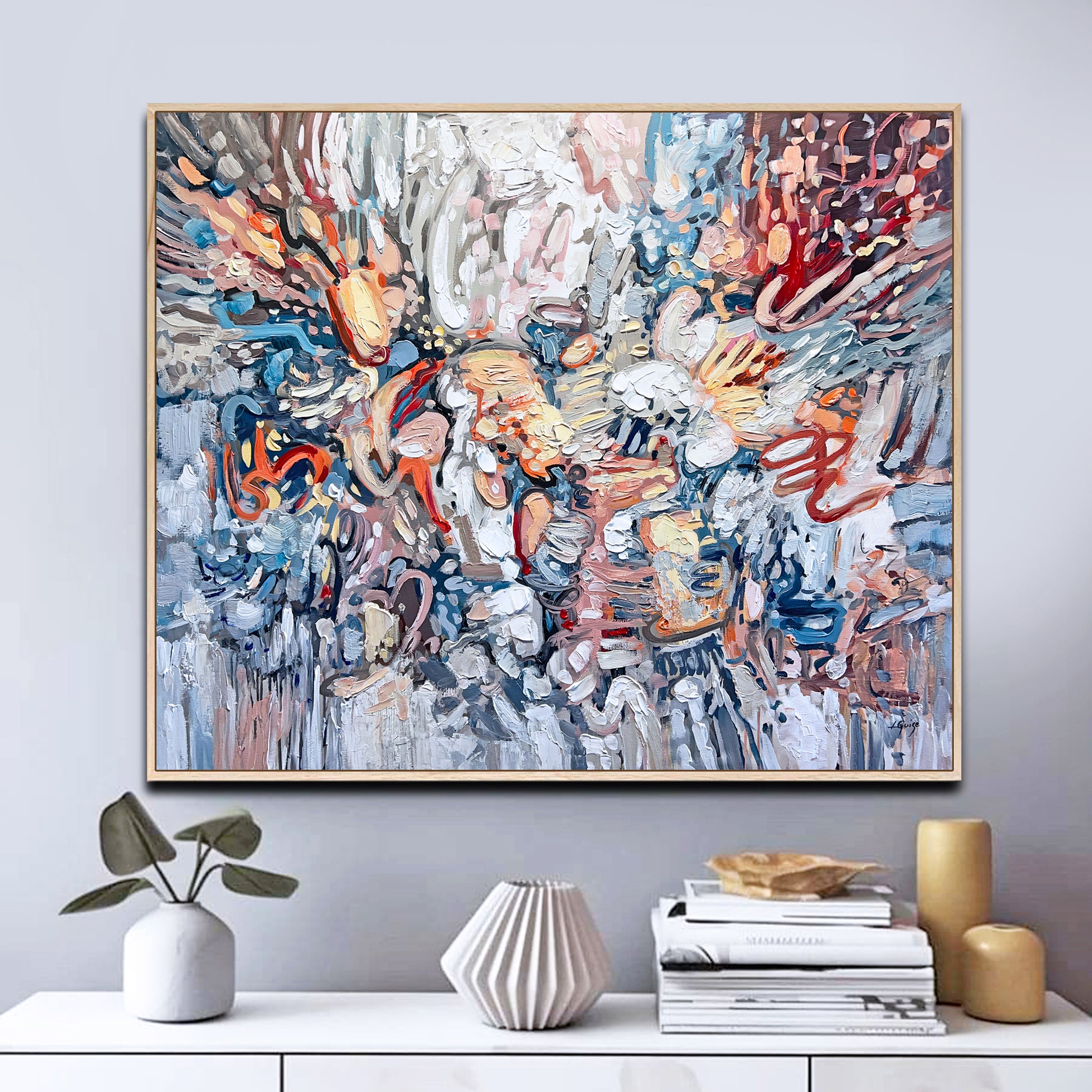 Through bold strokes and radiant colors as soft blues, shimmering grays, corals, creme and whites the composition shows the powerful moment of awakening as if a flame were bursting into life.