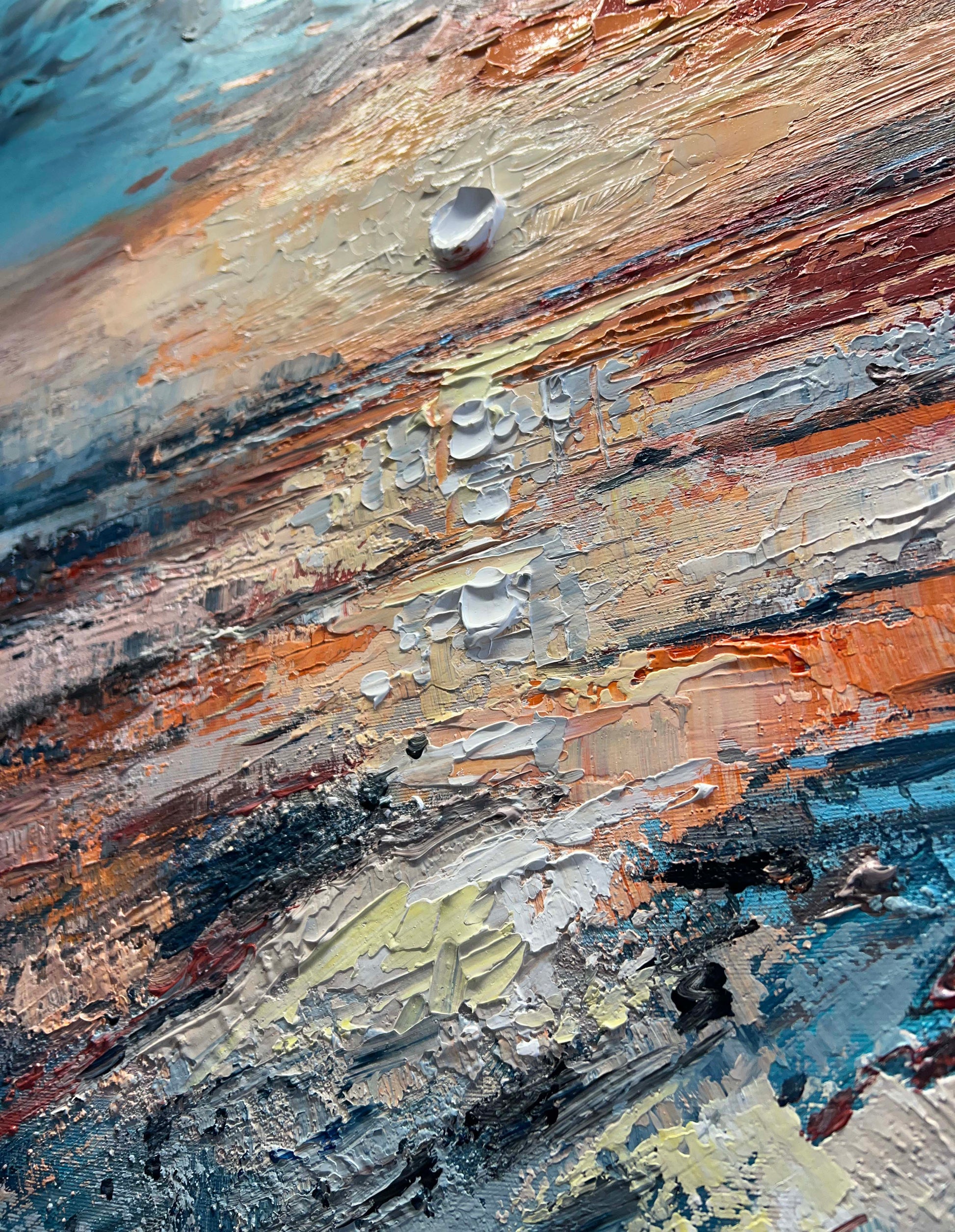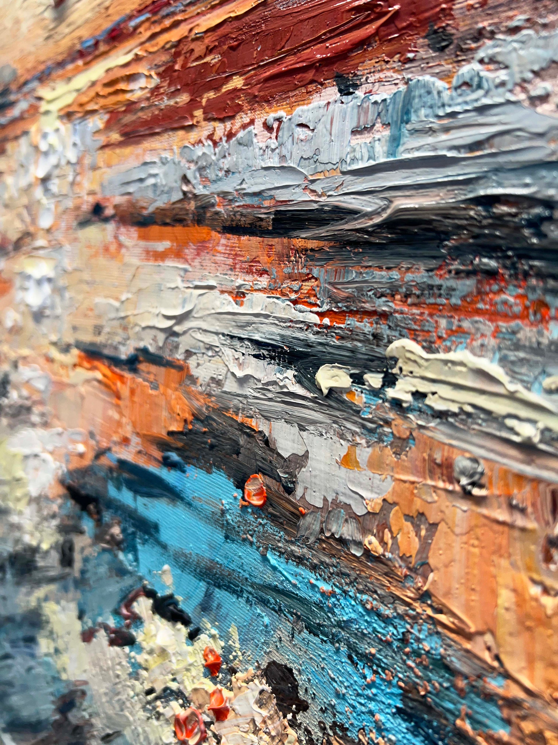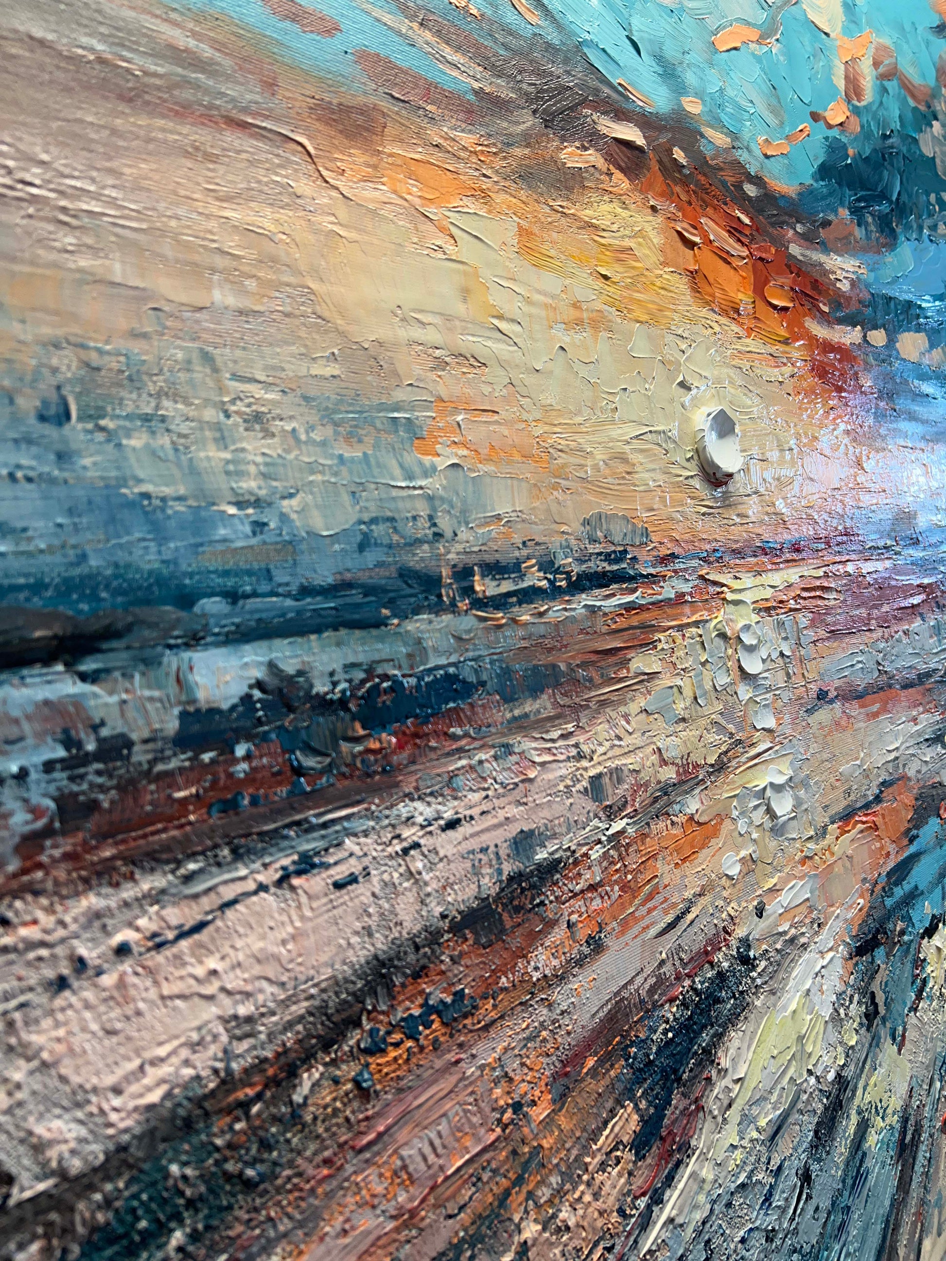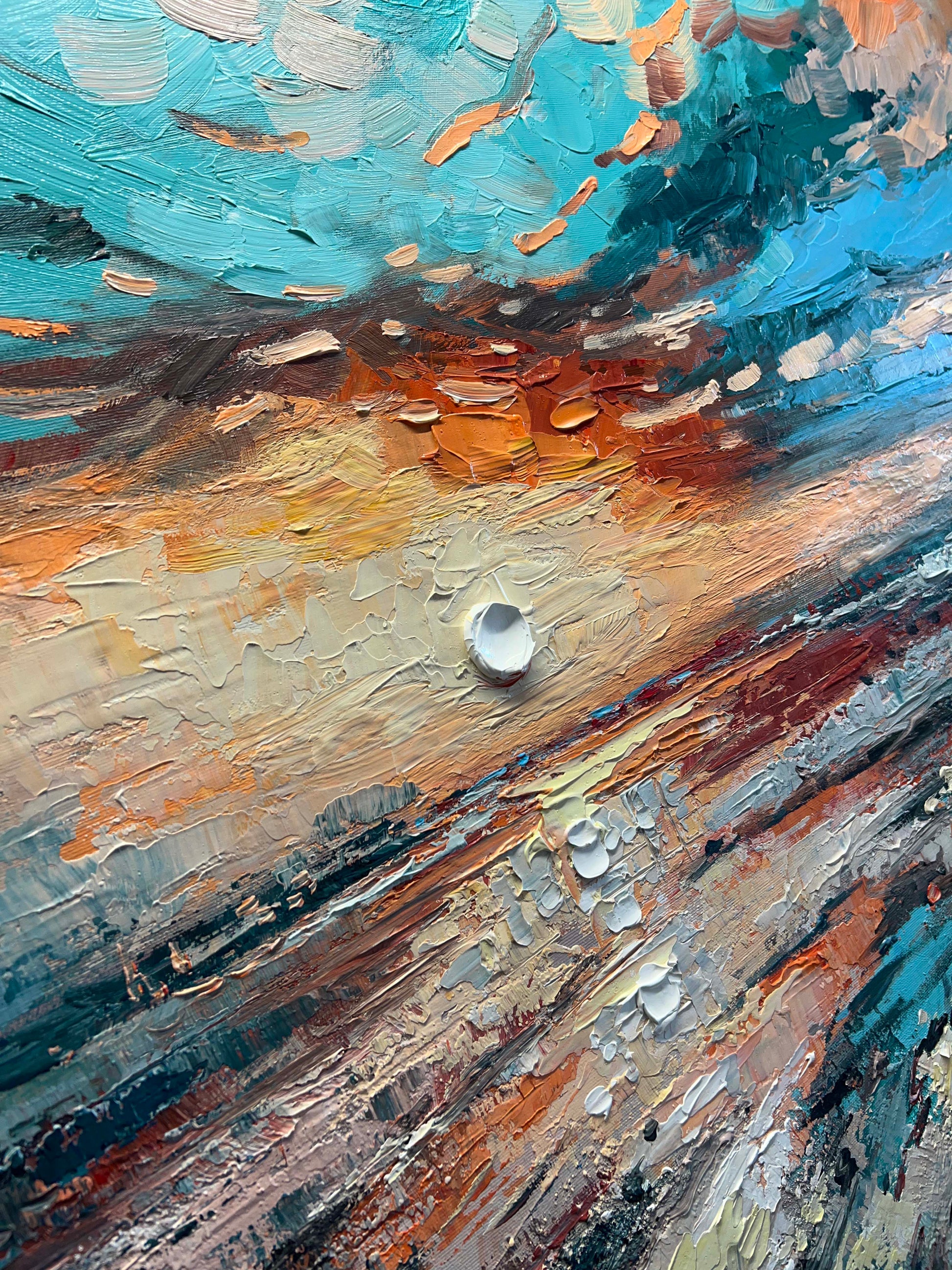 I painted this piece with thick, expressive strokes, letting the textures guide the emotion: from the cool, dissolving winter blues to the fiery oranges and gentle yellows of an emerging sunrise.