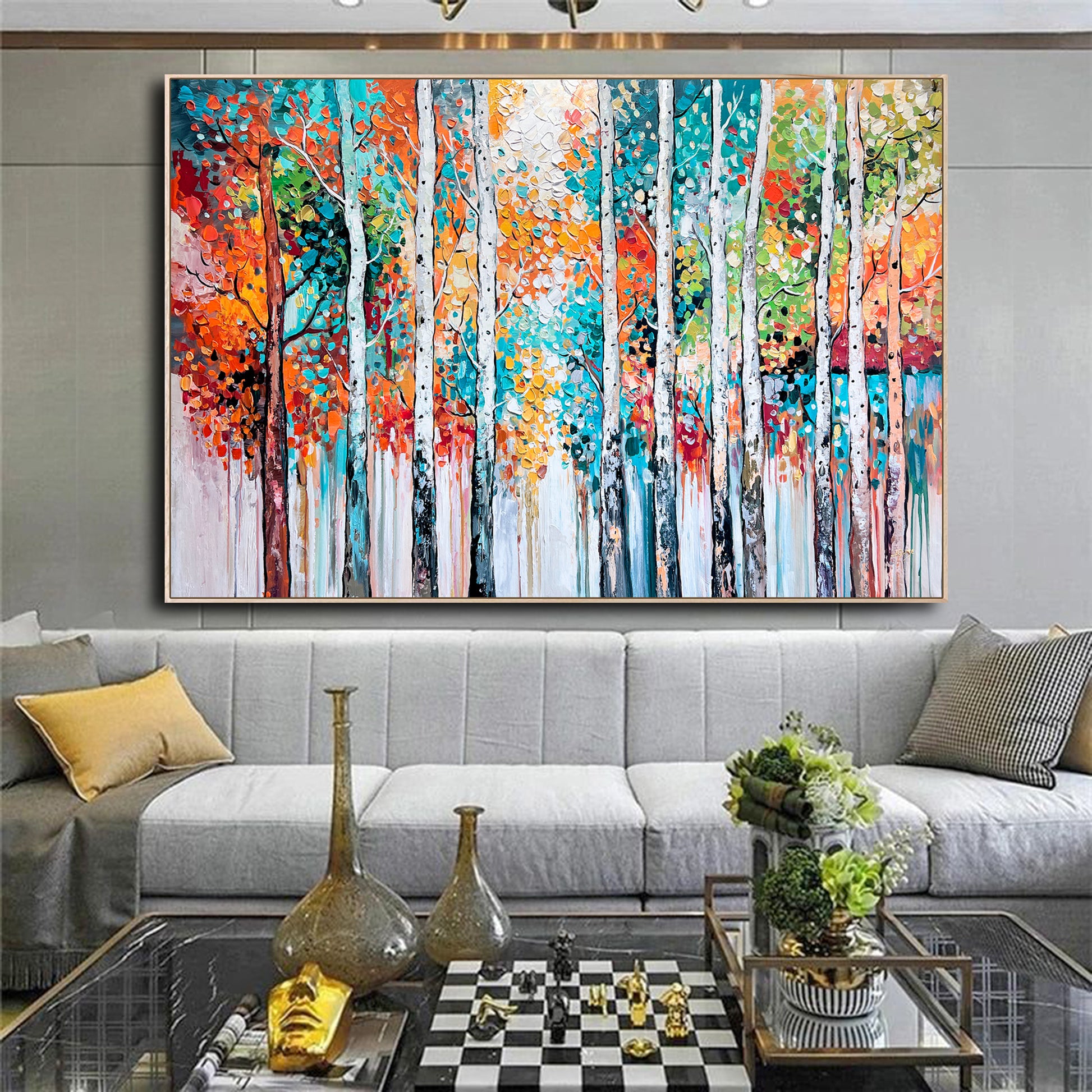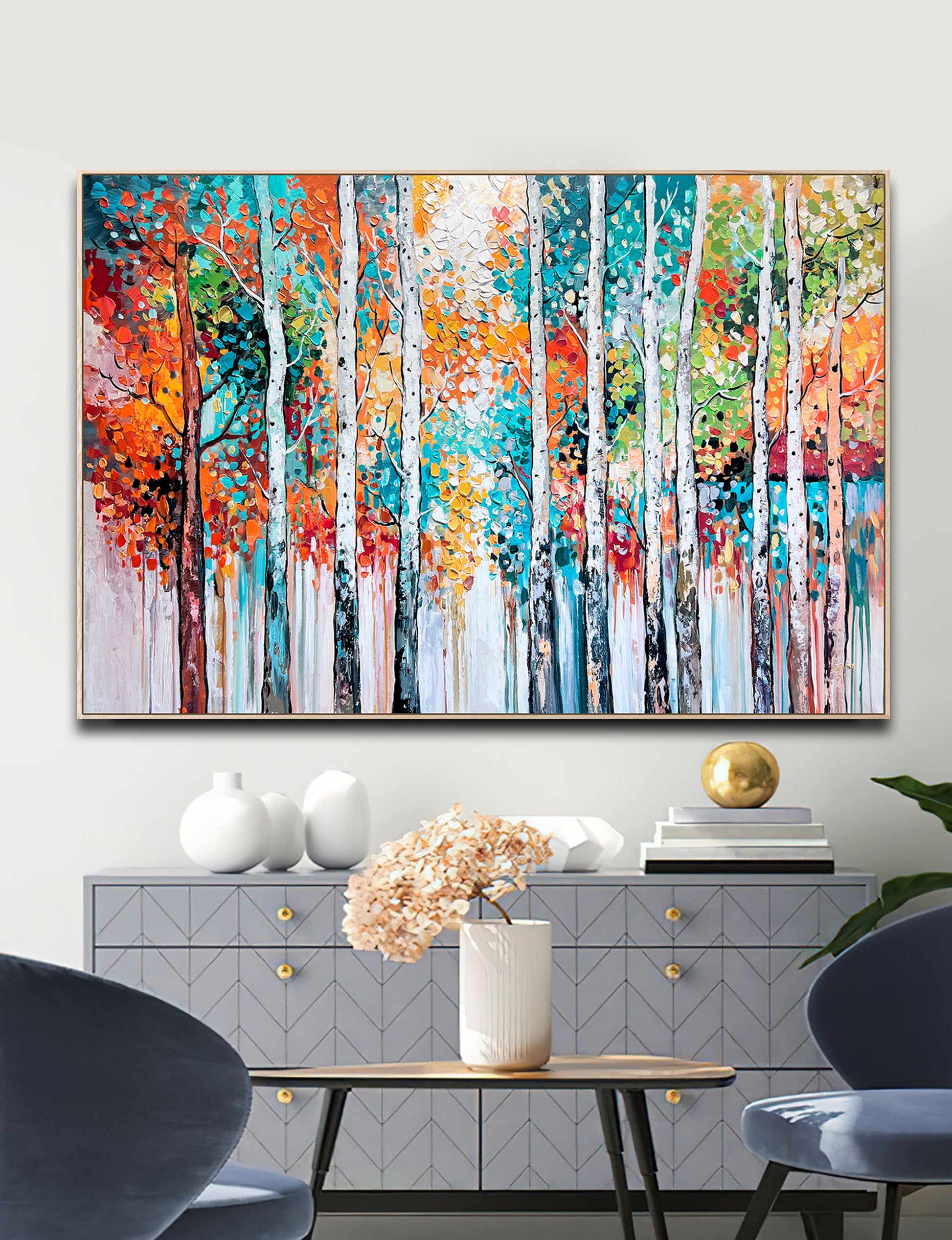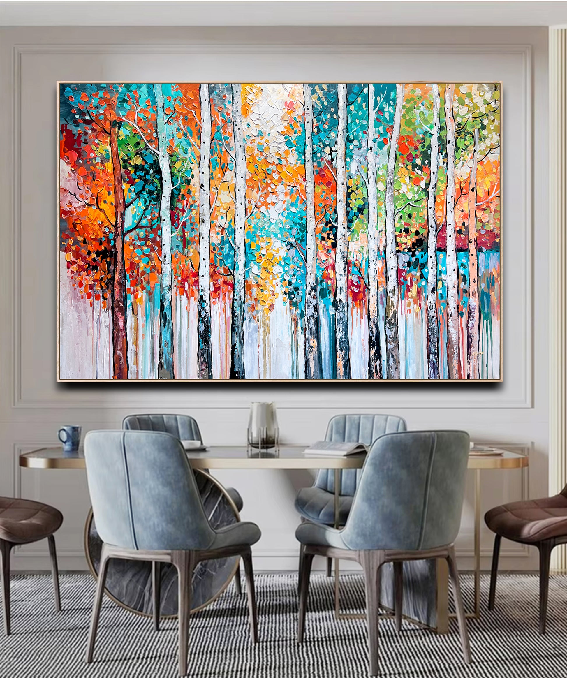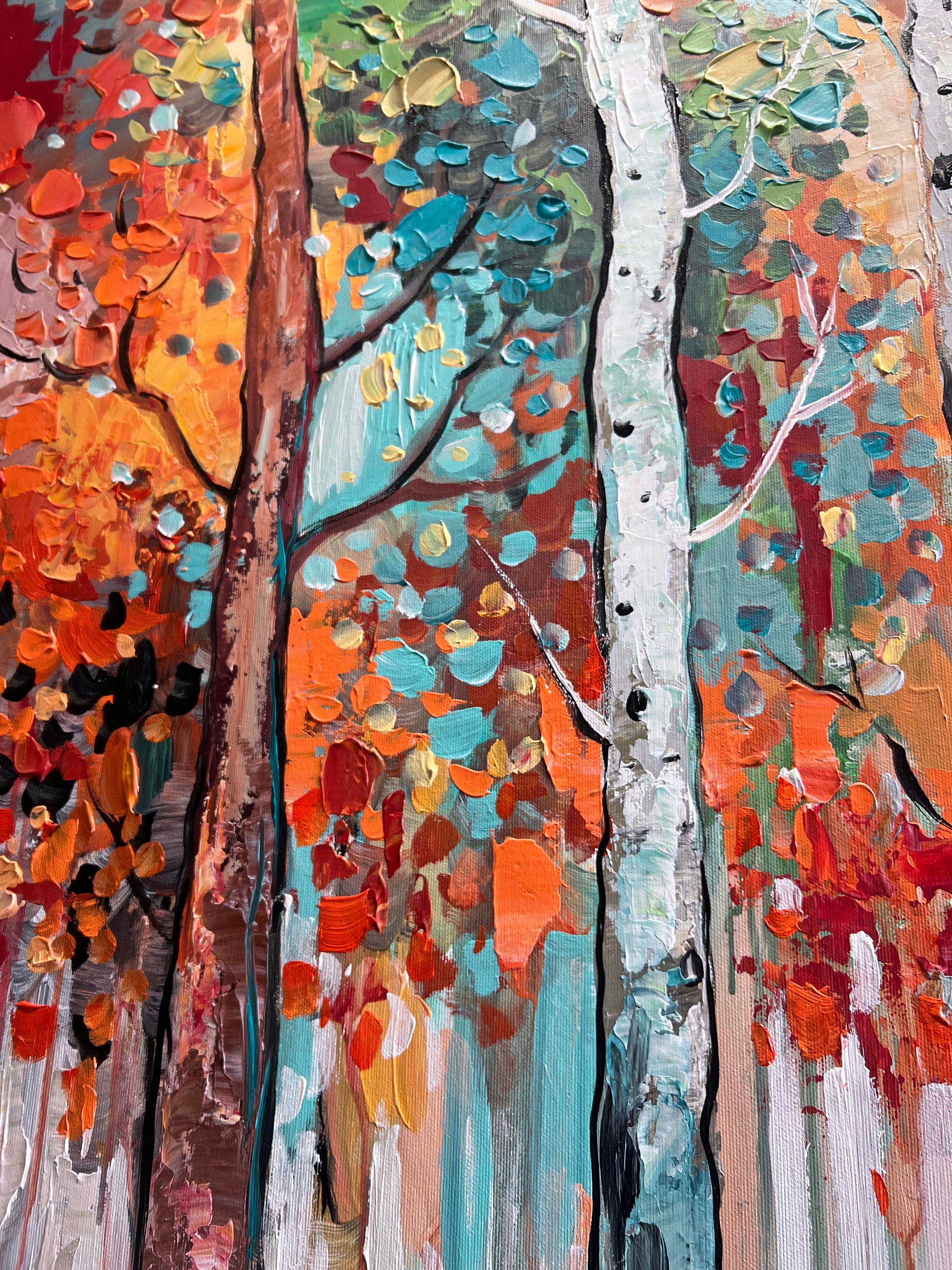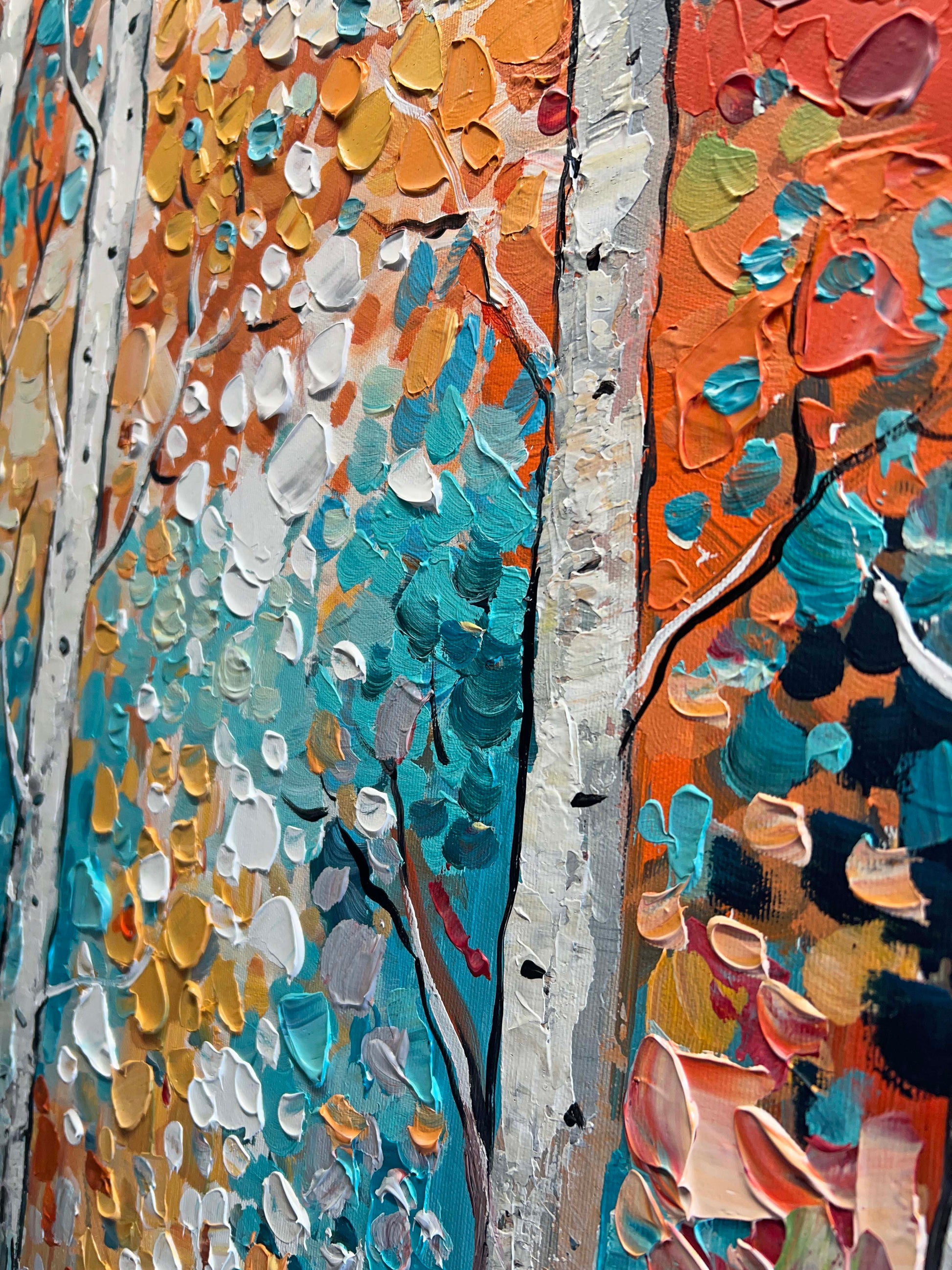 Textured brushstrokes bring the forest to life, with white birch trunks standing tall amidst a symphony of orange, red, gold, teal, and green leaves.