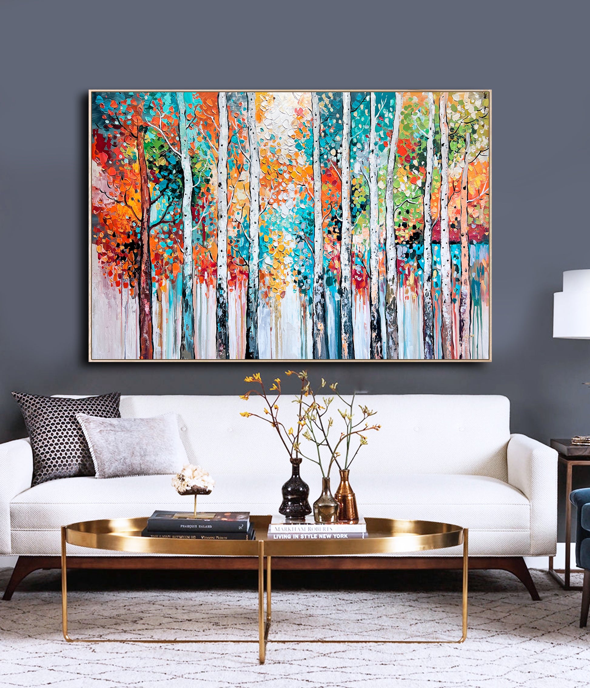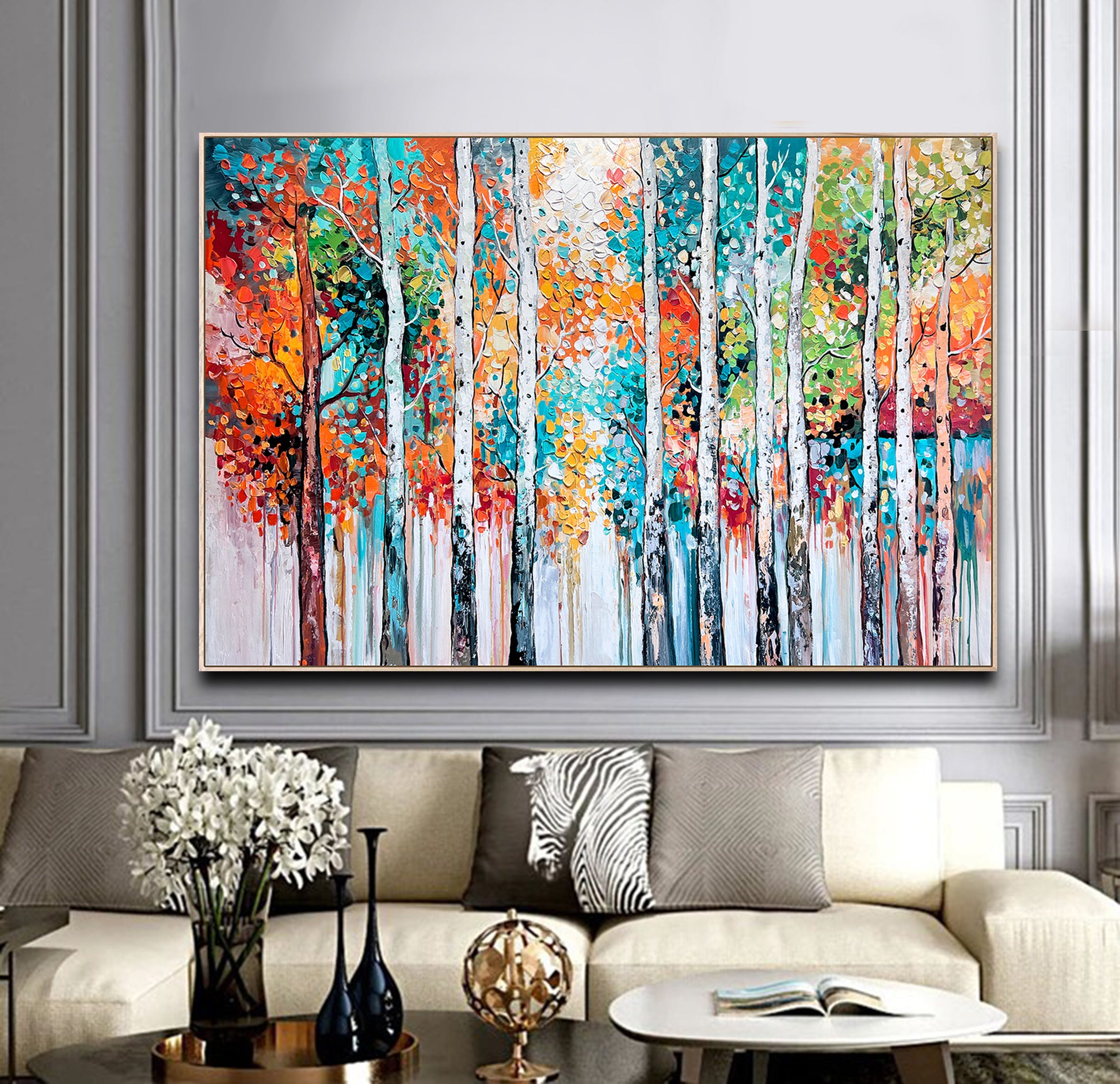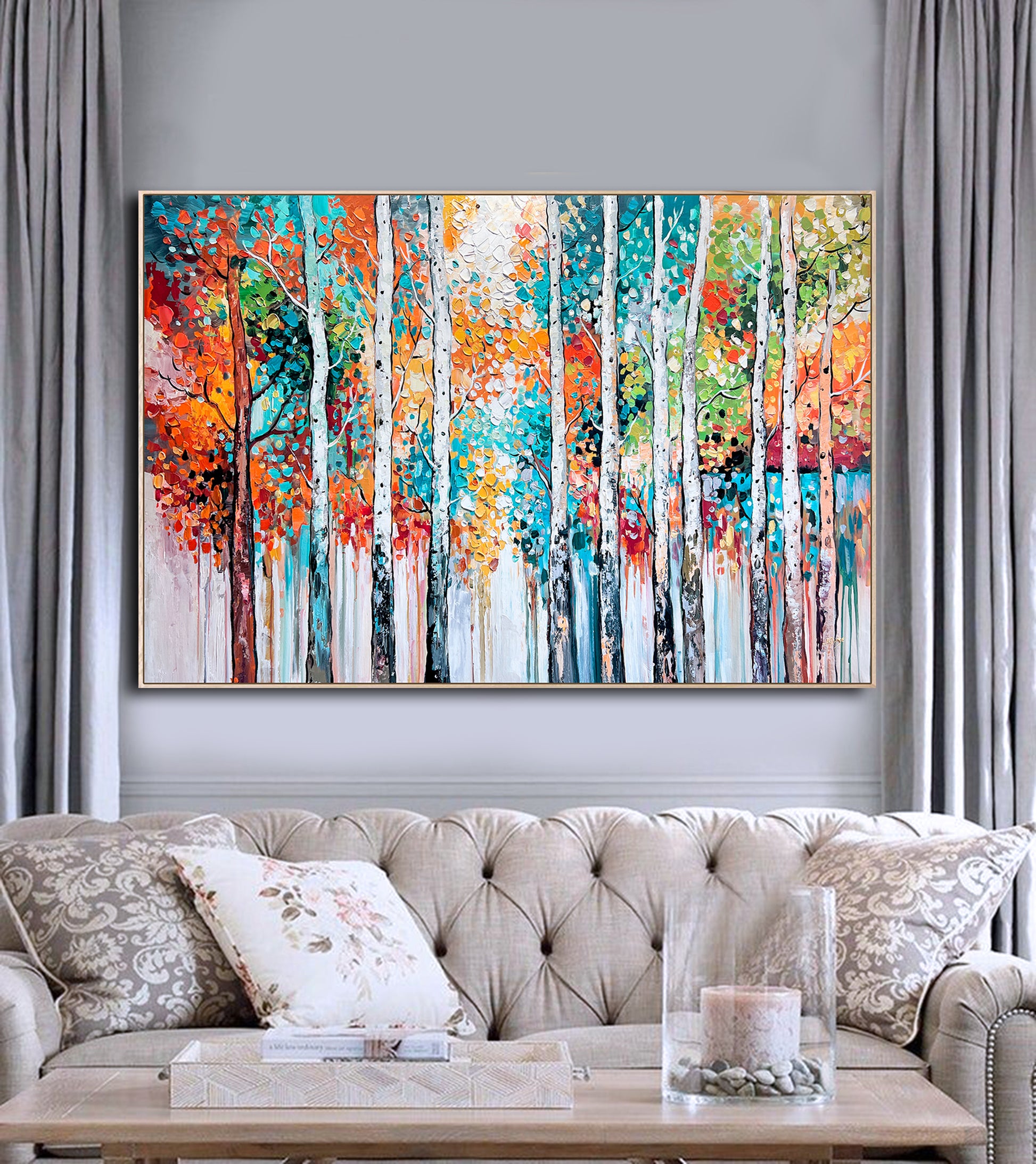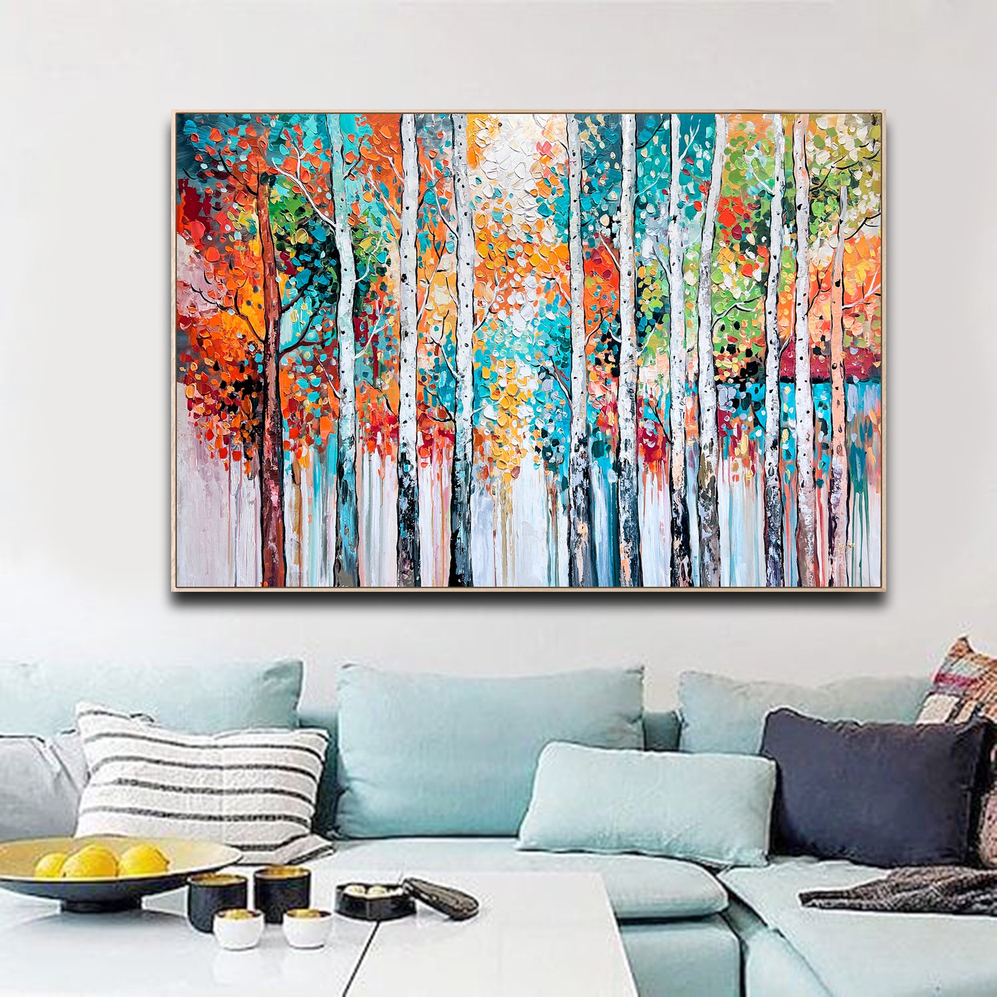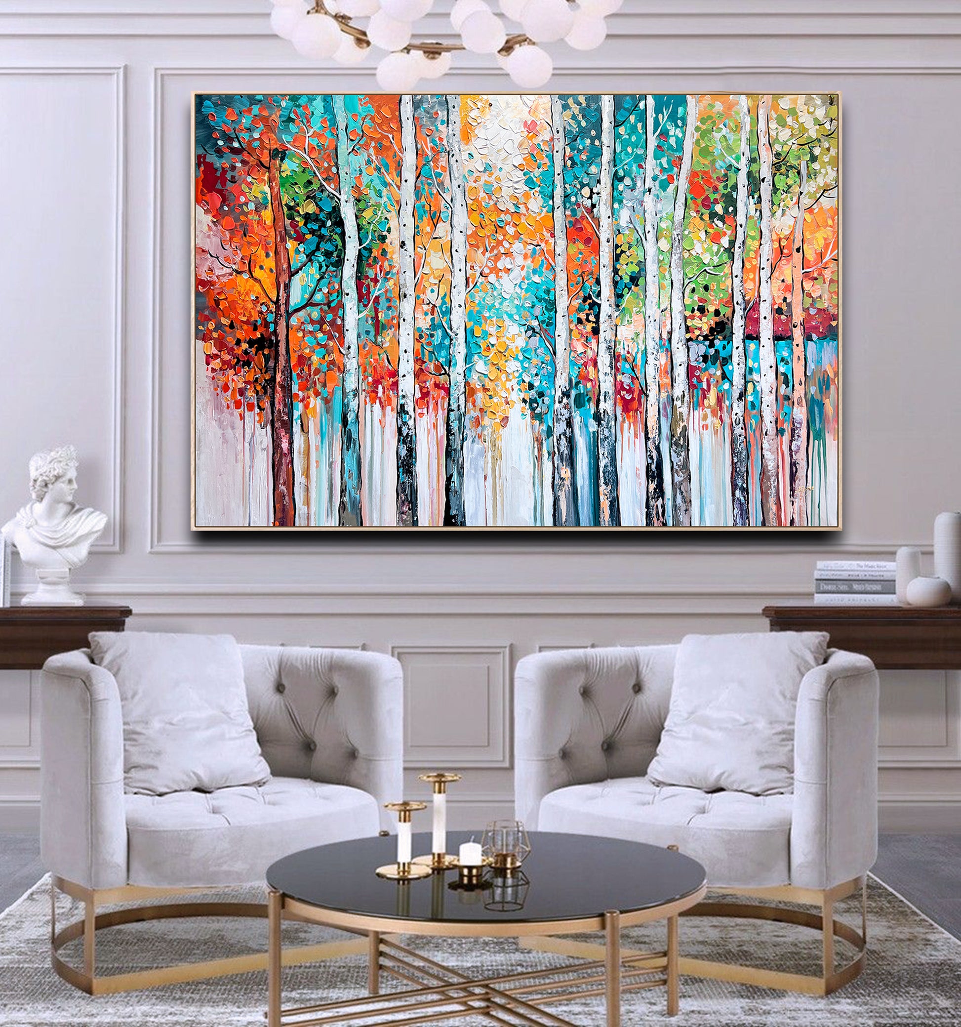 Textured brushstrokes bring the forest to life, with white birch trunks standing tall amidst a symphony of orange, red, gold, teal, and green leaves.