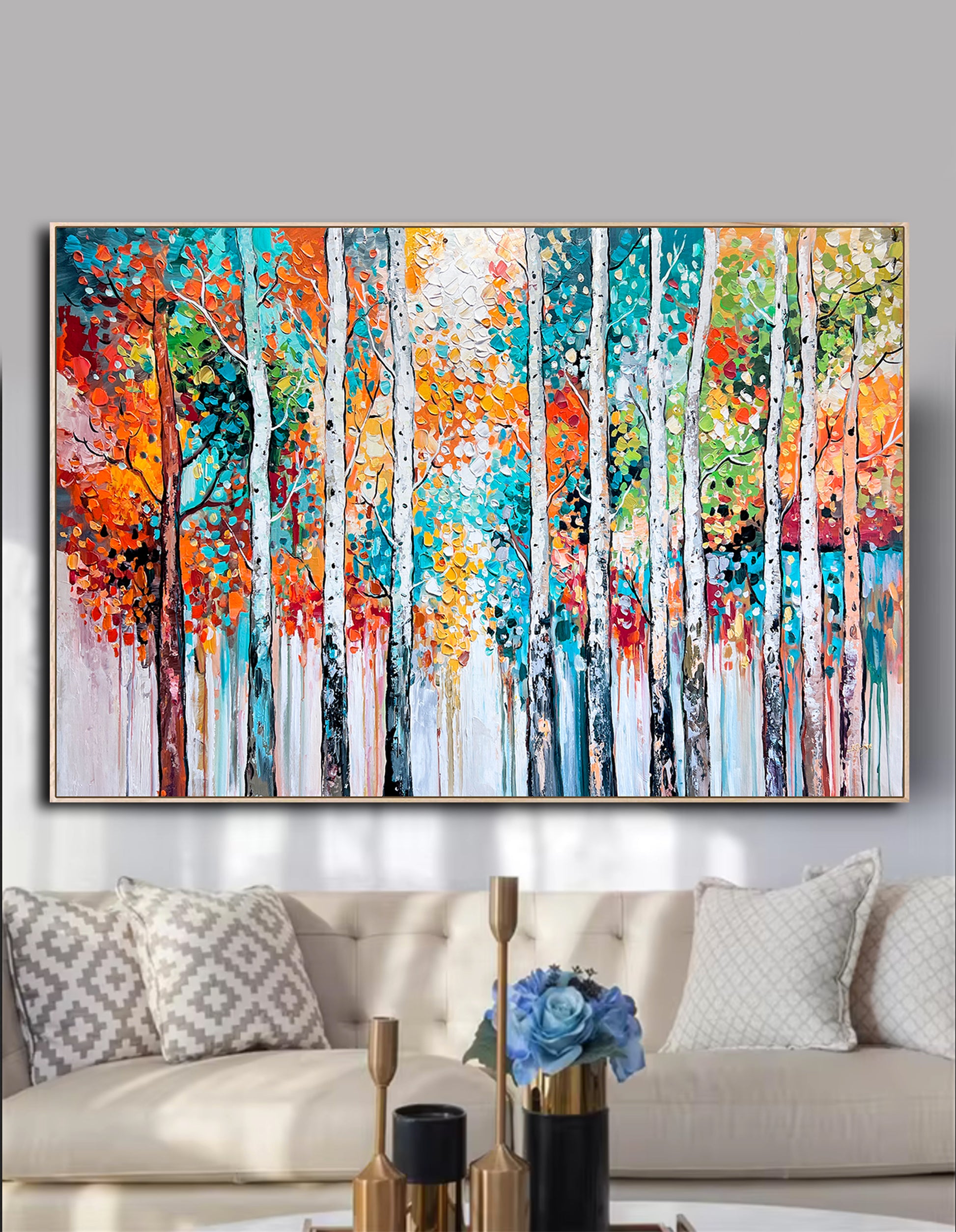 This stunning painting captures the vibrant beauty of birch trees painted in radiant colors.