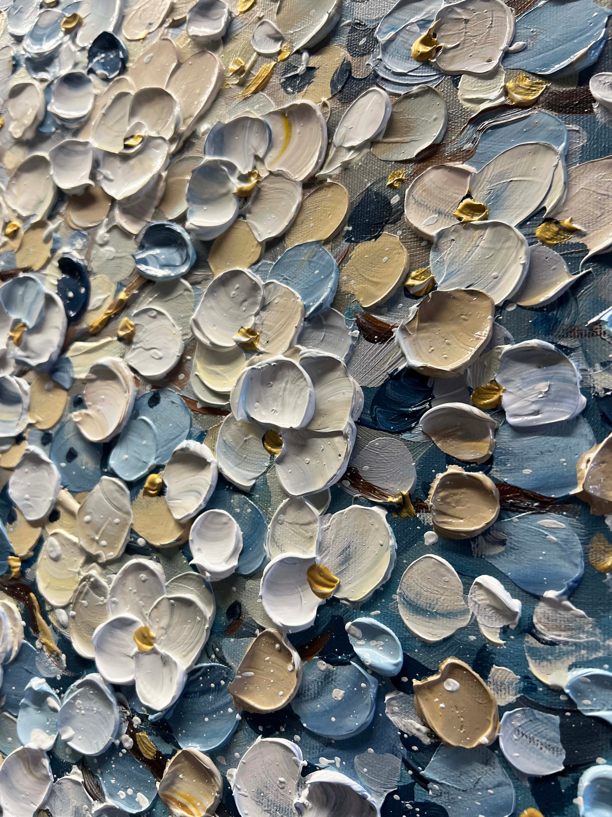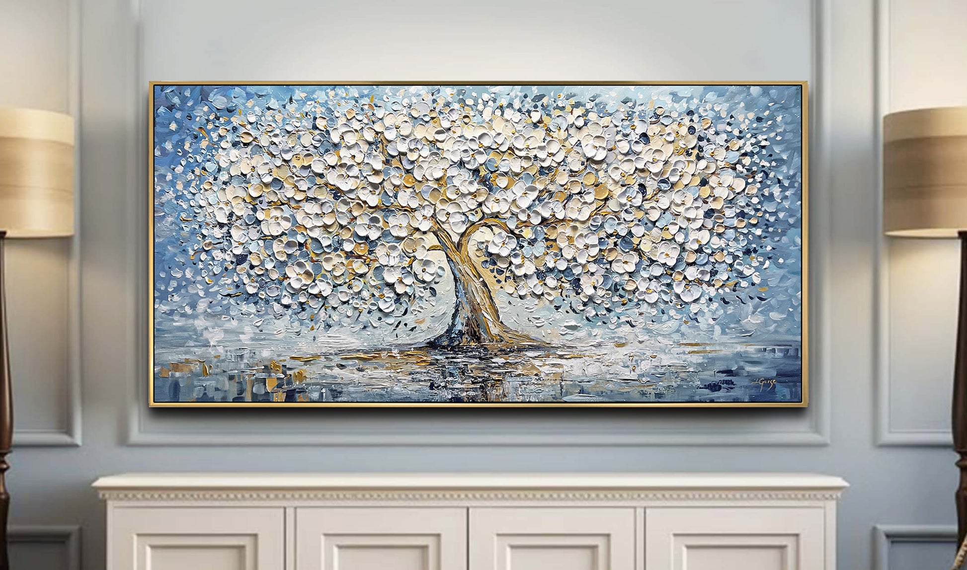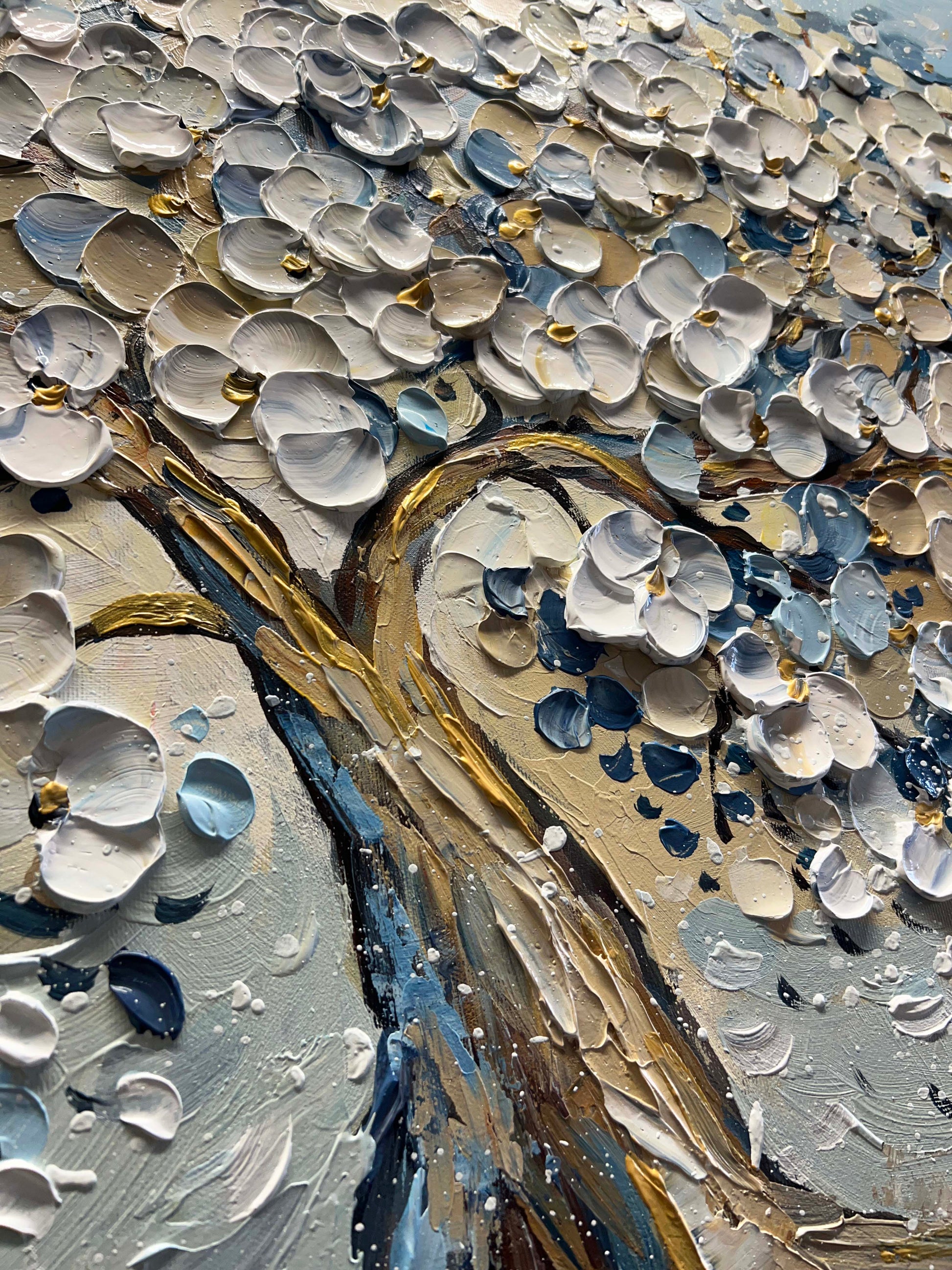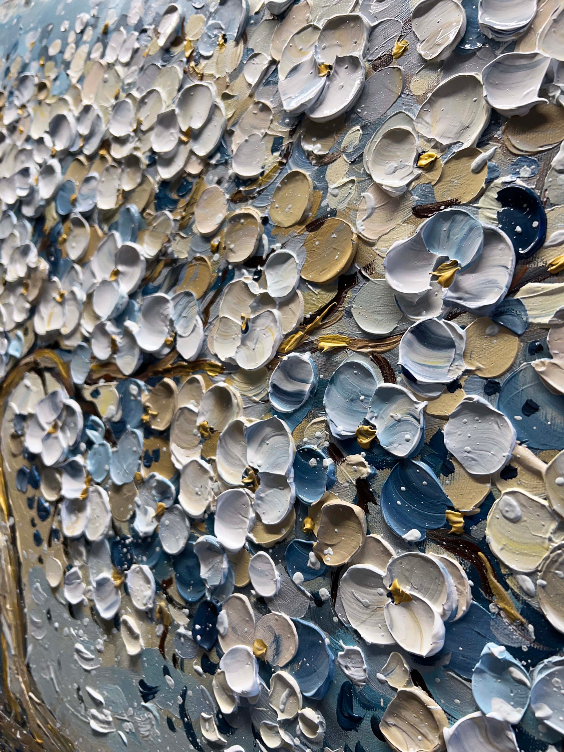 "Bloom of Light" is an elegant textured painting showing a blossoming tree in soft tones of cream, gold, white, and blue.