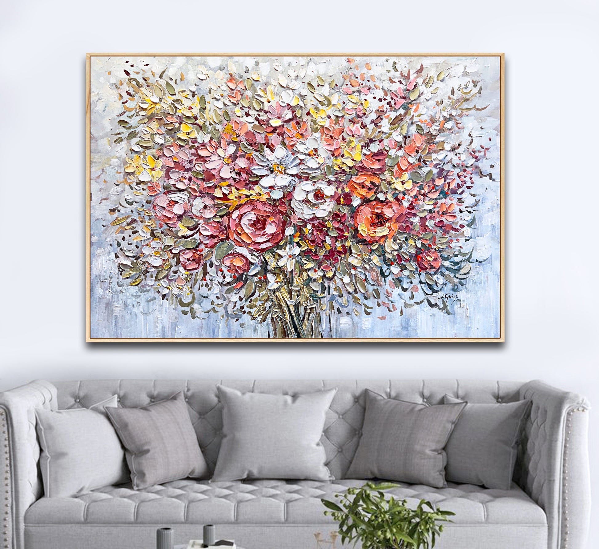 When I painted it, I followed the feeling of red and coral shades, letting each flower come to life like a note in a song. Even the greens have a warm, golden touch that blends right in, adding to the cozy feeling.