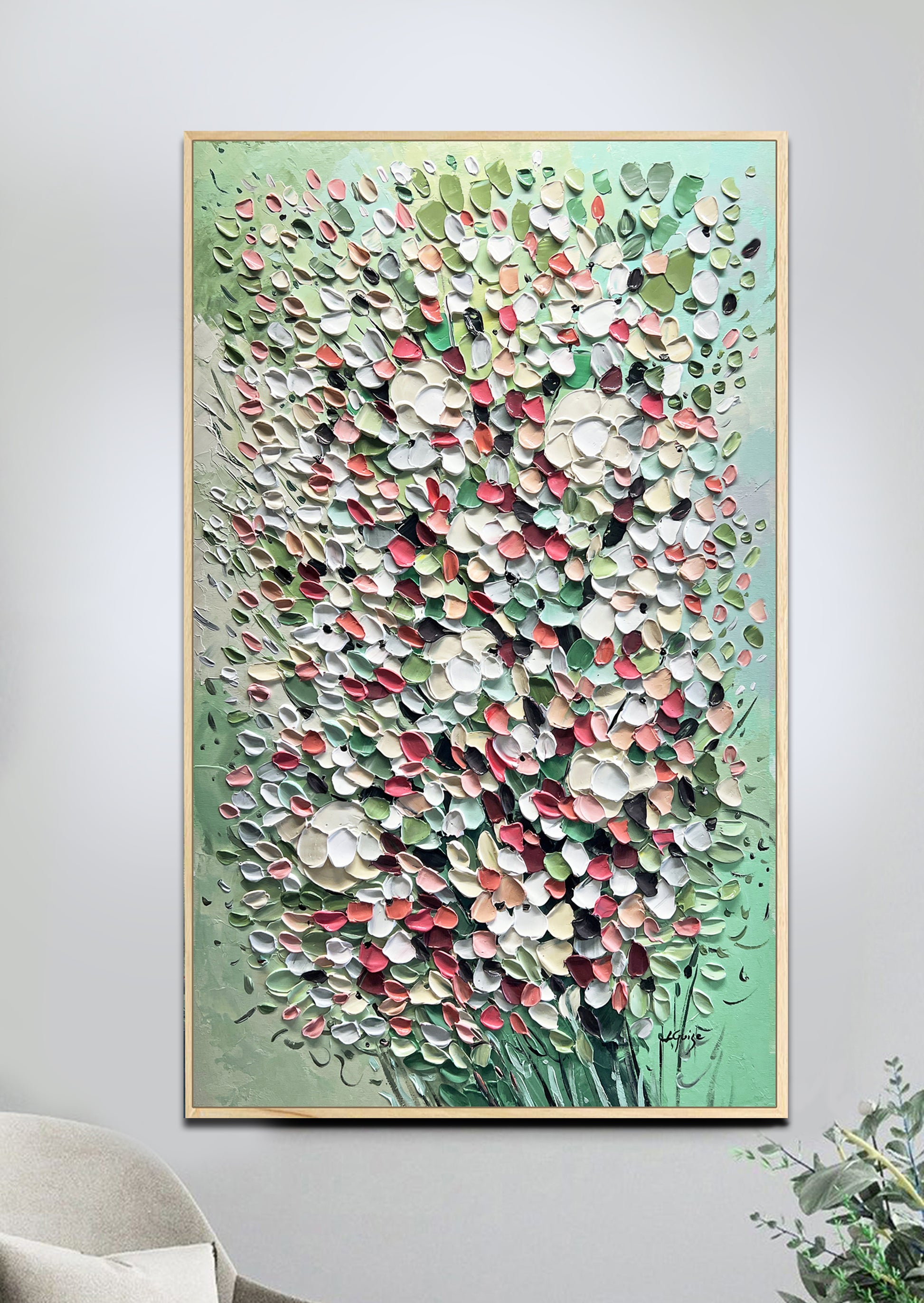 The rich blend of greens, whites, reds, and soft pinks creates a lush, floral atmosphere, almost like nature is dancing in slow motion.