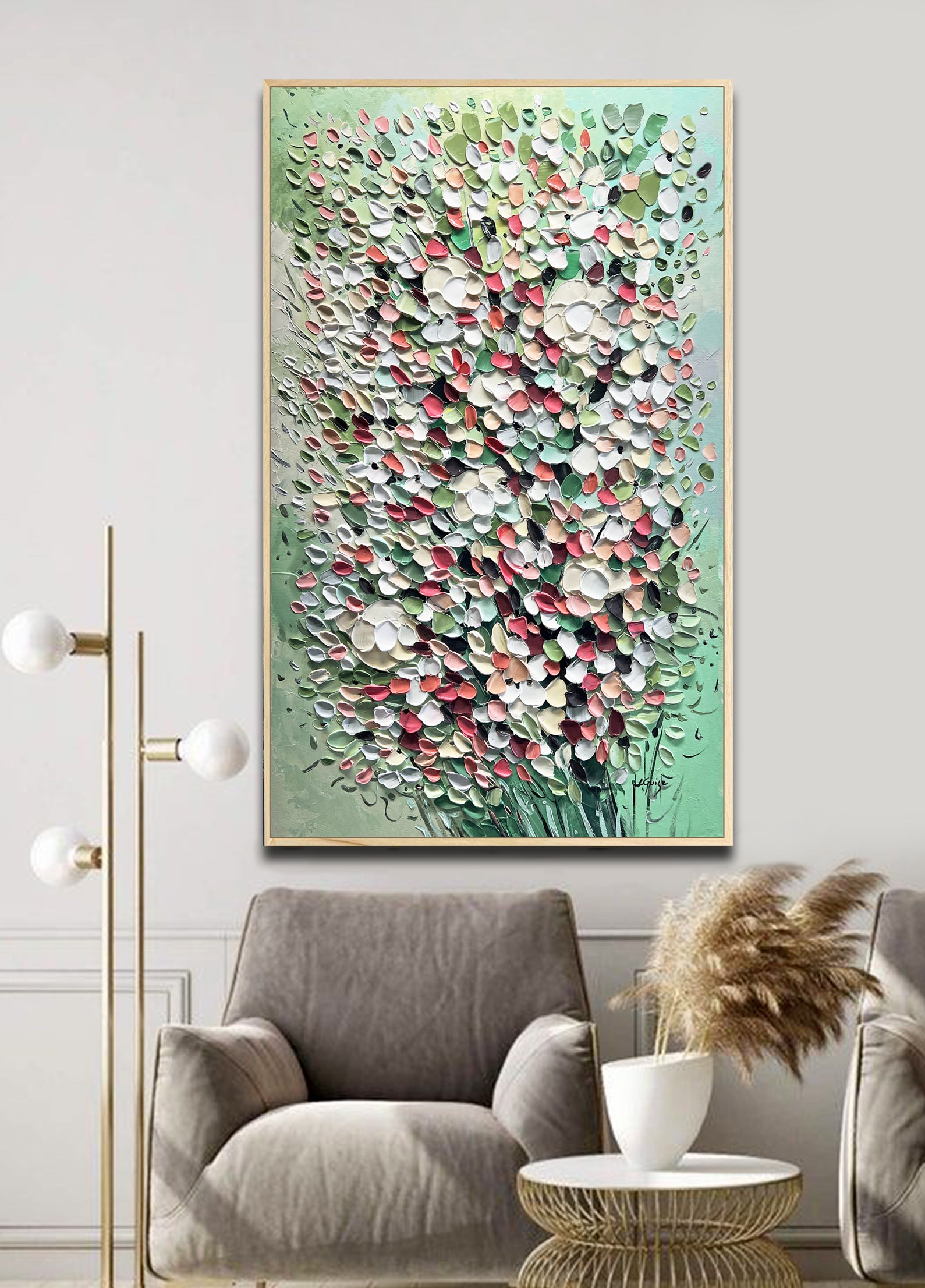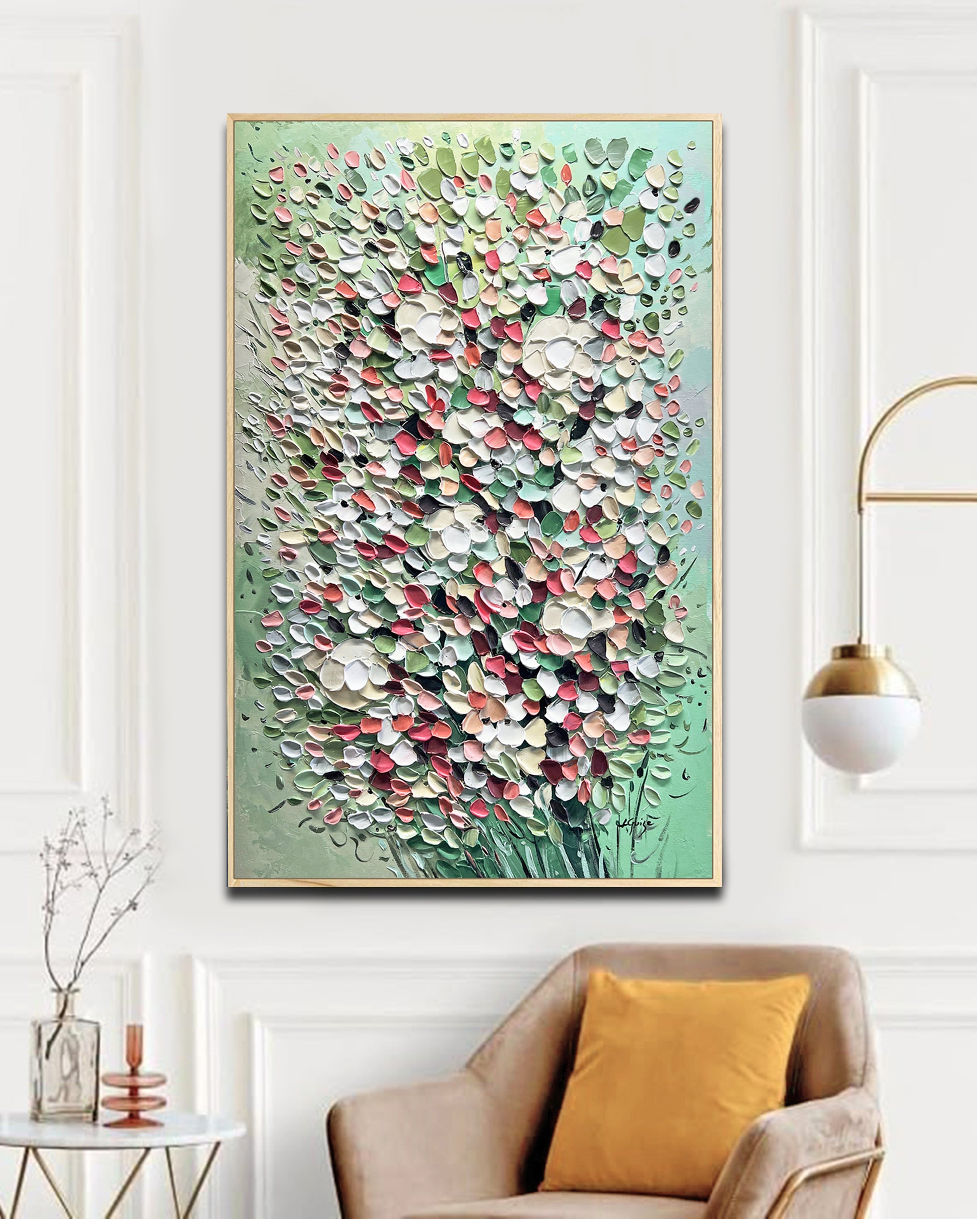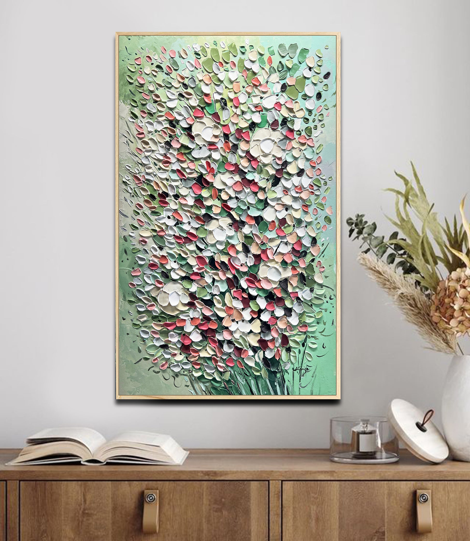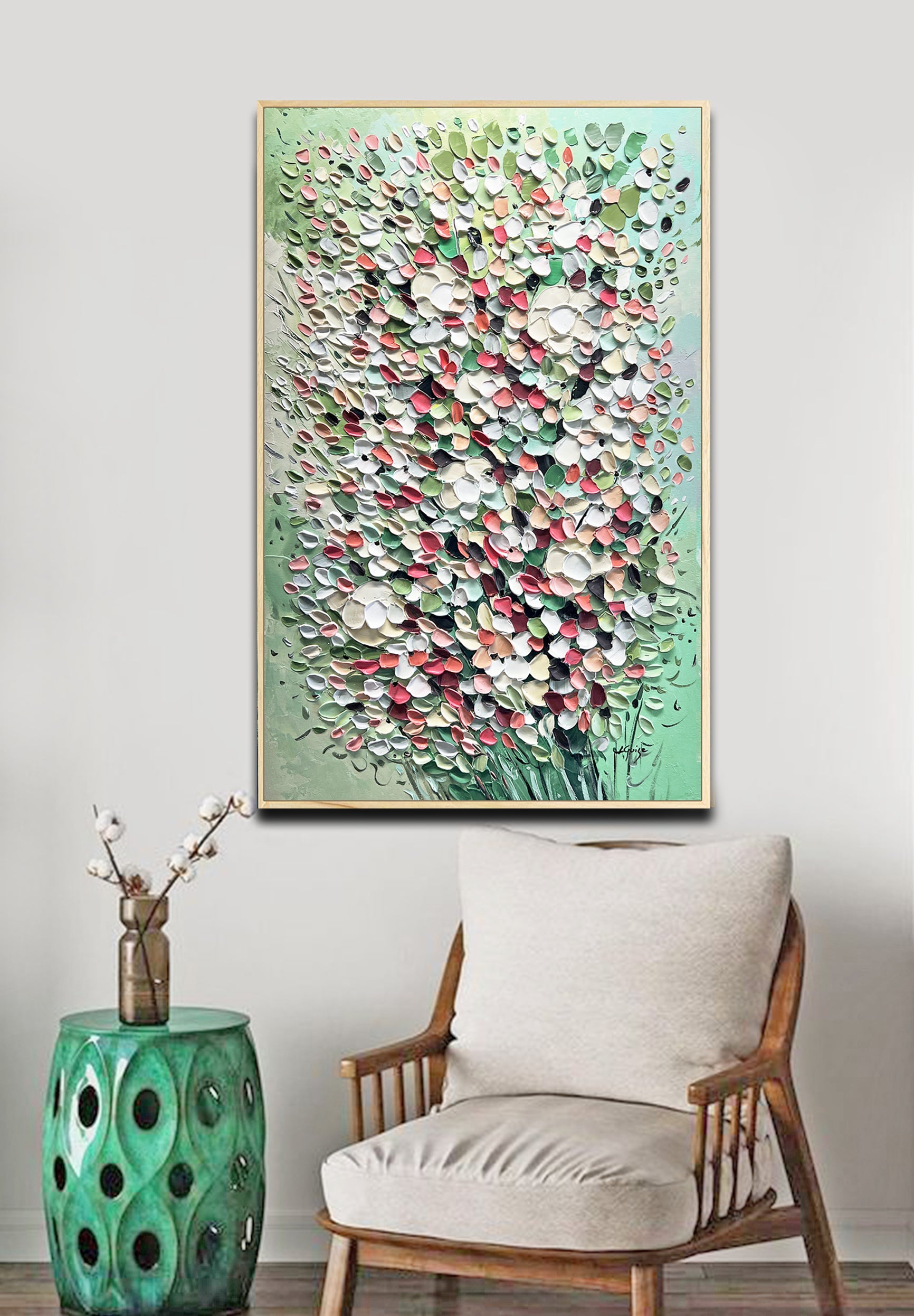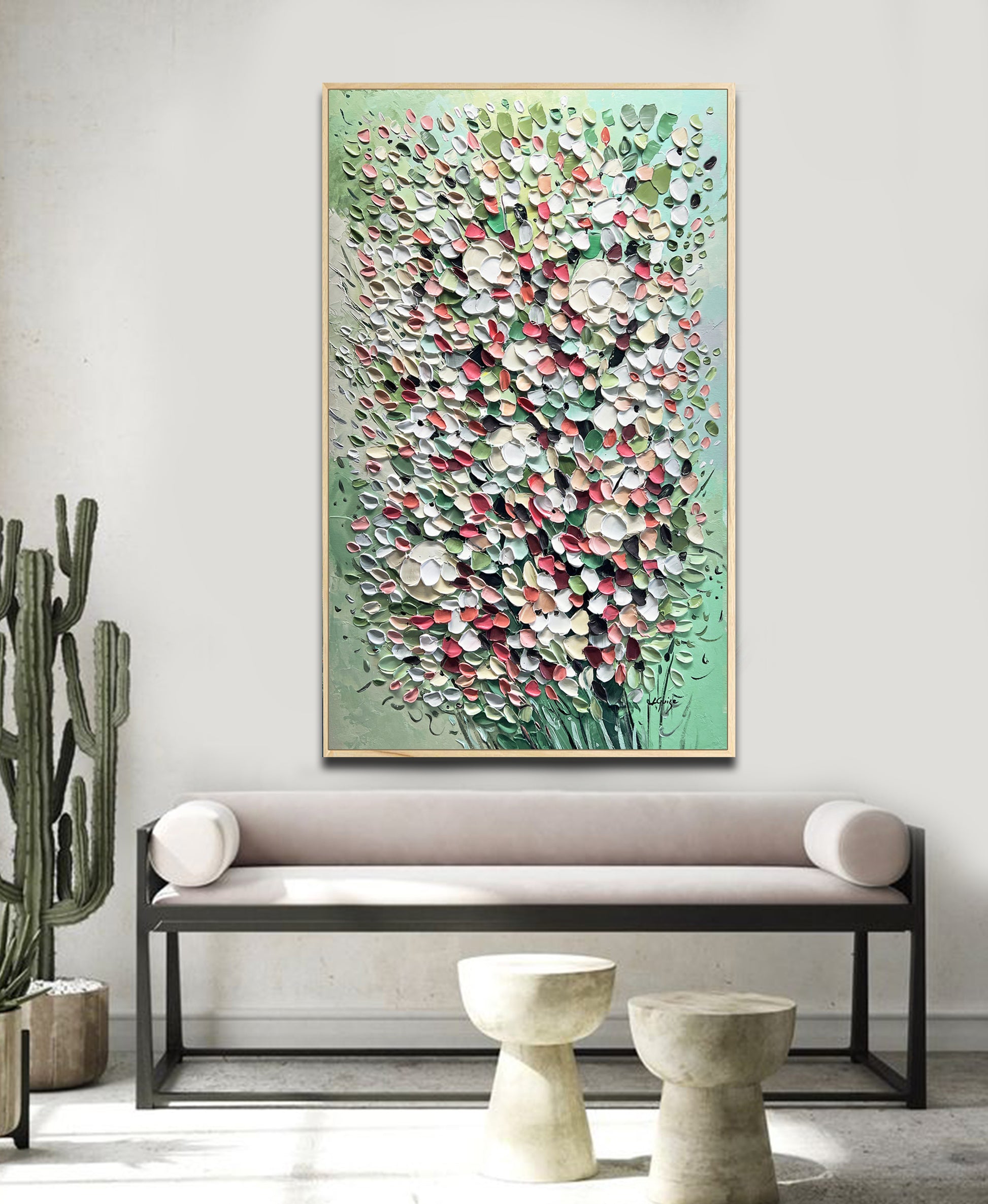 Consider using a natural wooden frame to complement the piece’s organic essence, maintaining a strong and simple connection to nature.