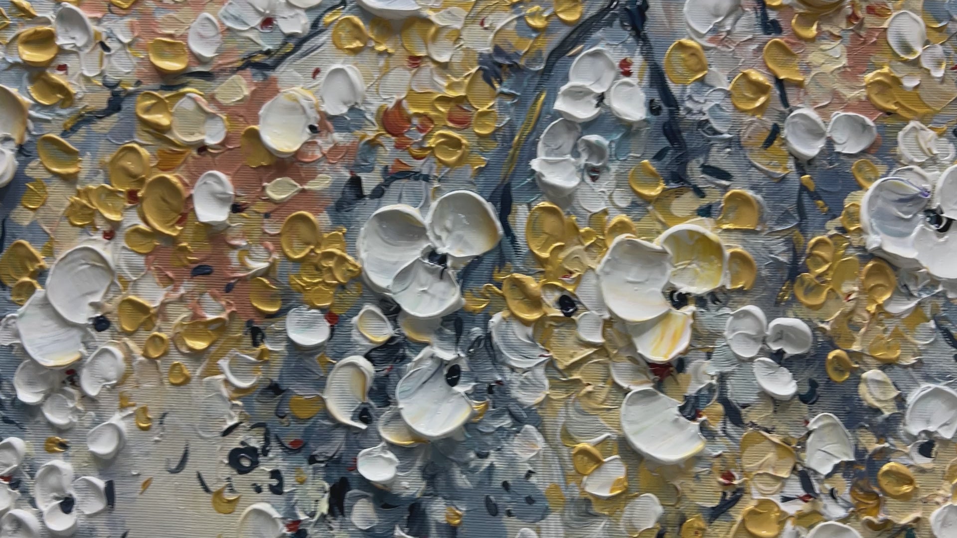 The branches are covered with gentle pink and white flowers, each petal meticulously painted with texture paint.