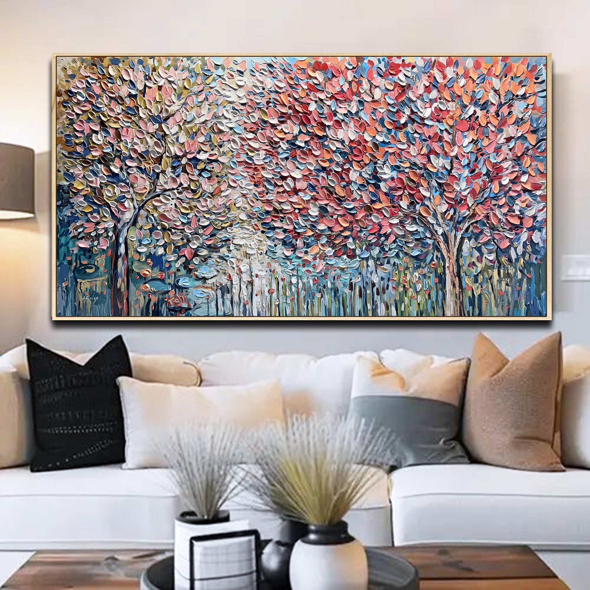 The 2 trees are distinct and unique, each presenting a different color palette: one with soft pinks and creamy whites, the other with warm corals and touches of blue - yet they come together in perfect harmony.