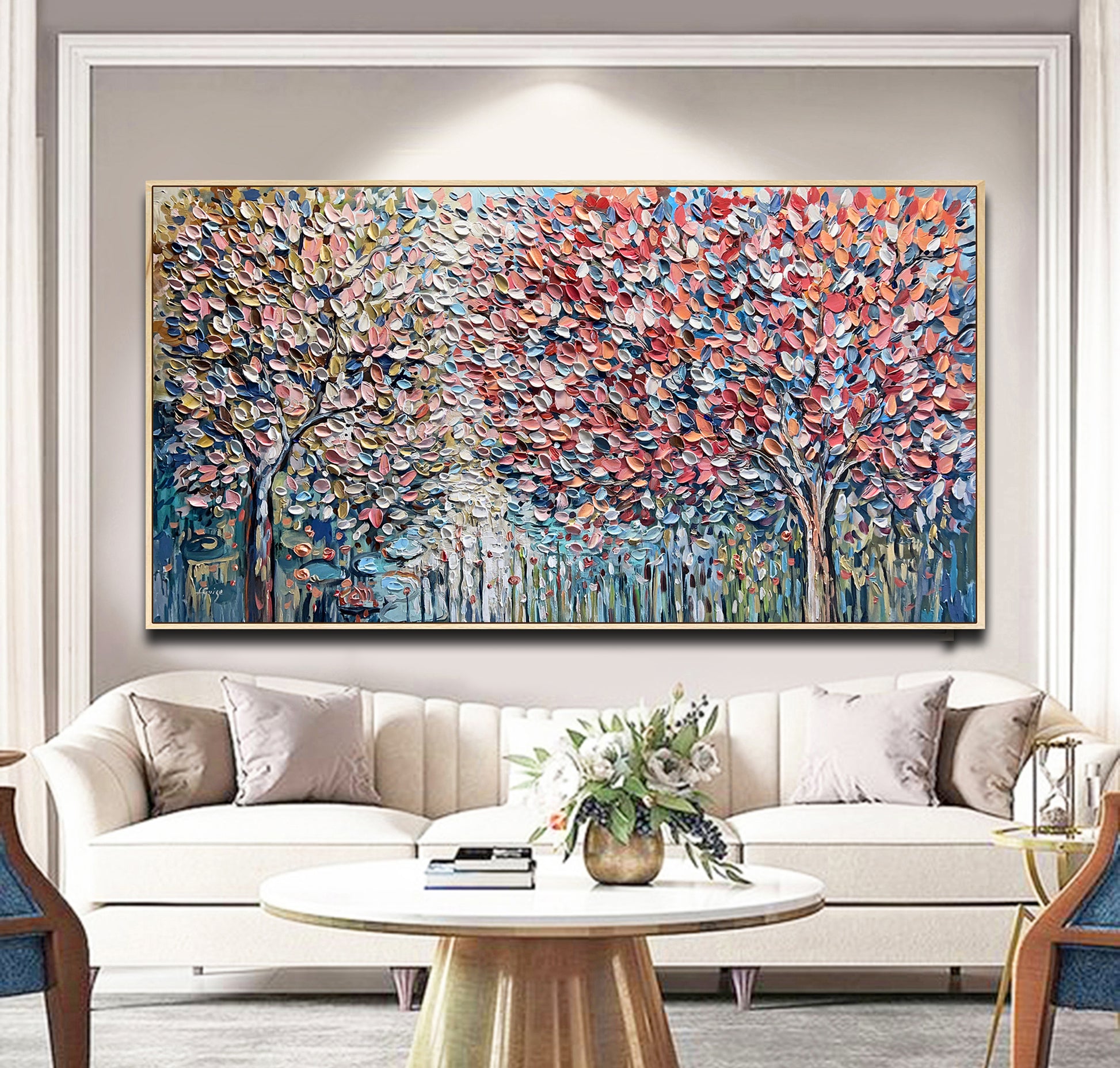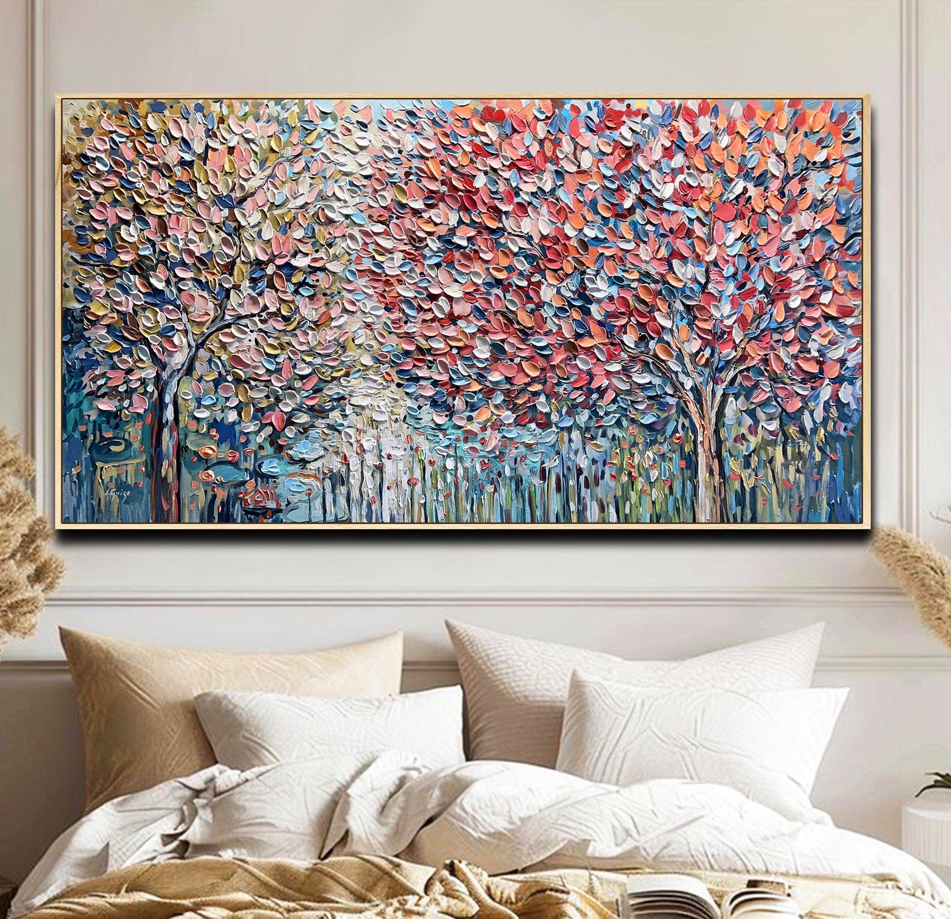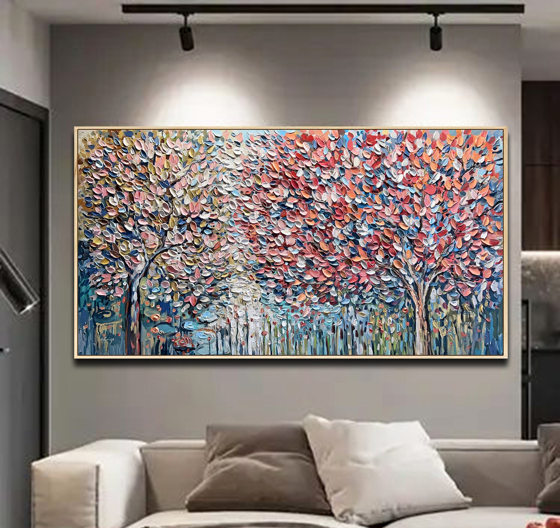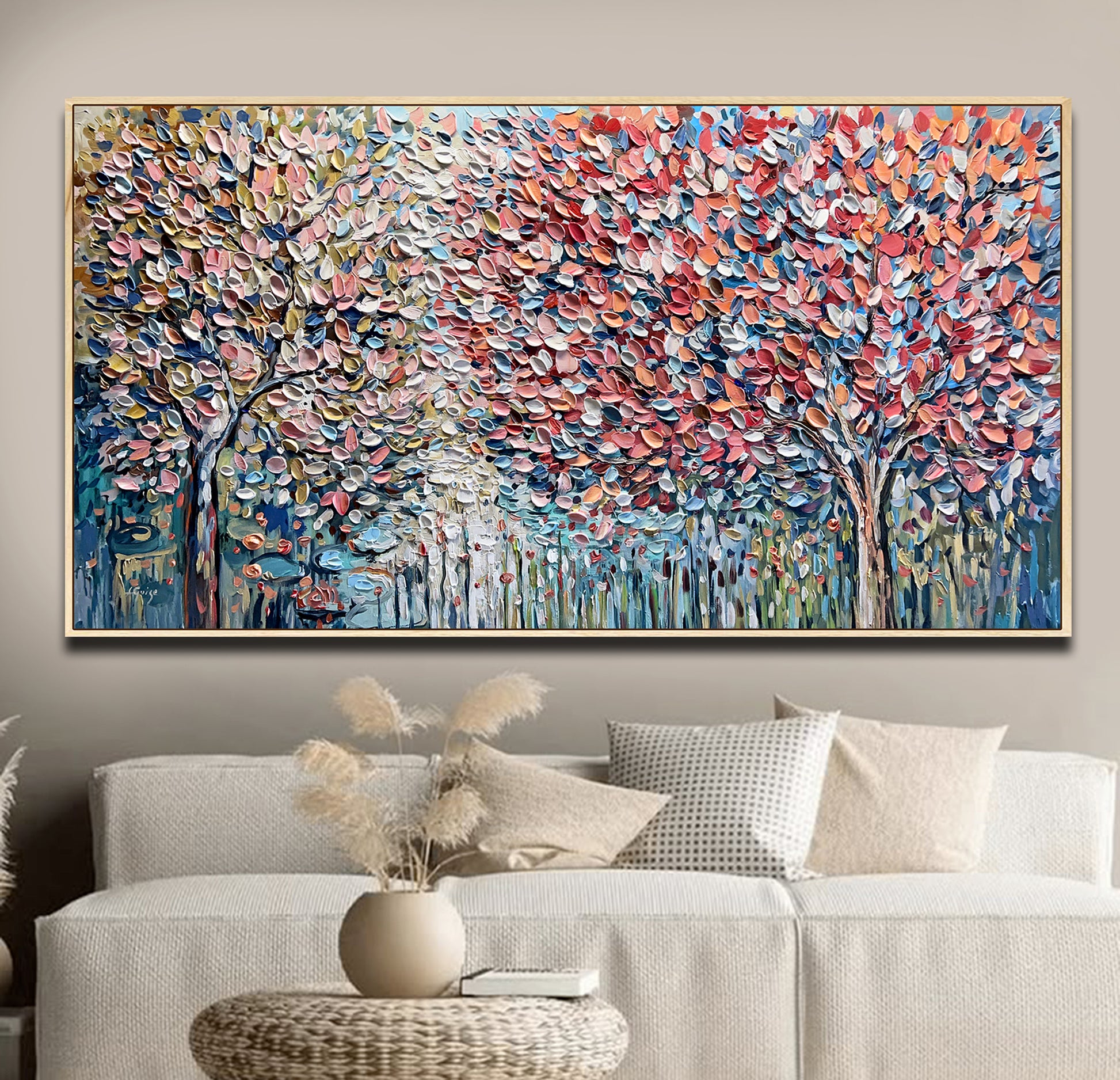 The 2 trees are distinct and unique, each presenting a different color palette: one with soft pinks and creamy whites, the other with warm corals and touches of blue - yet they come together in perfect harmony.