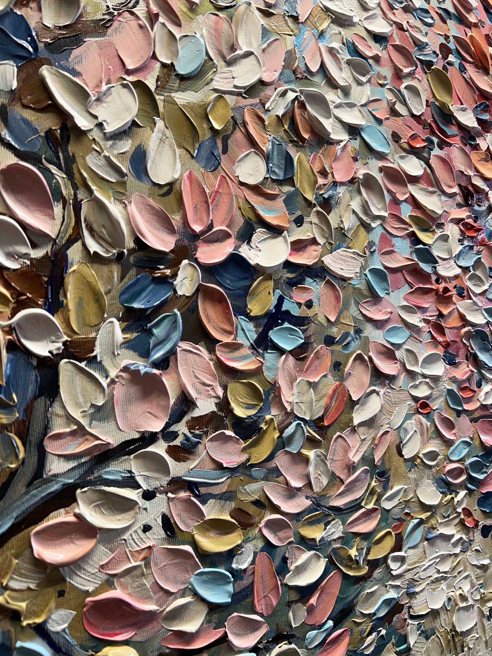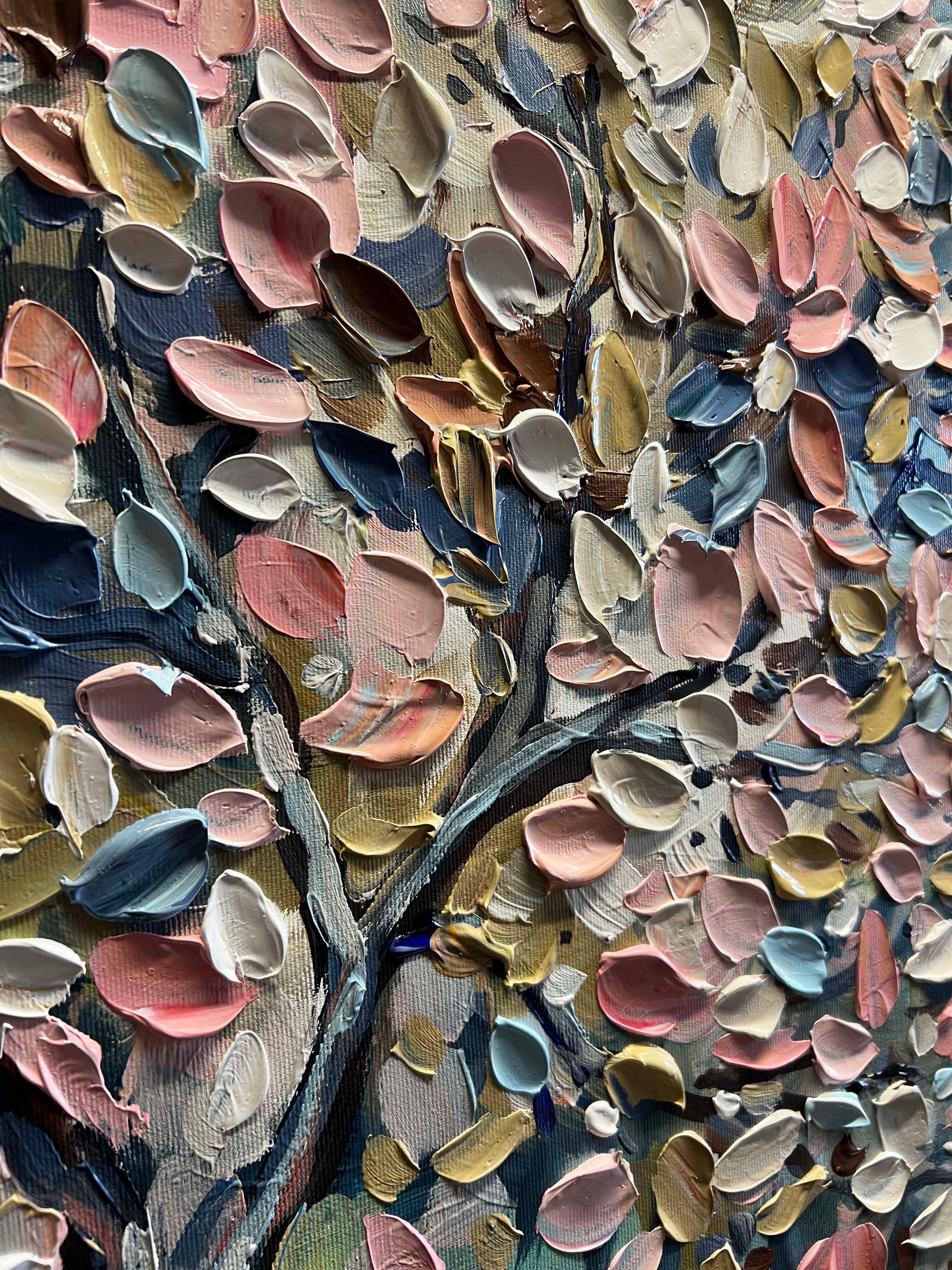 This painting "Blooming Together" is about spring inspiration, the beauty and union of two blossom trees standing side by side.