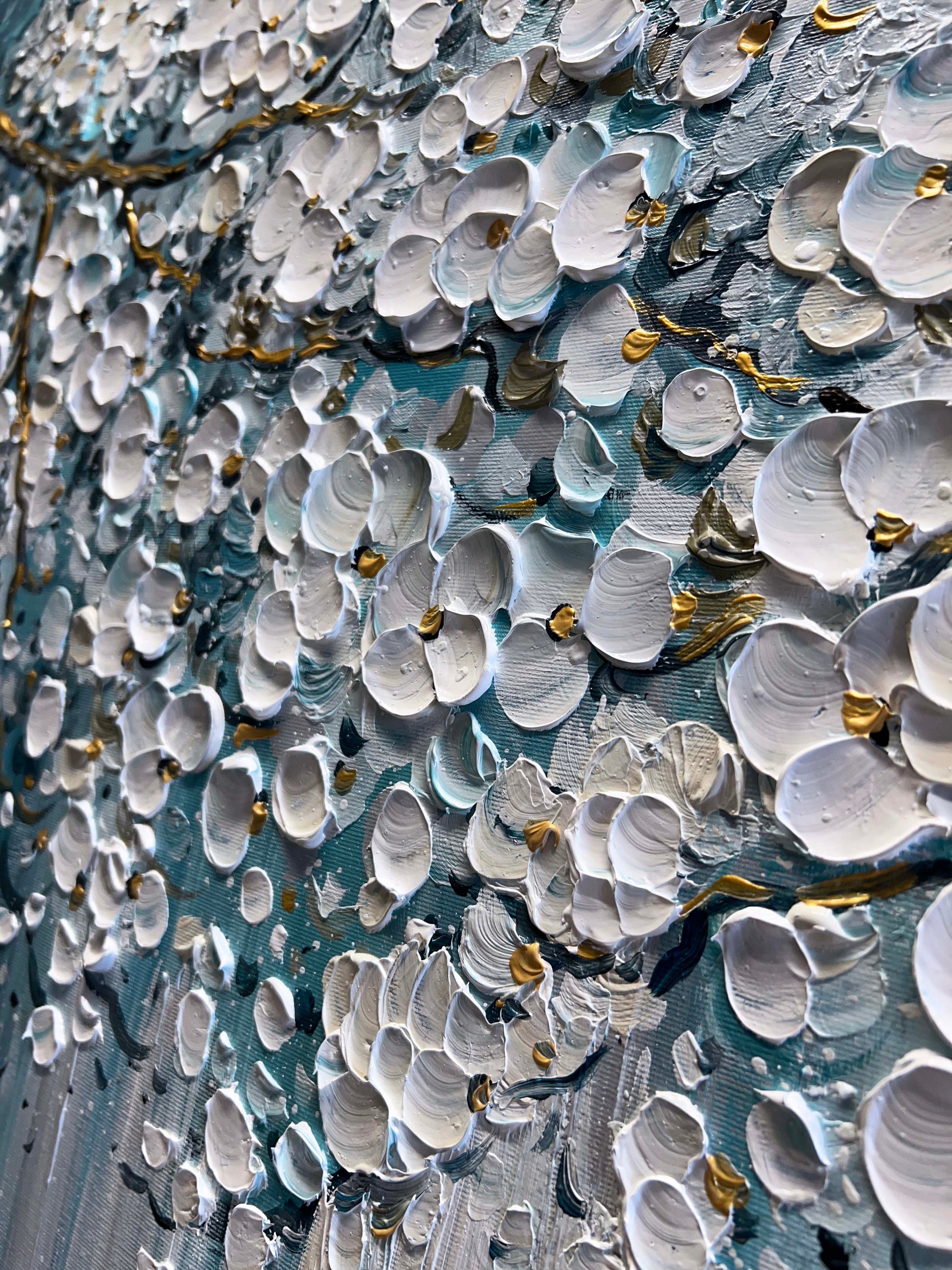 Each blossom is richly layered with thick strokes, creating a luxurious tactile dimension adding depth to the composition.