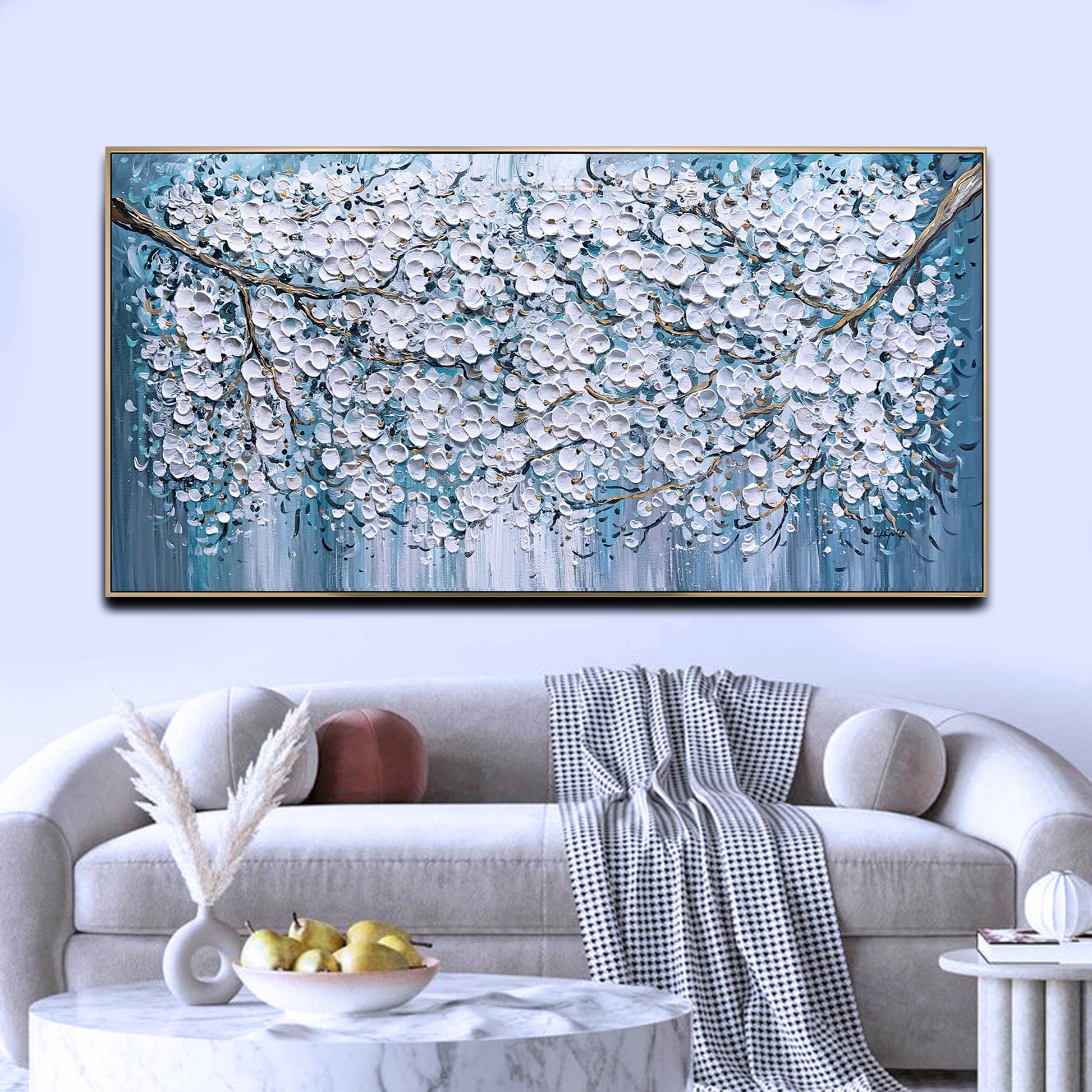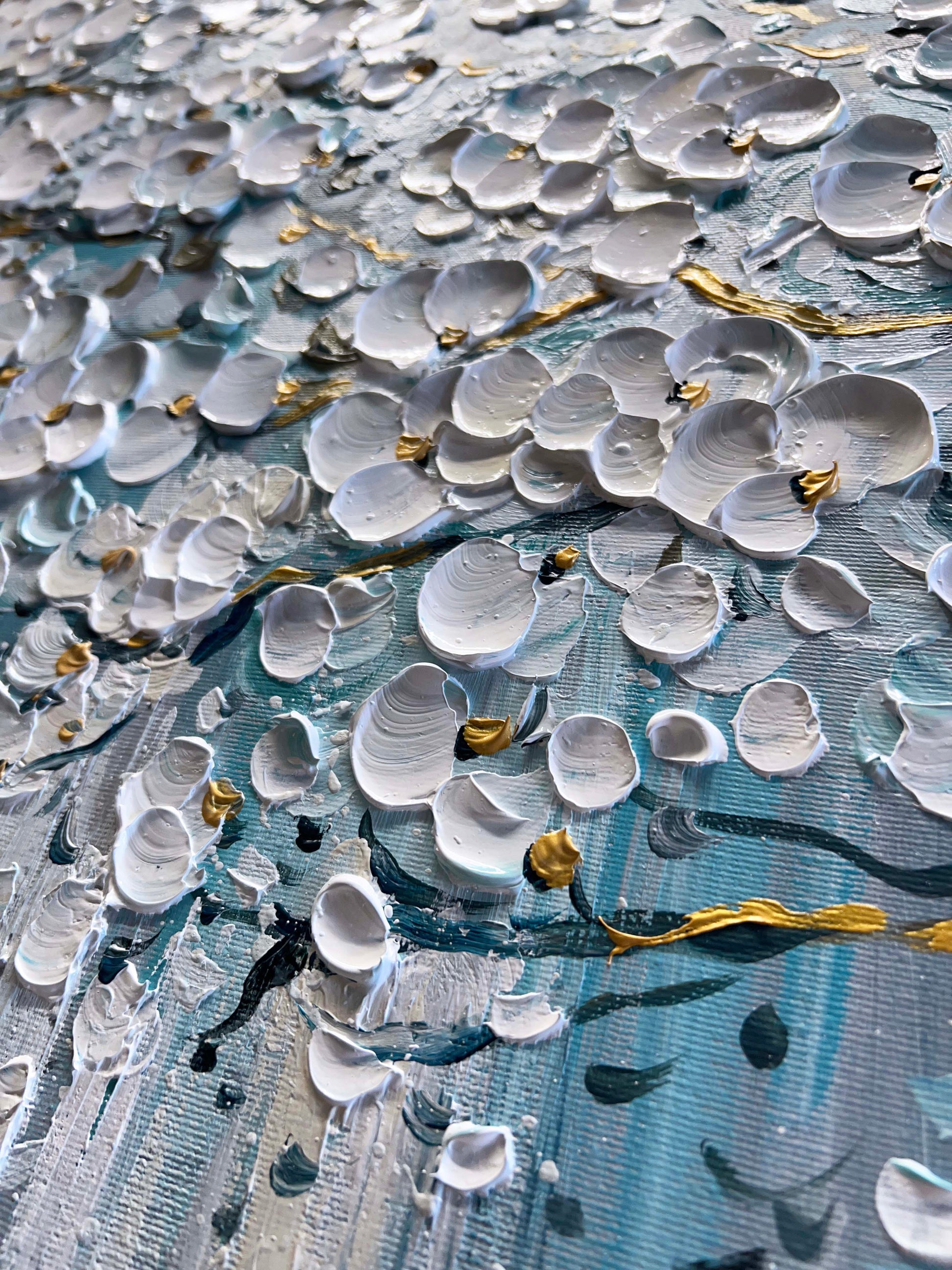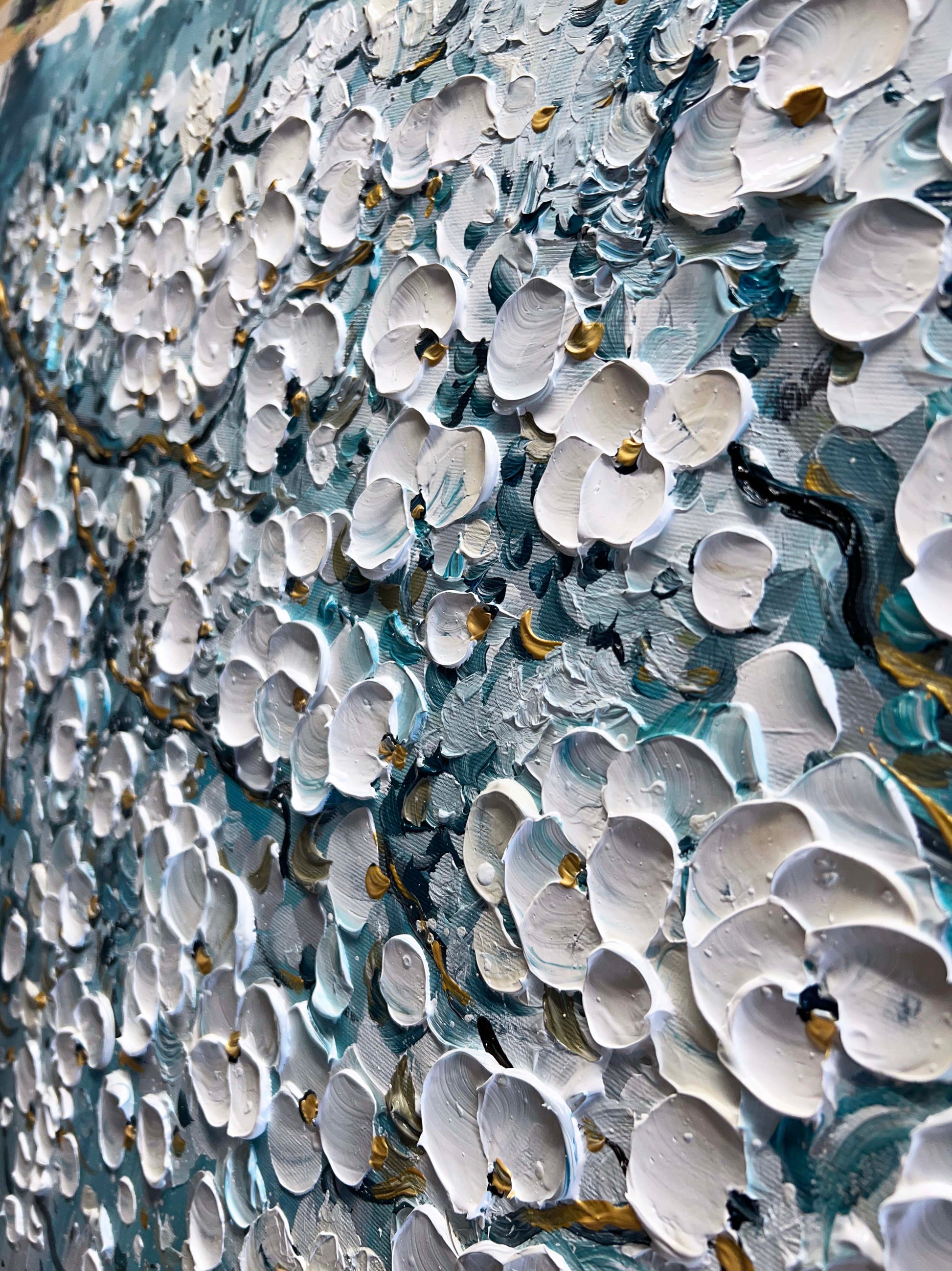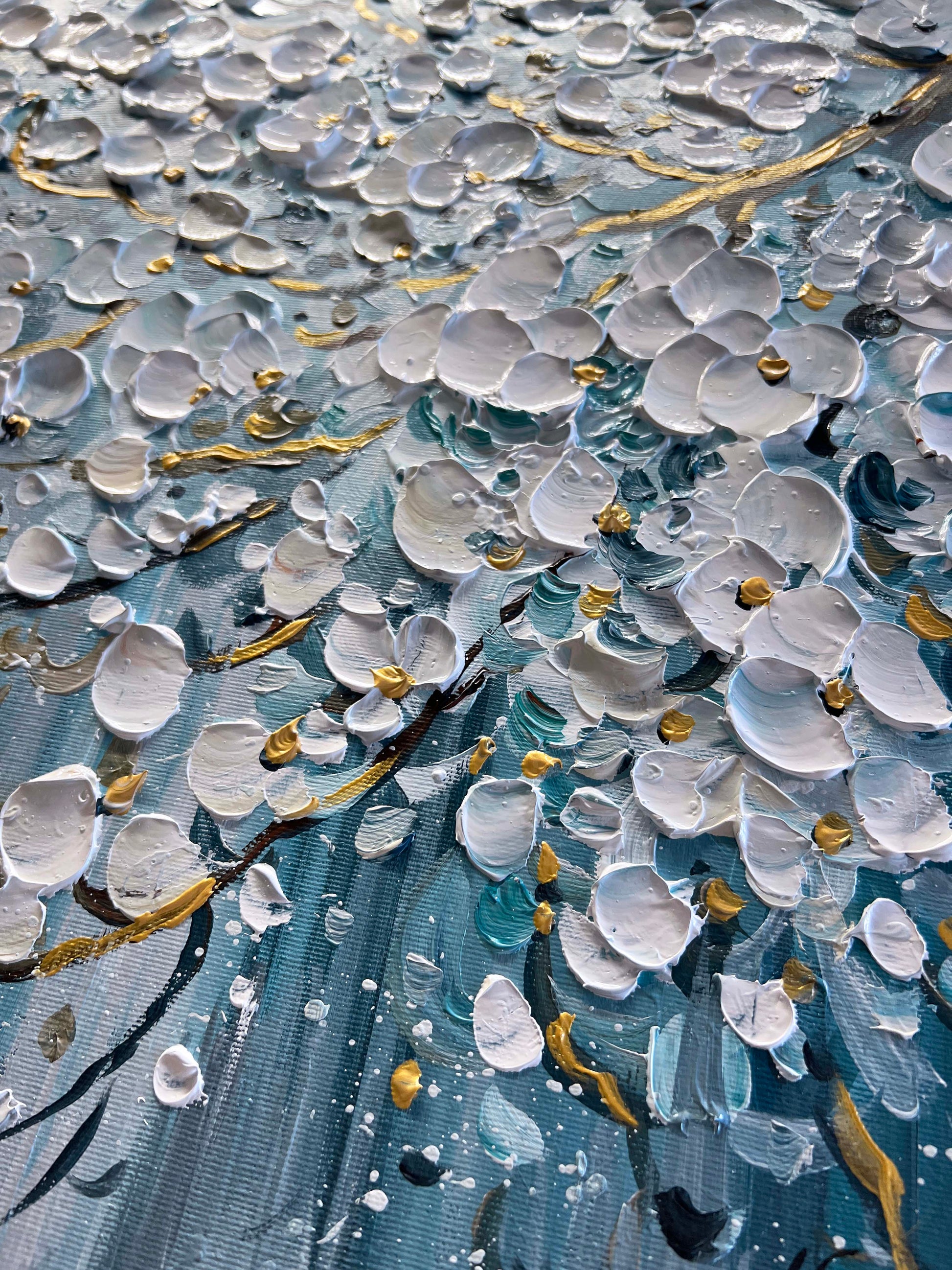 "Blue Sakura Branches" is a textured 3D painting that captures the delicate elegance of blooming sakura blossom branches.