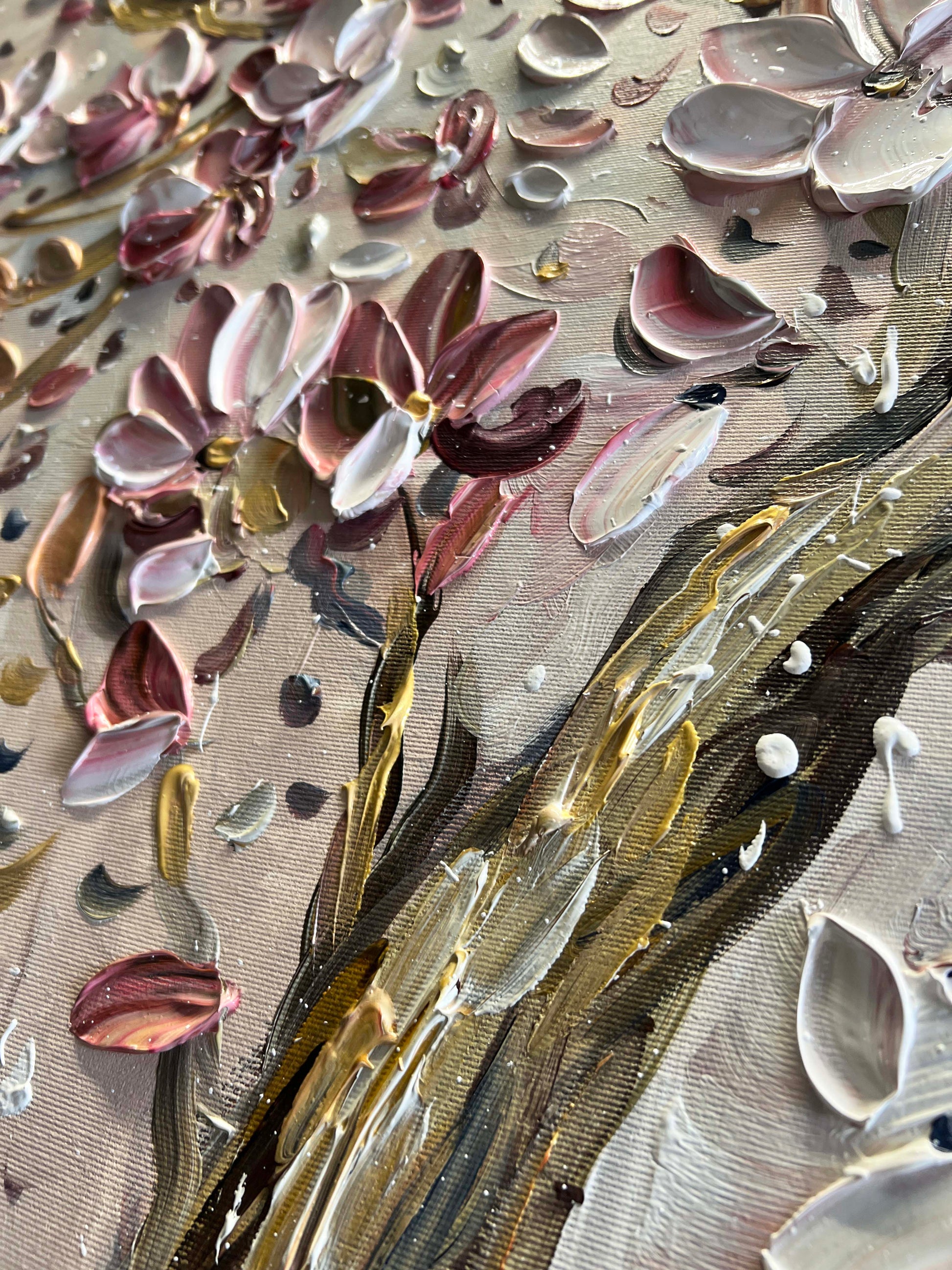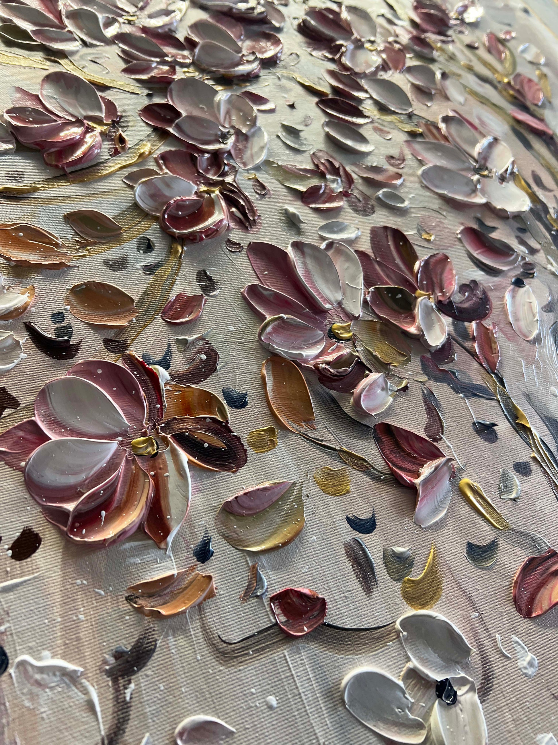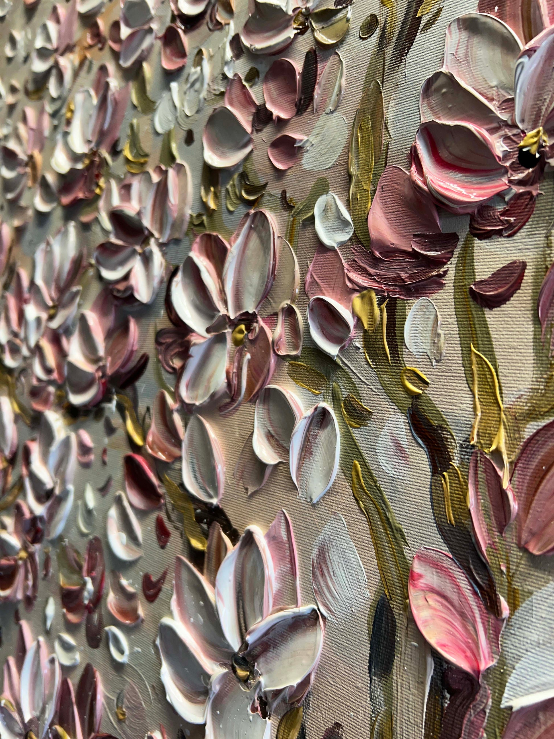 The brushstrokes are thick and layered, giving each flower a three-dimensional presence that almost makes them feel alive.