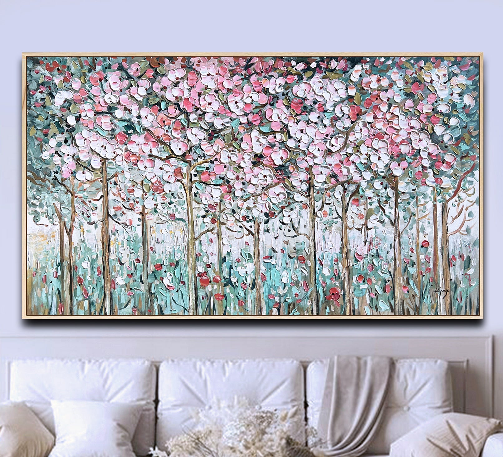 "Cherry Blossom Garden" is a joyful celebration of spring, brought to life through a rich palette of soft pinks, warm whites, and earthy greens.