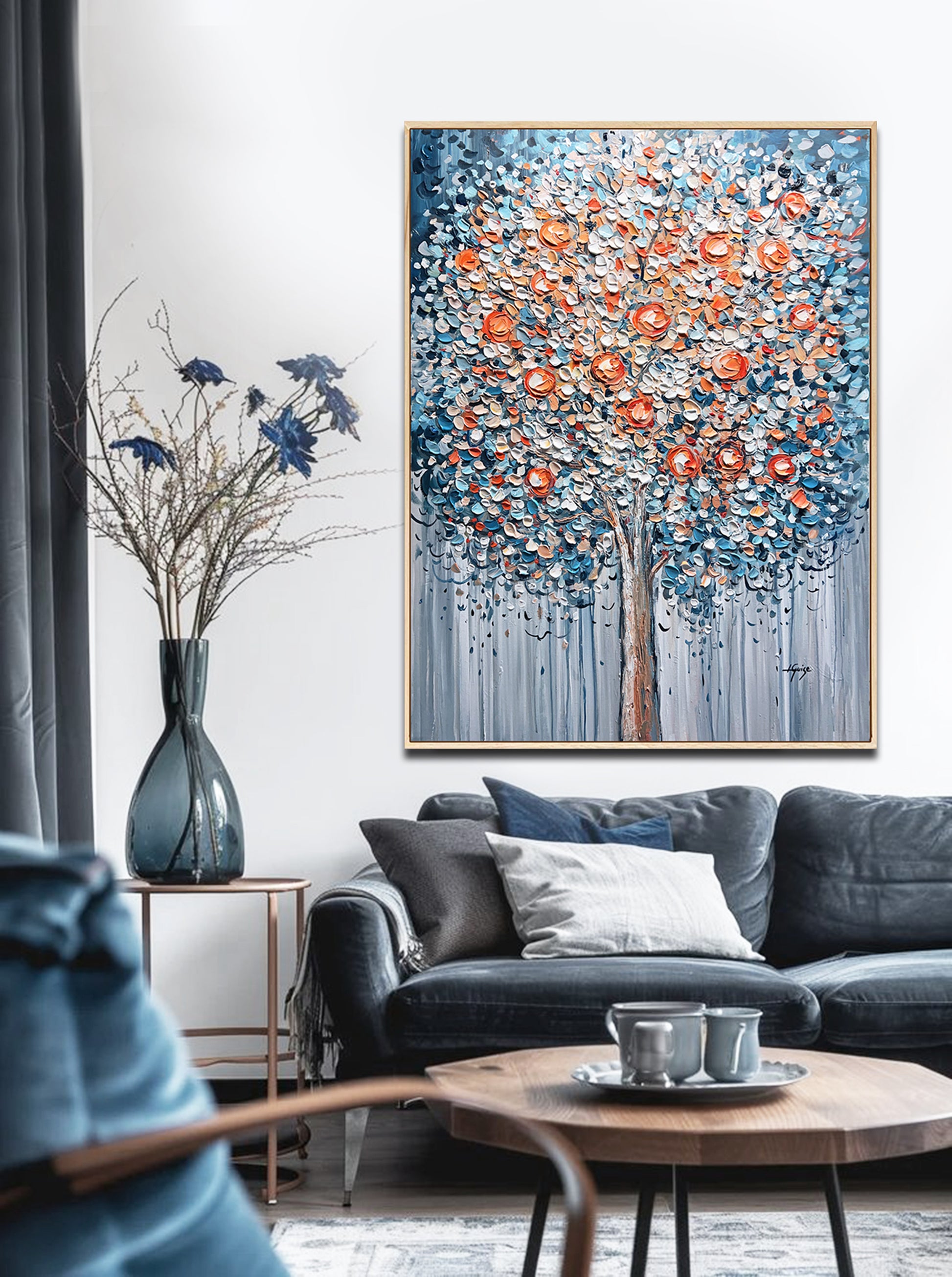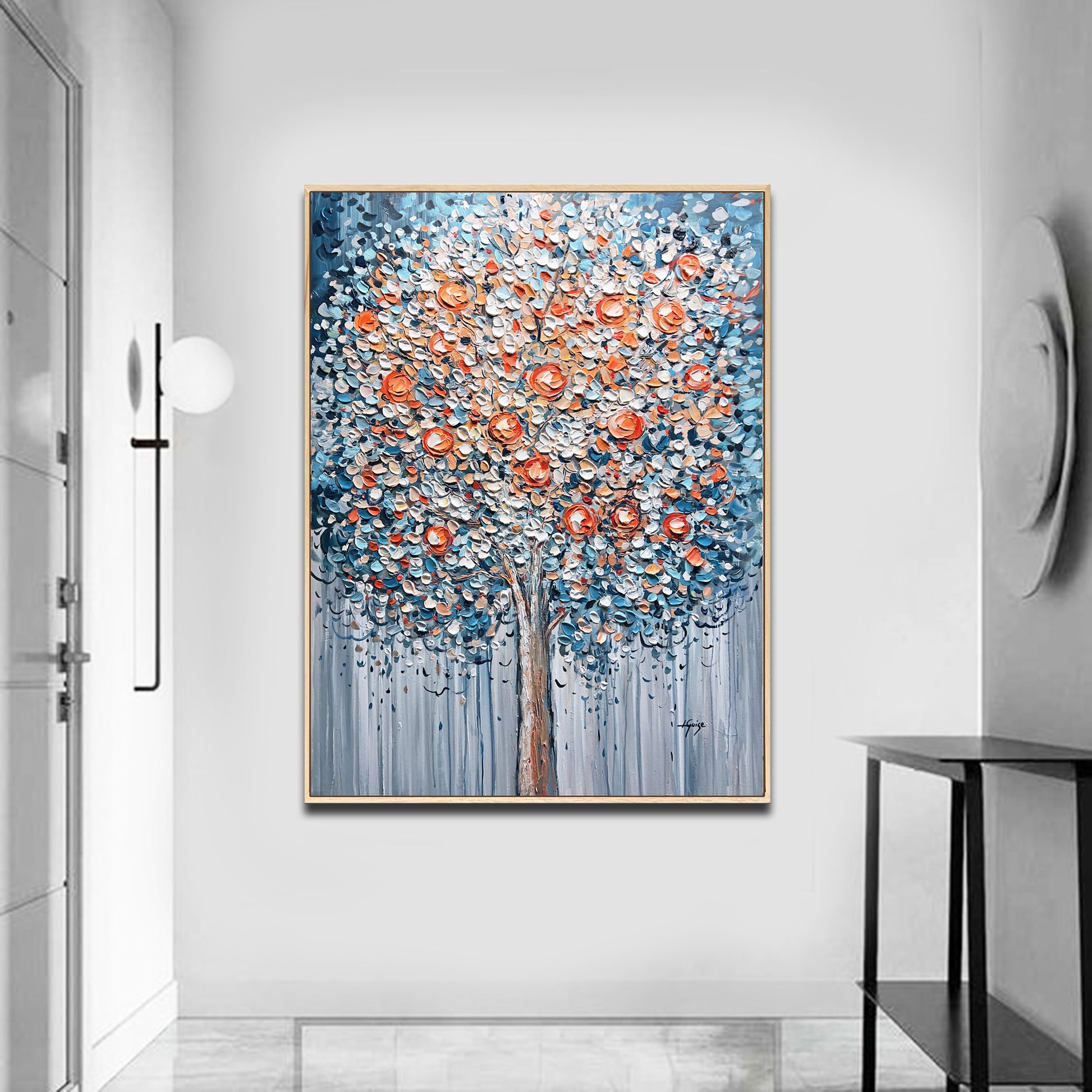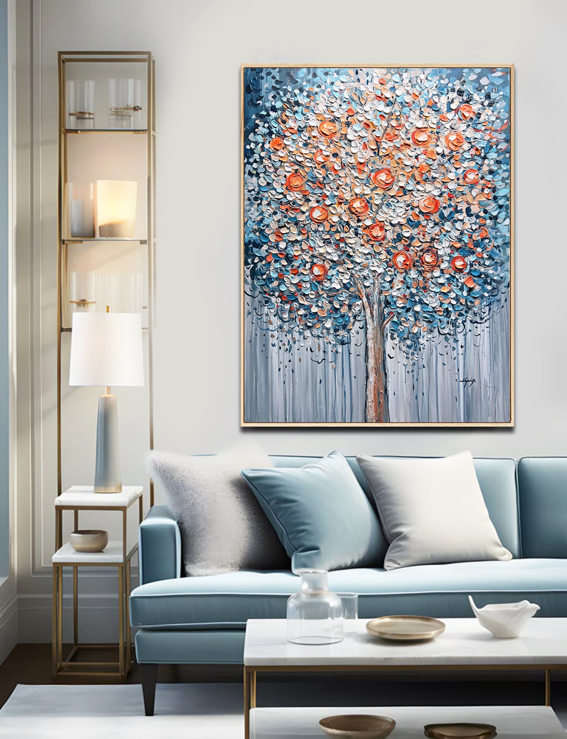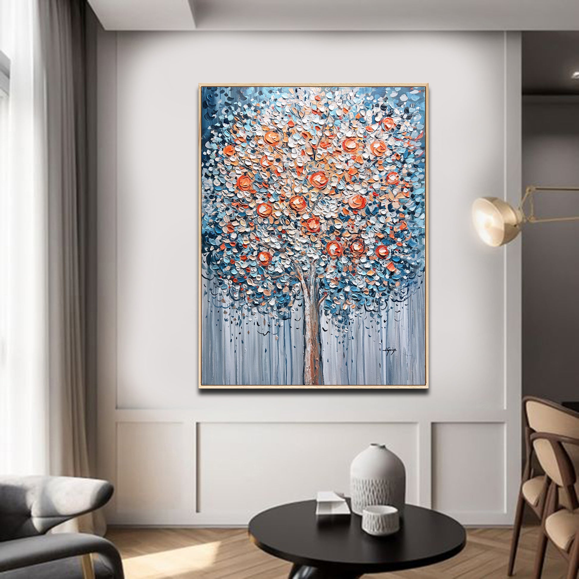 The textured strokes bring depth and movement, with soft whites and teals blending harmoniously, while warm oranges bloom like tiny fruits, symbolizing growth and vitality. The tree stands tall, full of life, its blossoms cascading like a celebration of the season. Consider a natural wood frame to enhance the piece's warmth and organic elegance, inviting the viewer into a world of endless spring.