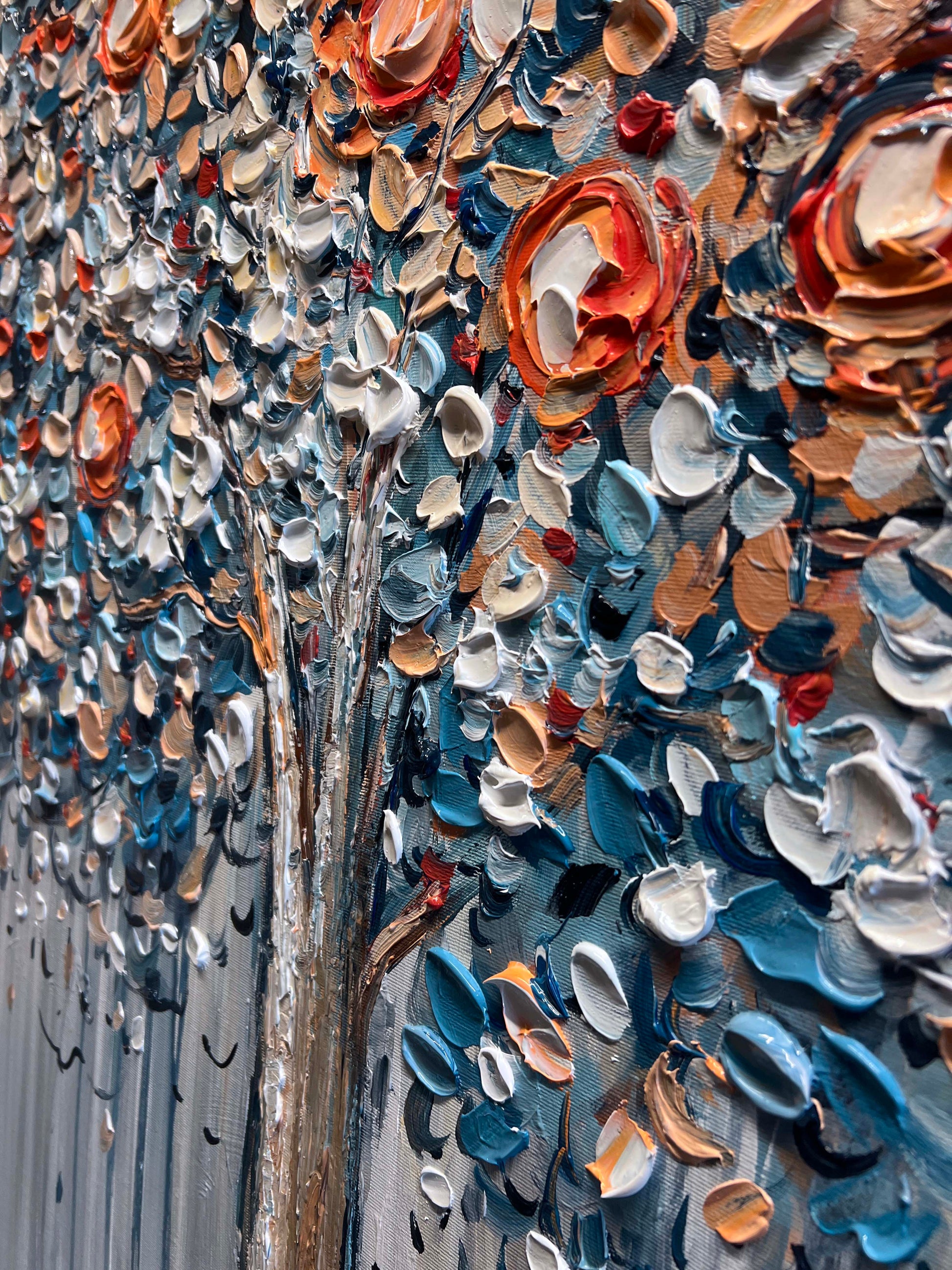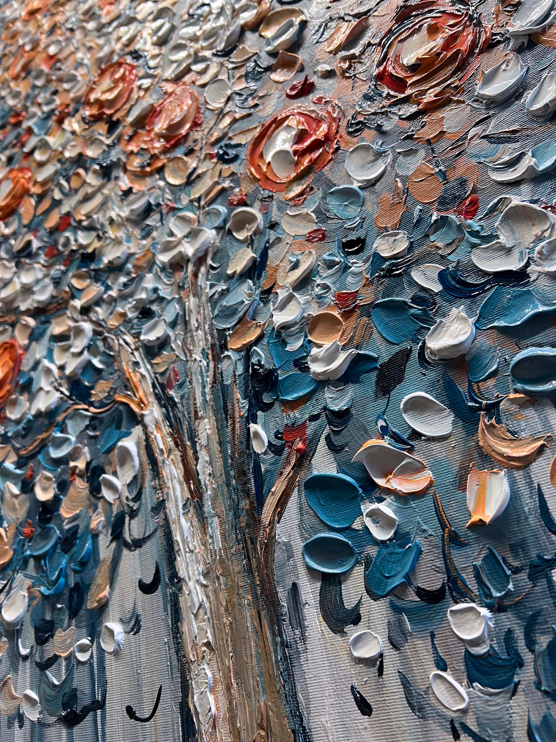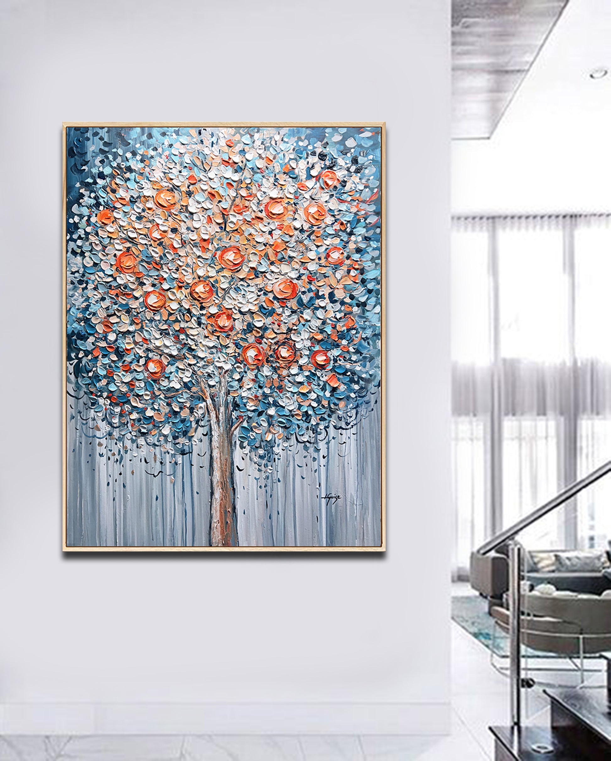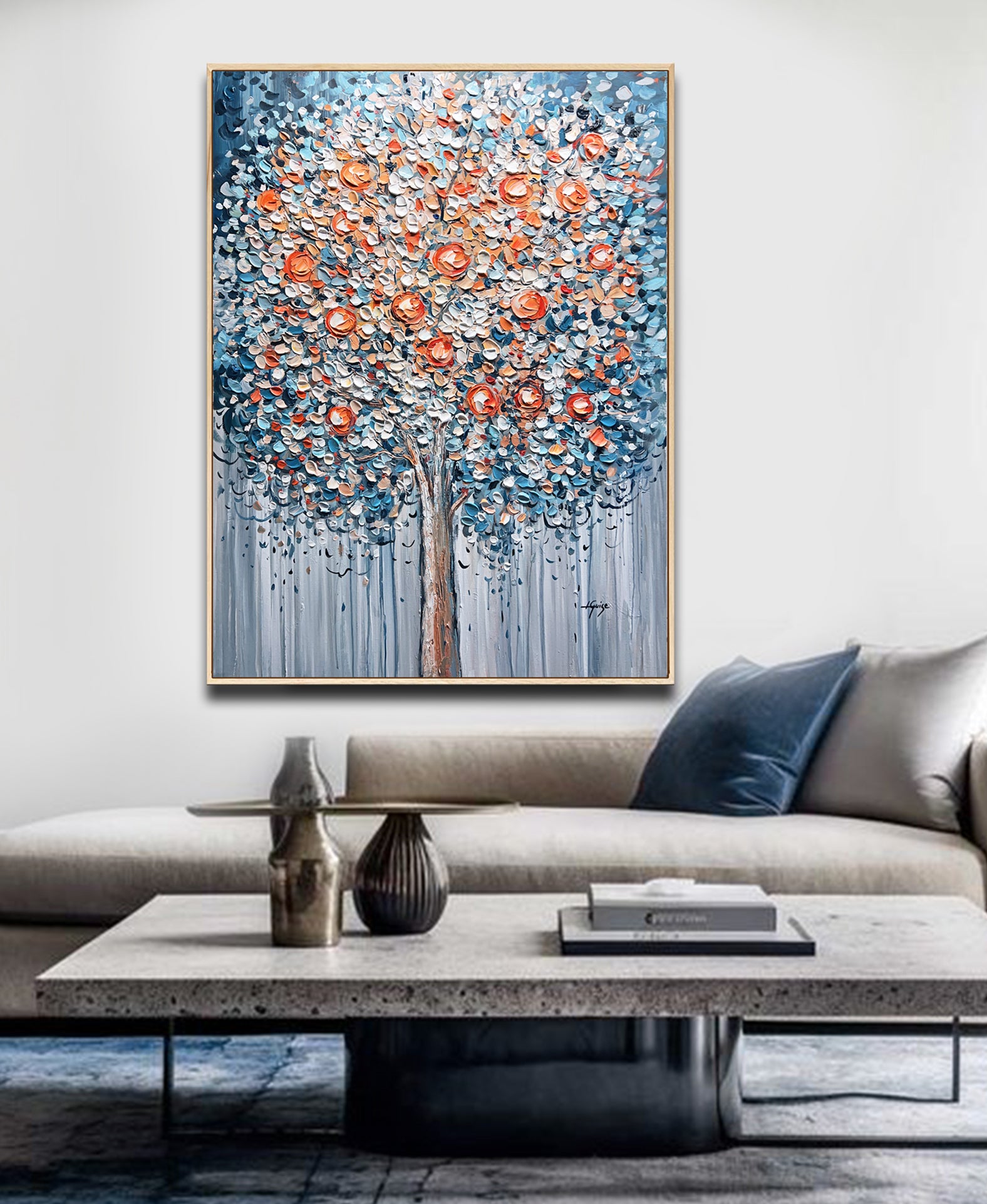 The textured strokes bring depth and movement, with soft whites and teals blending harmoniously, while warm oranges bloom like tiny fruits, symbolizing growth and vitality. The tree stands tall, full of life, its blossoms cascading like a celebration of the season. Consider a natural wood frame to enhance the piece's warmth and organic elegance, inviting the viewer into a world of endless spring.