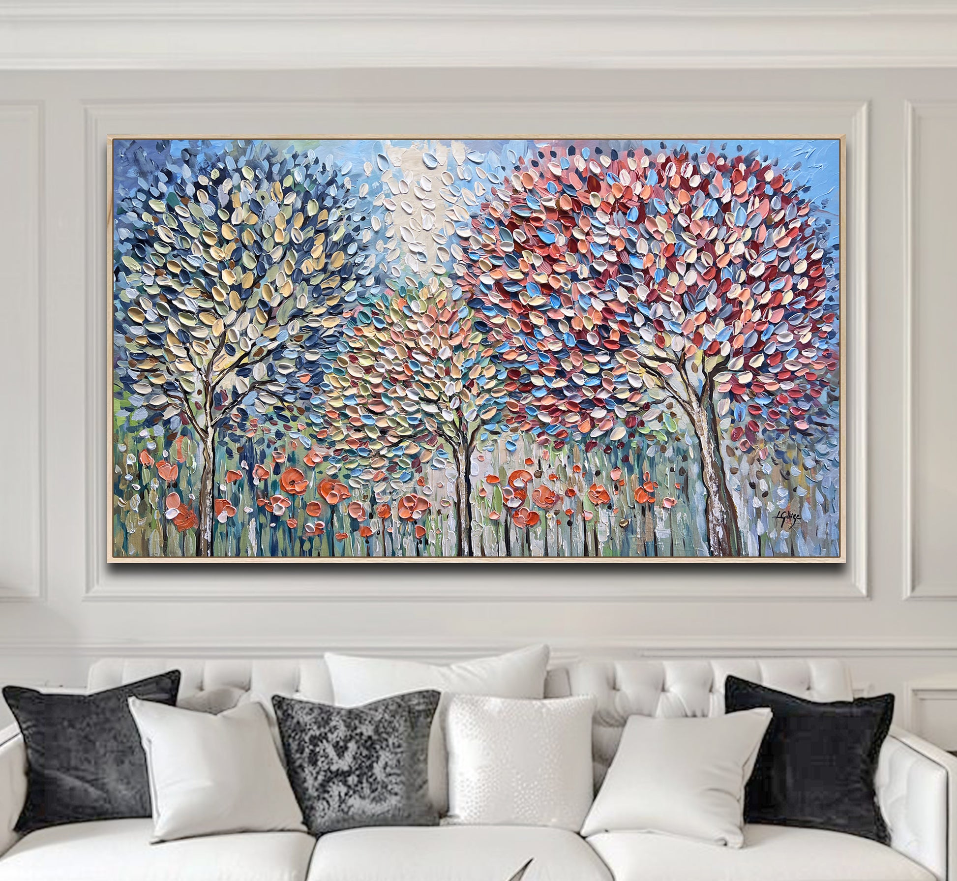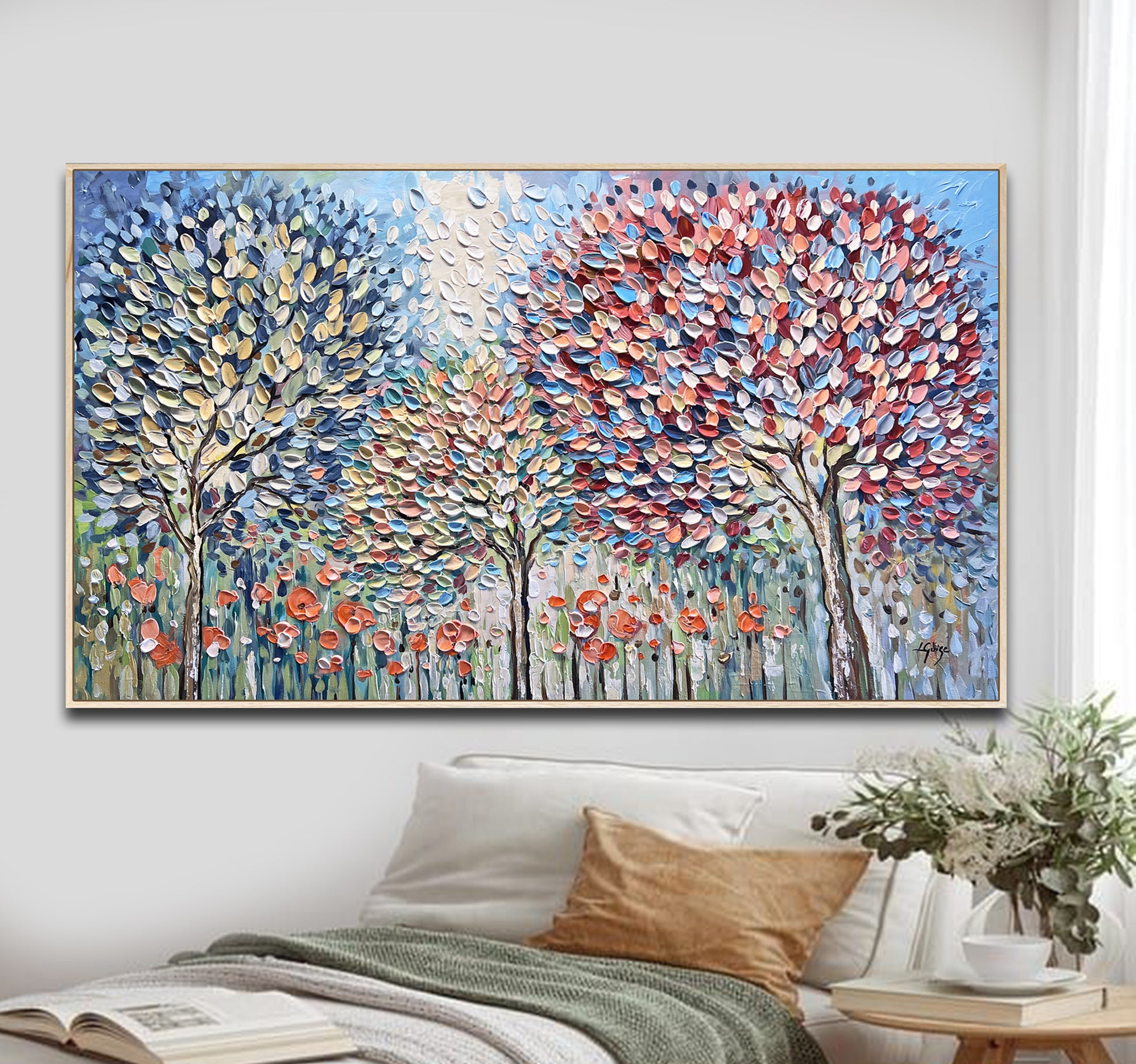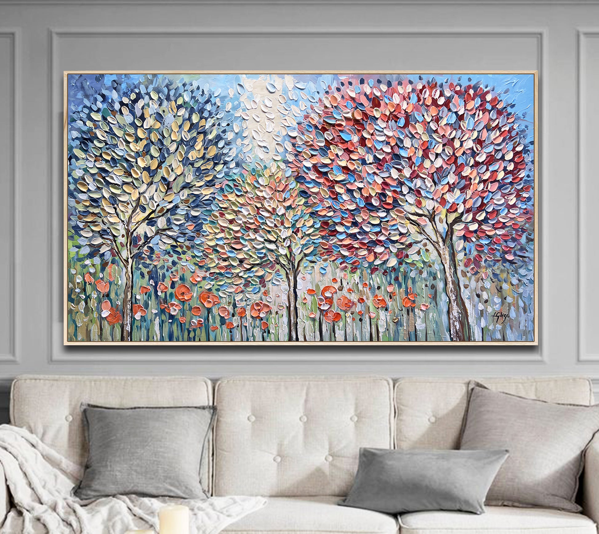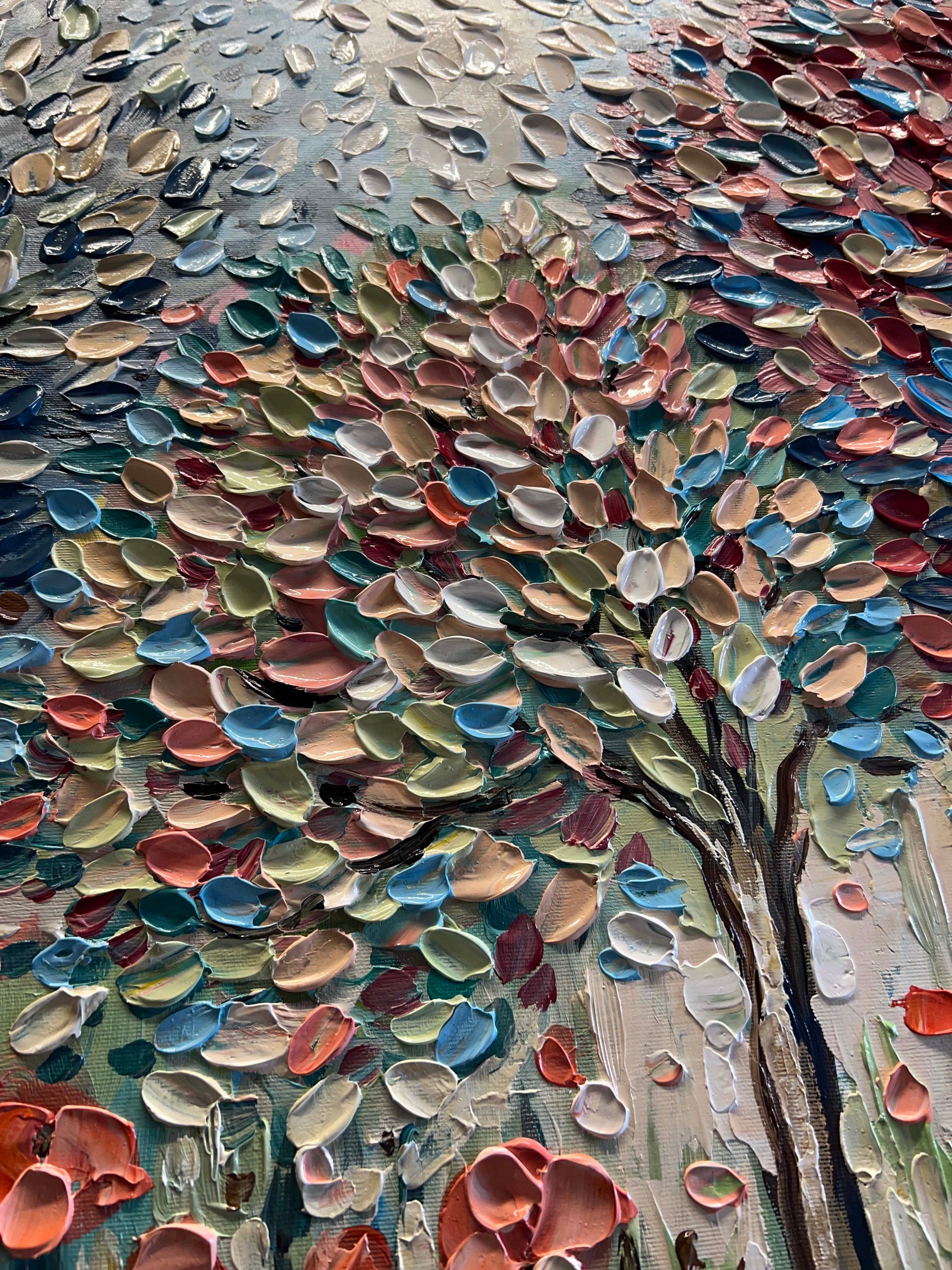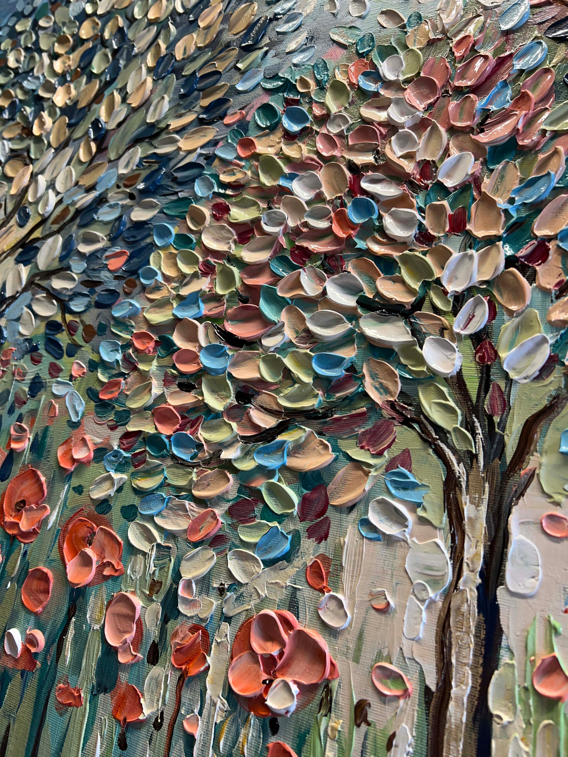 "Forest in Bloom" is a vibrant, textured landscape of three expressive trees, each bursting with colorful, impressionistic leaves.