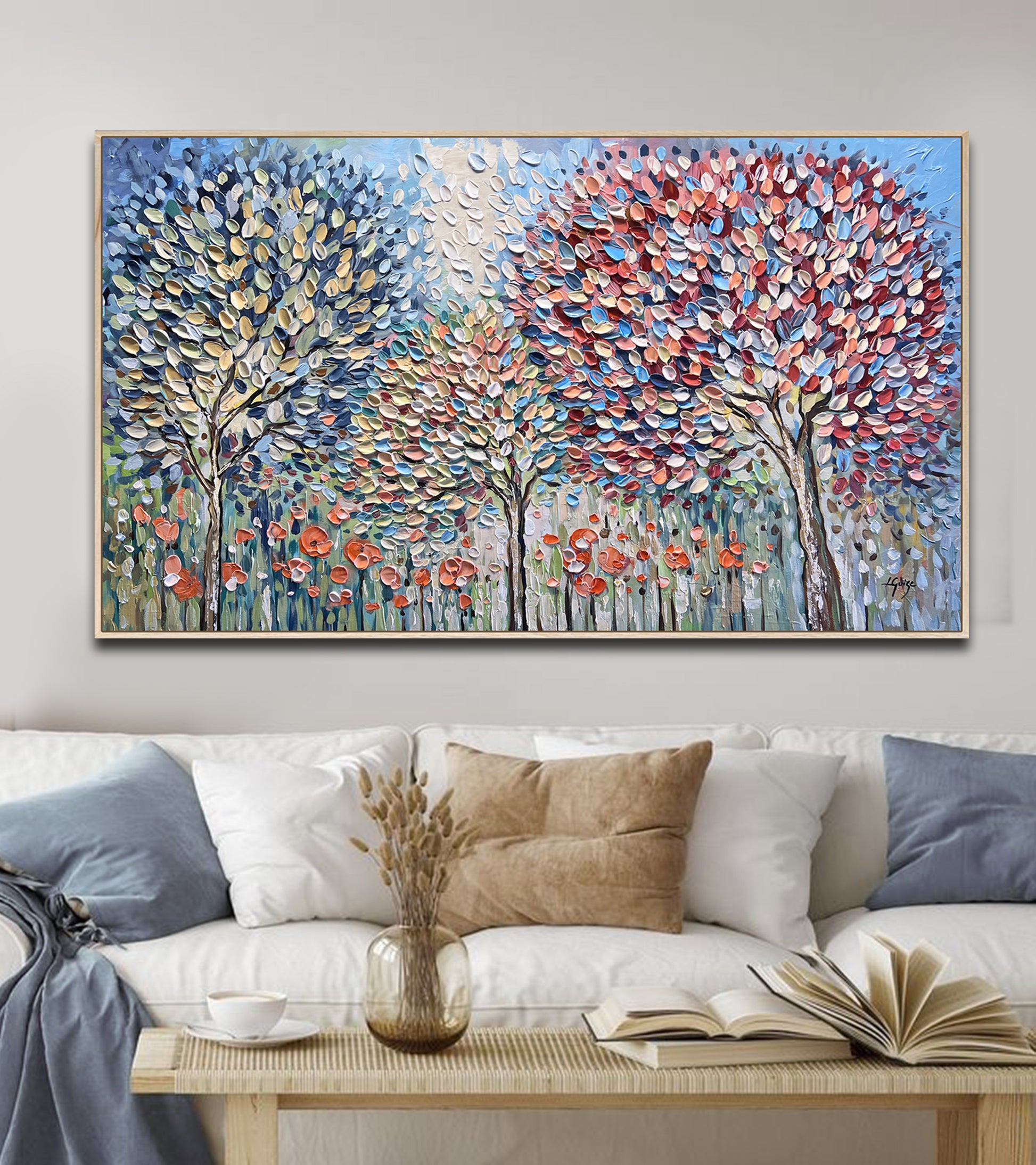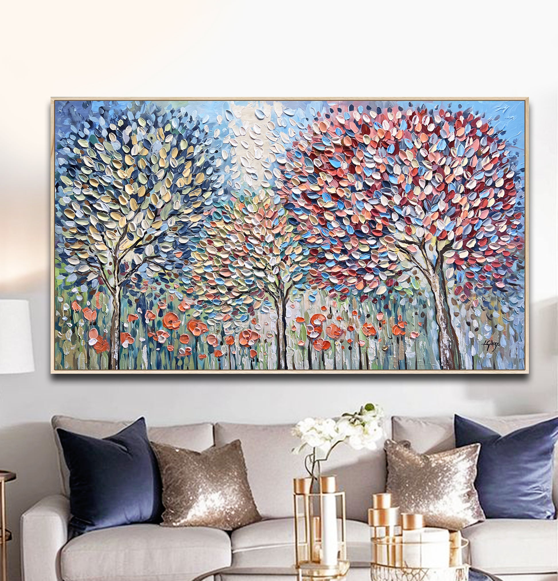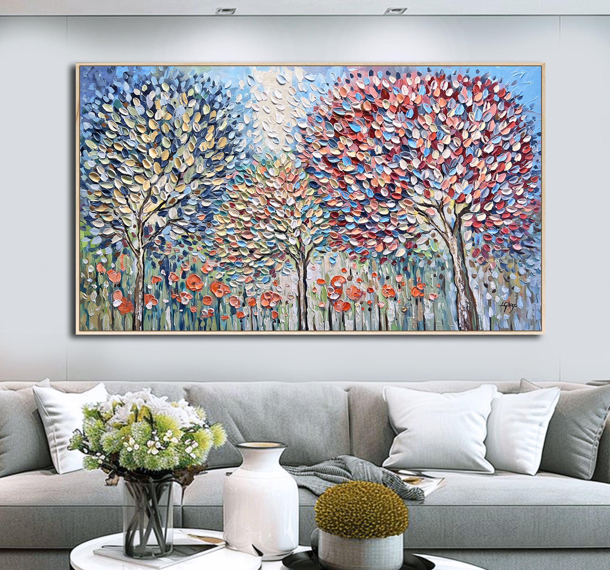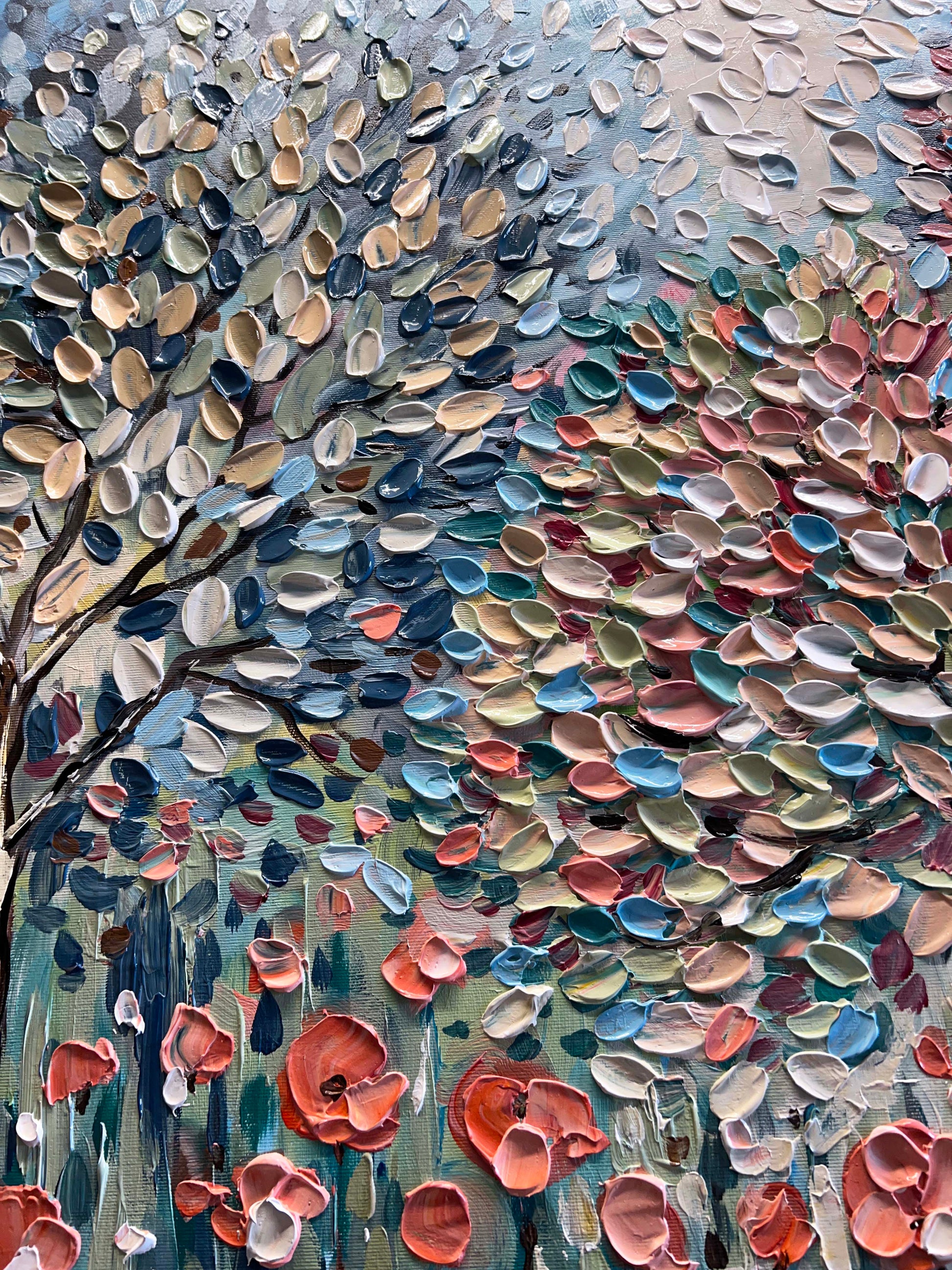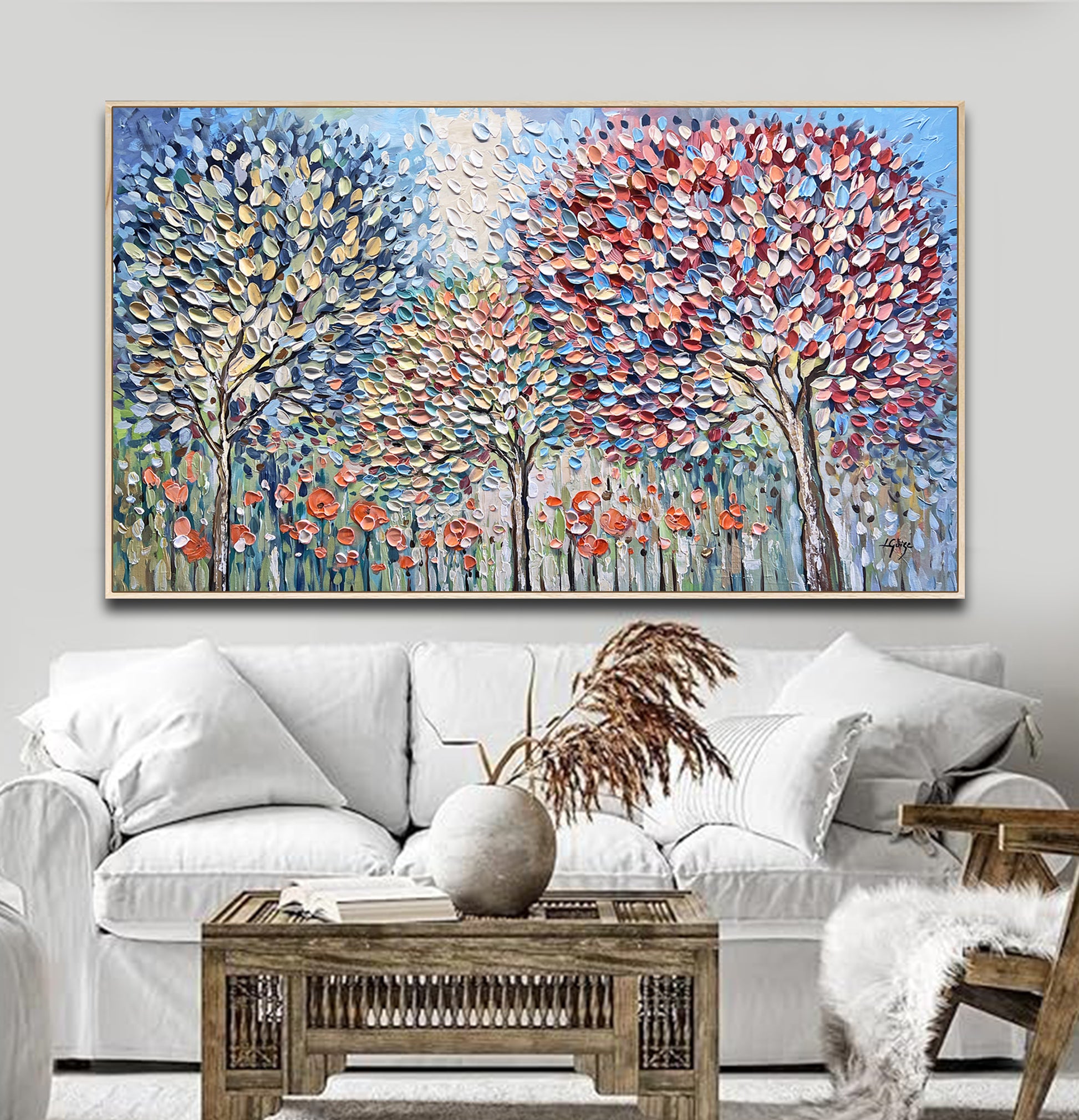"Forest in Bloom" is a vibrant, textured landscape of three expressive trees, each bursting with colorful, impressionistic leaves.