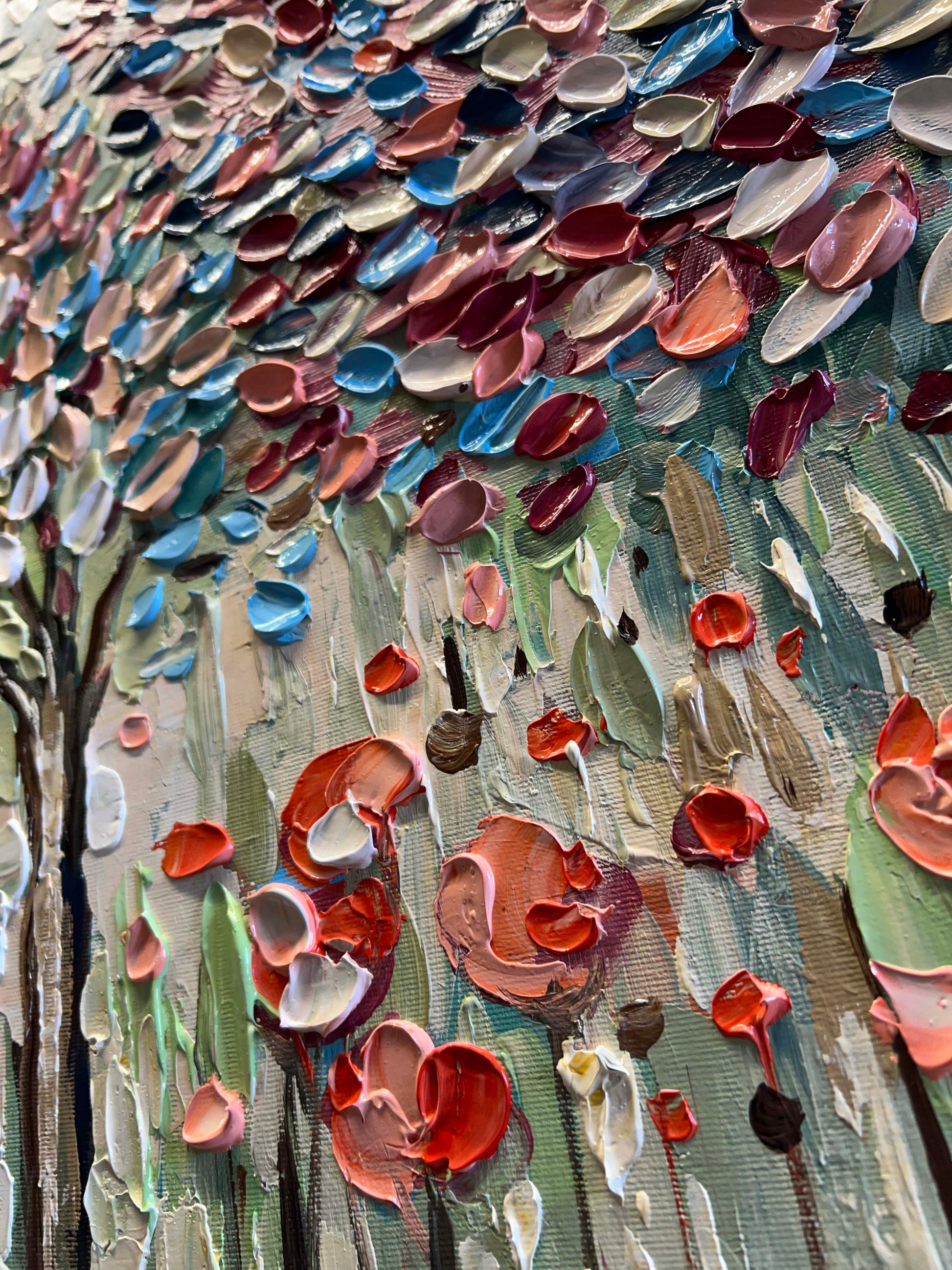 I painted this artwork using a palette knife technique to create bold, sculptural brushstrokes that give the canvas a lively, three-dimensional texture.
