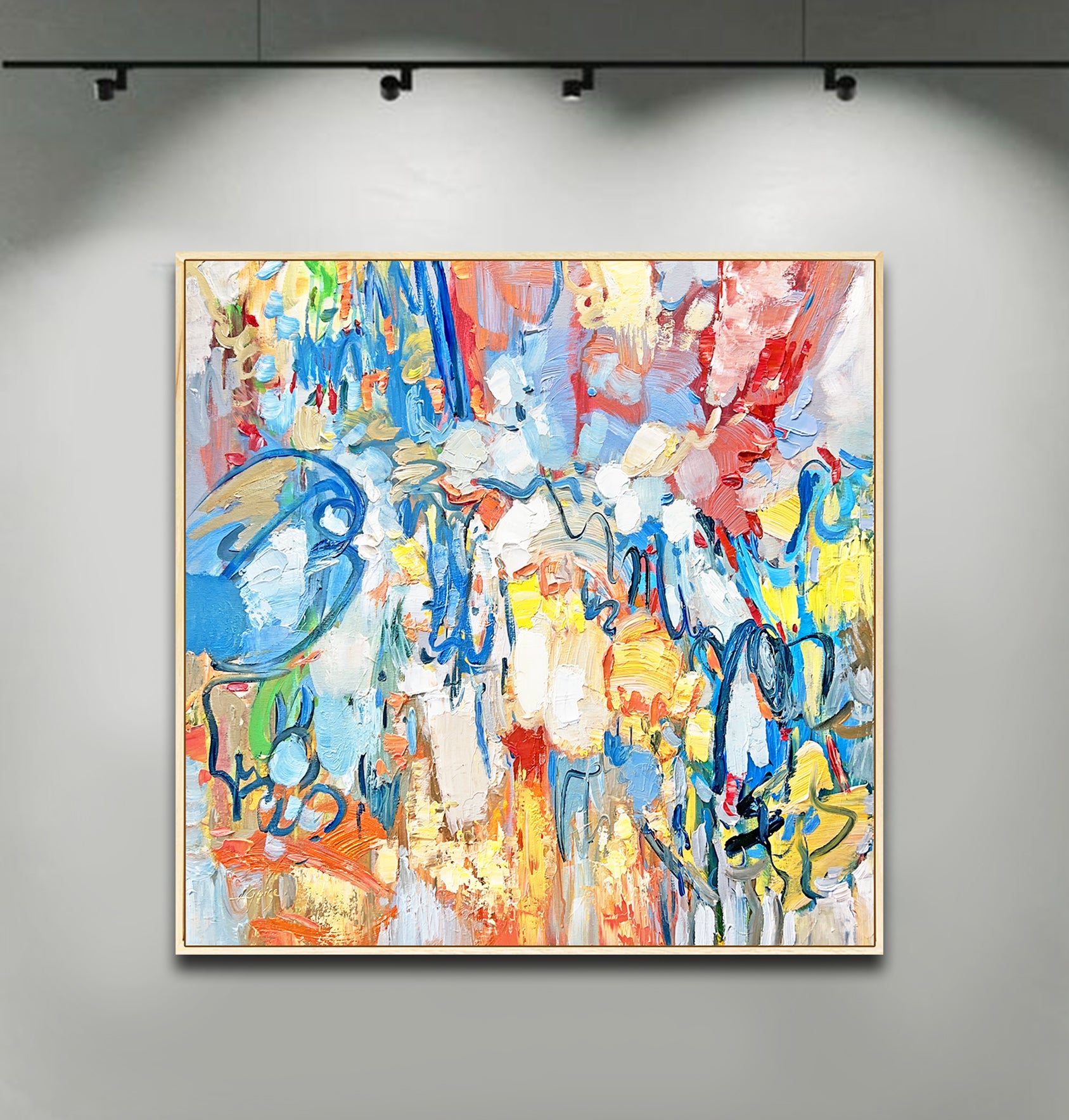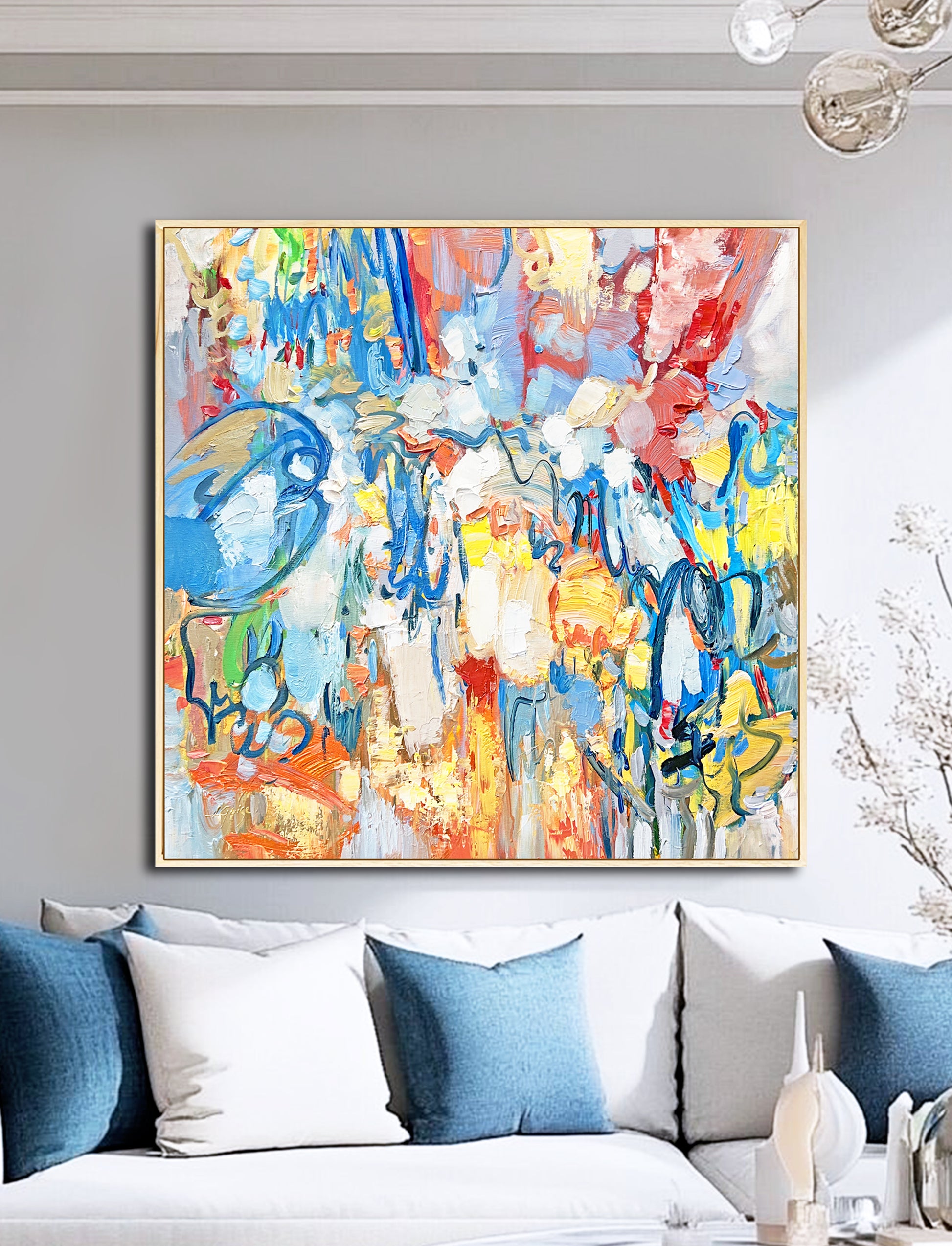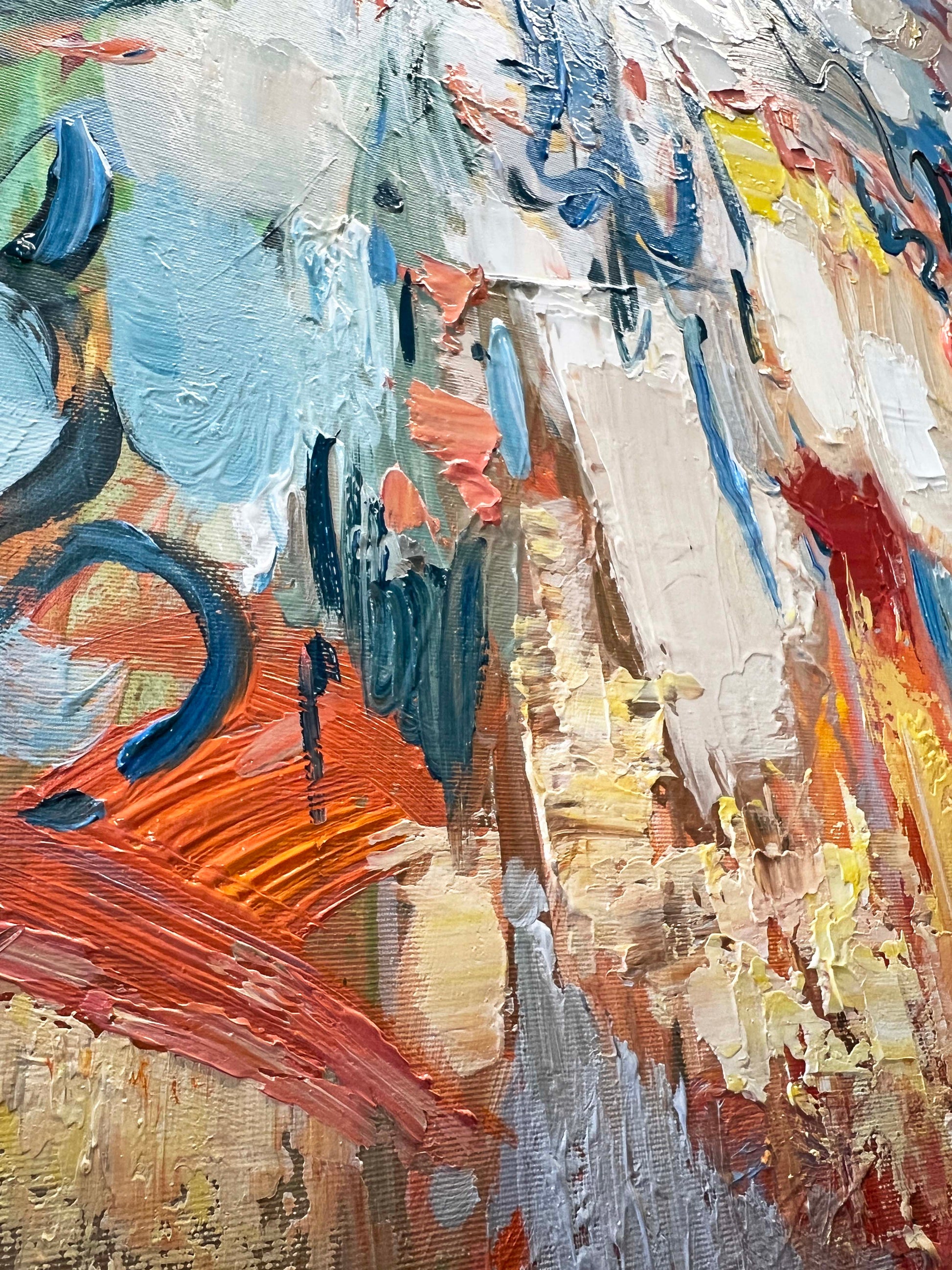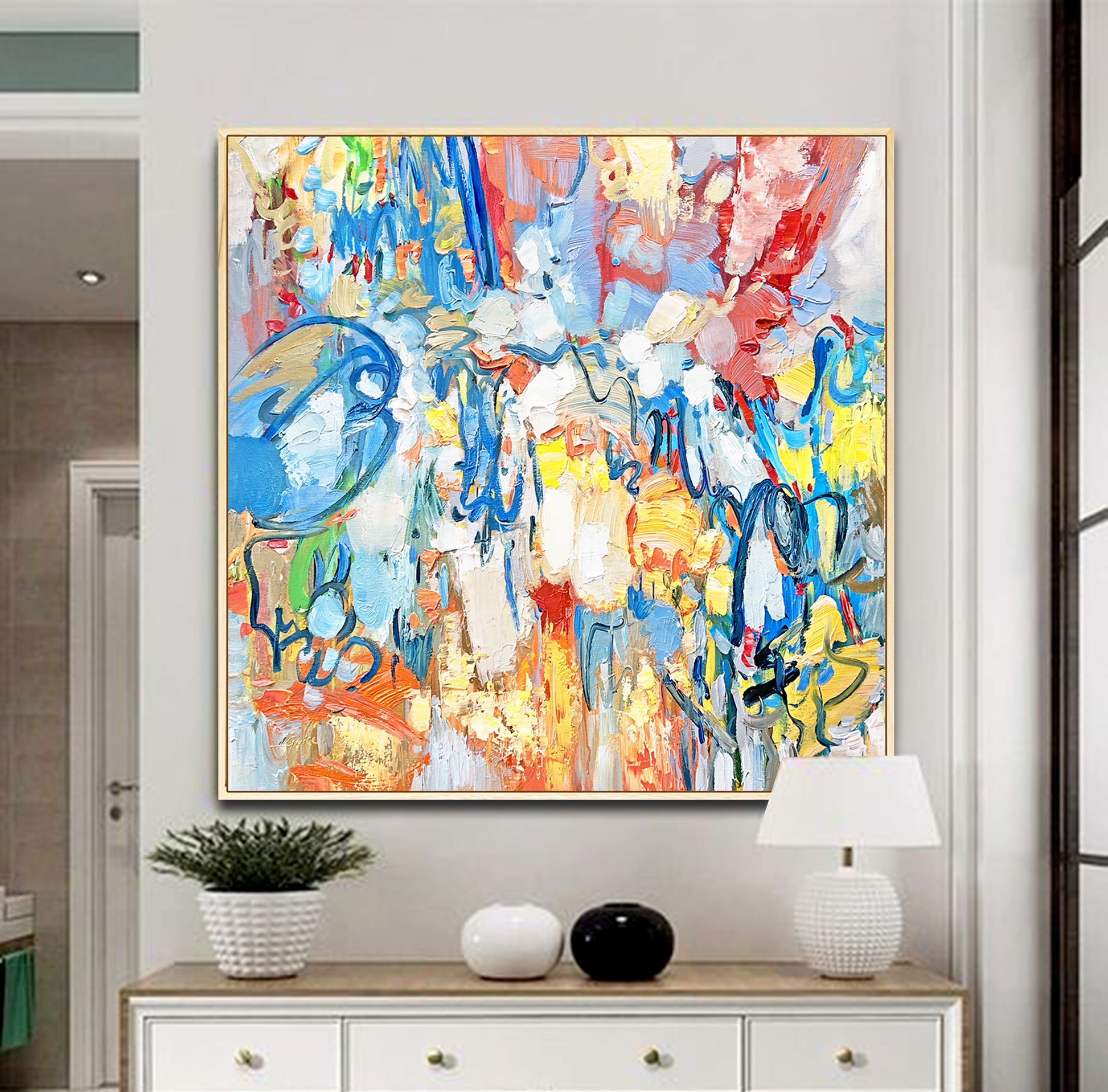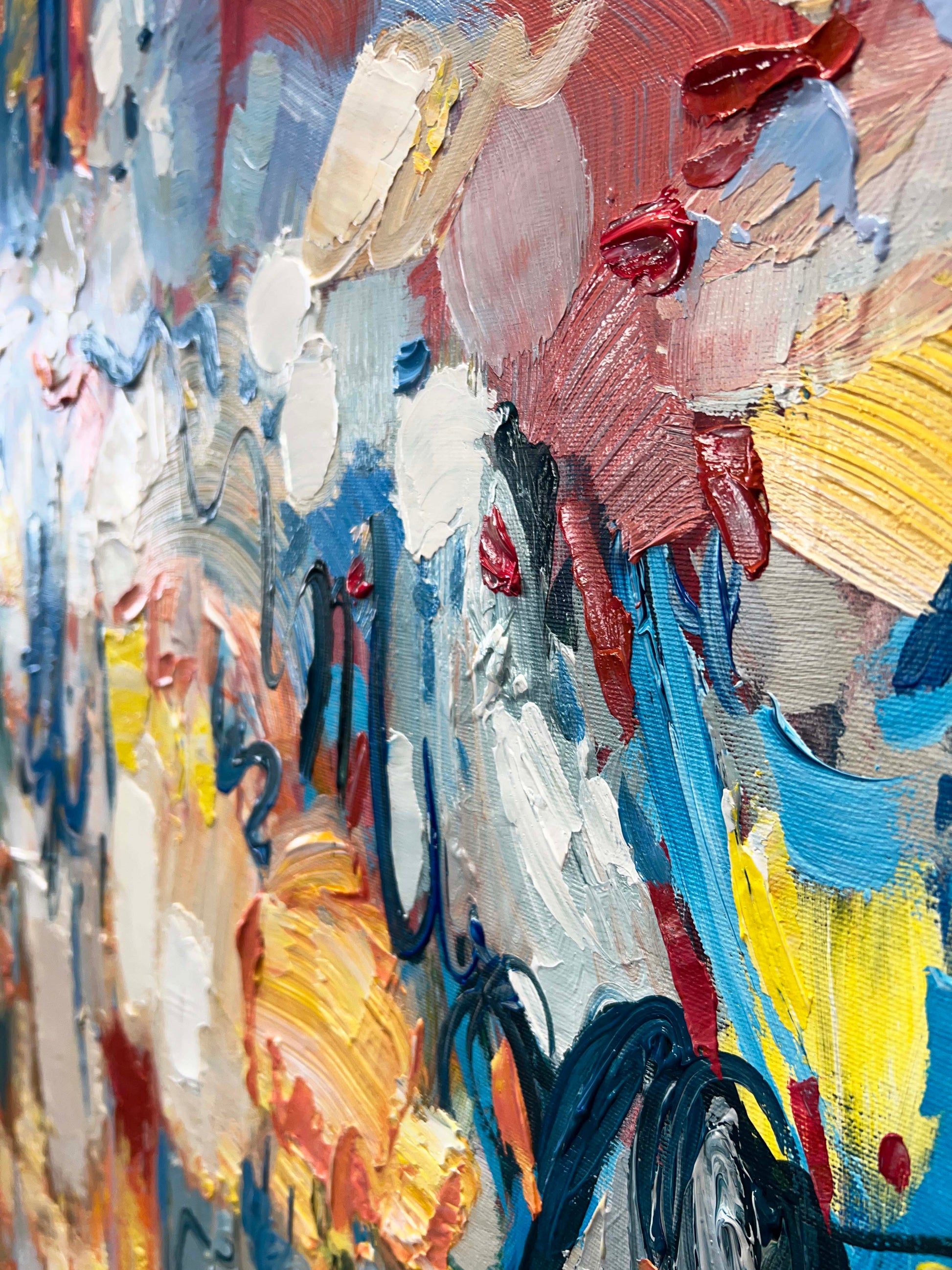 “Fresh Air” is a vibrant abstract painting that radiates energy and spontaneity through its fresh palette and dynamic composition.