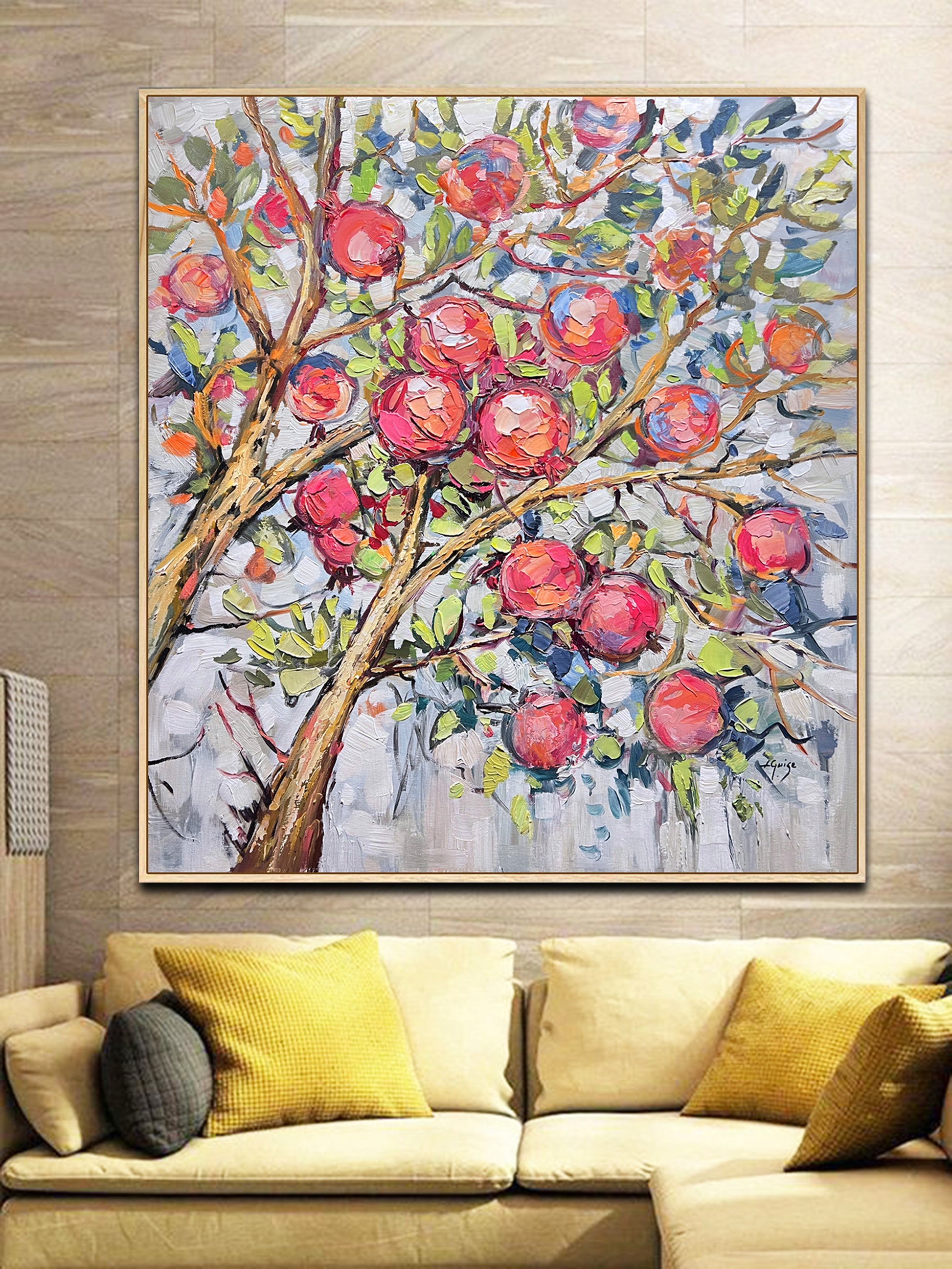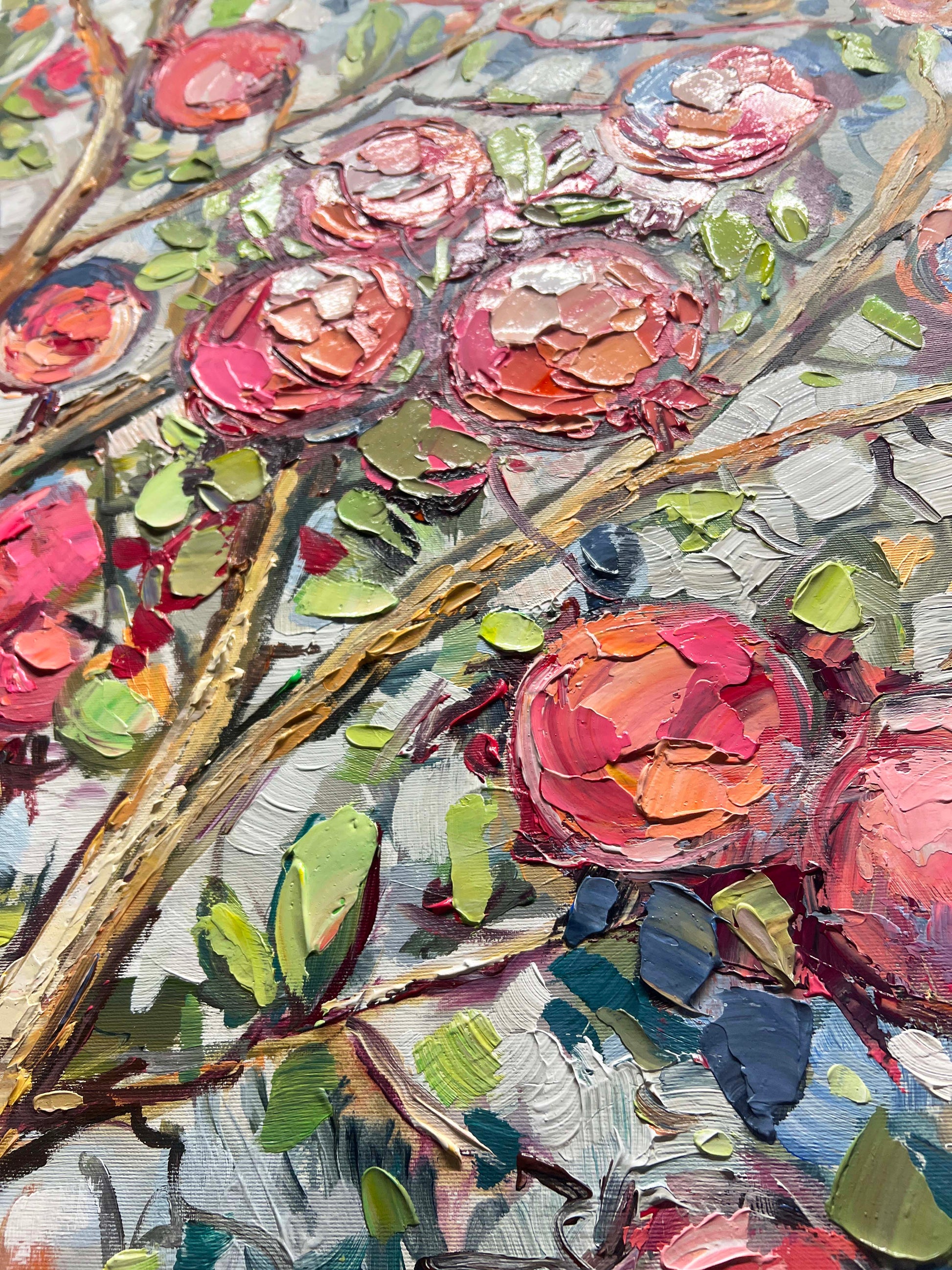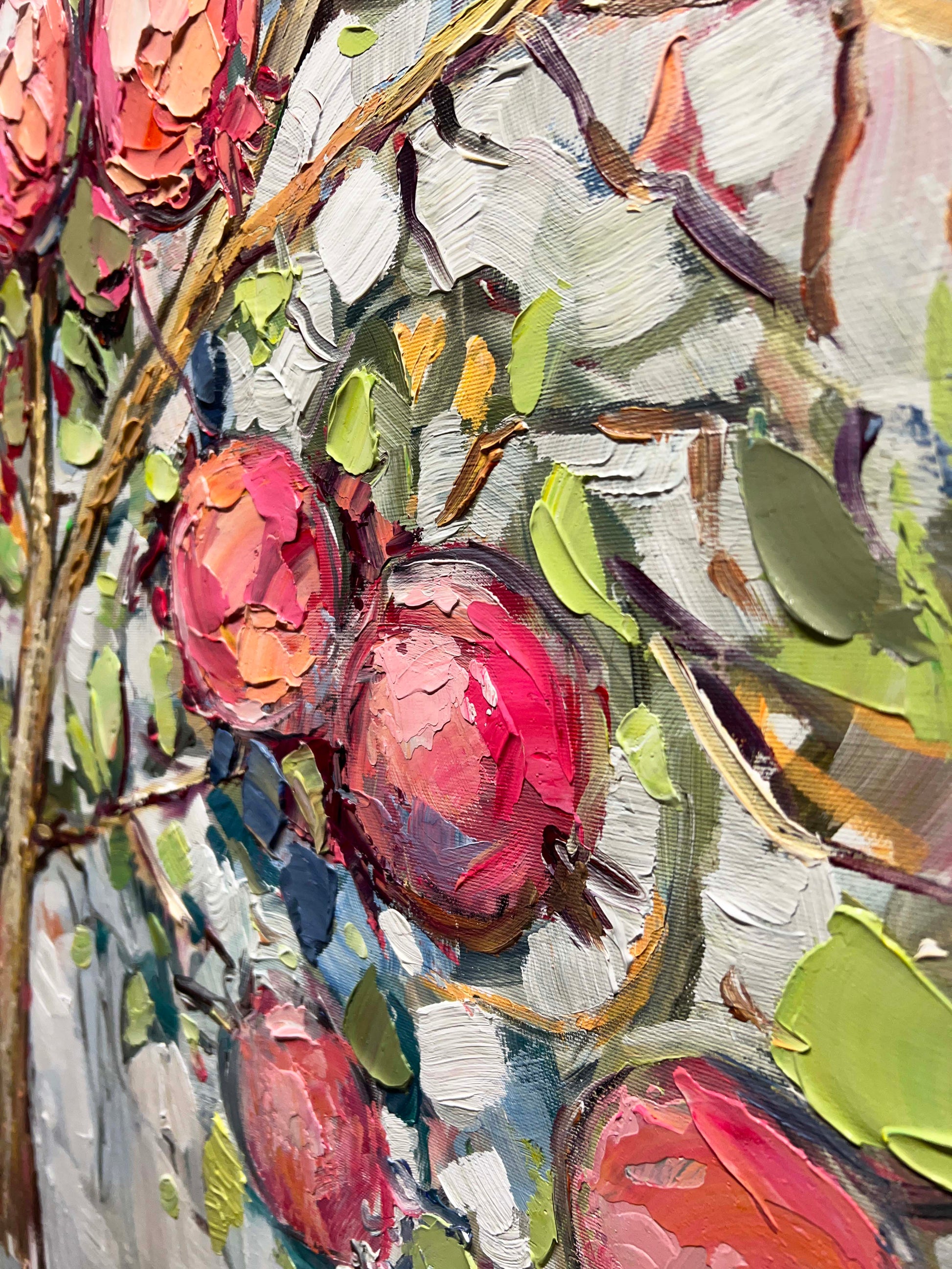 The painting "Garden Abundance" is vibrant piece of pomegranates in shades of blush pink, red, and coral, set amidst lush green leaves and textured, golden-brown branches.