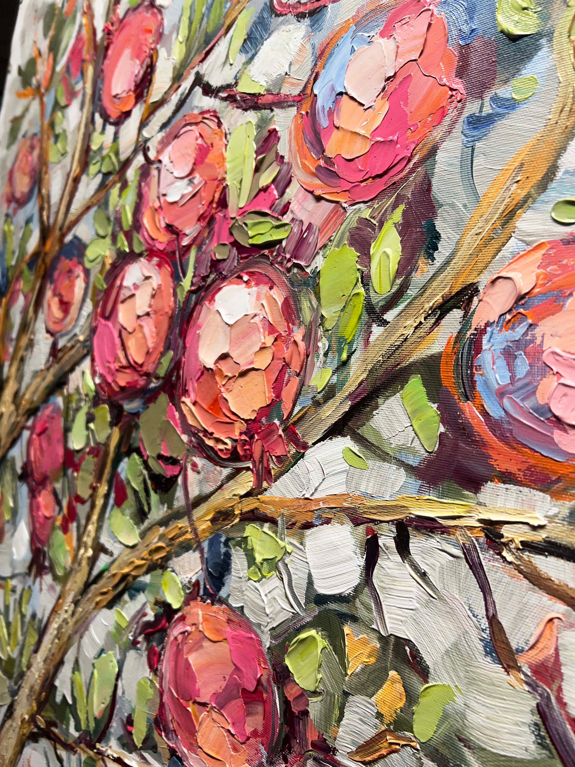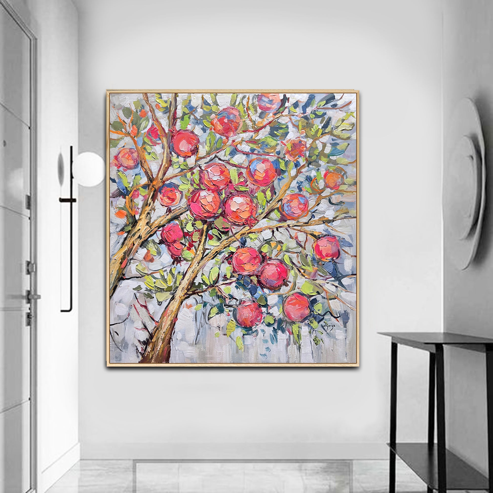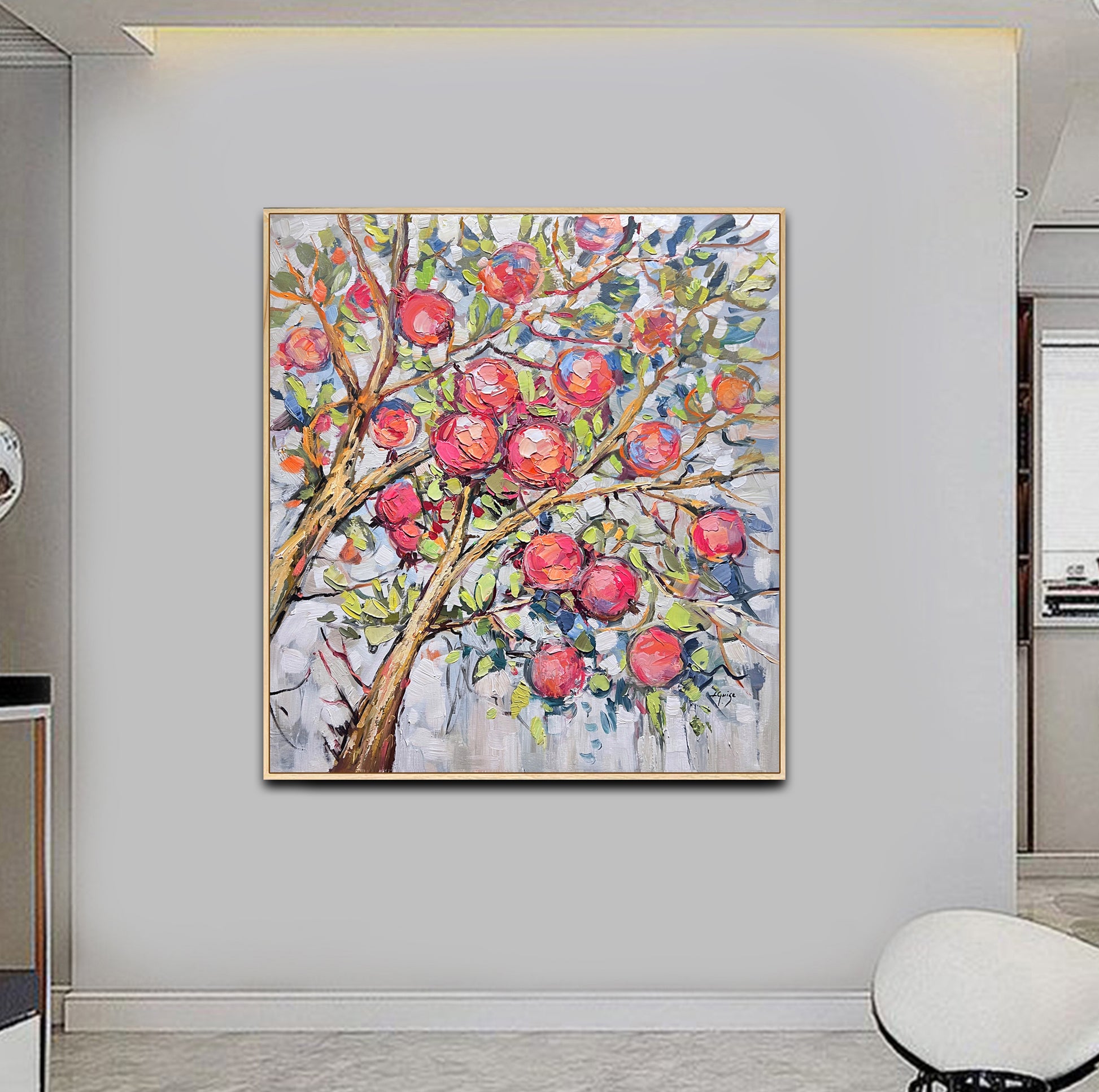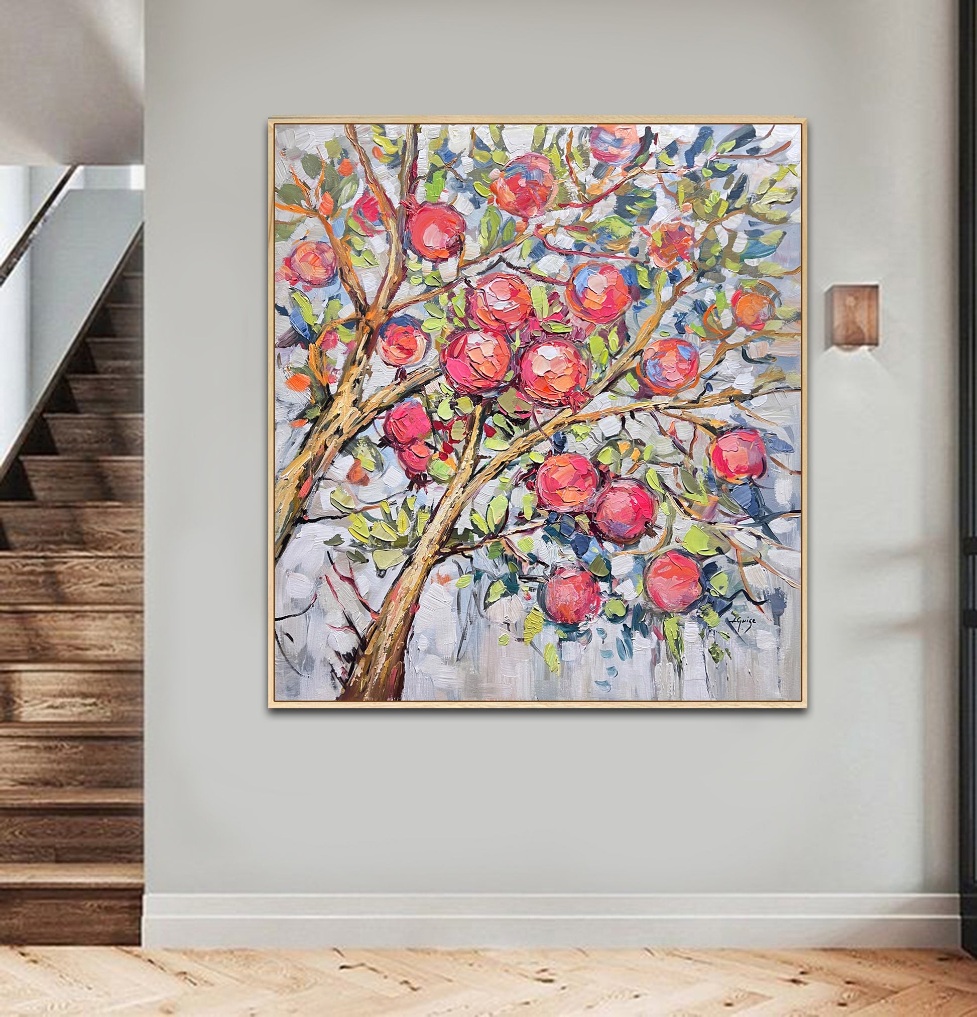 The painting "Garden Abundance" is vibrant piece of pomegranates in shades of blush pink, red, and coral, set amidst lush green leaves and textured, golden-brown branches.