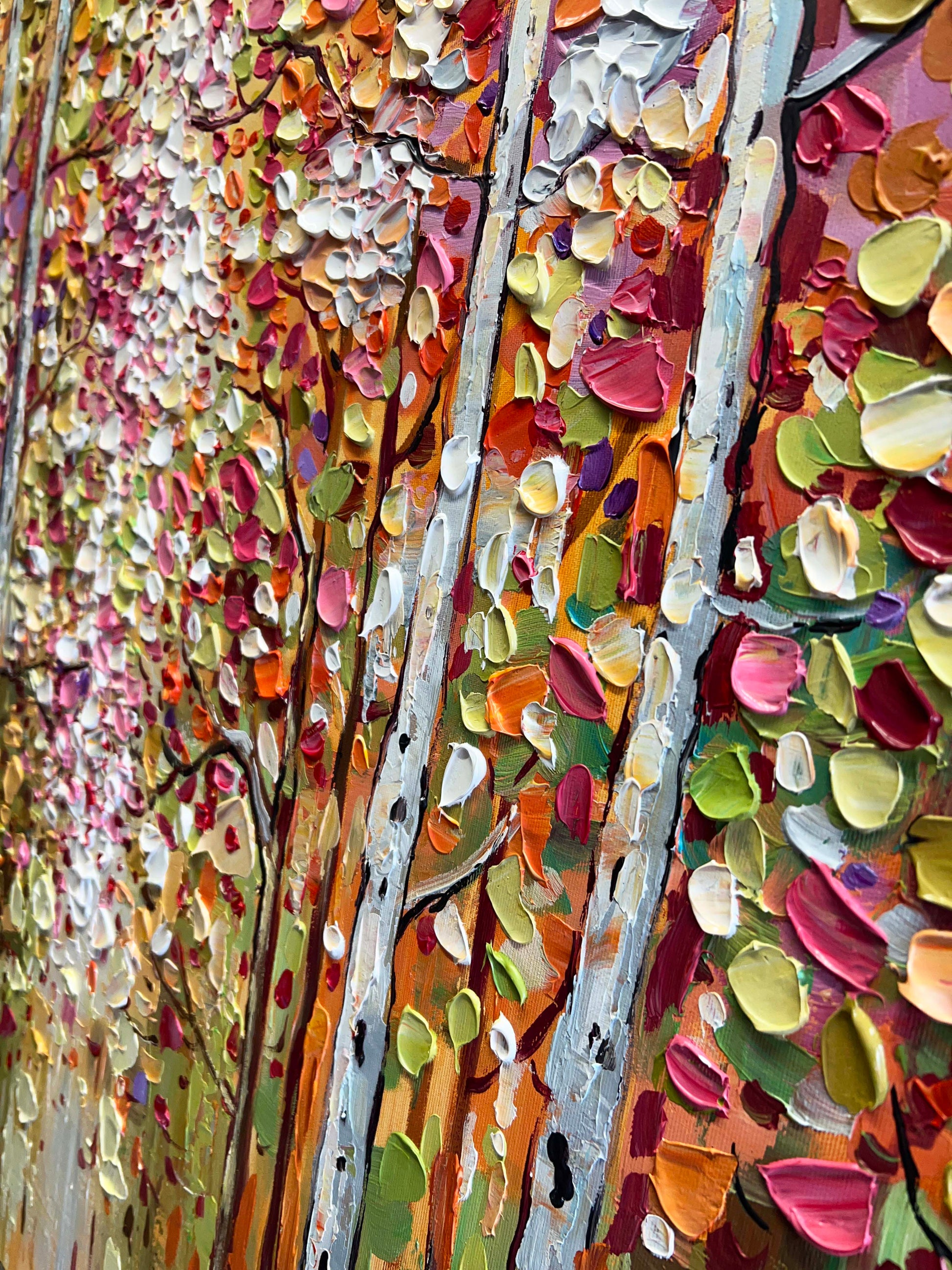 Using a vibrant palette of warm oranges, soft pinks, fresh greens, and luminous whites, I created a dreamy, almost ethereal woodland scene.