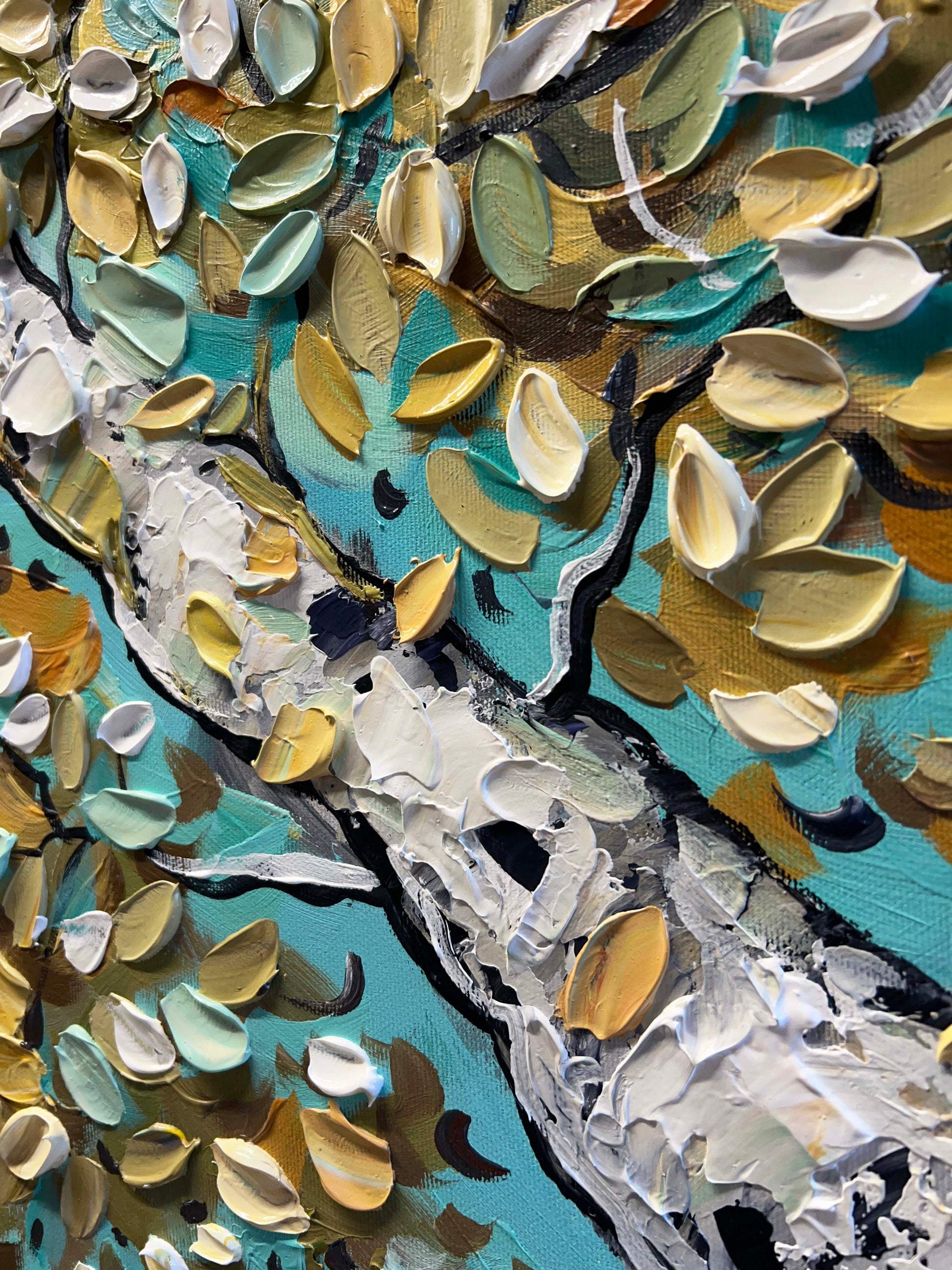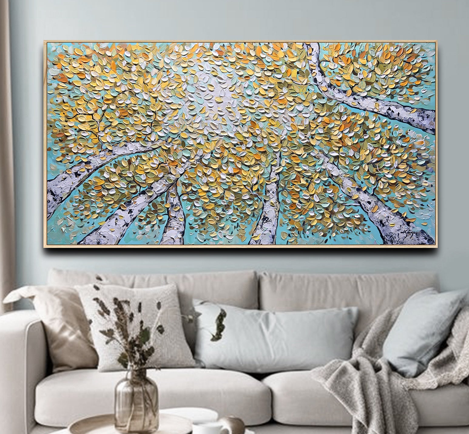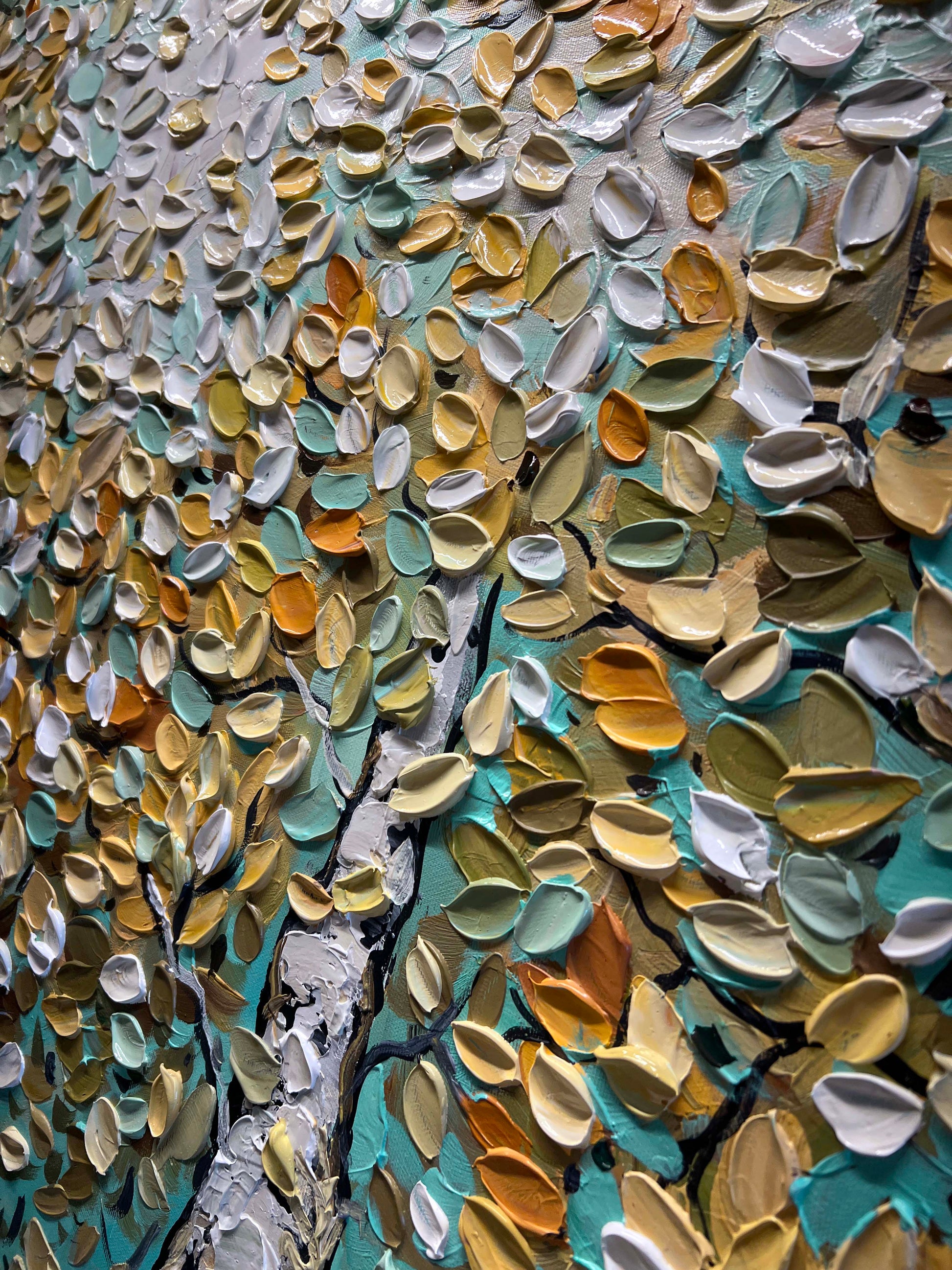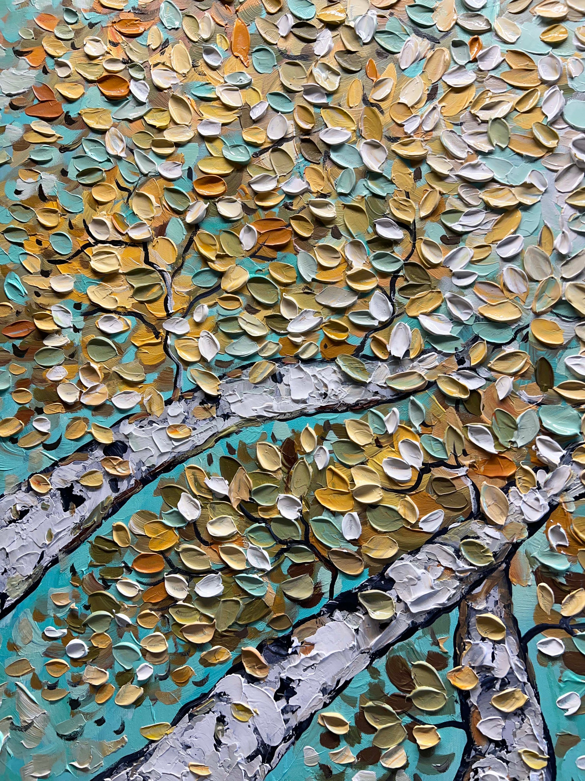 "Golden Breeze" captures the serene poetry of autumn as seen through a canopy of aspen trees. Vibrant strokes of gold, amber, and soft ivory shimmer against a tranquil teal sky, creating a luminous harmony of warmth and light.