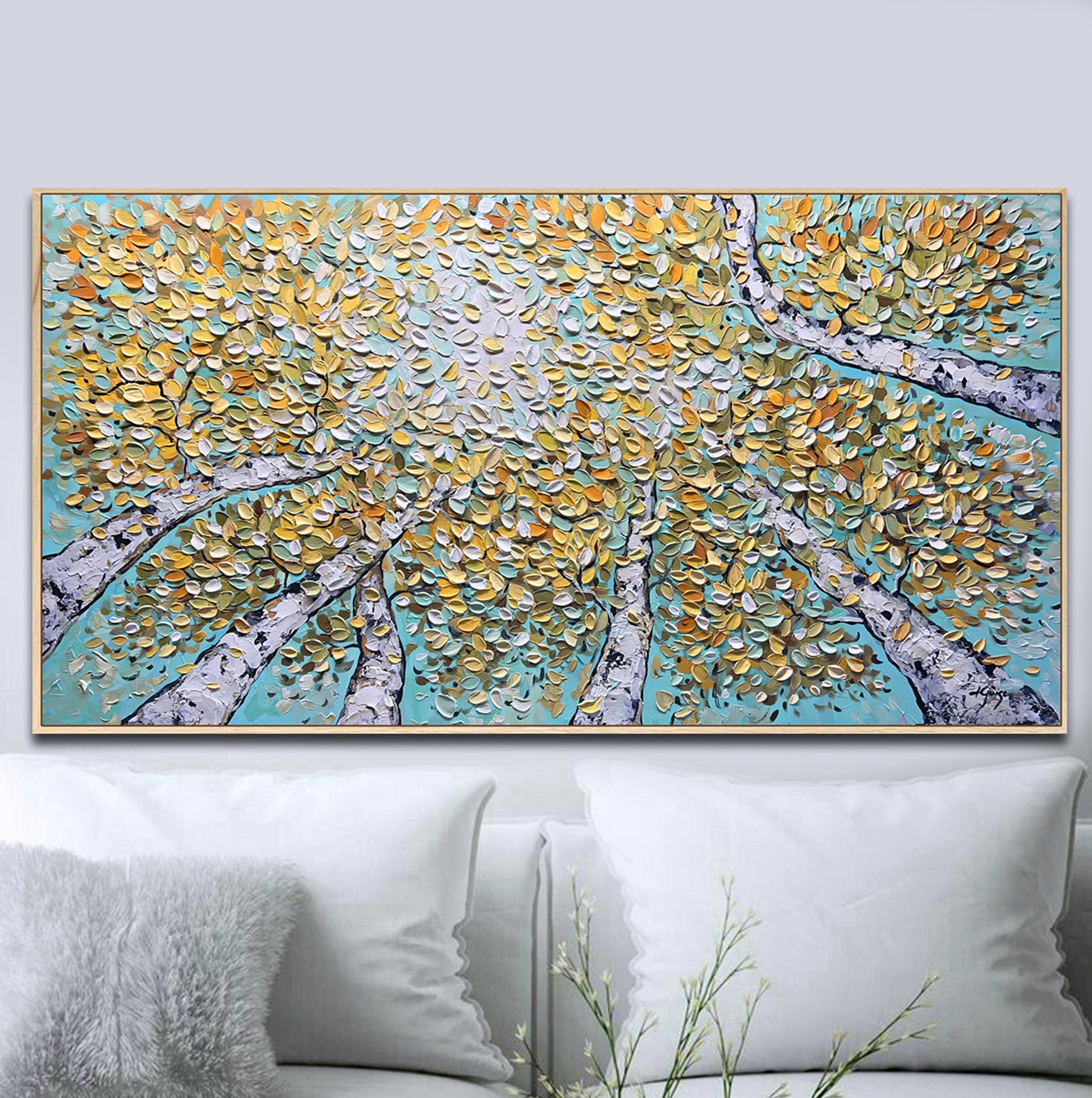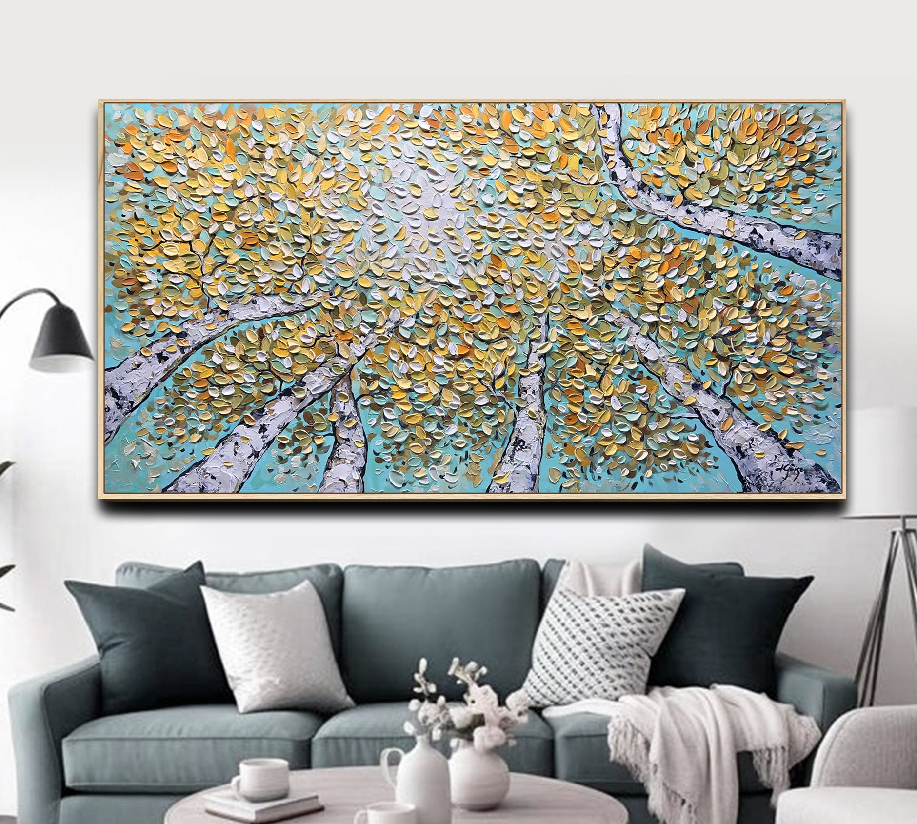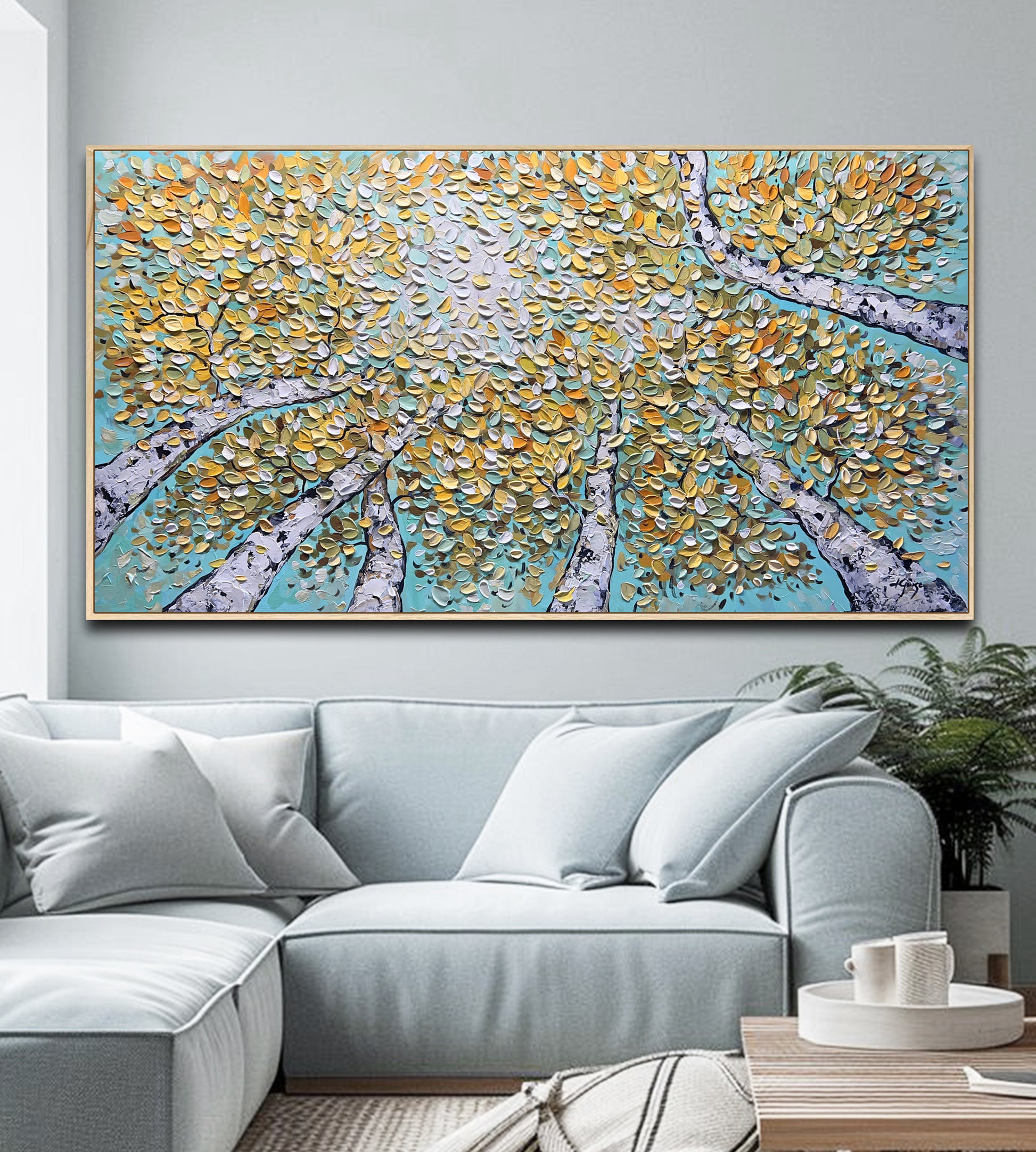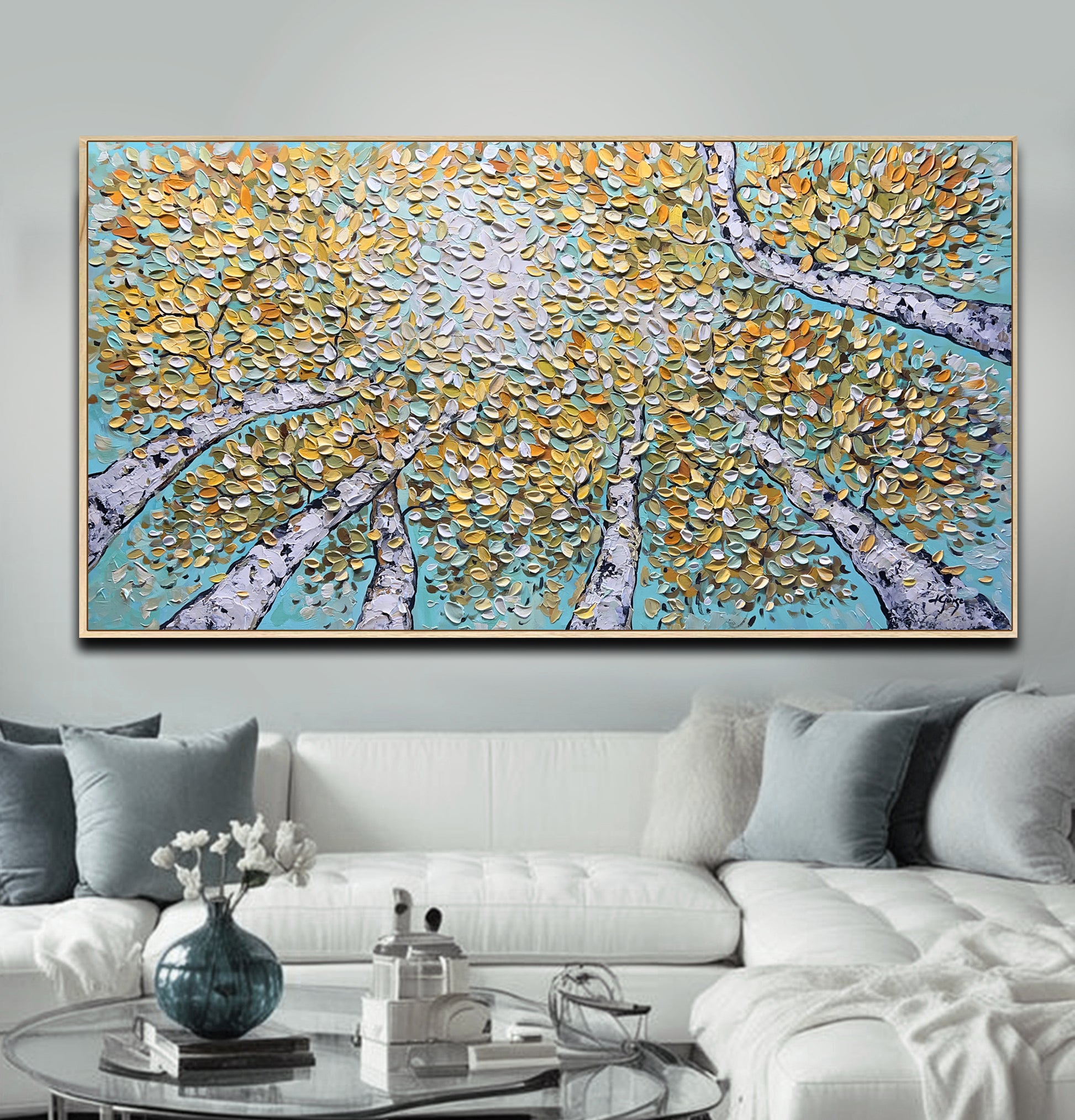 "Golden Breeze" captures the serene poetry of autumn as seen through a canopy of aspen trees. Vibrant strokes of gold, amber, and soft ivory shimmer against a tranquil teal sky, creating a luminous harmony of warmth and light.