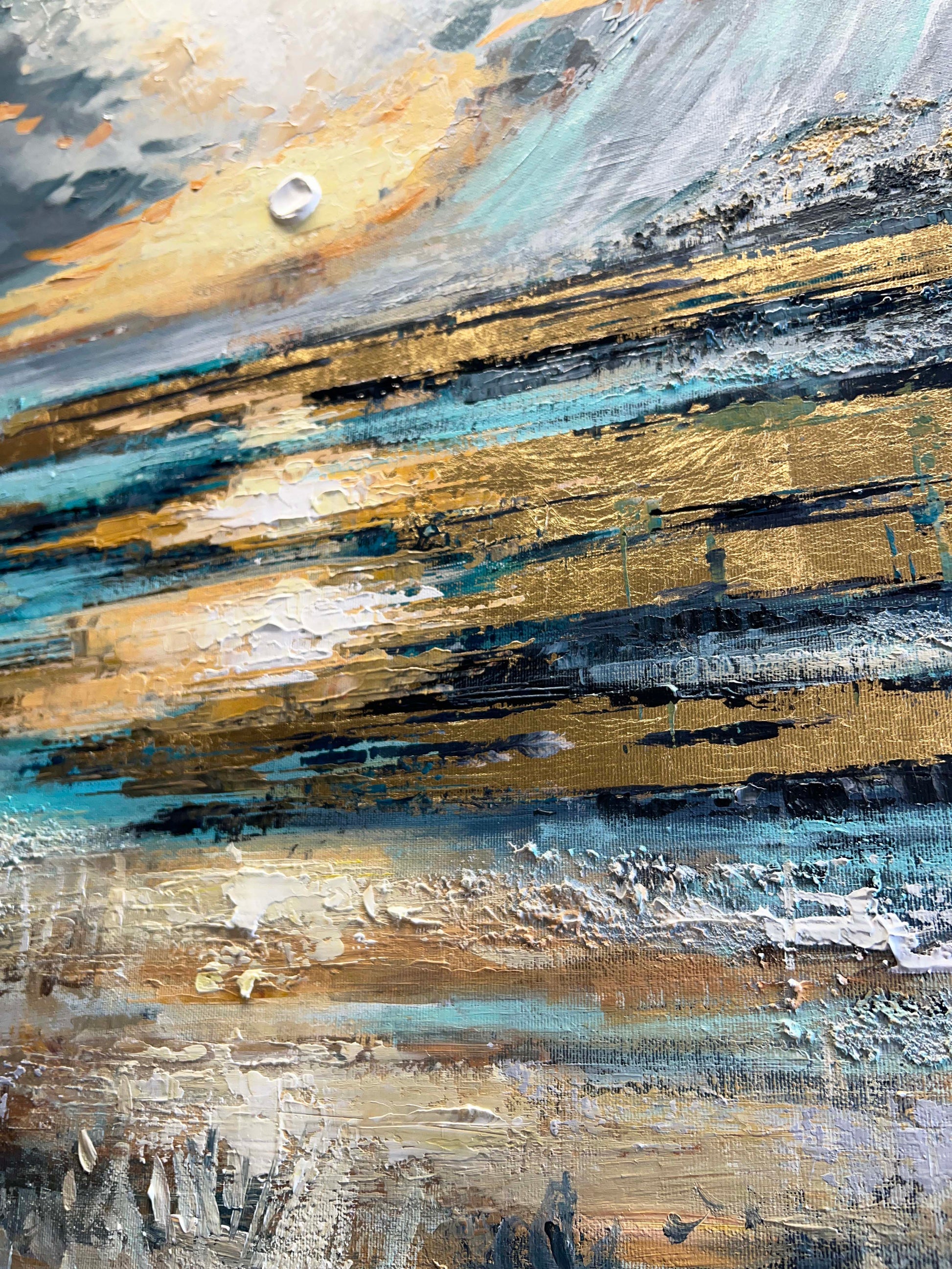 The gold leaf strokes magnetize your attention, shimmering with warmth and energy, while the deep blues draw you inward, revealing the quiet depth of the sea as it transitions from evening into night.