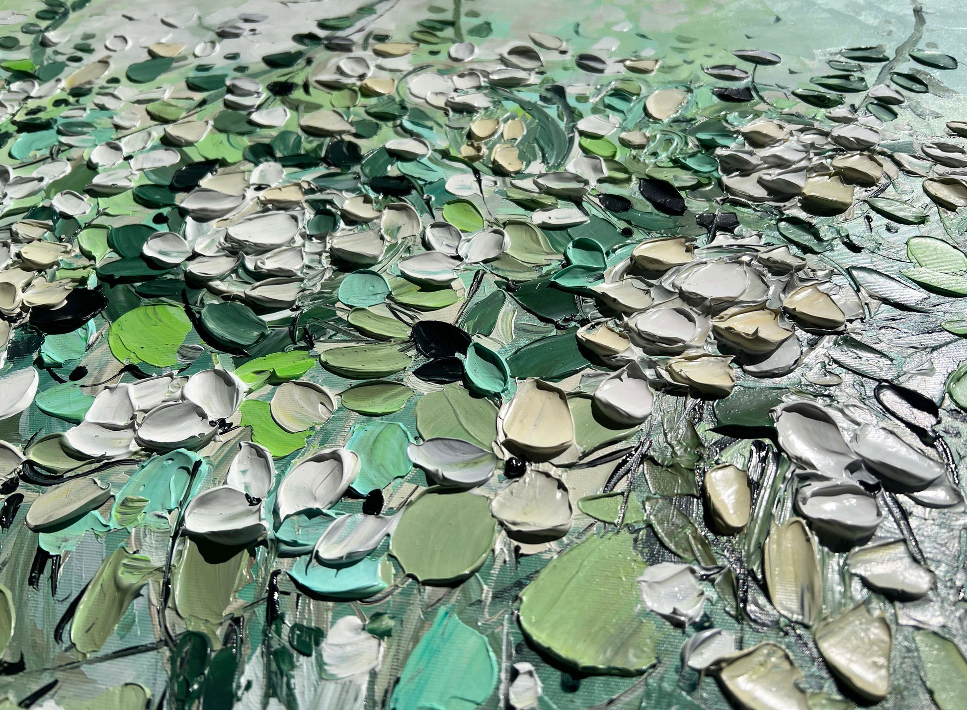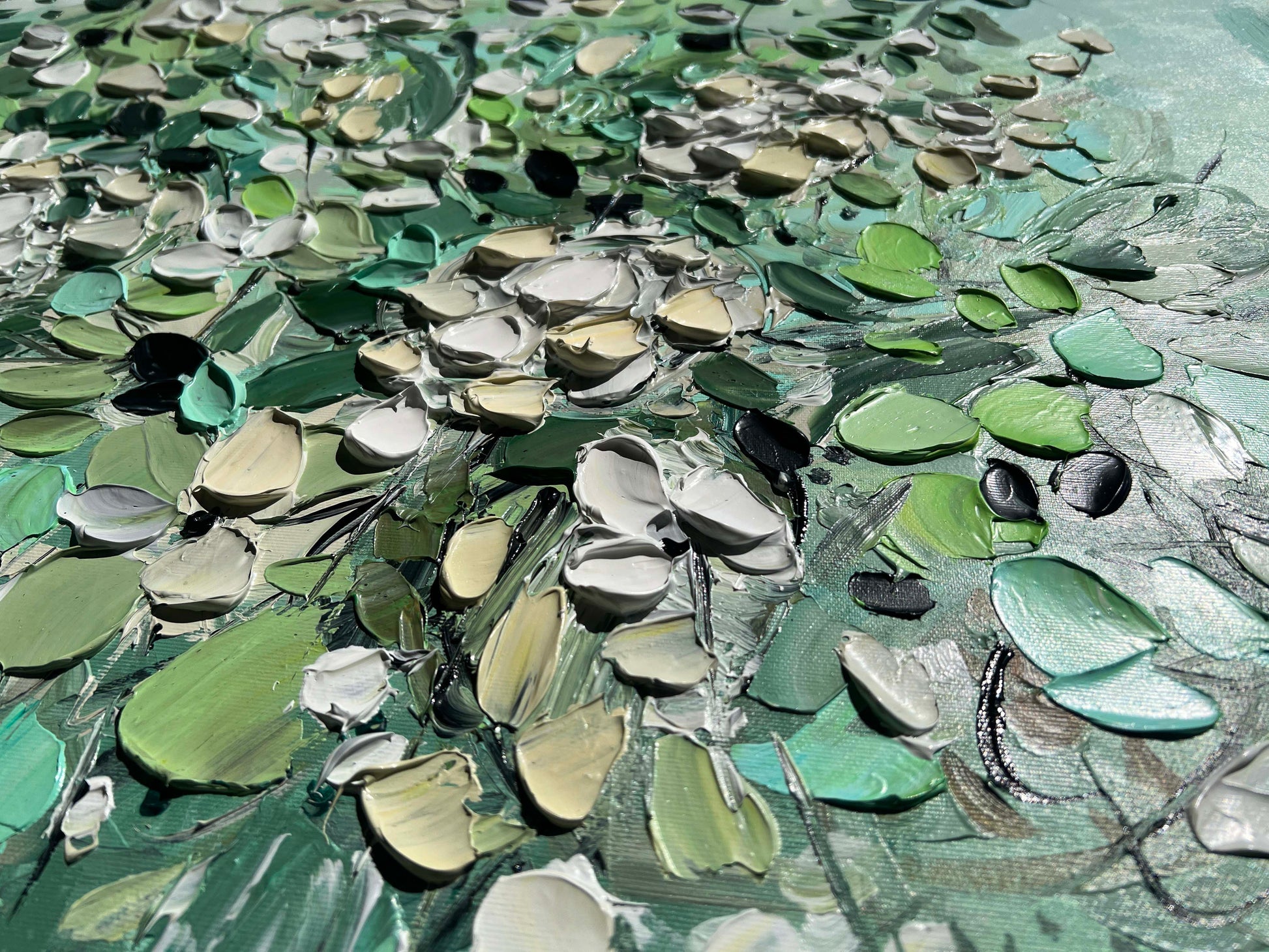 The textured brushstrokes add depth and movement, creating an impressionistic feel that captures the liveliness of nature. Shades of emerald, jade, and soft pastel greens blend harmoniously with creamy whites, evoking the essence of a flourishing garden in spring.