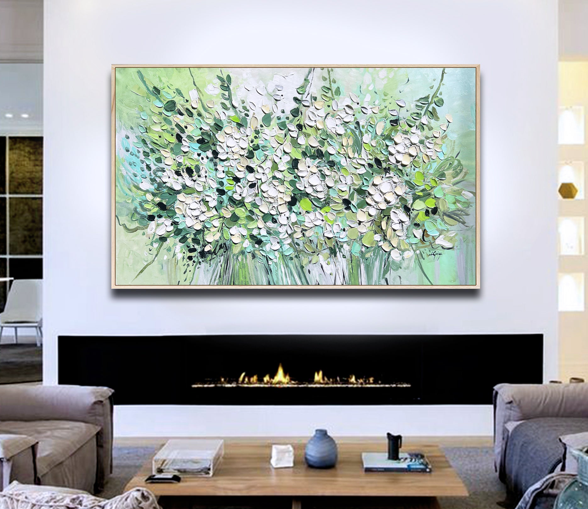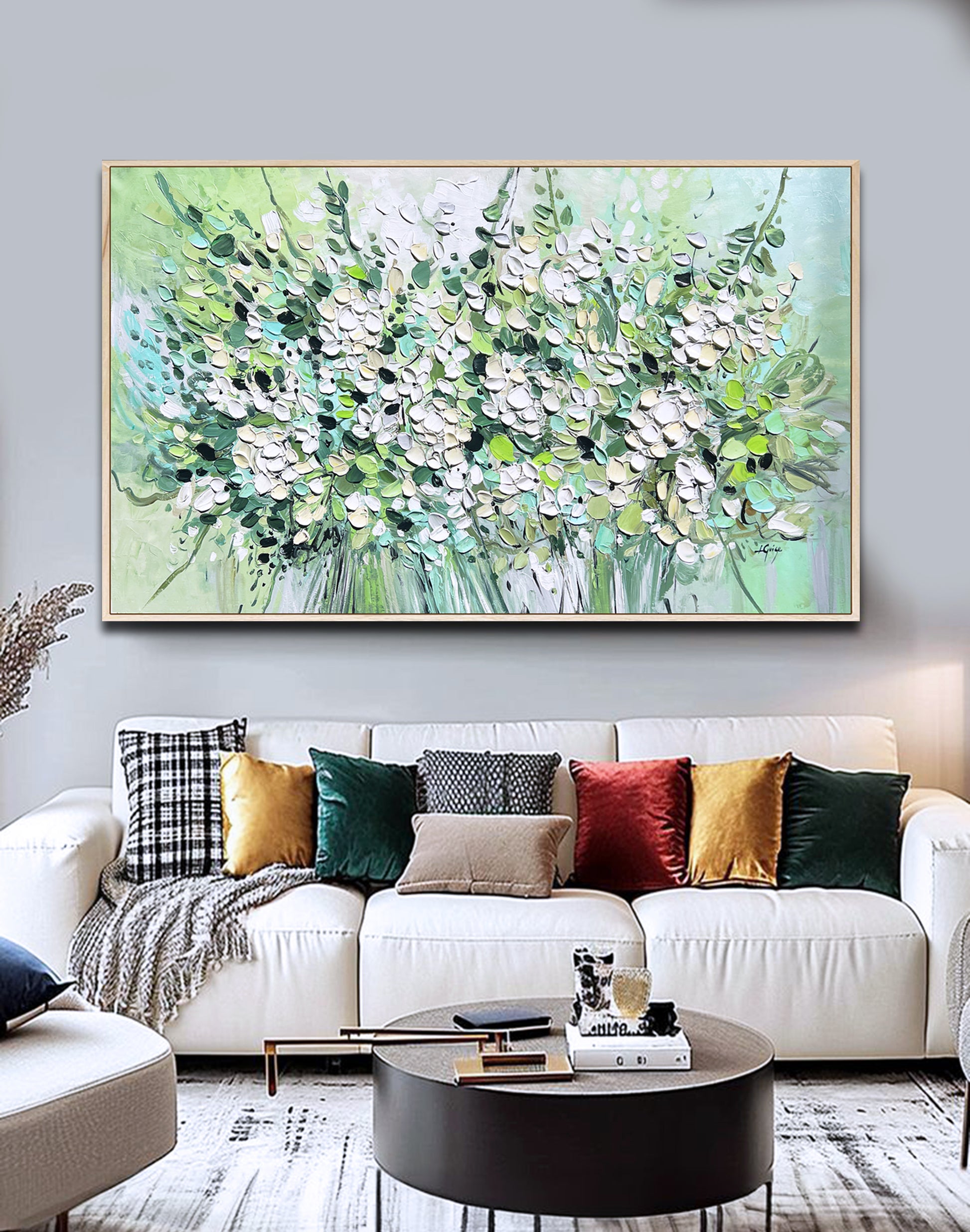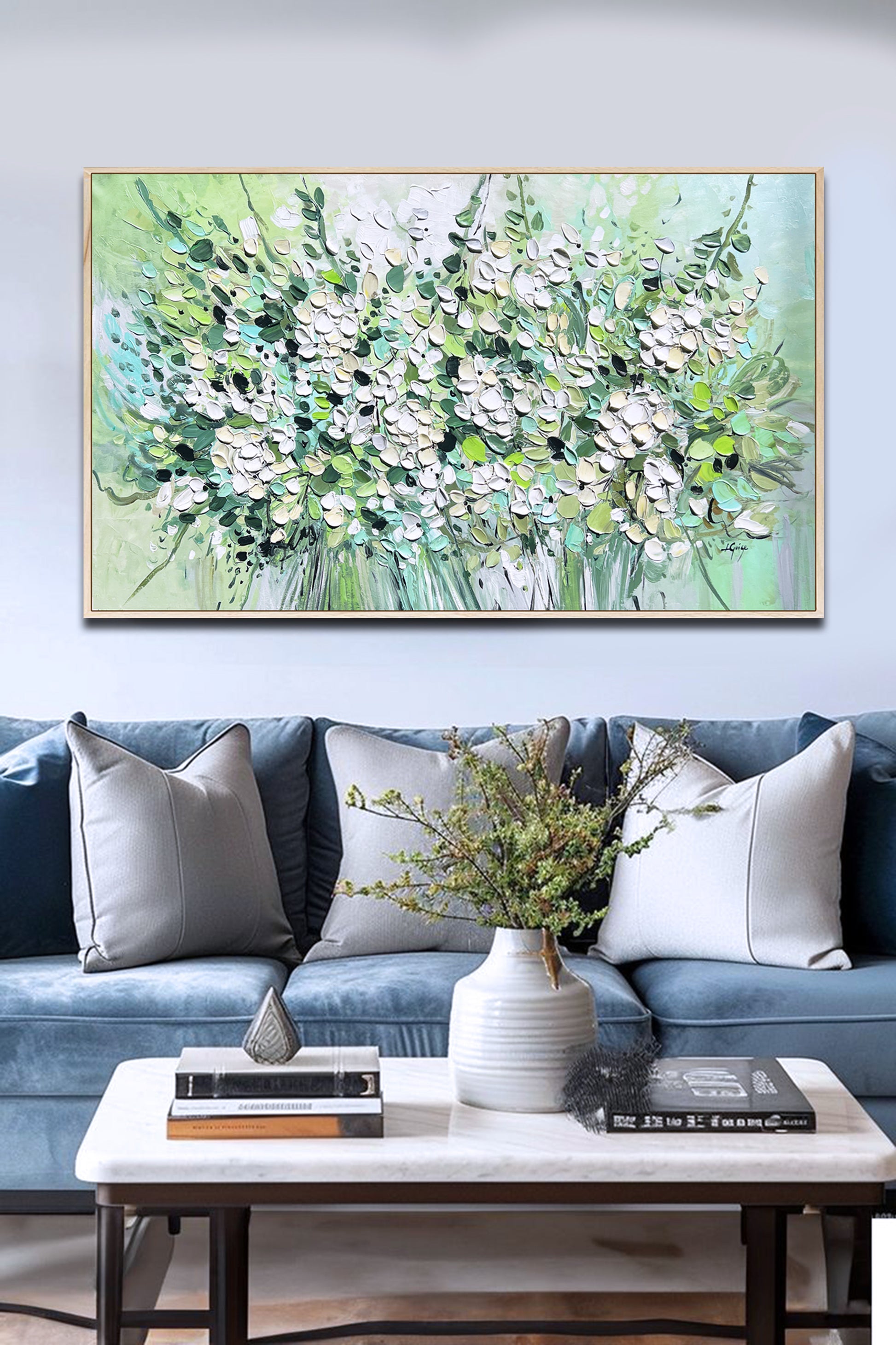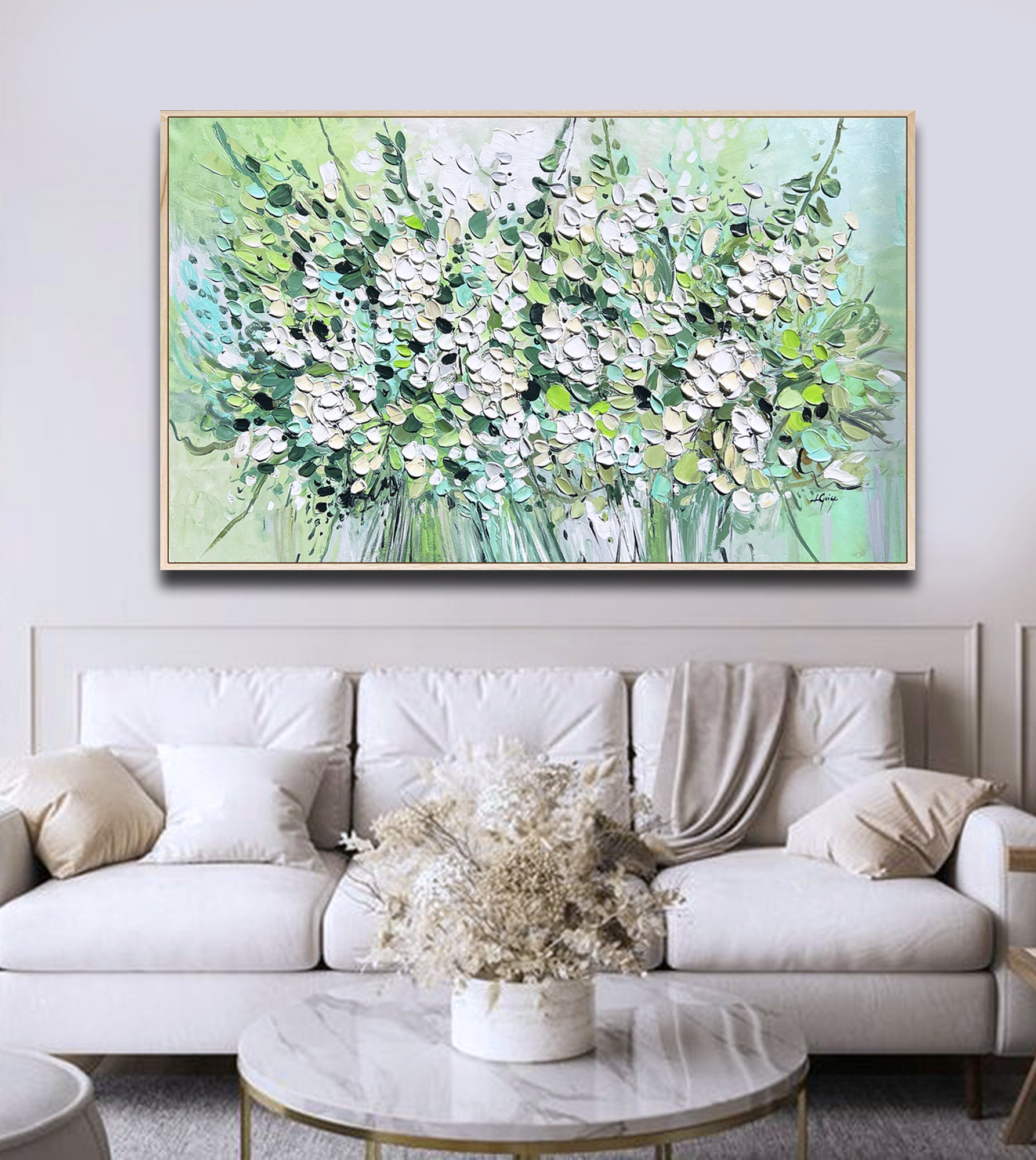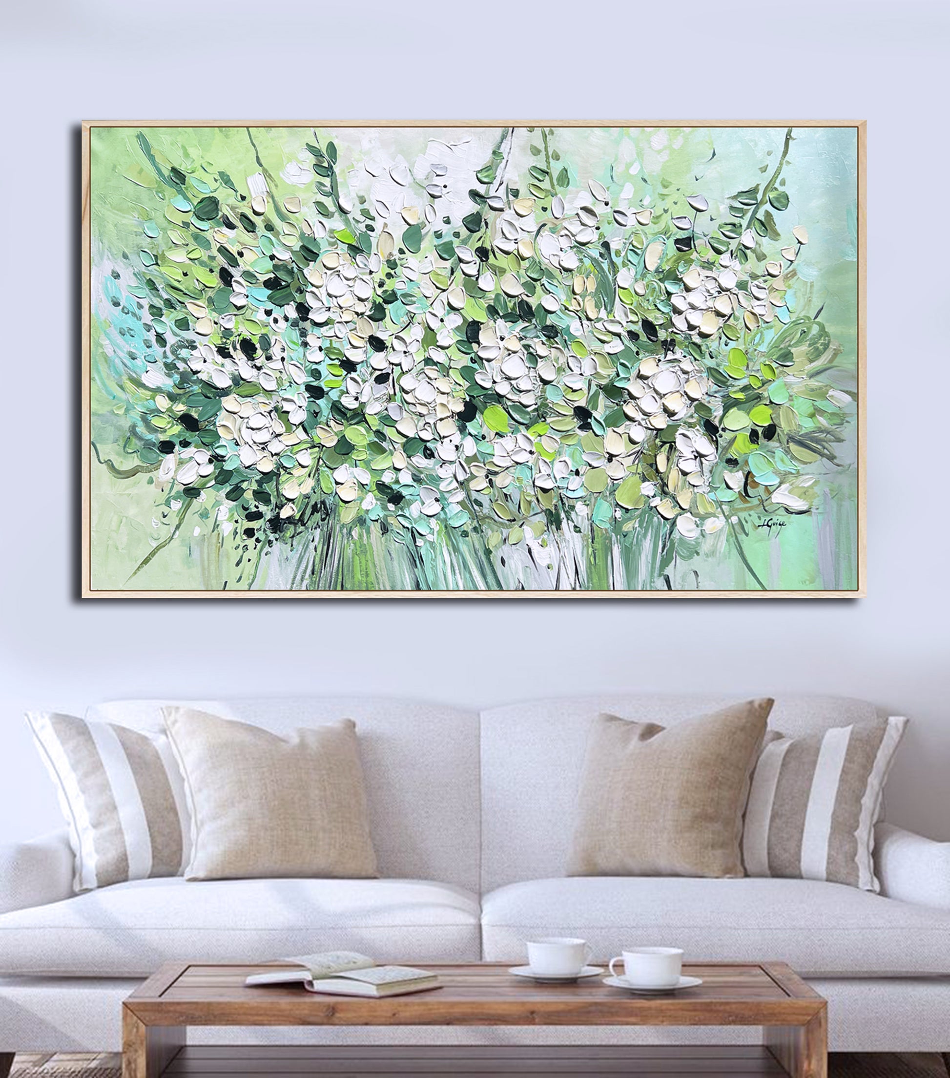 This painting radiates freshness and vibrancy, depicting a lush bouquet of white blossoms and green foliage.