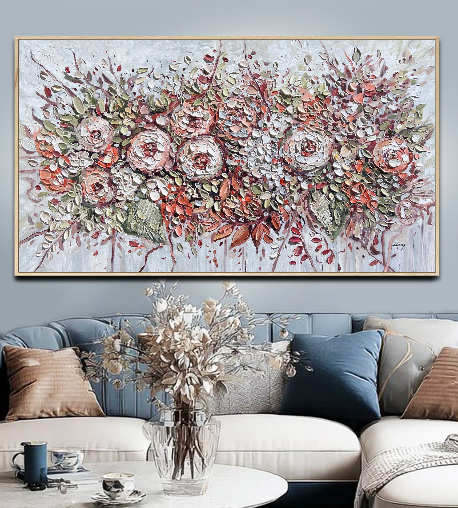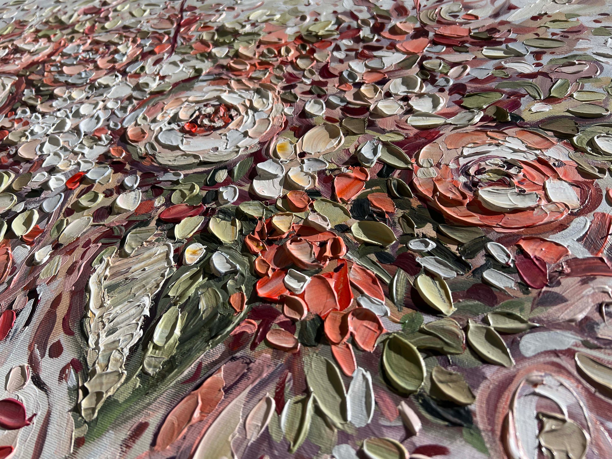 The textured brushstrokes add depth and vibrancy, giving the floral elements a lively, tactile quality.