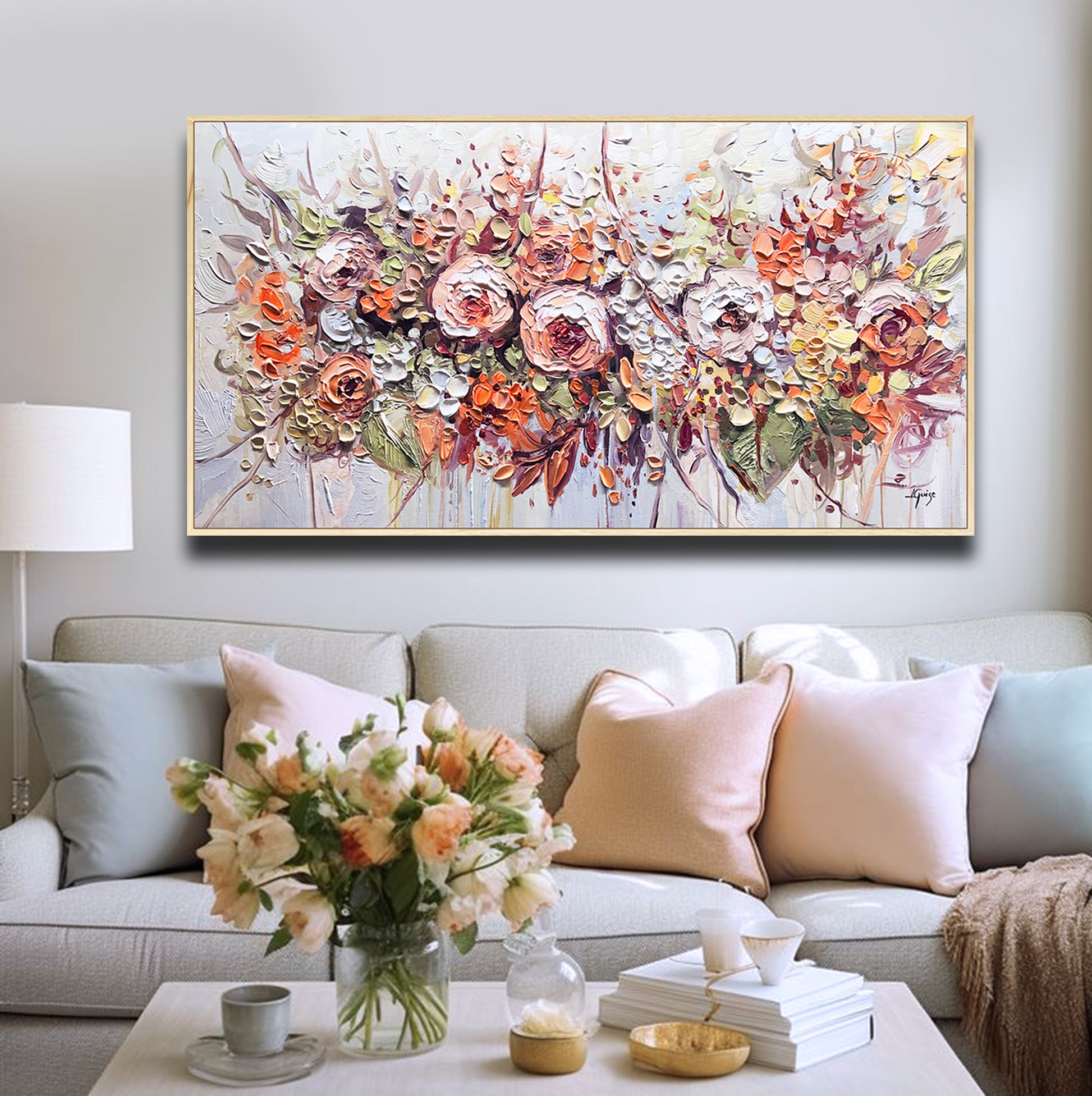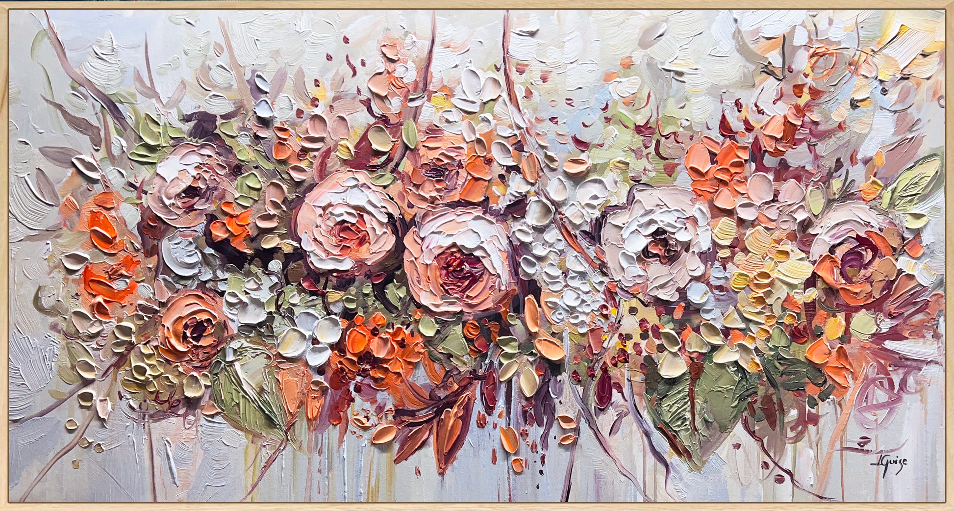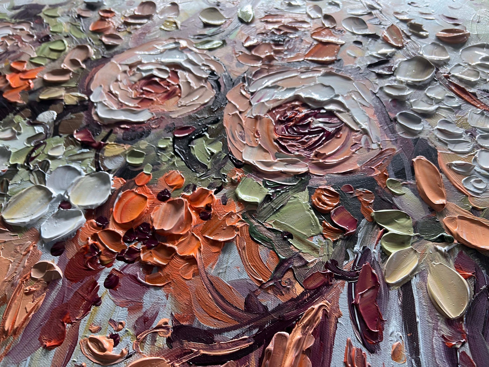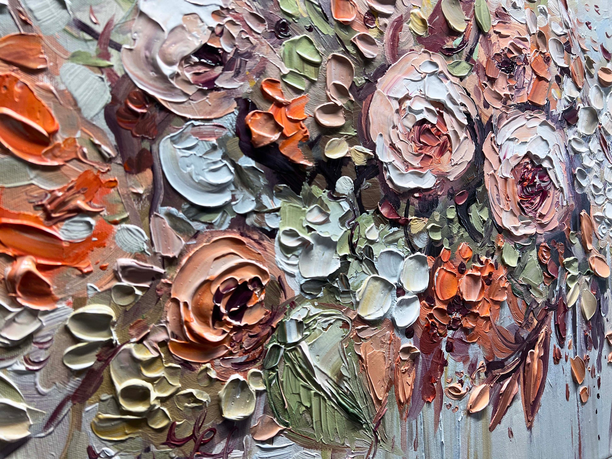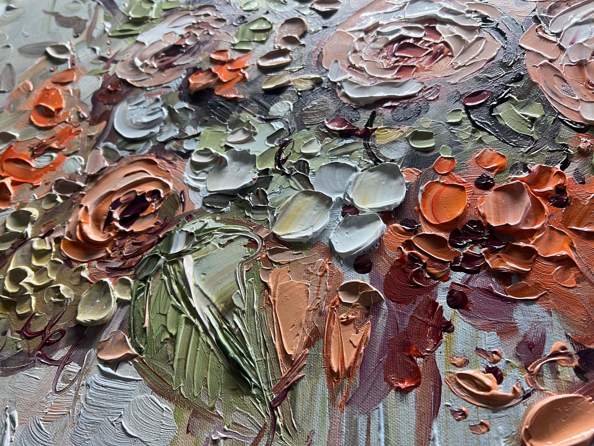 The textured brushstrokes add depth and vibrancy, giving the floral elements a lively, tactile quality.