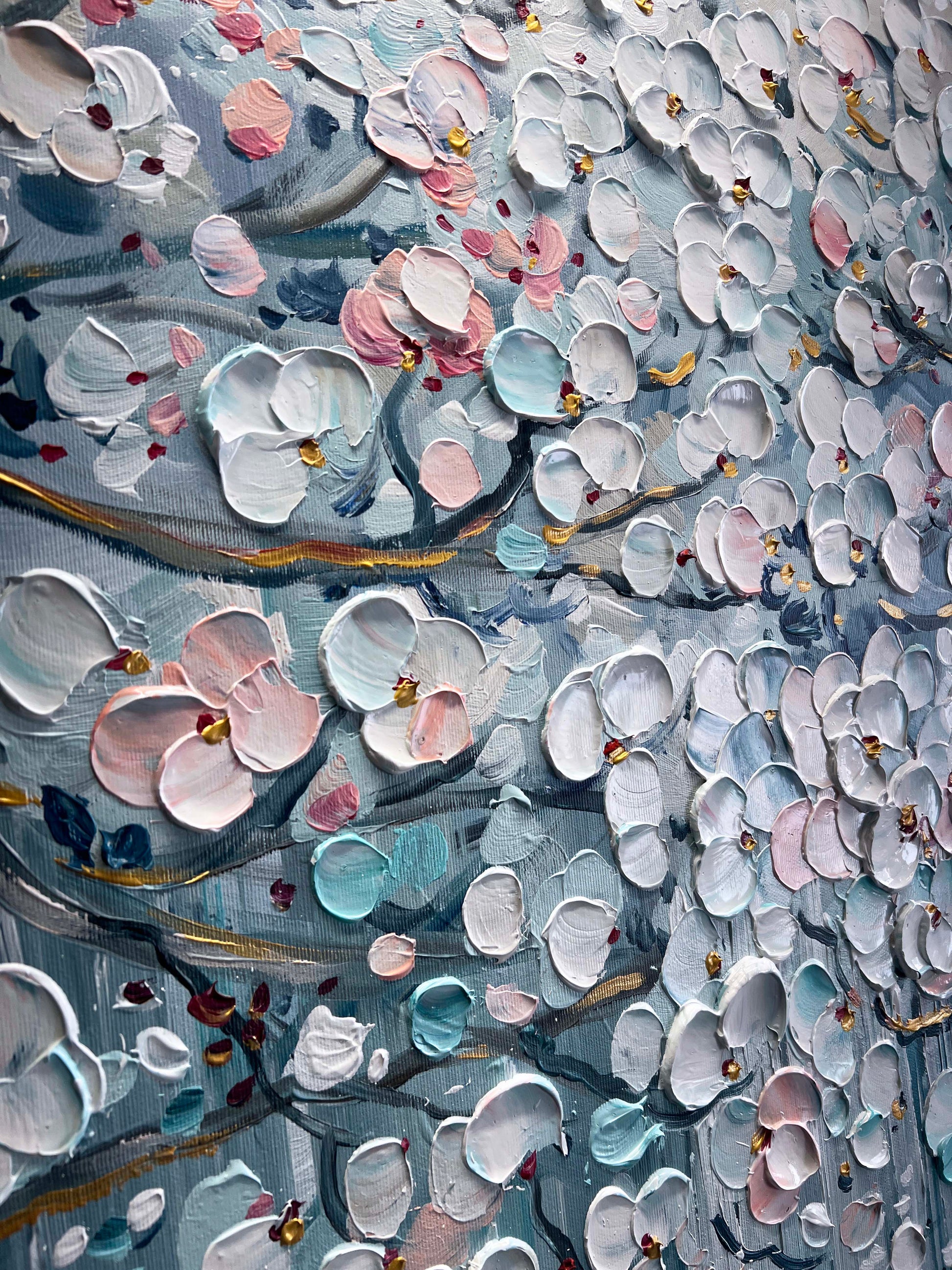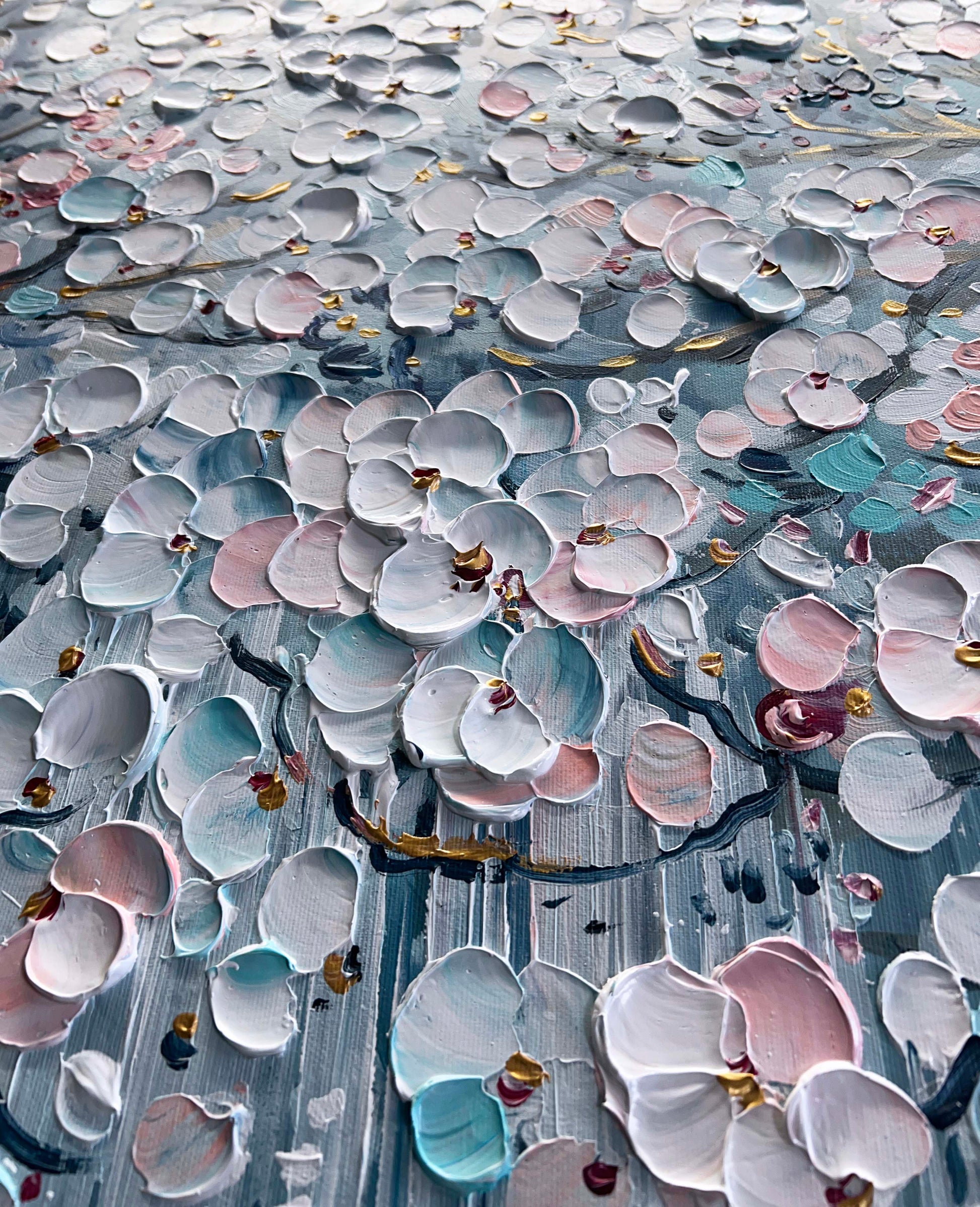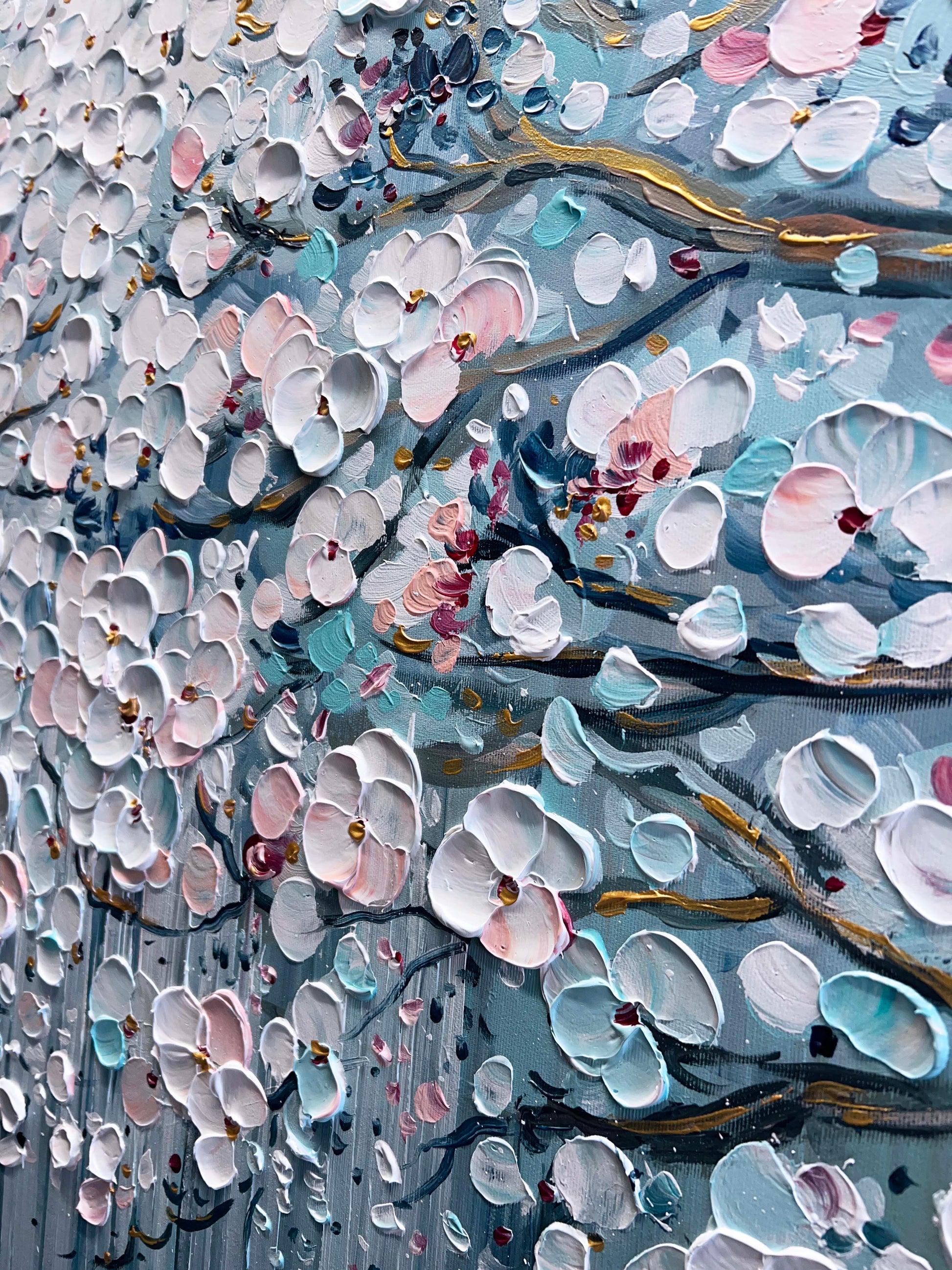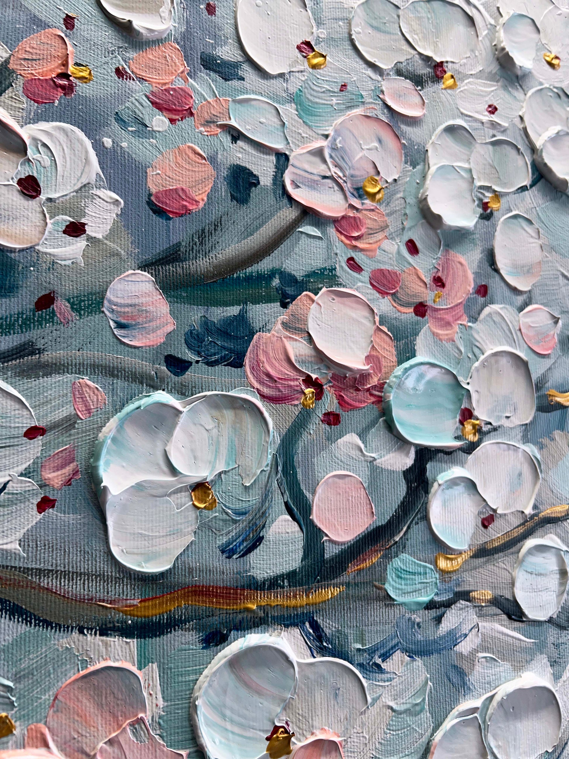 In this painting, textured techniques has been used to bring the blossoms to life, giving them a three-dimensional quality that you can feel.