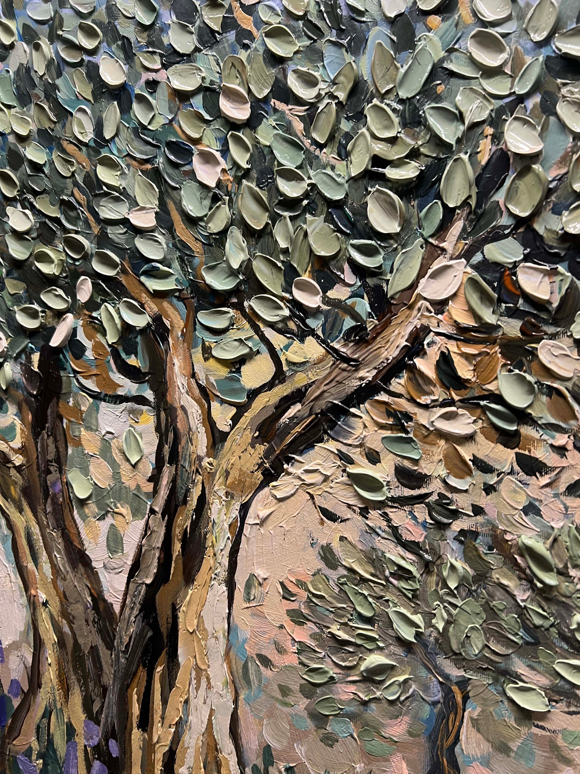 The olive trees are rendered in textured strokes of olive green and sage tones, their leaves layered with depth and movement.
