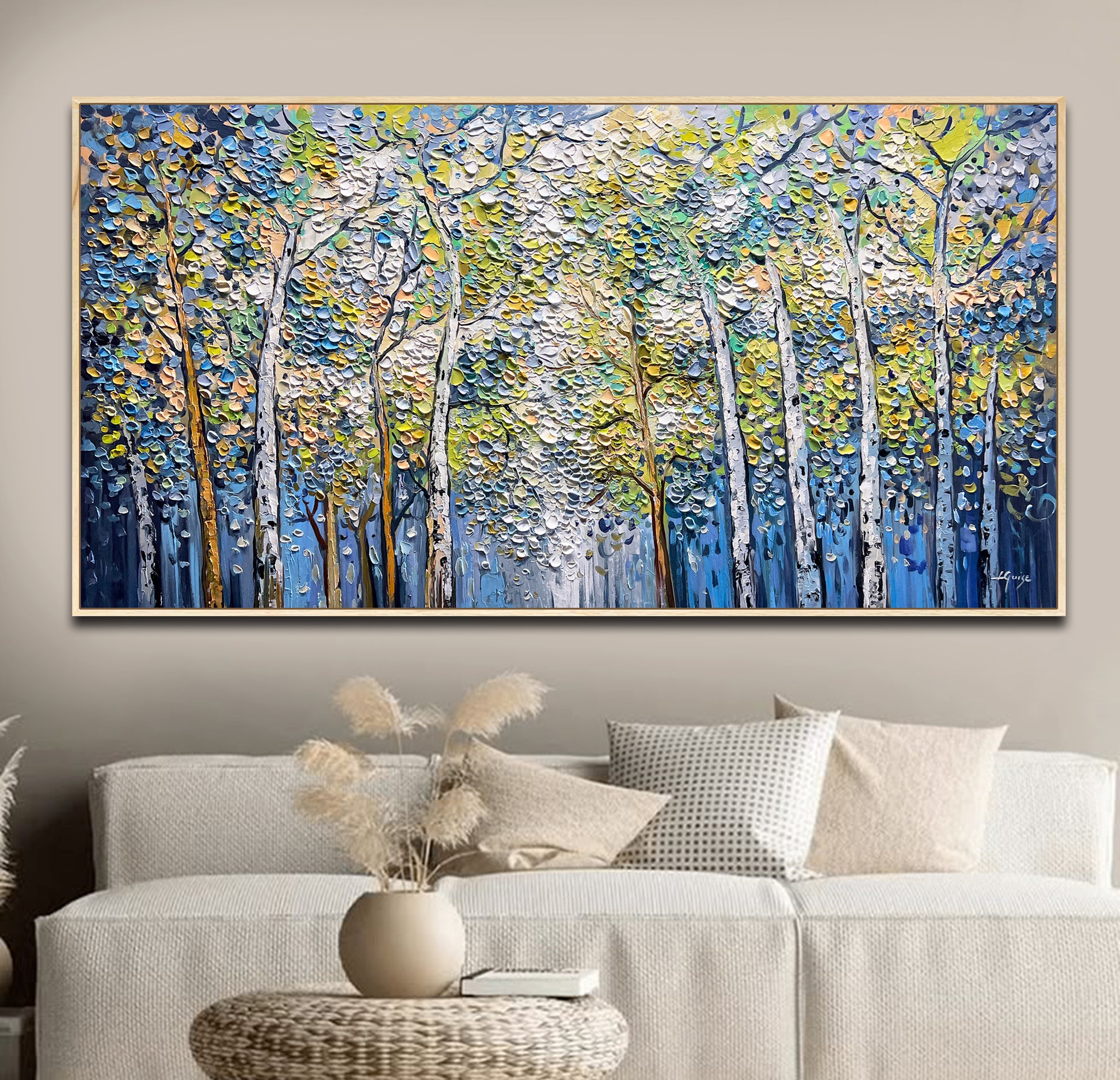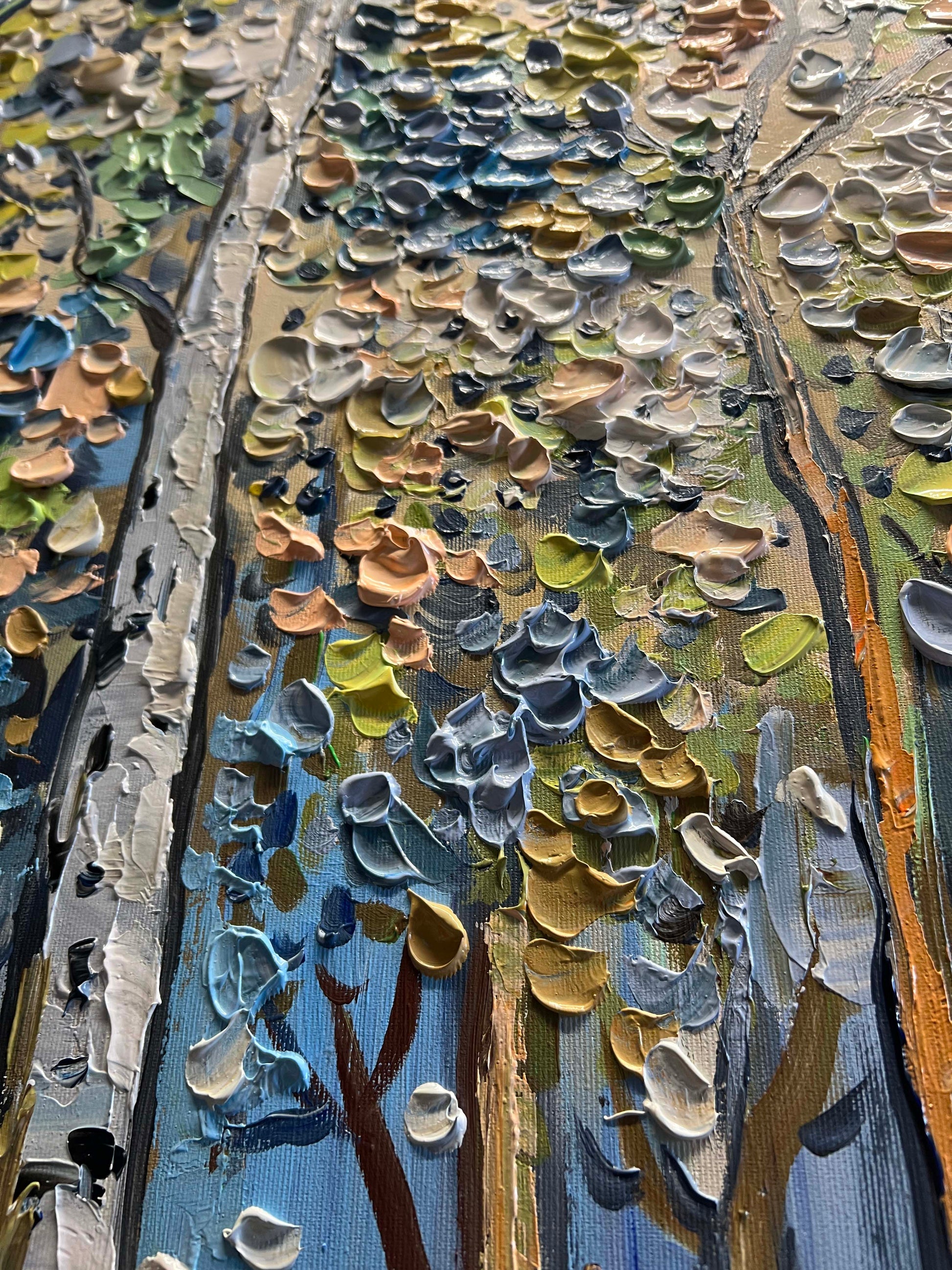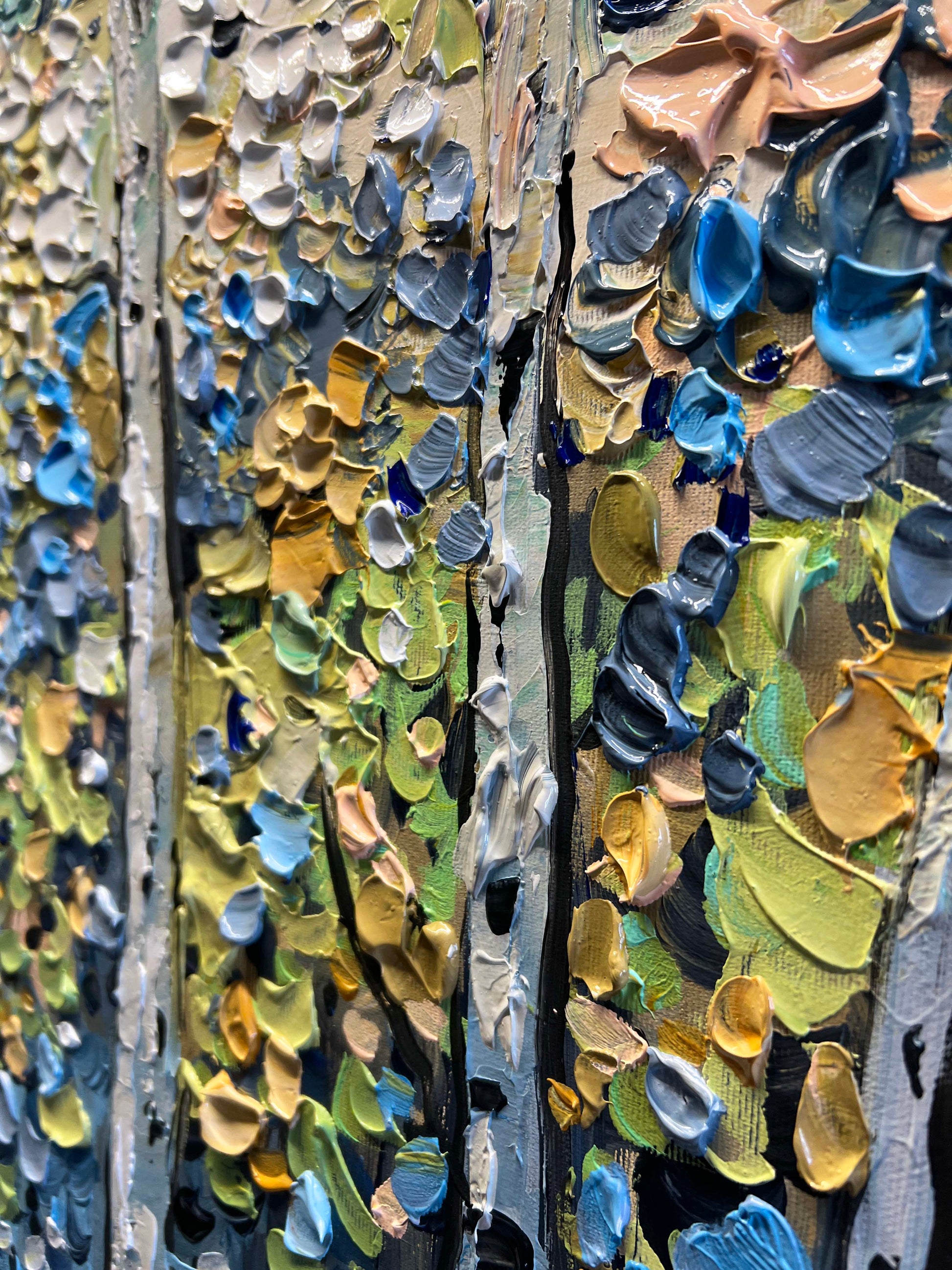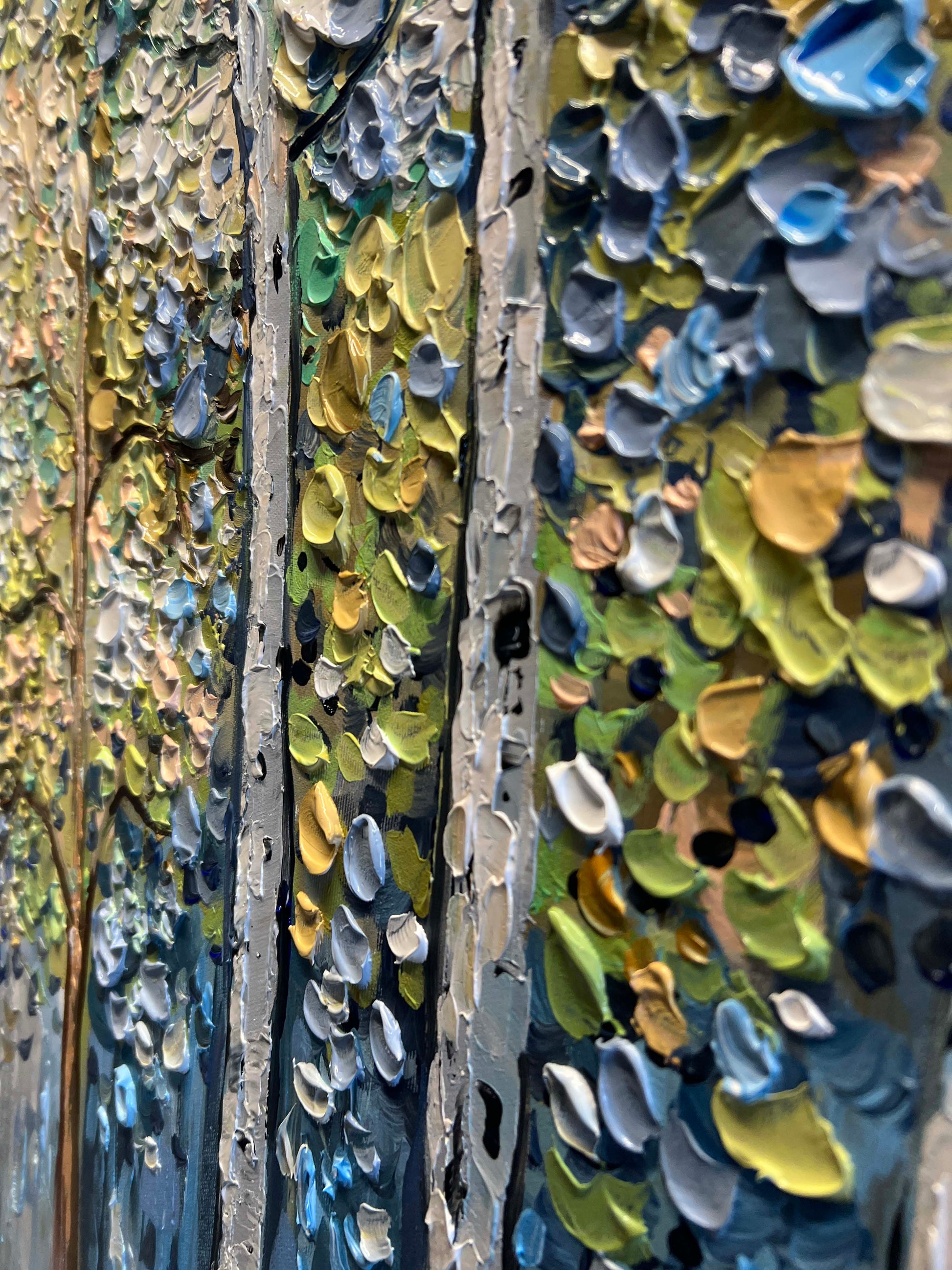 “Leafy Sky” captures the essence of looking upward through a vibrant forest canopy. The textured leaves in shades of green, blue, white, and soft peach create a dynamic sky above the slender birch trunks.