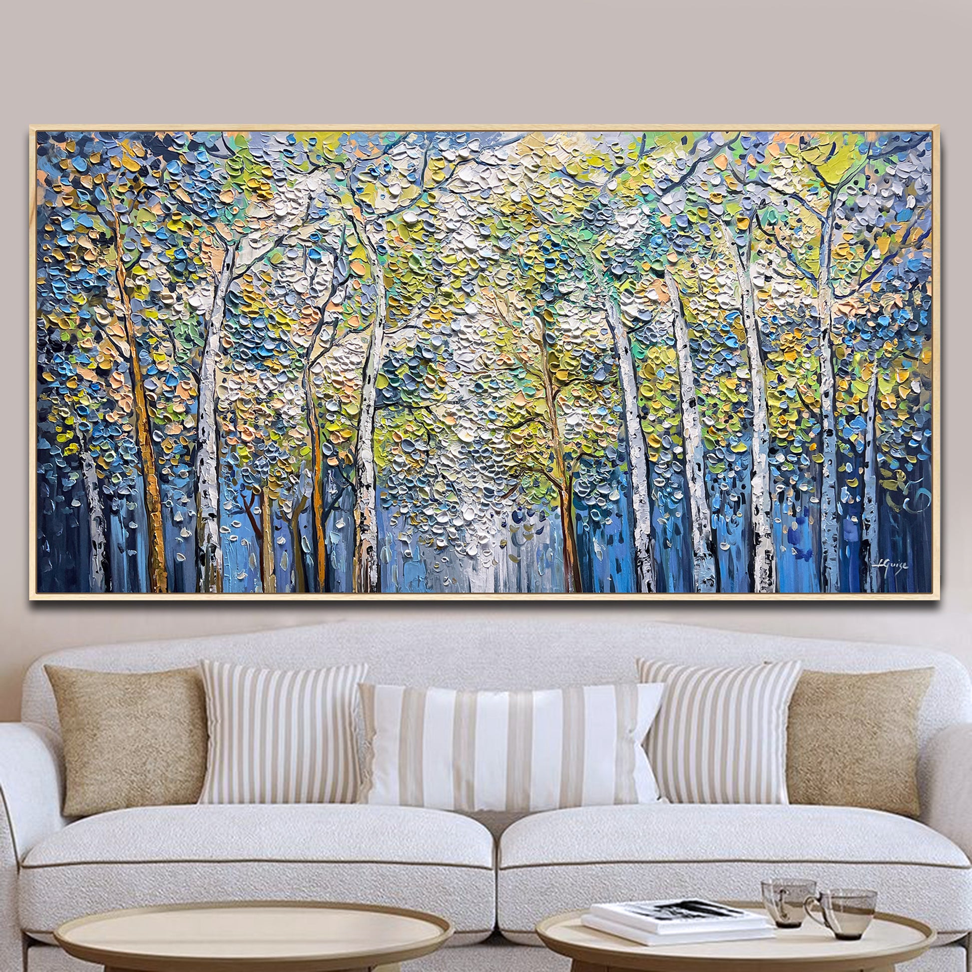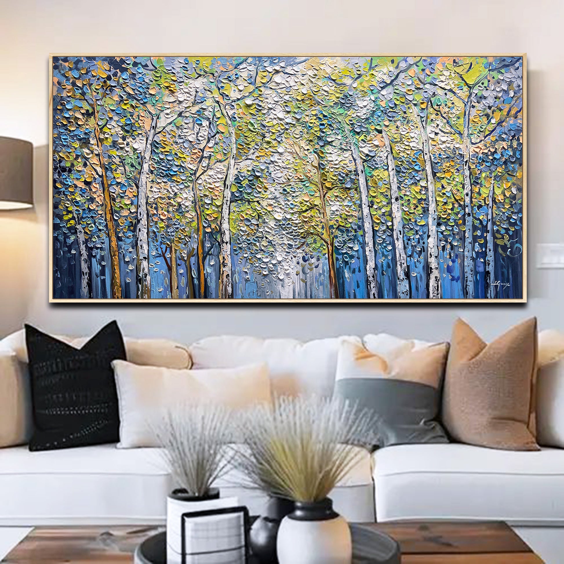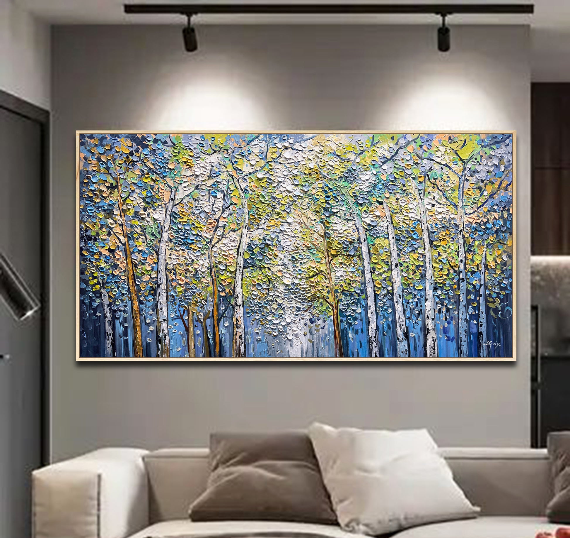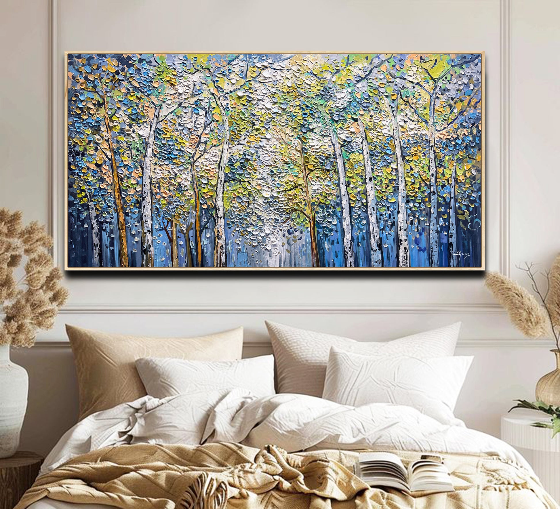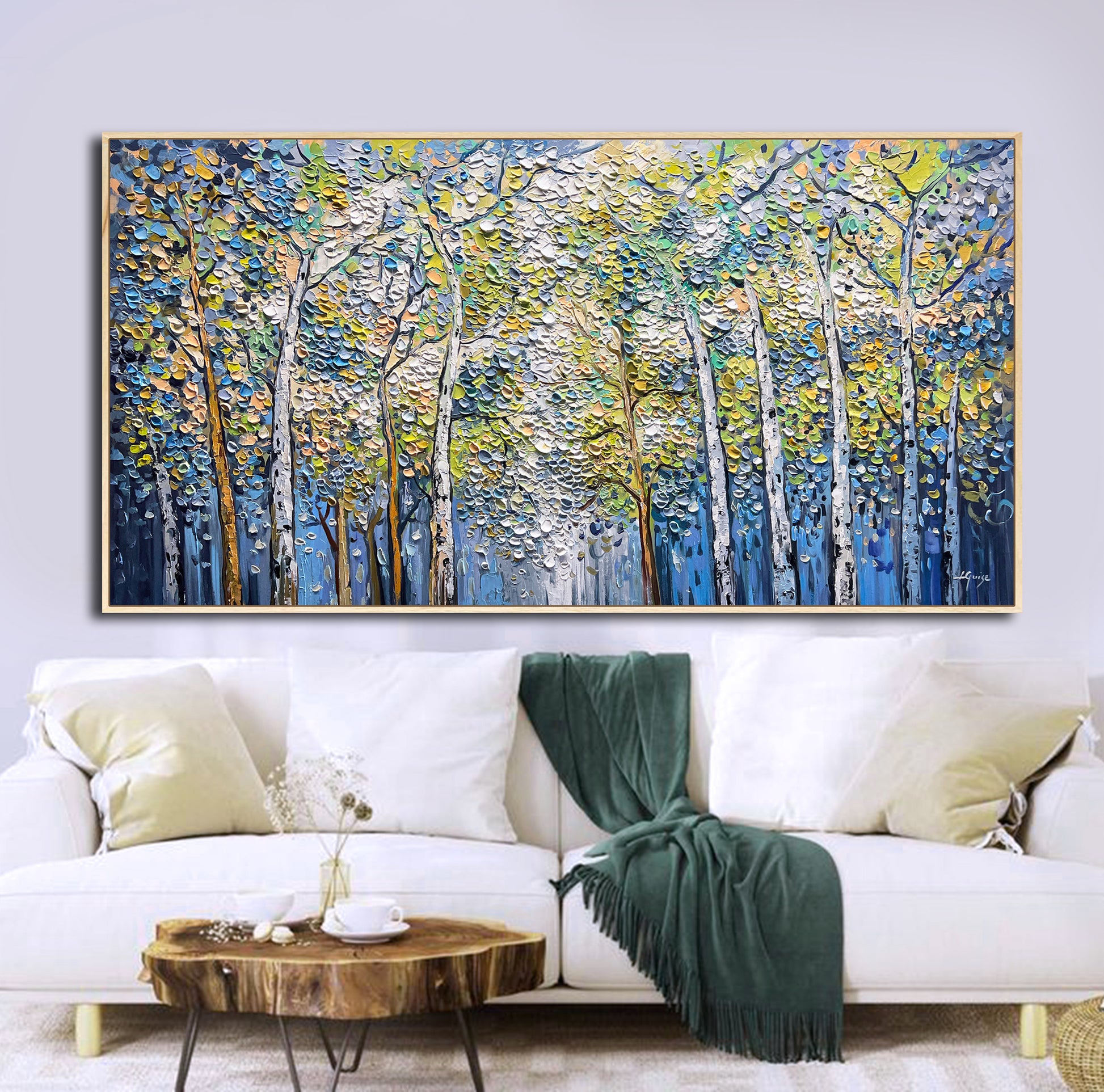 “Leafy Sky” captures the essence of looking upward through a vibrant forest canopy. The textured leaves in shades of green, blue, white, and soft peach create a dynamic sky above the slender birch trunks.