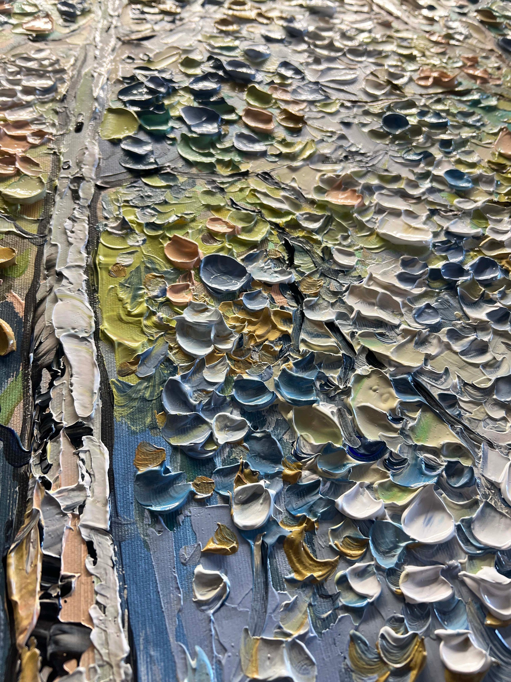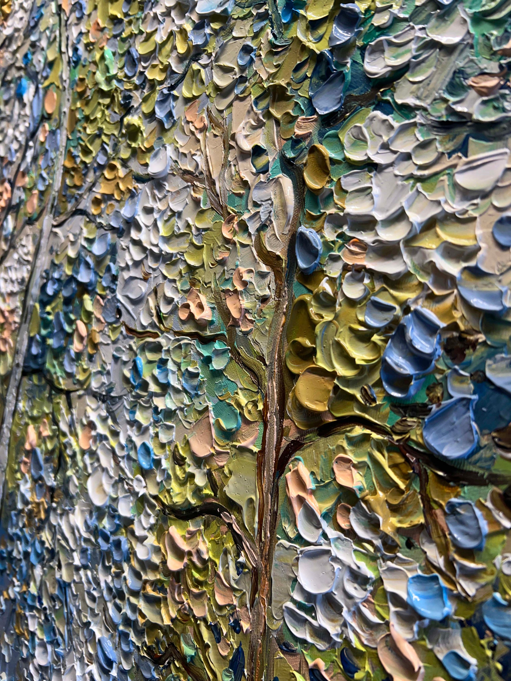 I used thick, impasto brushstrokes to bring movement and depth to the foliage, evoking a sense of leaves rustling in a gentle breeze.