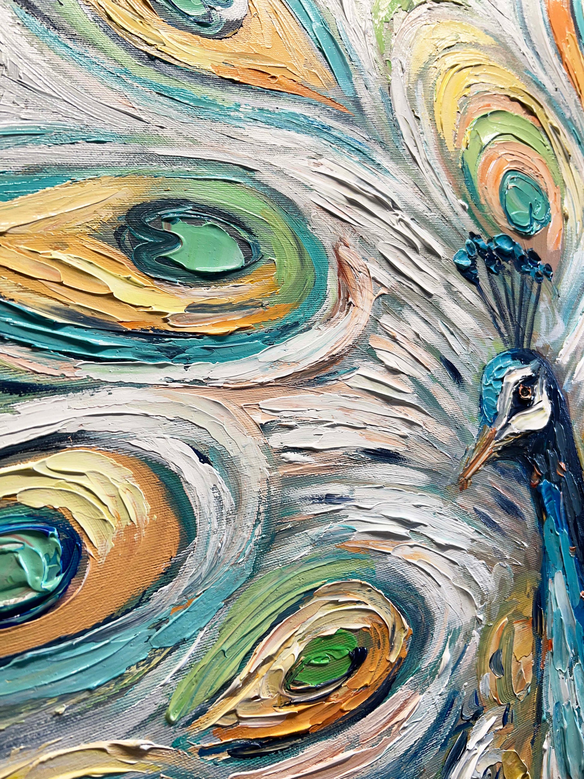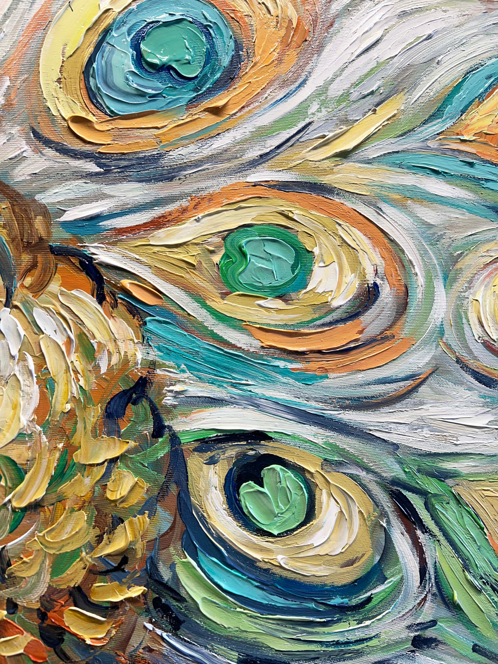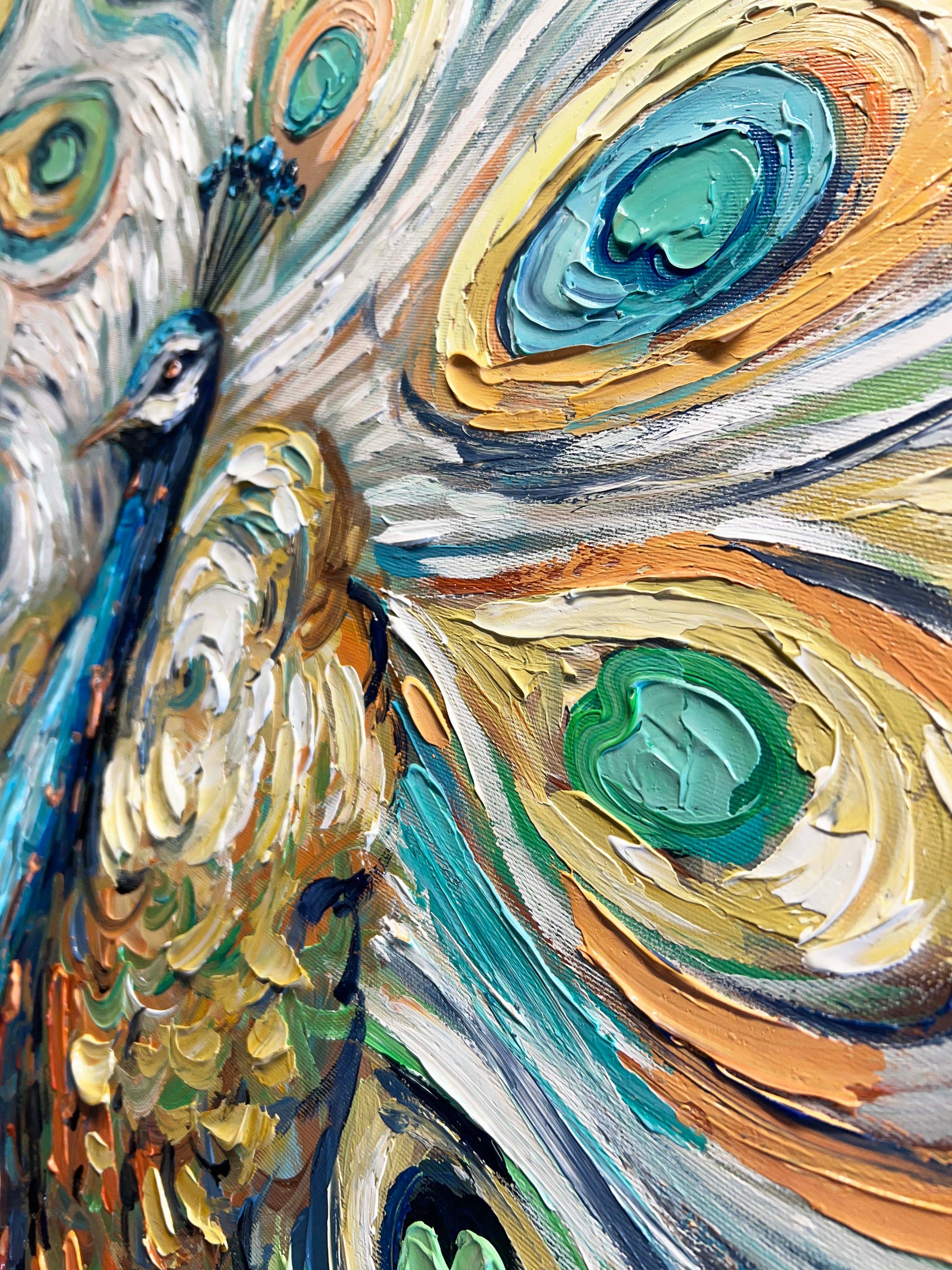 "Majestic Peacock" is a striking portrayal of a majestic peacock, its resplendent plumage unfolding in a mesmerizing swirl of teal, gold, green, and soft gray hues. The textured brushstrokes create a dynamic sense of movement, giving the feathers a fluid and almost ethereal quality. At the heart of the composition, the peacock's elegant posture and piercing gaze command attention, exuding a regal presence. The harmonious blend of colors and expressive details highlight the bird’s natural beauty and symbolism of grace and nobility. Consider opting for a gold frame to imbue the painting with an opulent allure, transforming it into a truly captivating statement piece.