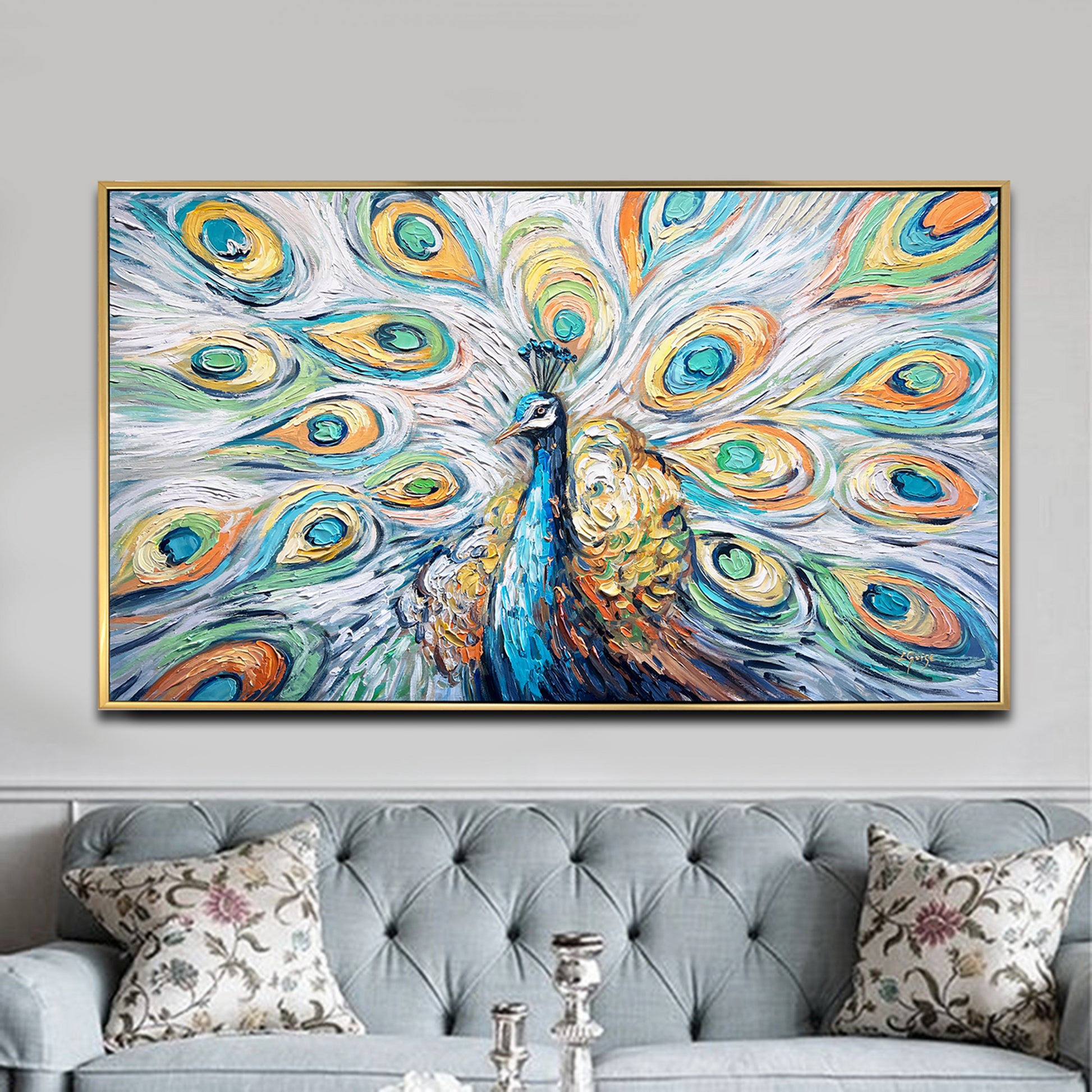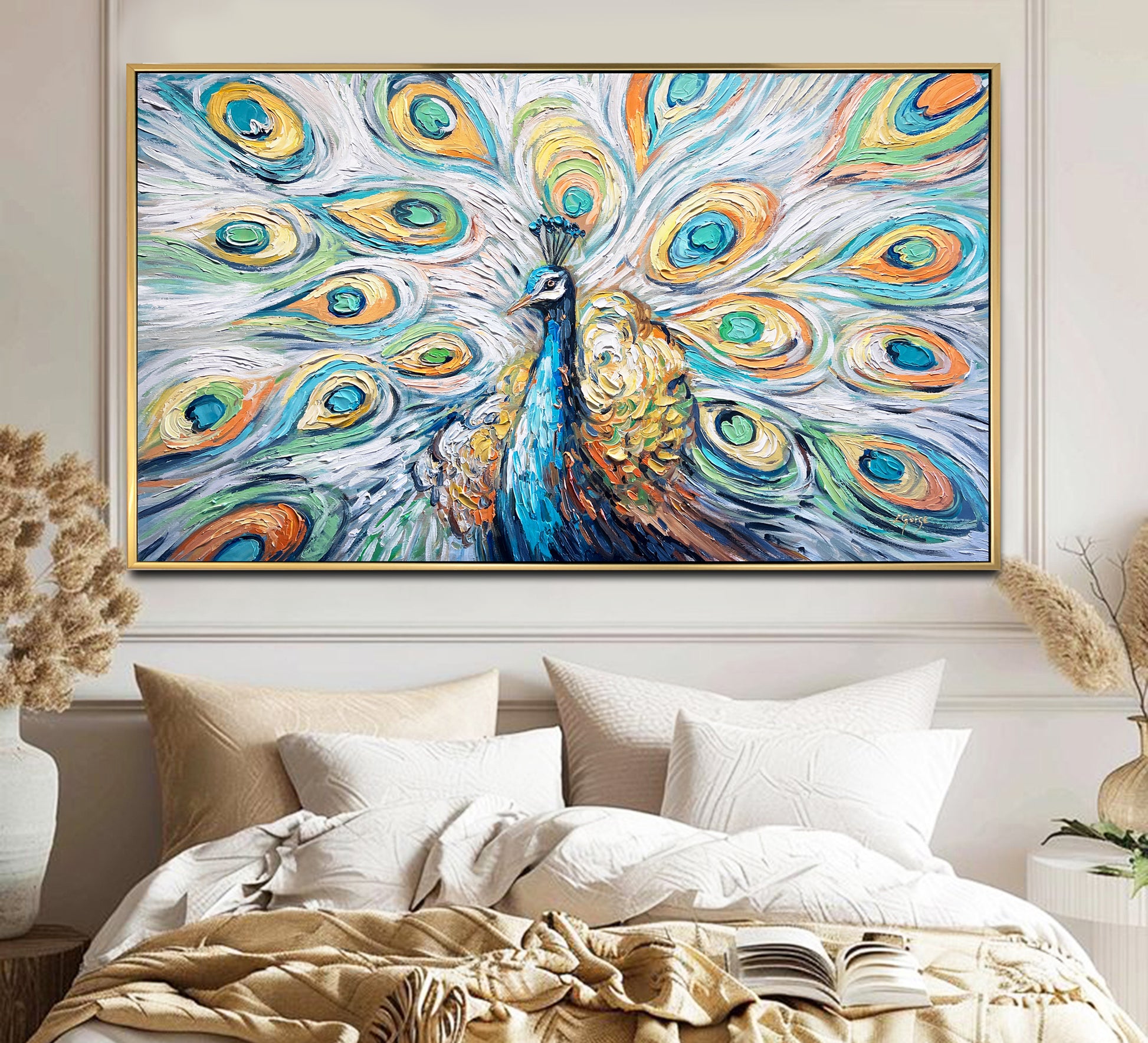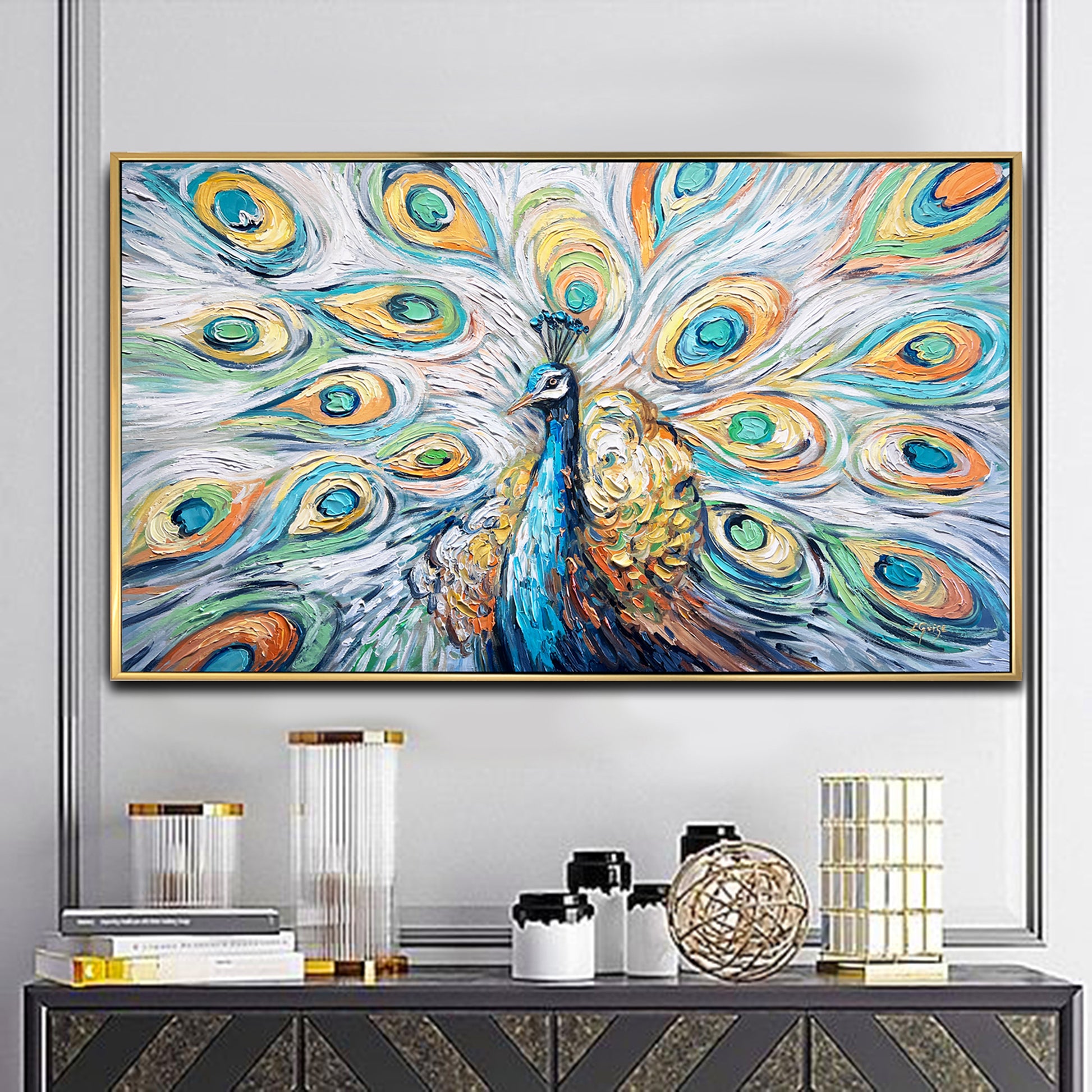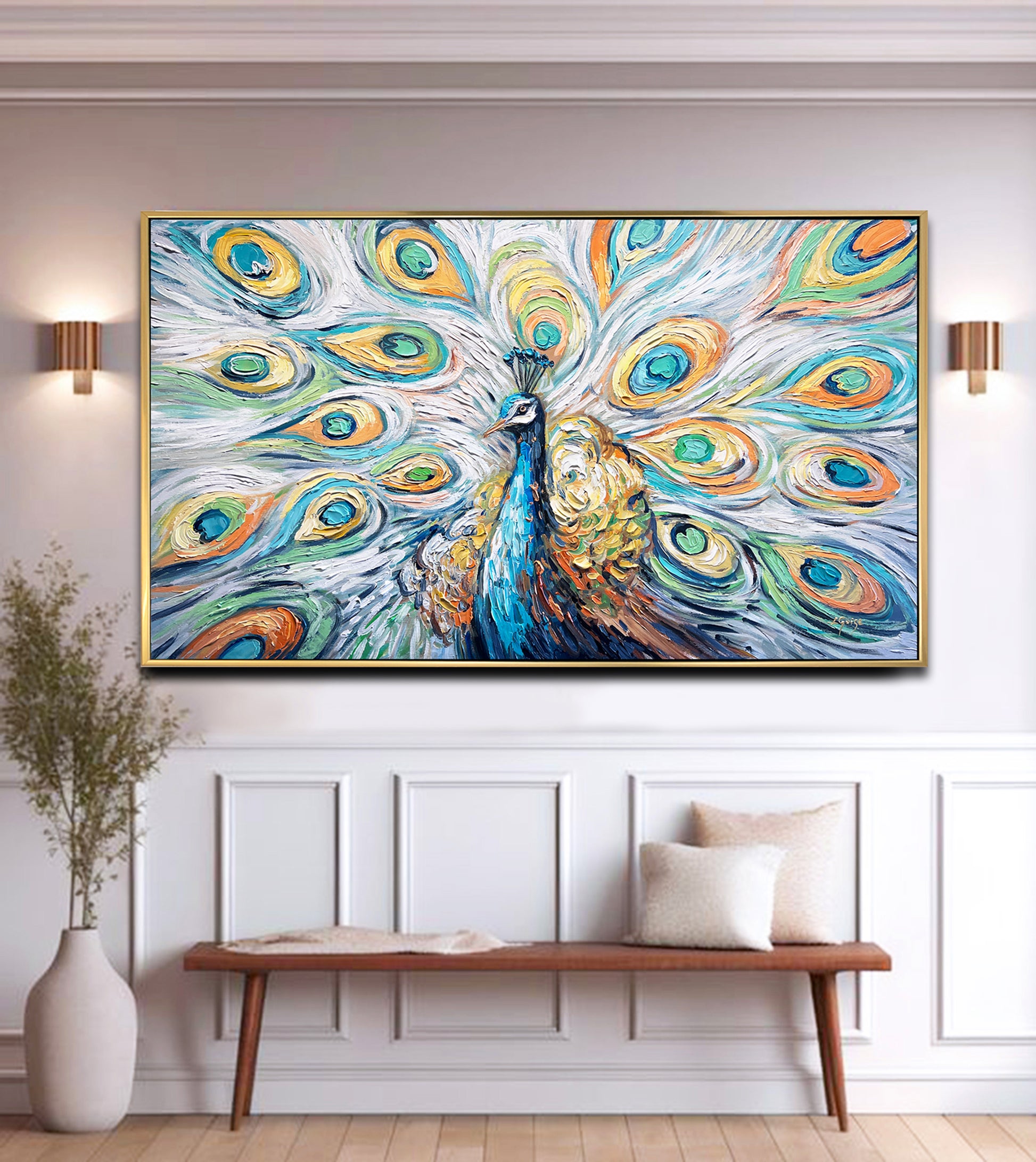 "Majestic Peacock" is a striking portrayal of a majestic peacock, its resplendent plumage unfolding in a mesmerizing swirl of teal, gold, green, and soft gray hues. The textured brushstrokes create a dynamic sense of movement, giving the feathers a fluid and almost ethereal quality. At the heart of the composition, the peacock's elegant posture and piercing gaze command attention, exuding a regal presence. The harmonious blend of colors and expressive details highlight the bird’s natural beauty and symbolism of grace and nobility. Consider opting for a gold frame to imbue the painting with an opulent allure, transforming it into a truly captivating statement piece.