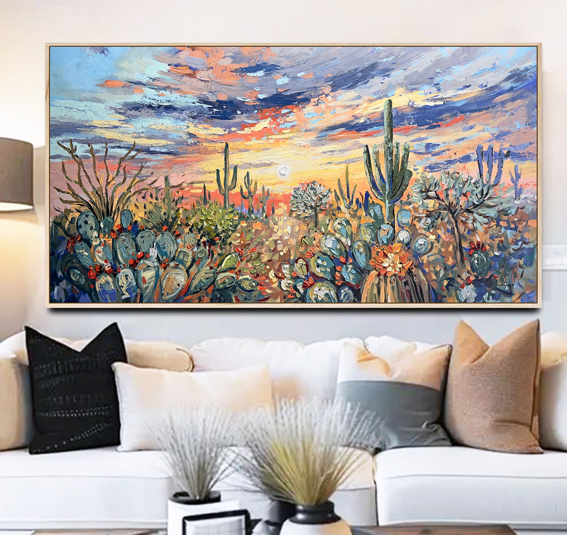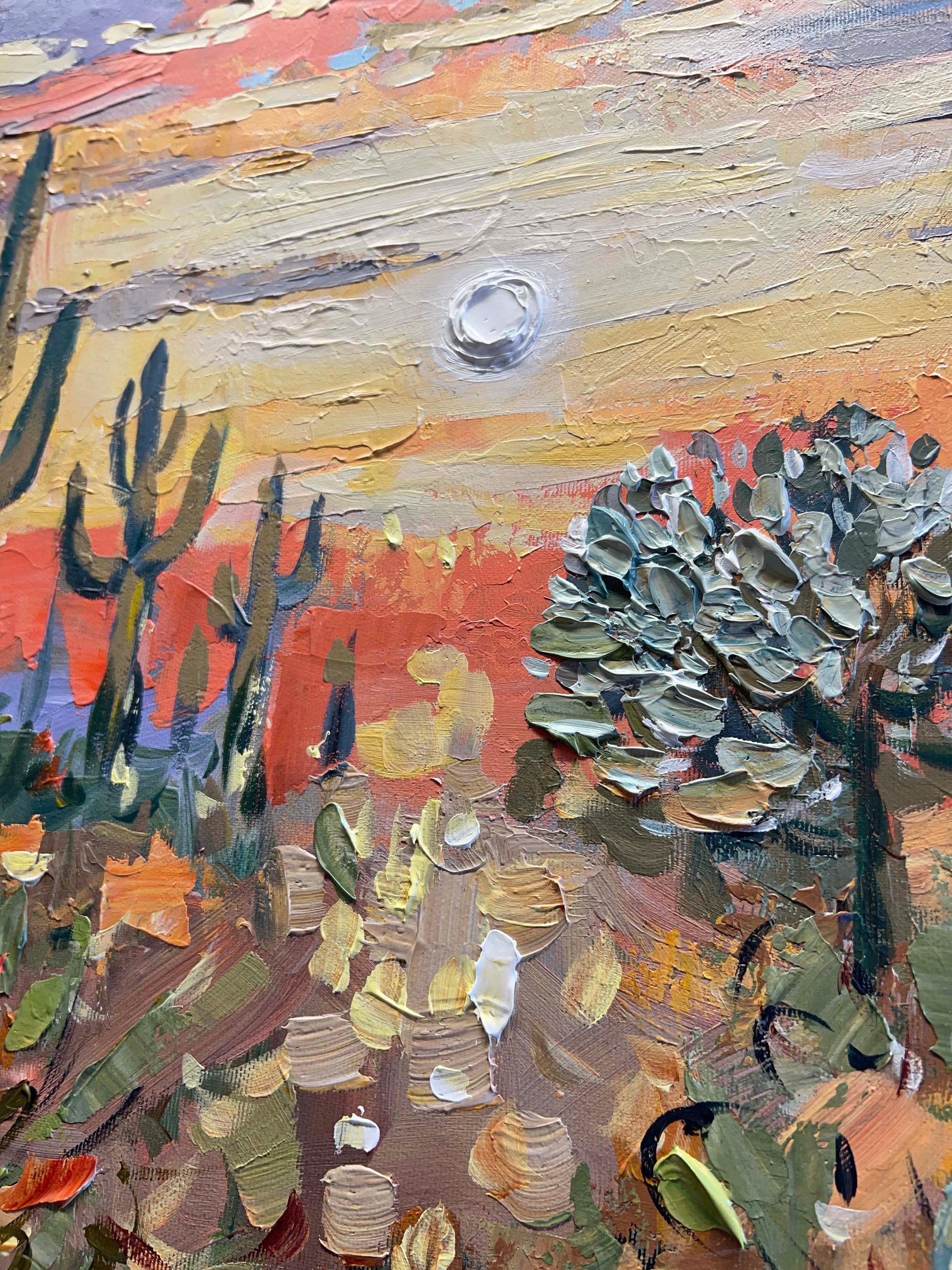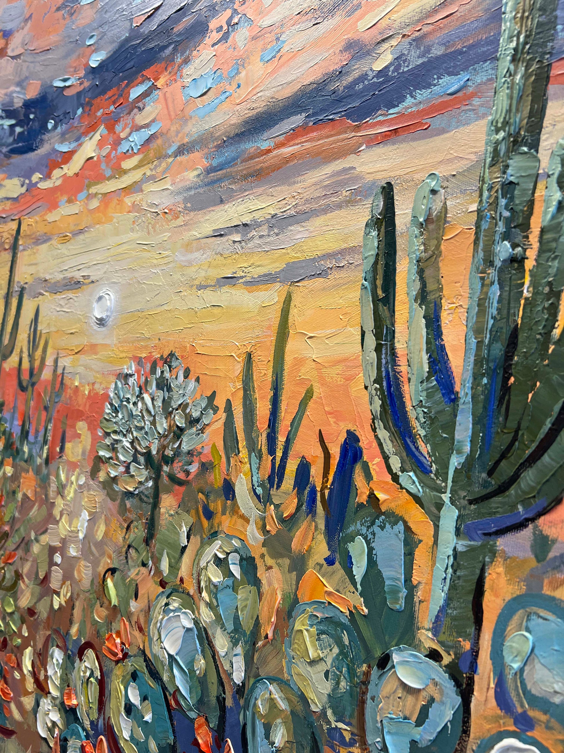 "Over the Dunes" is a captivating desert landscape painting that radiates warmth and life. it captures the magic of a desert sunrise just as it breaks over the horizon.