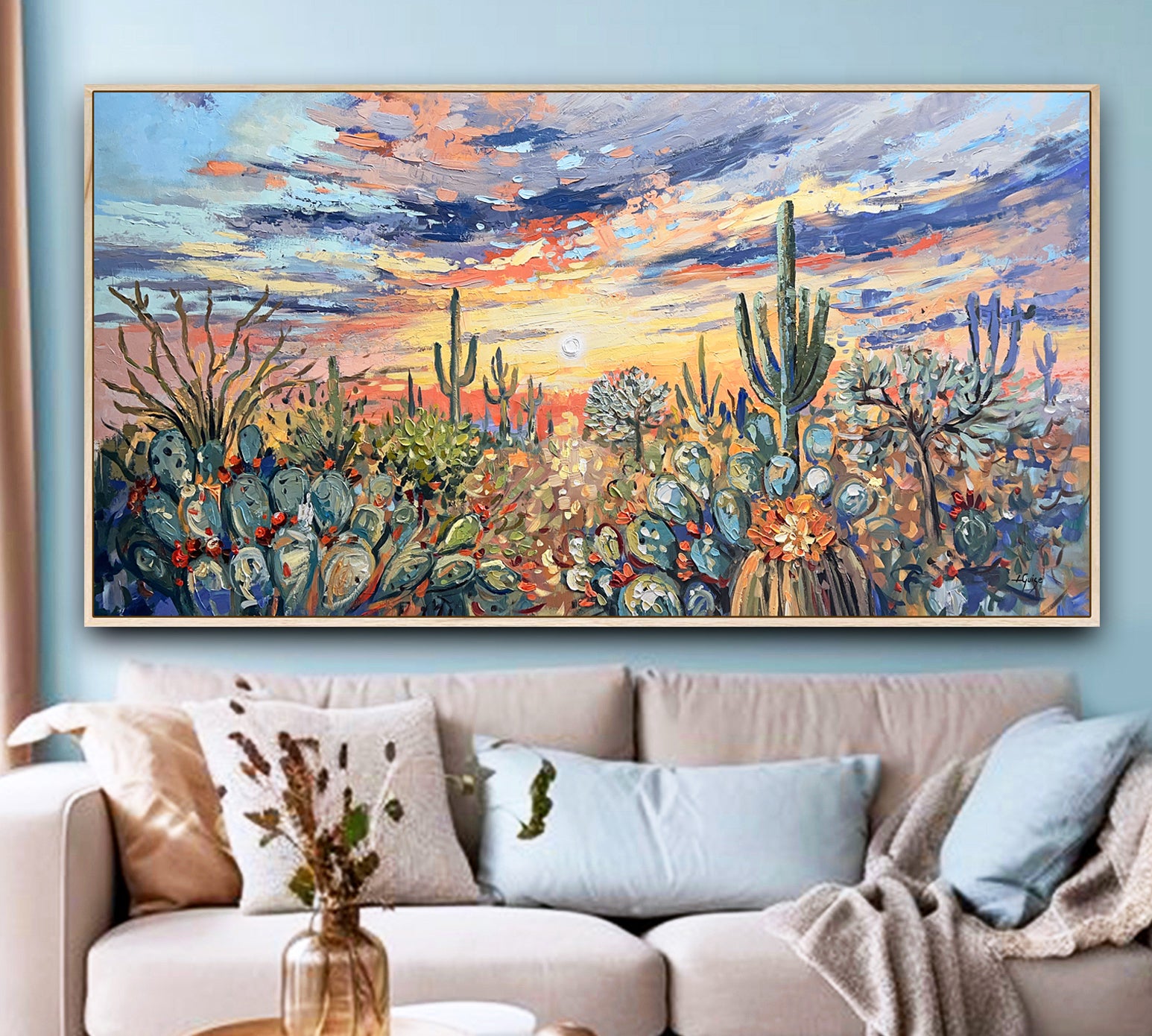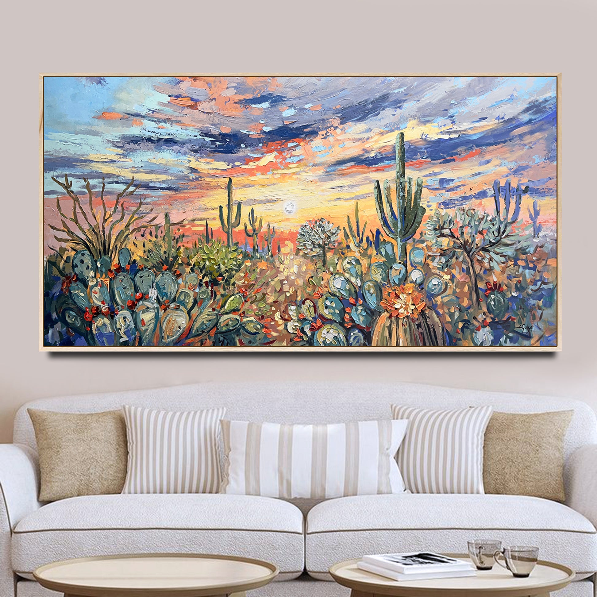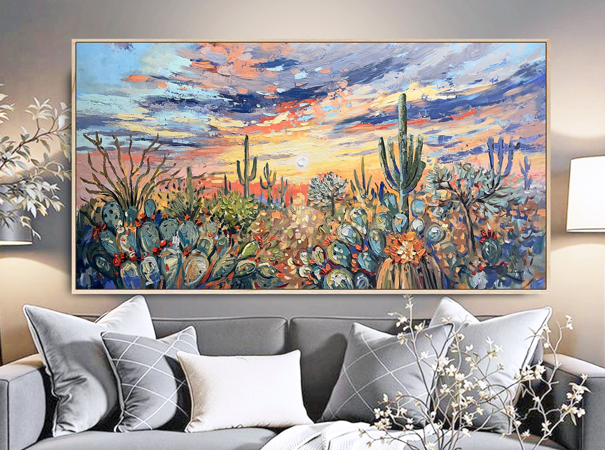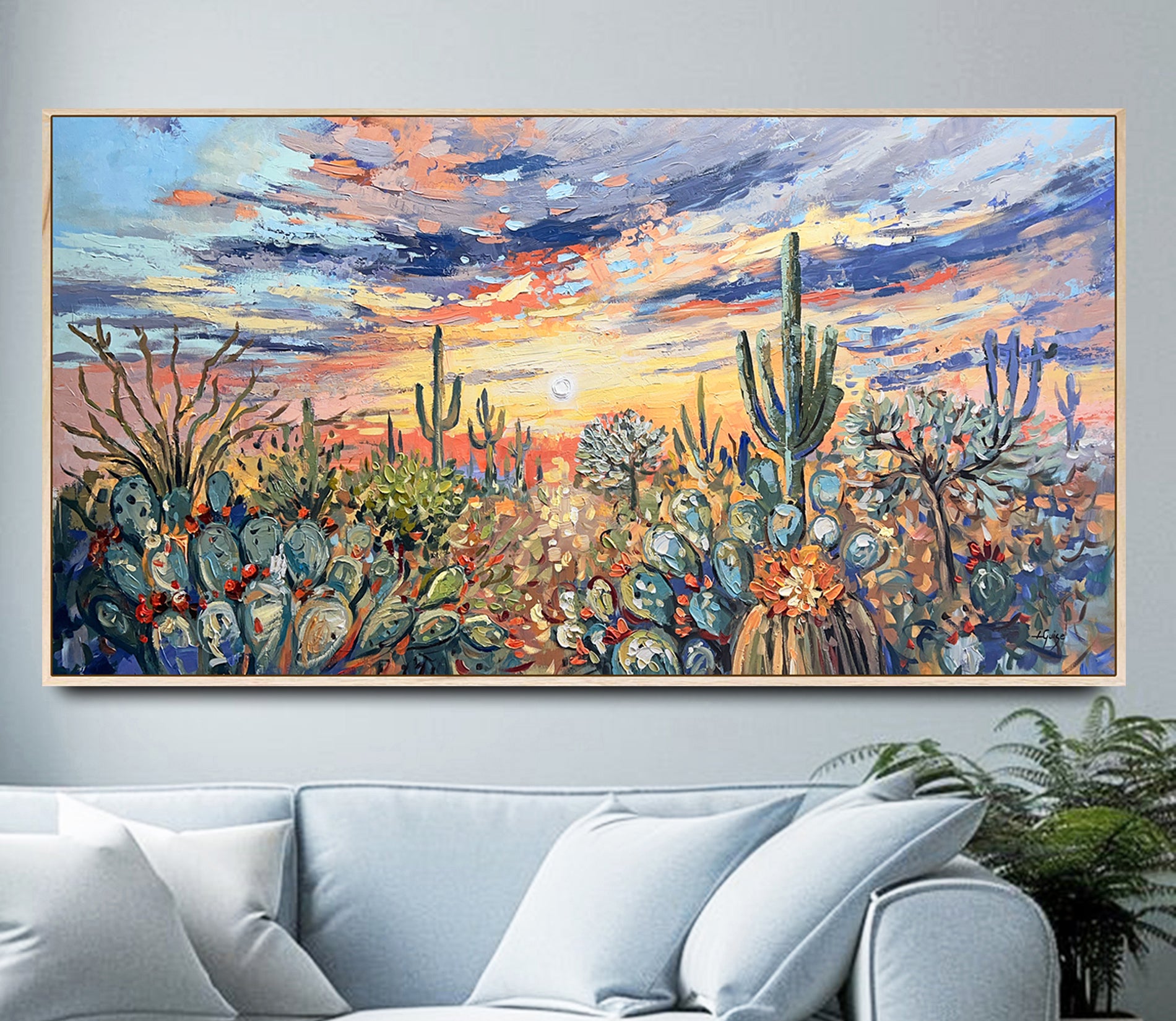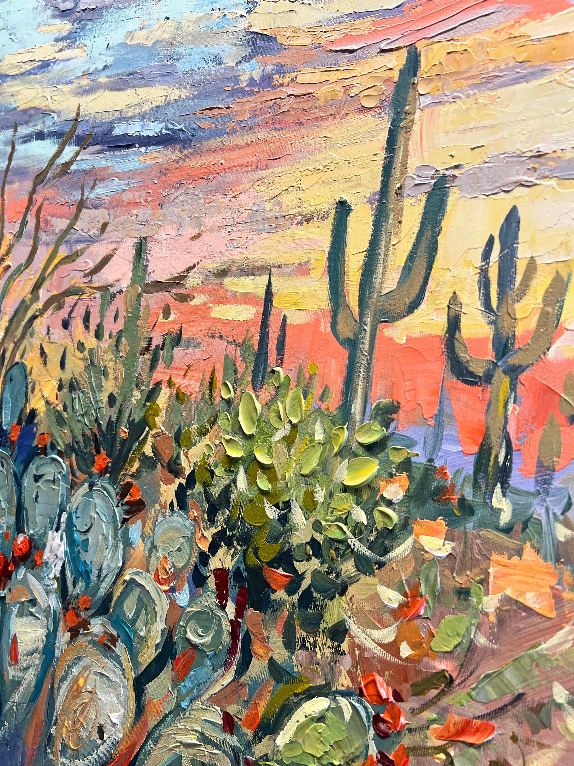 Towering saguaro cacti and clusters of blooming prickly pears create a textured, vibrant foreground, inviting the viewer to journey into the glowing distance.
