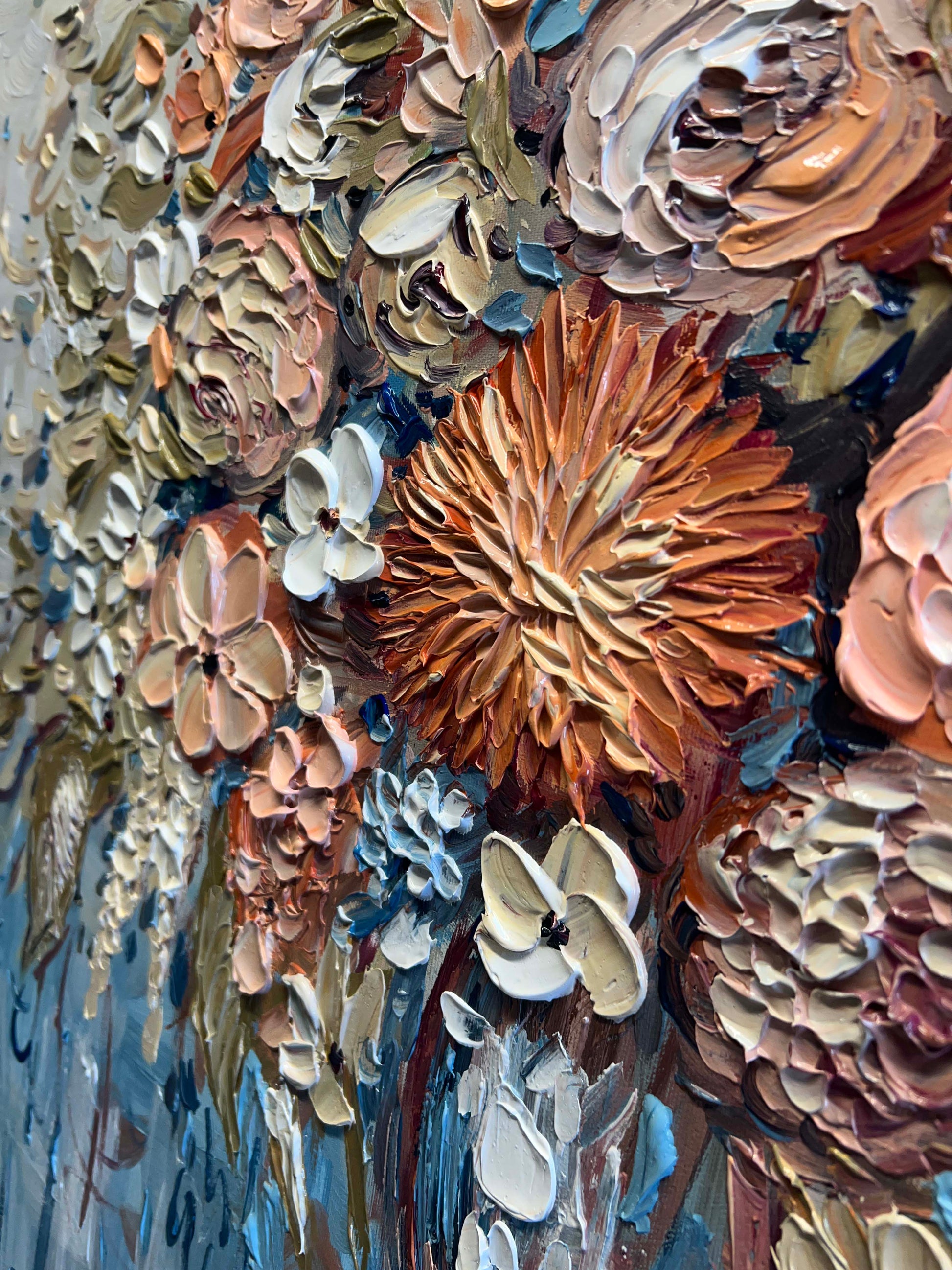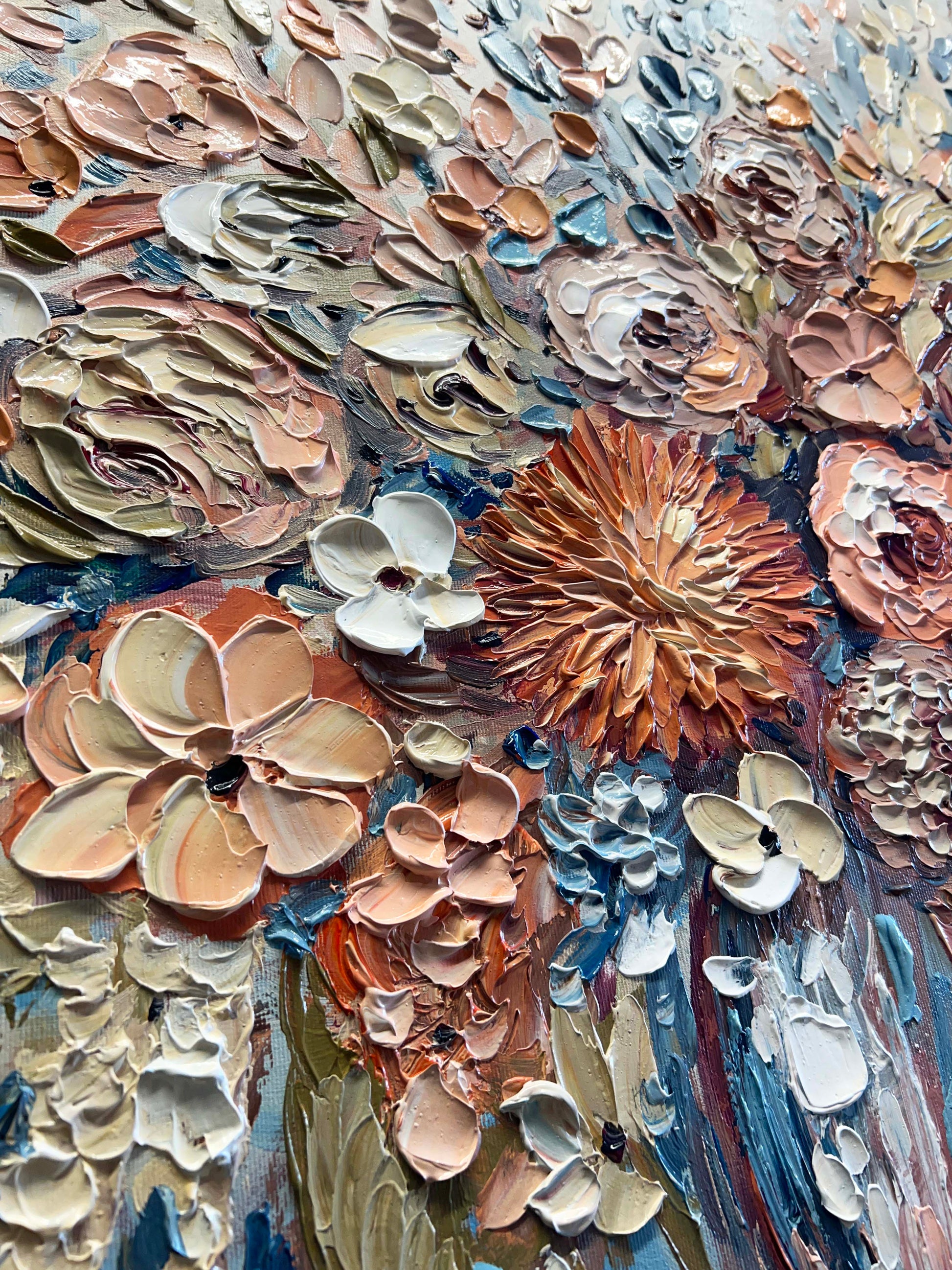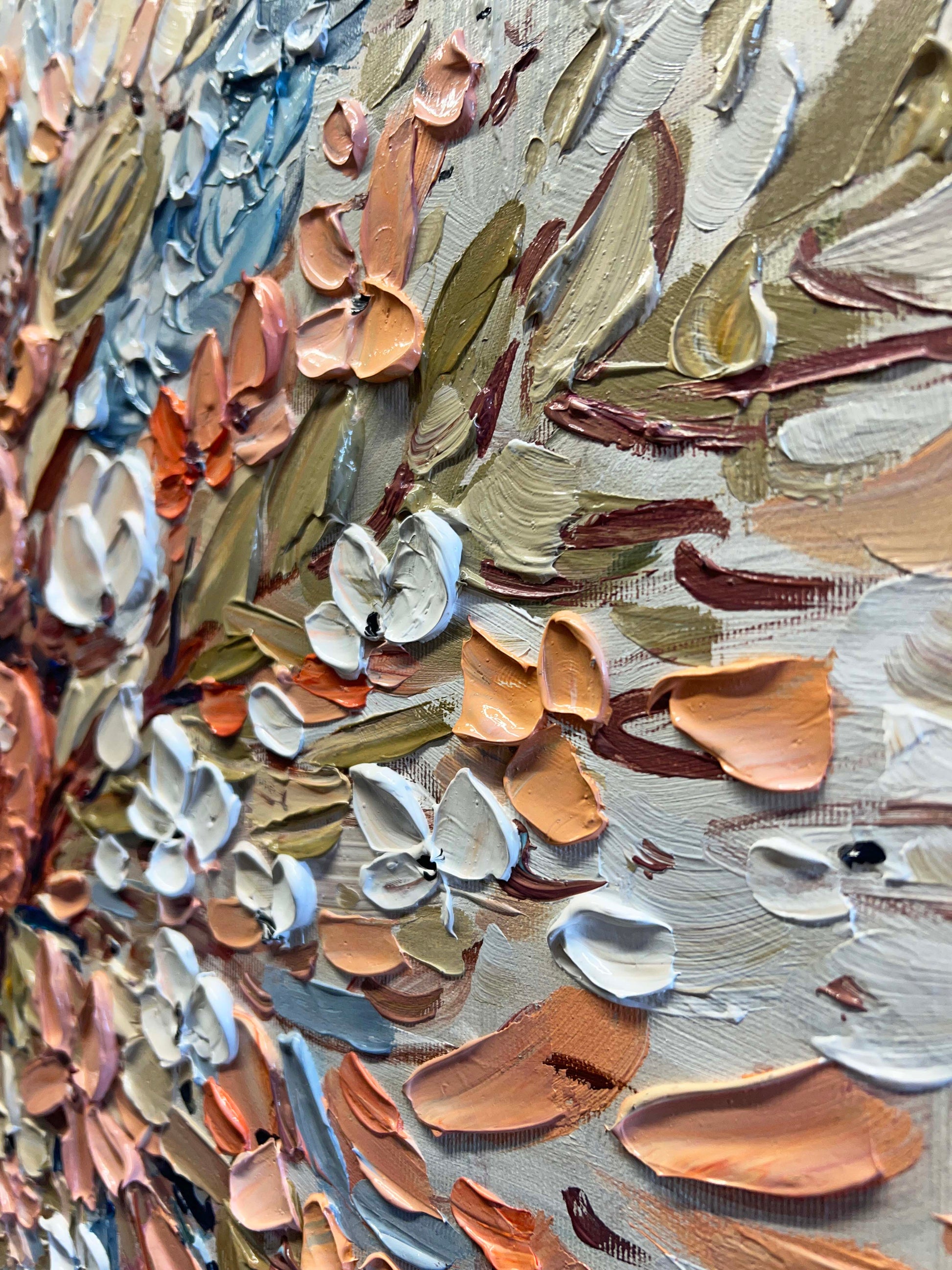 "Peach Parfait" this stunning floral painting radiates warmth and elegance, with a rich bouquet of textured blossoms in a harmonious blend of peach, apricot, copper, tan, and limed ash tones. The delicate petals and layered impasto strokes create a luxurious depth, making the flowers appear almost sculptural.