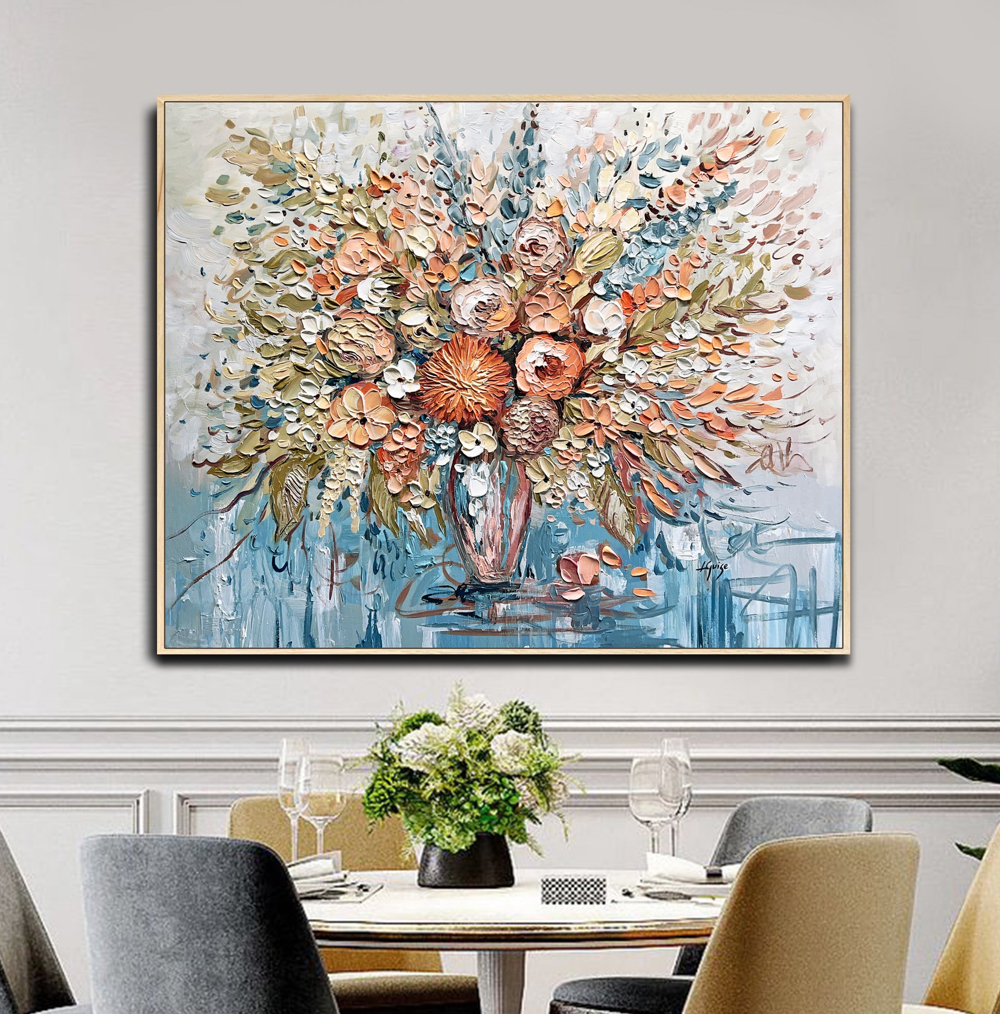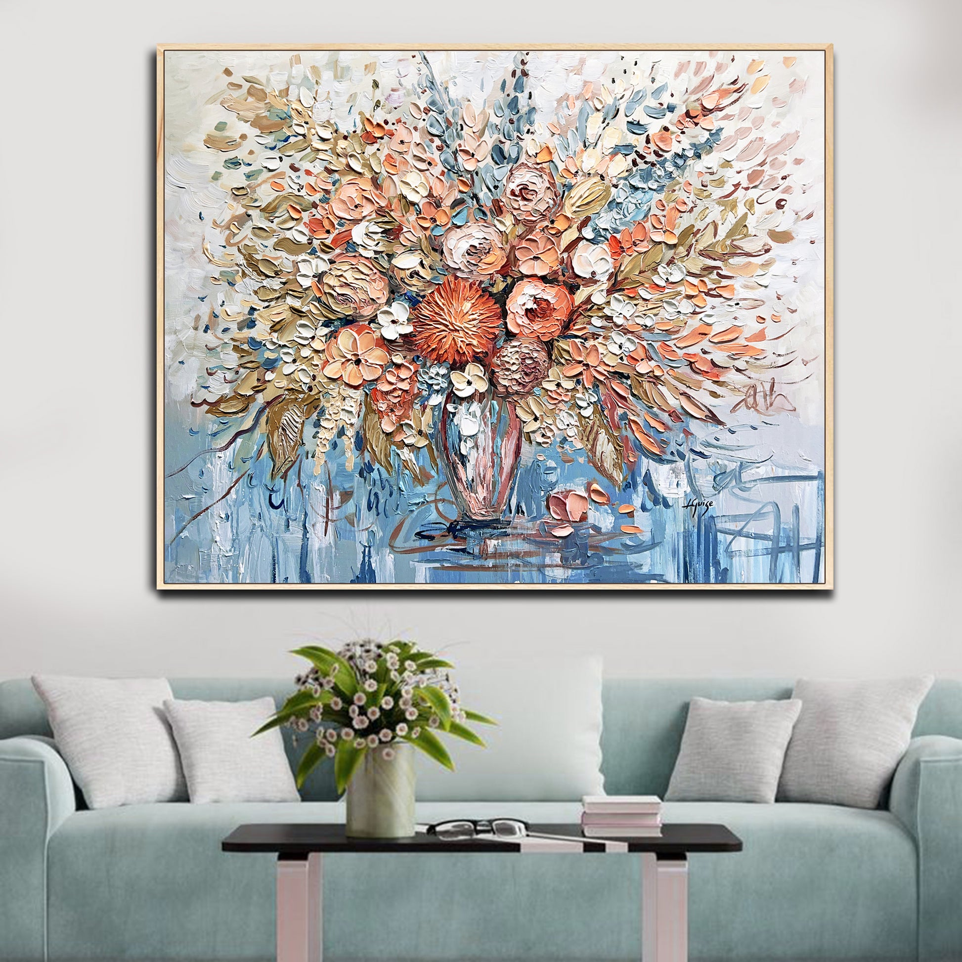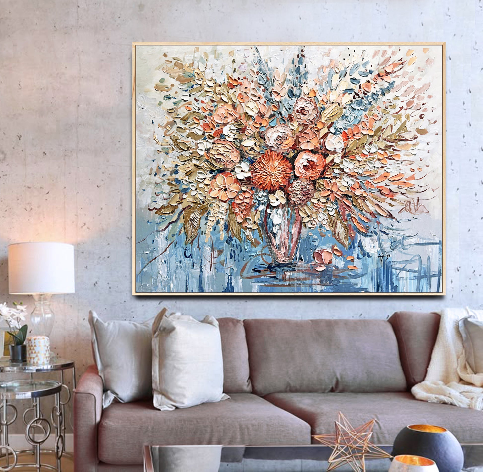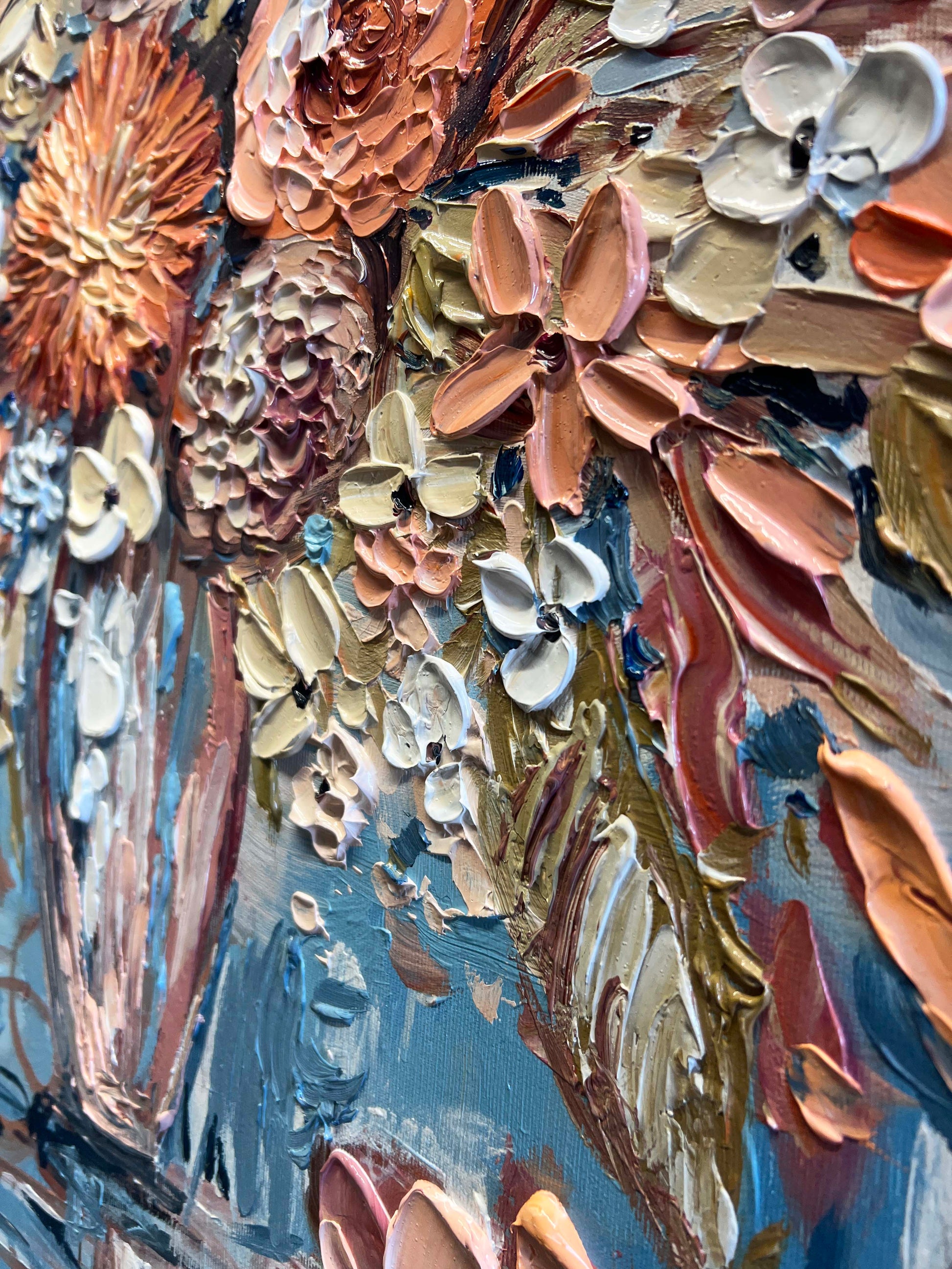 "Peach Parfait" this stunning floral painting radiates warmth and elegance, with a rich bouquet of textured blossoms in a harmonious blend of peach, apricot, copper, tan, and limed ash tones. The delicate petals and layered impasto strokes create a luxurious depth, making the flowers appear almost sculptural.