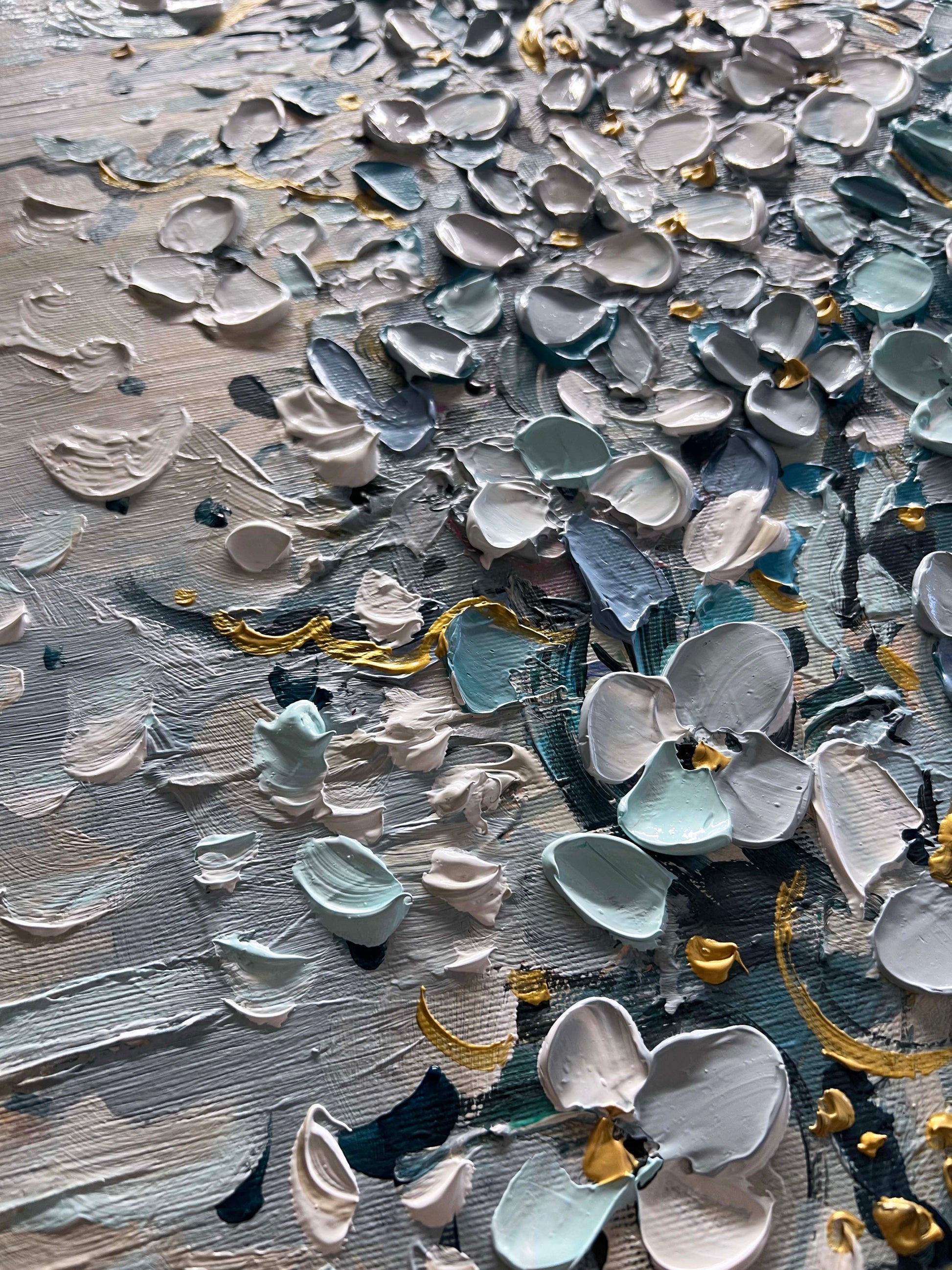 I used thick, textured brushstrokes to build up each petal, giving the painting a sculptural, almost three-dimensional feel.