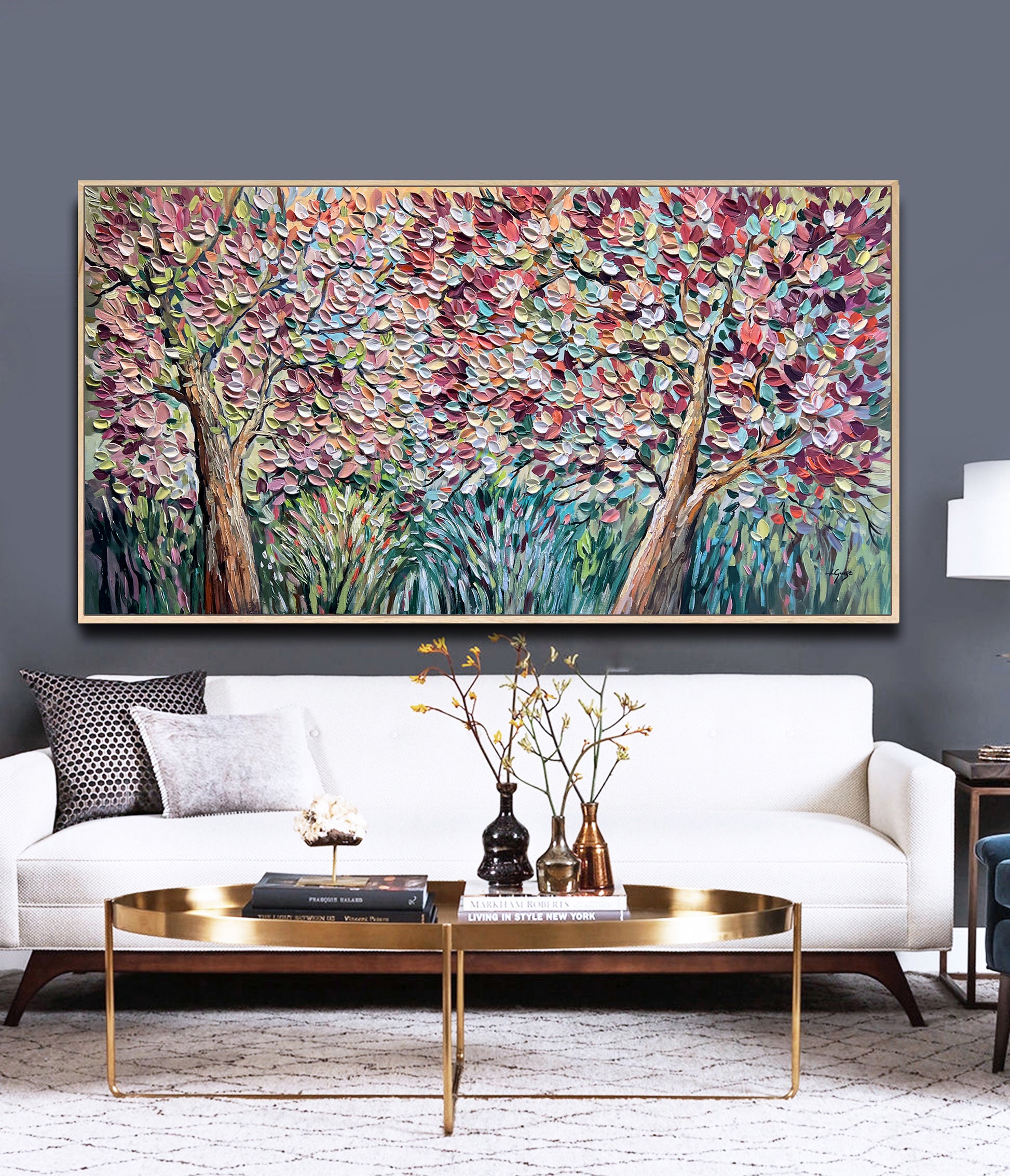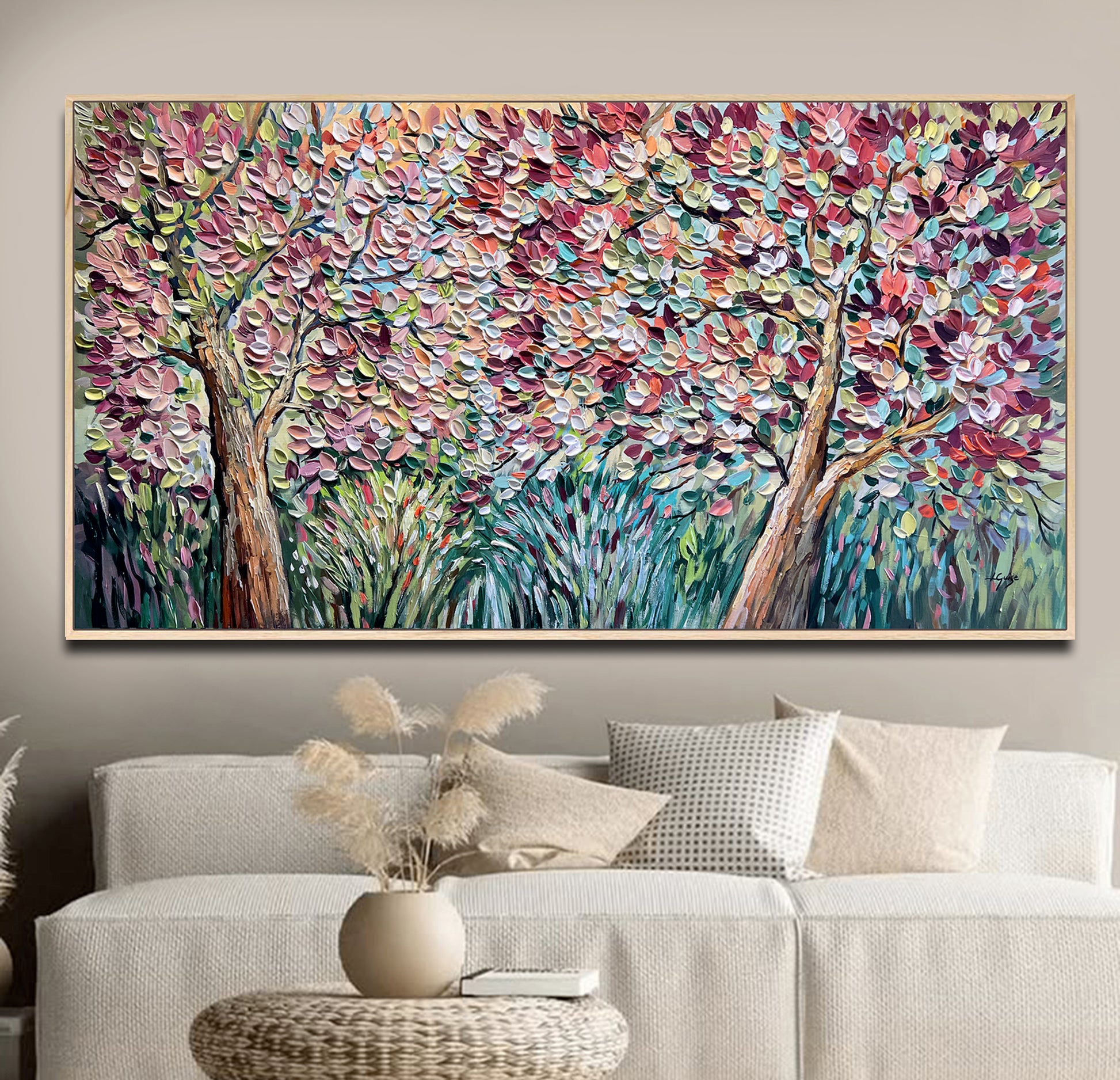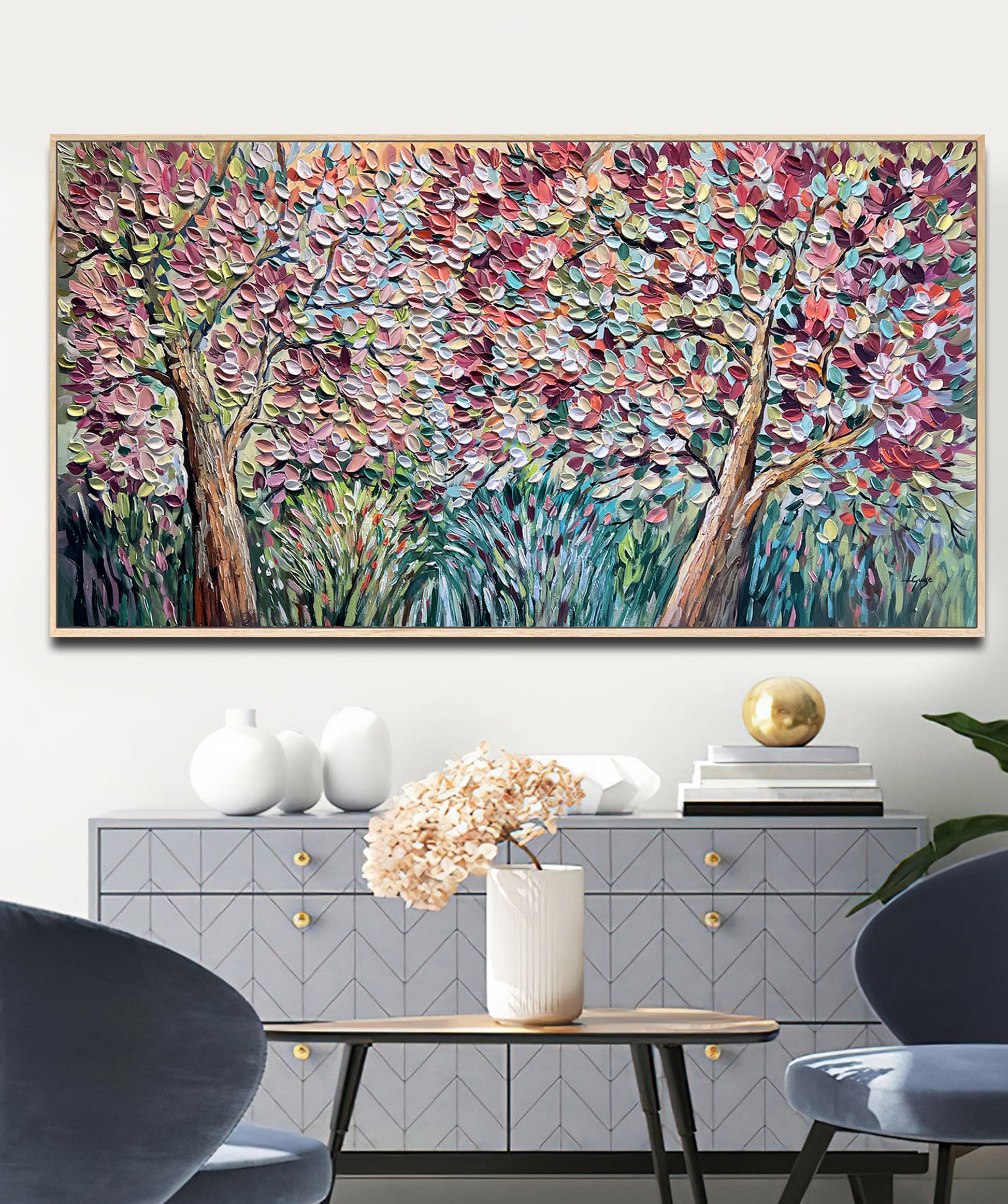 A natural wooden frame grounds the painting in its organic spirit, its warmth and simplicity echoing the scene’s essence to provide a harmonious completion.