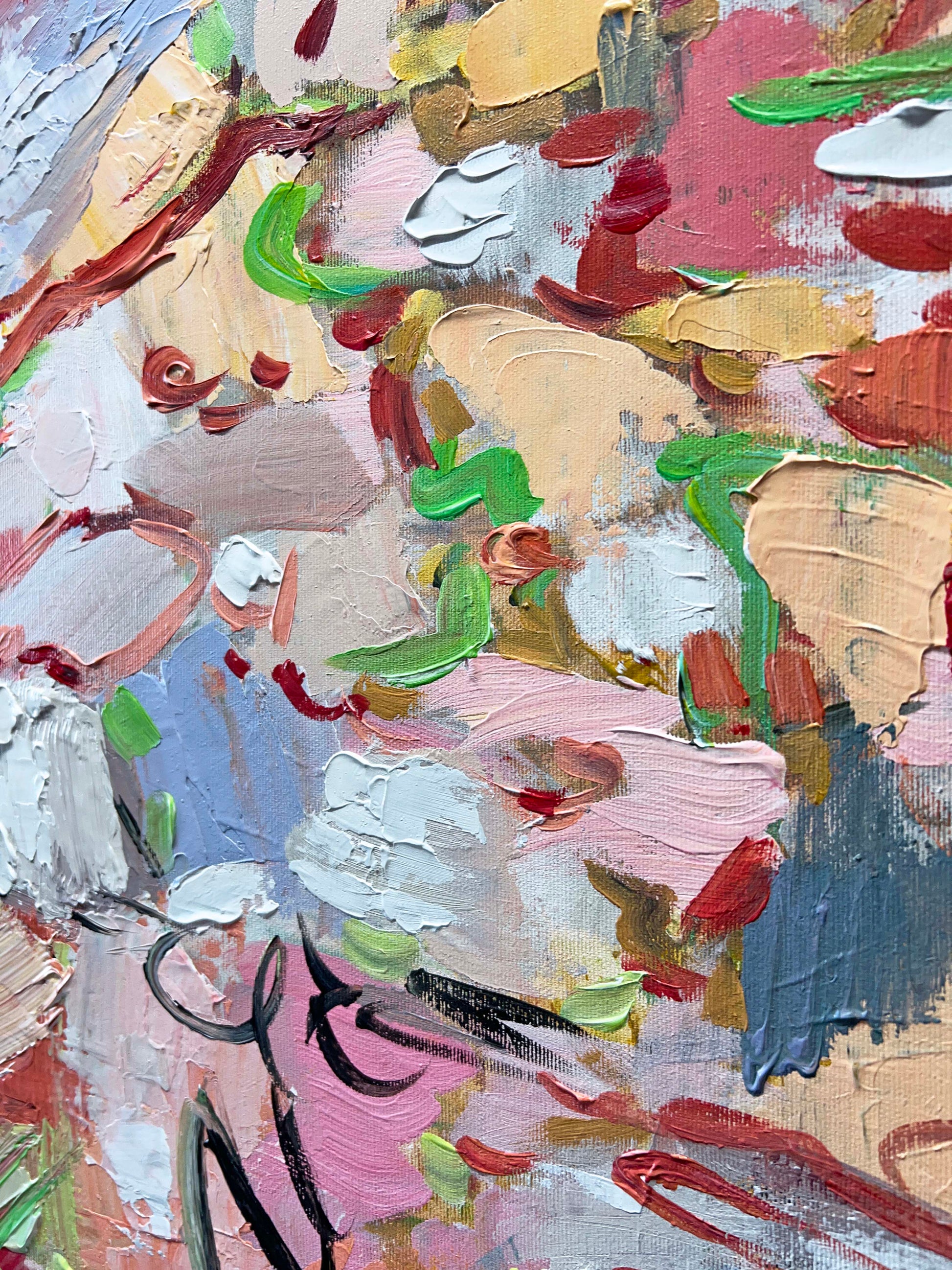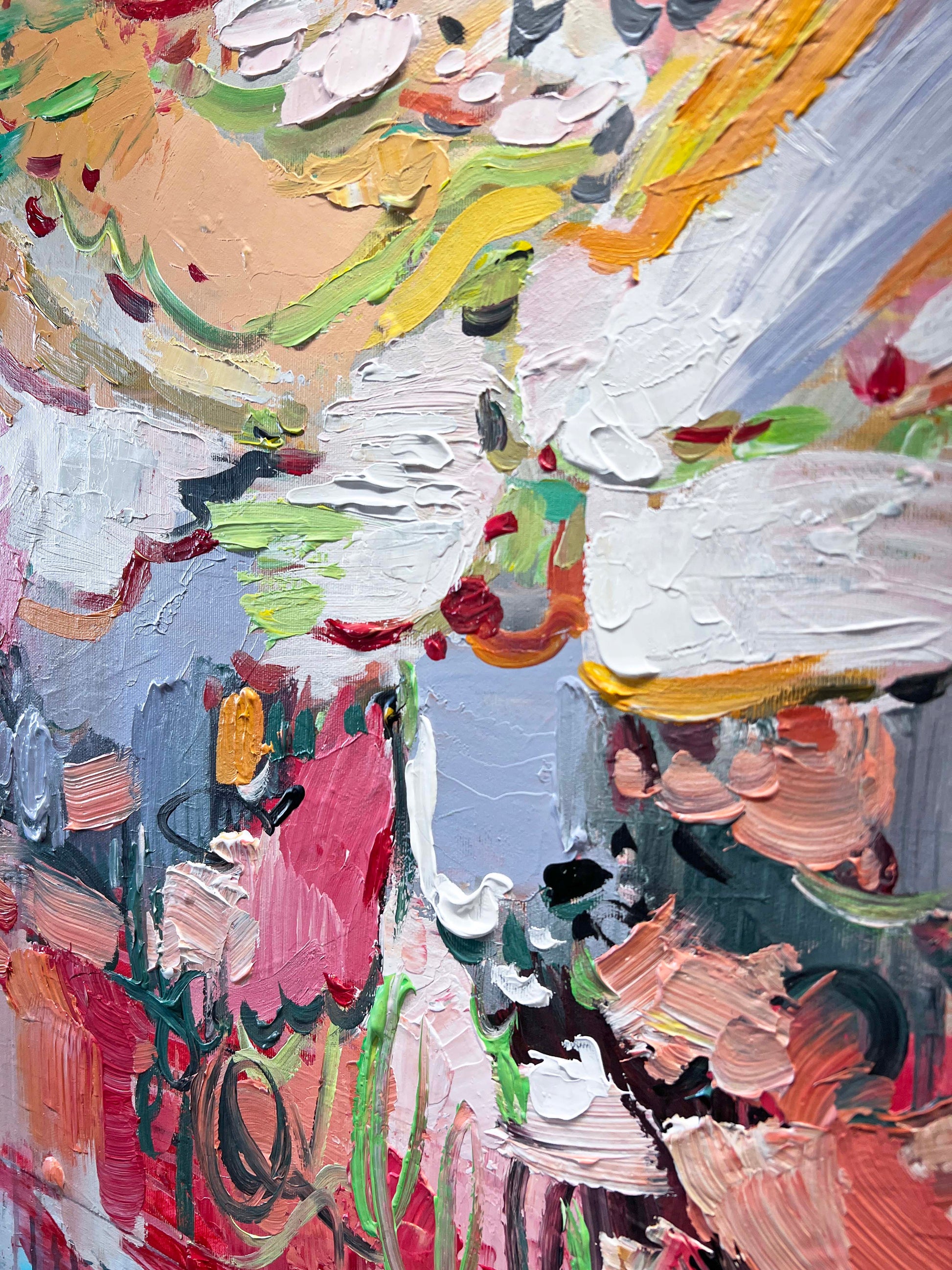 This vibrant abstract painting, titled “Pink Kiss”, radiates the warmth and energy of a joyful summer day. Its dynamic composition is a celebration of color and emotion, with expressive strokes of pink, red, and pastel creams evoking the tender freshness of blooming petals under the sun. Soft greys add elegance and depth, while touches of green recall scattered leaves, grounding the scene in nature’s quiet rhythm.