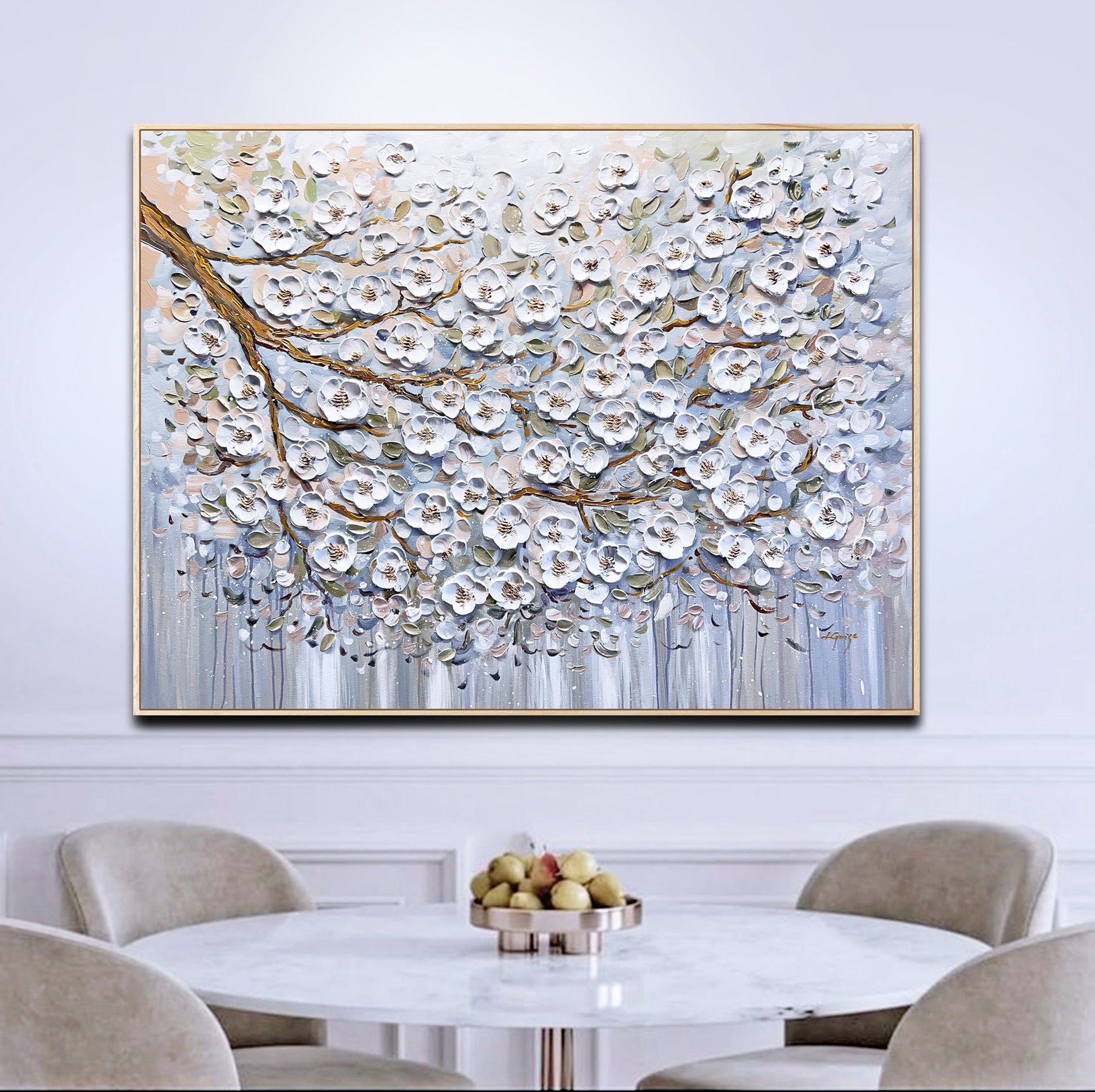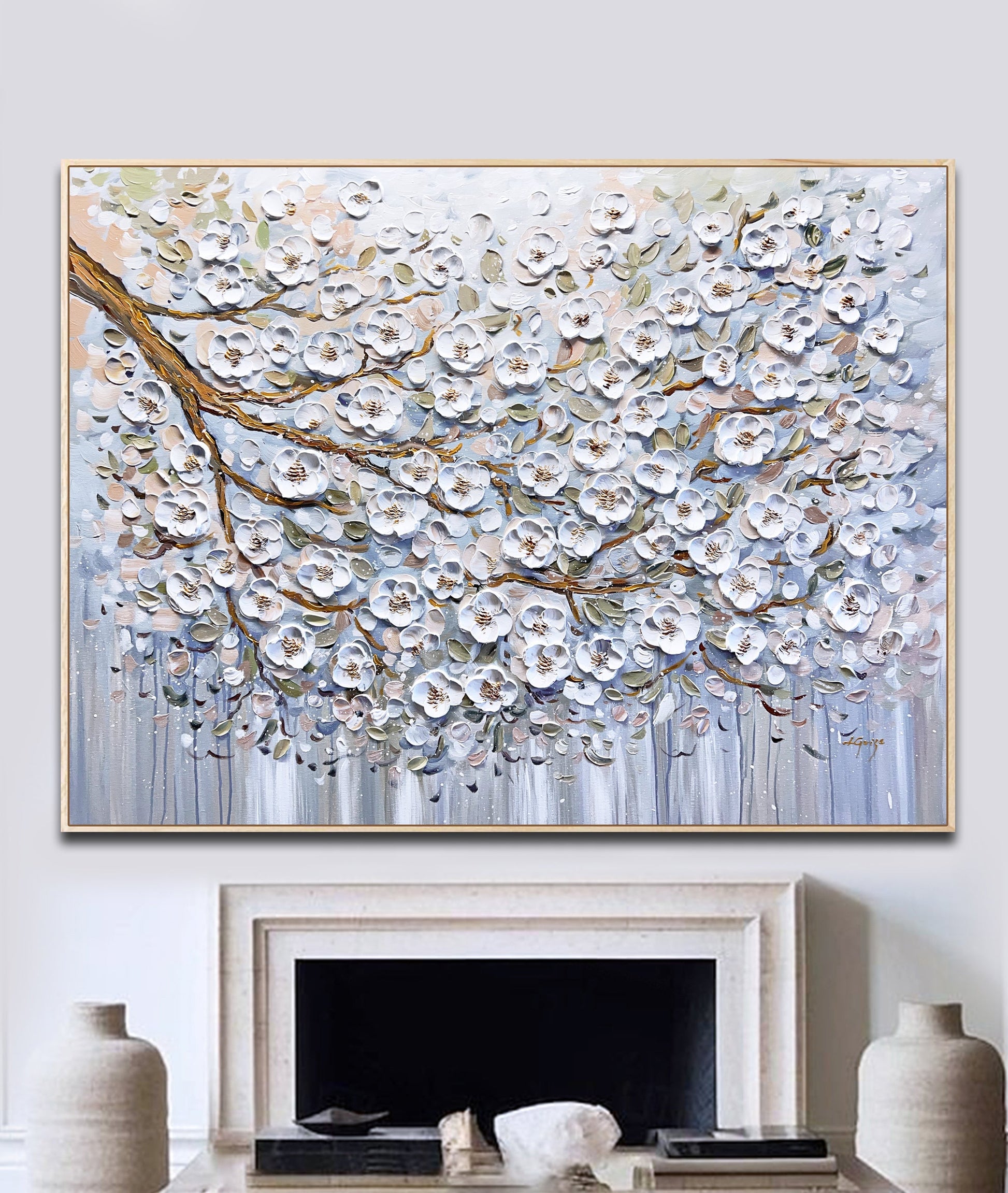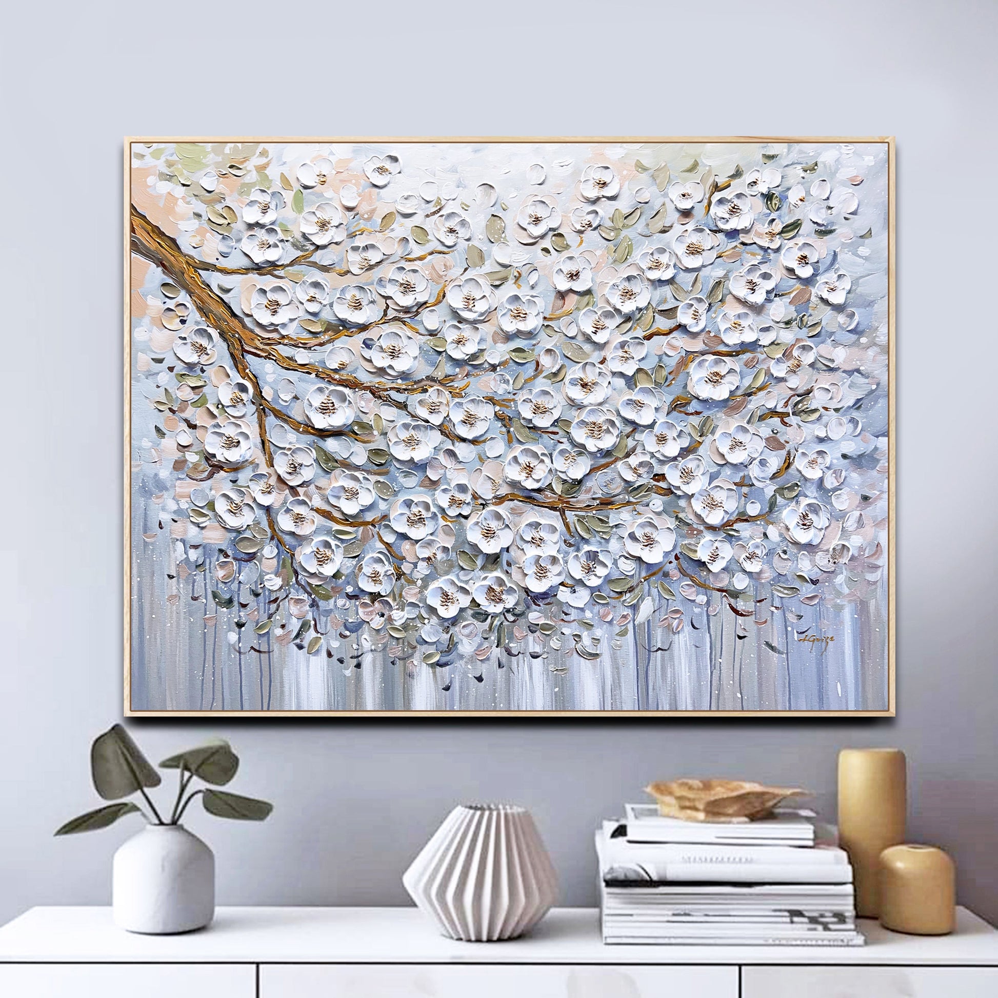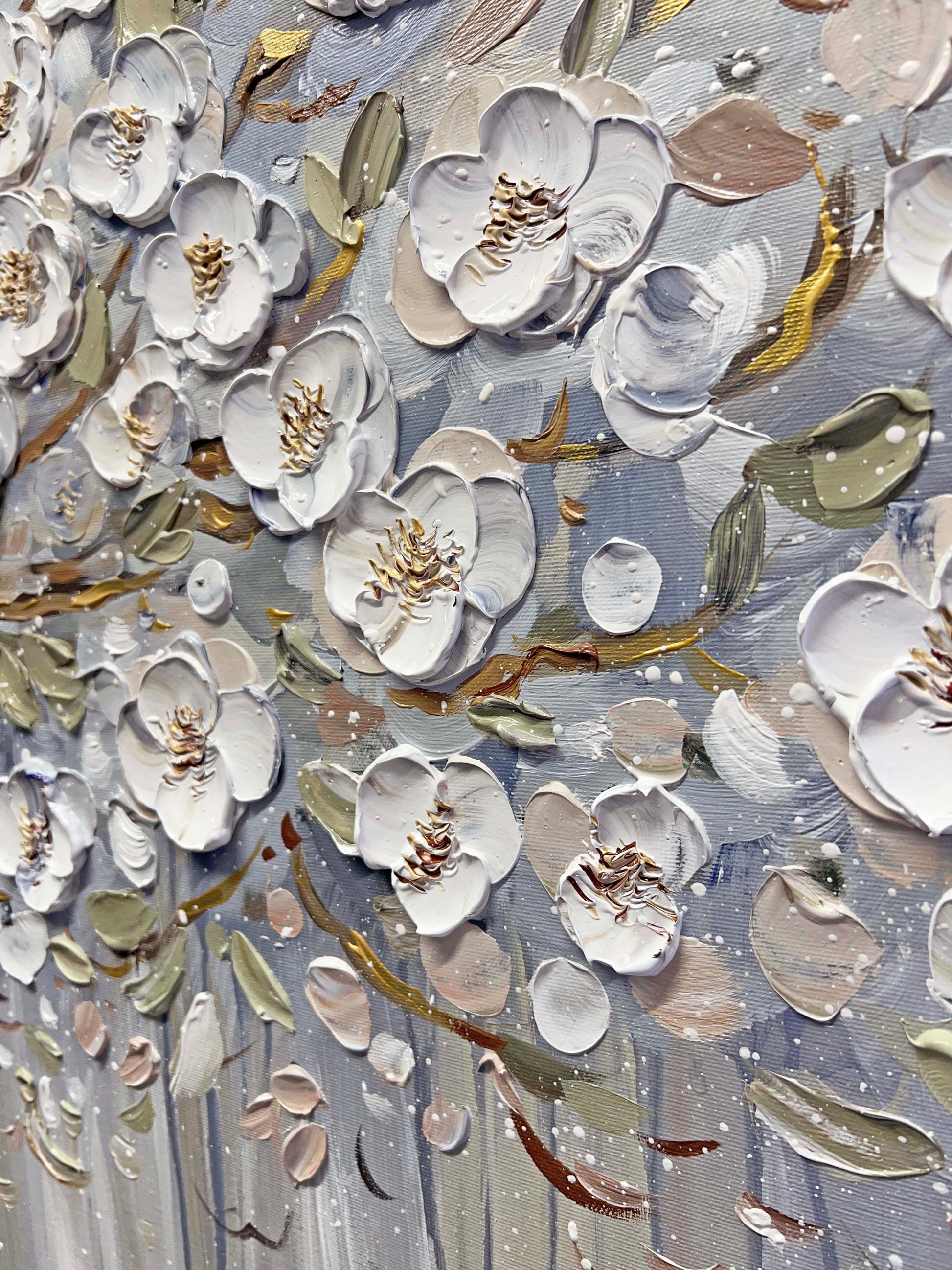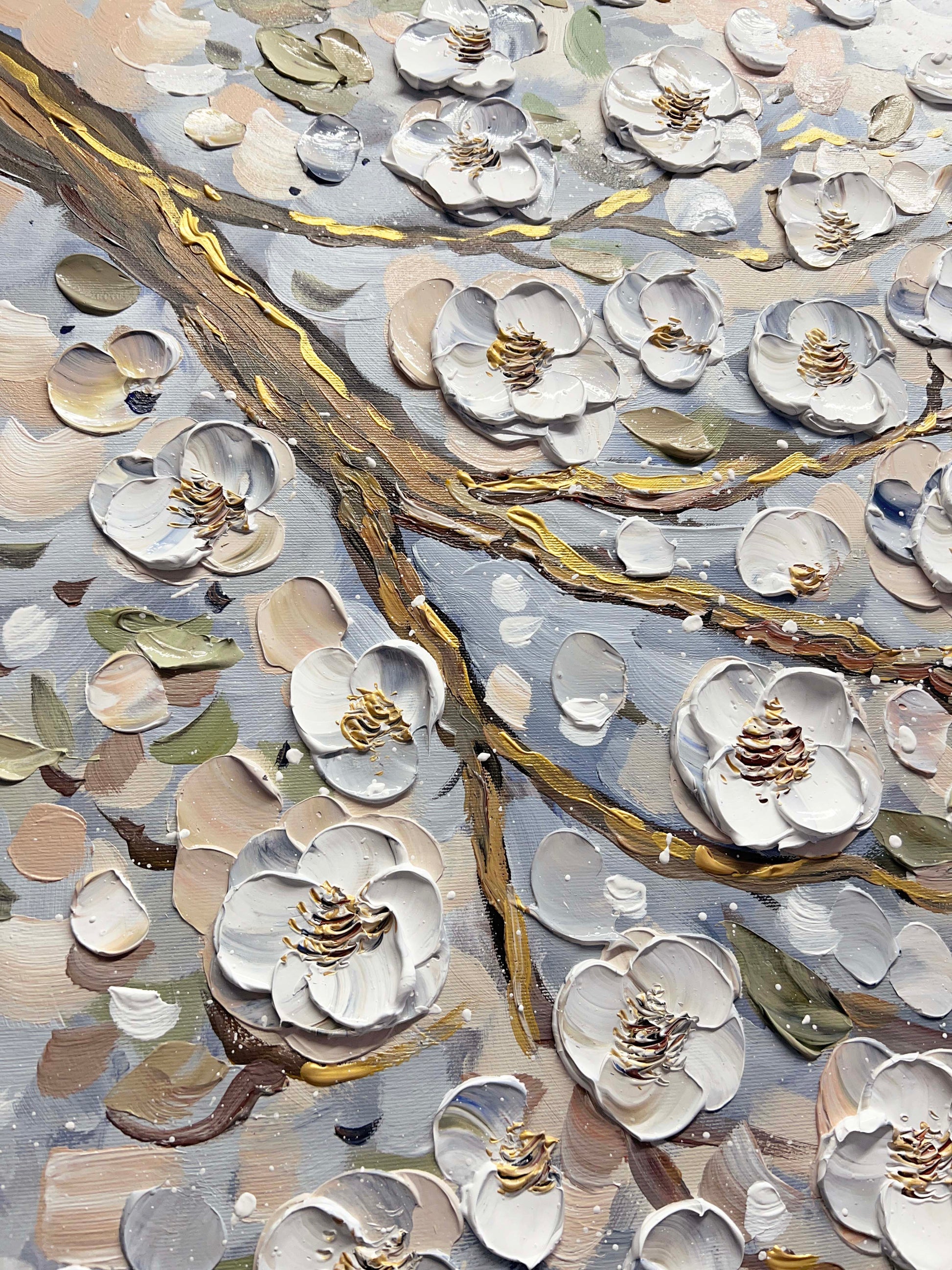 The blossom flowers and petals almost seeming to lift off the canvas, thanks to the textured technique that adds depth and dimension to the piece.