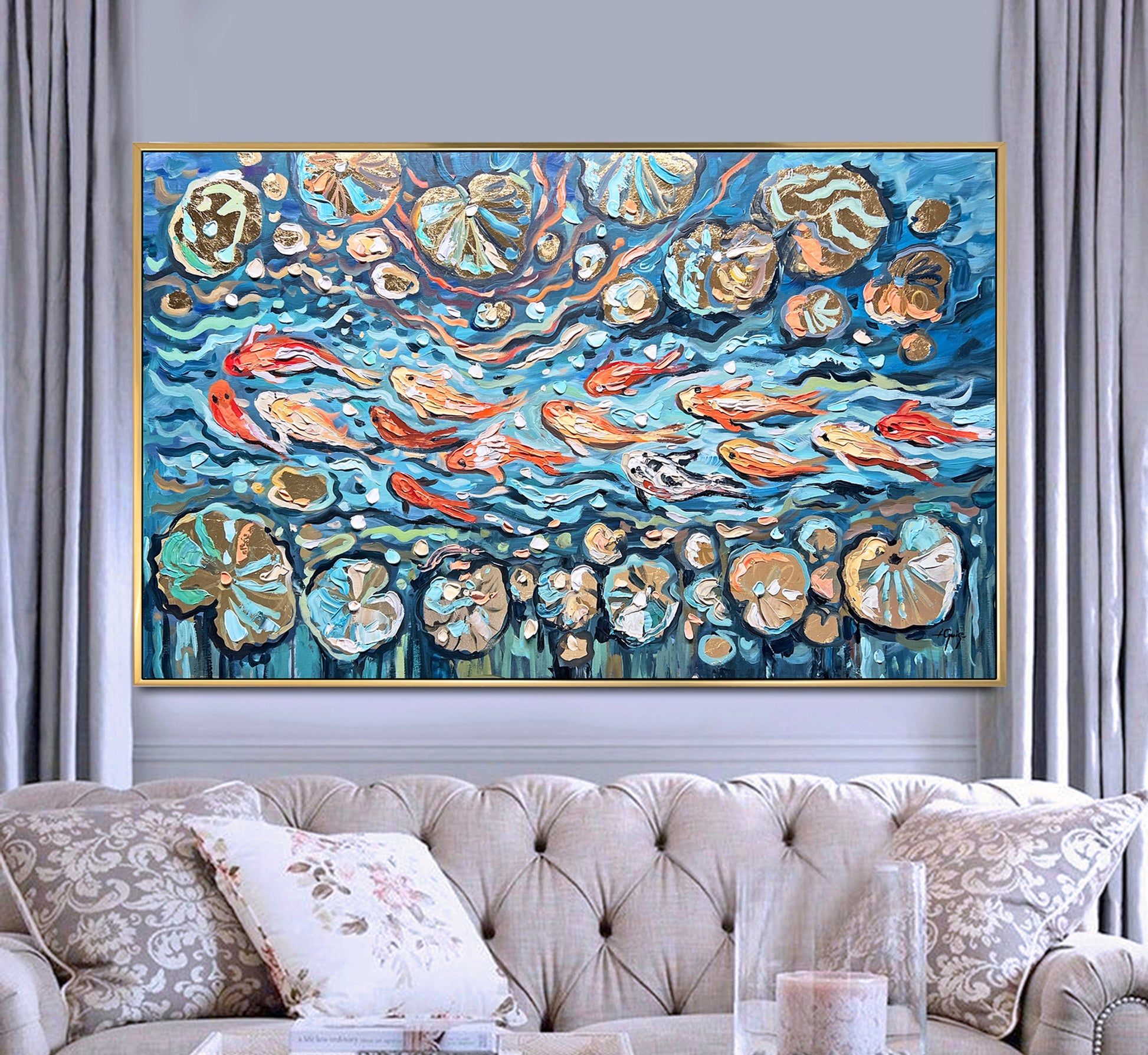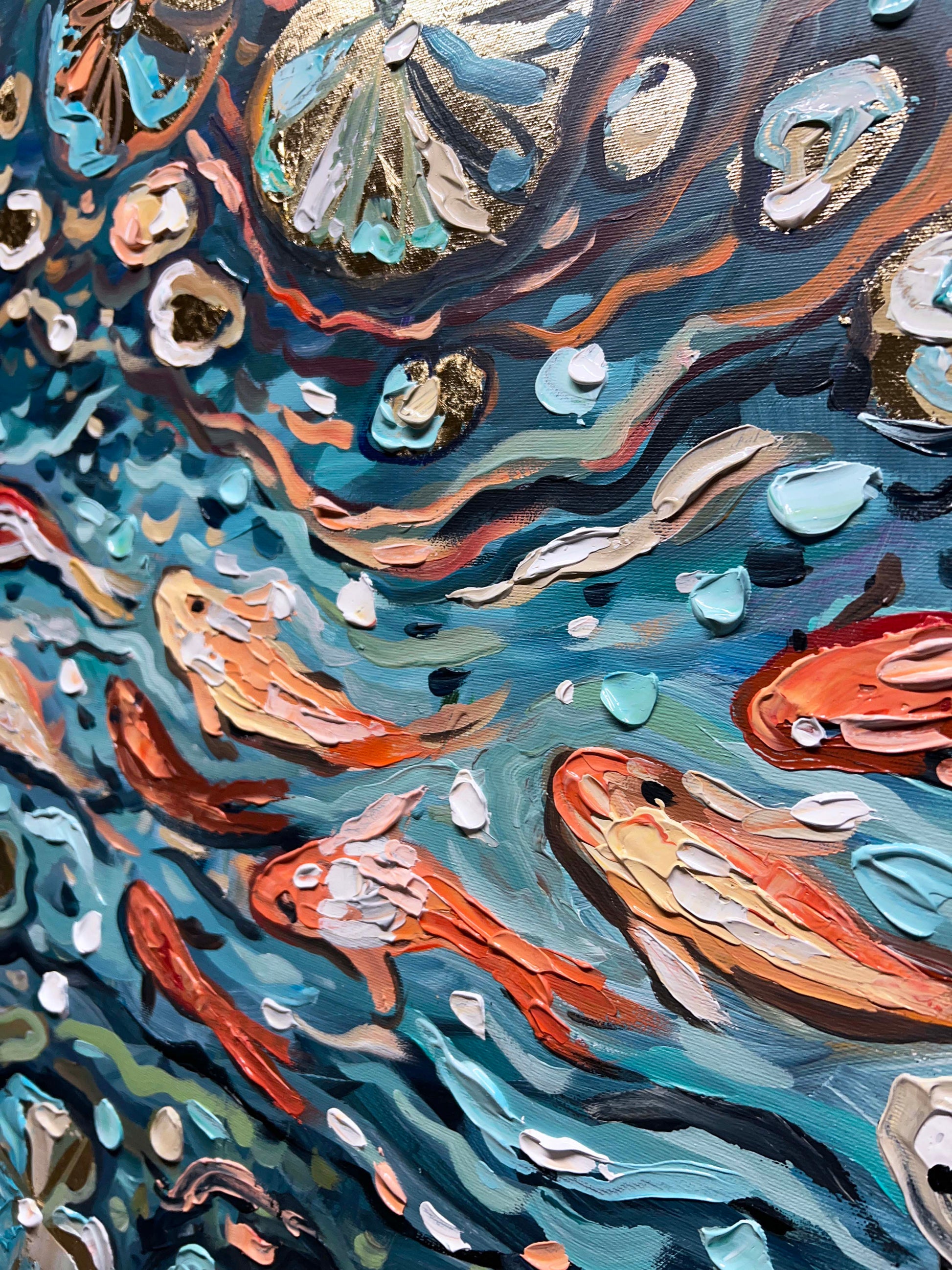 The scene captures a lively group of koi fish dancing gracefully through rippling waters, surrounded by luminous water lilies. Symbolizing prosperity, harmony, and good fortune, the koi are painted in warm, radiant tones that stand out against the deep blues and teals of the water.